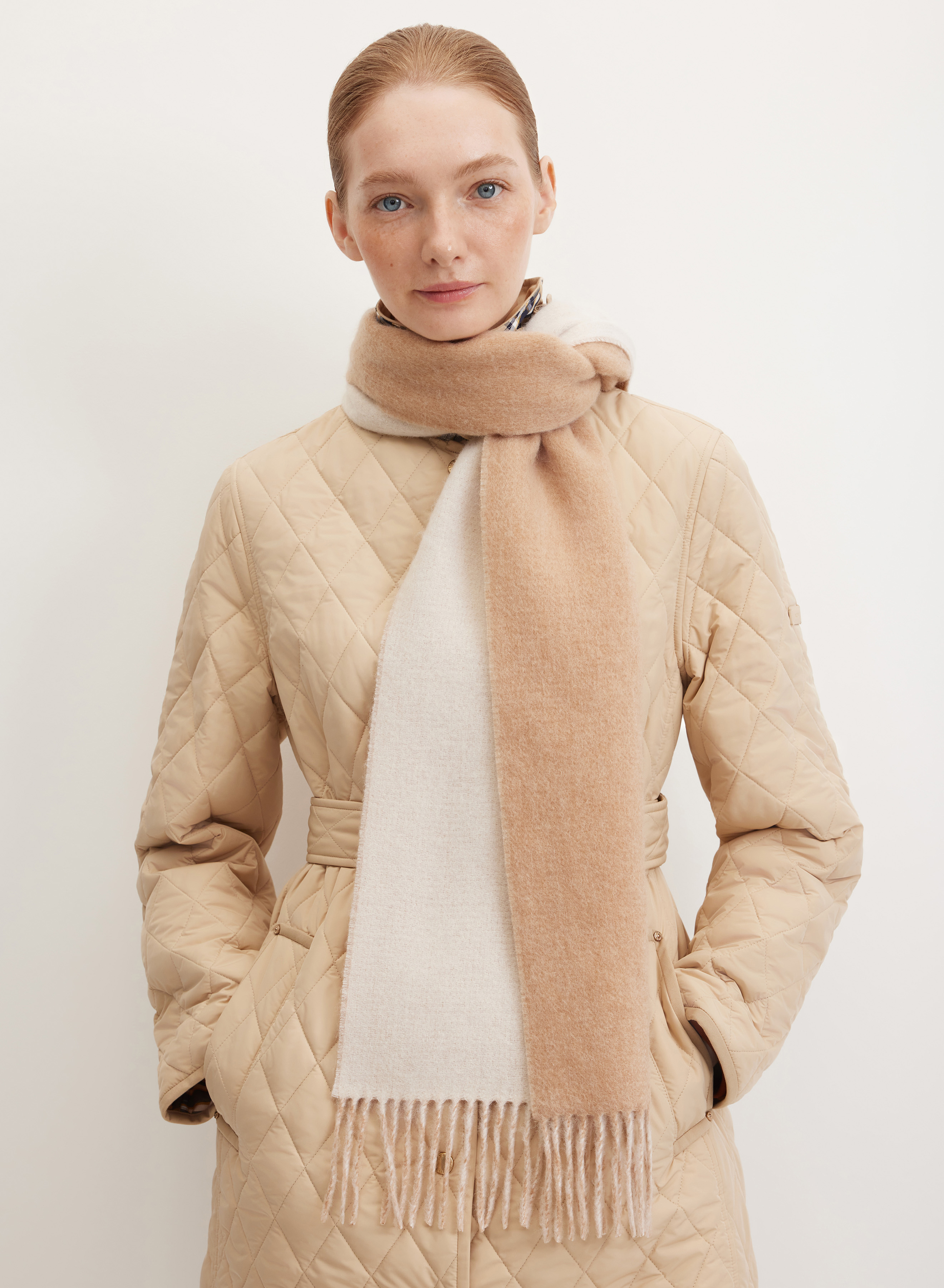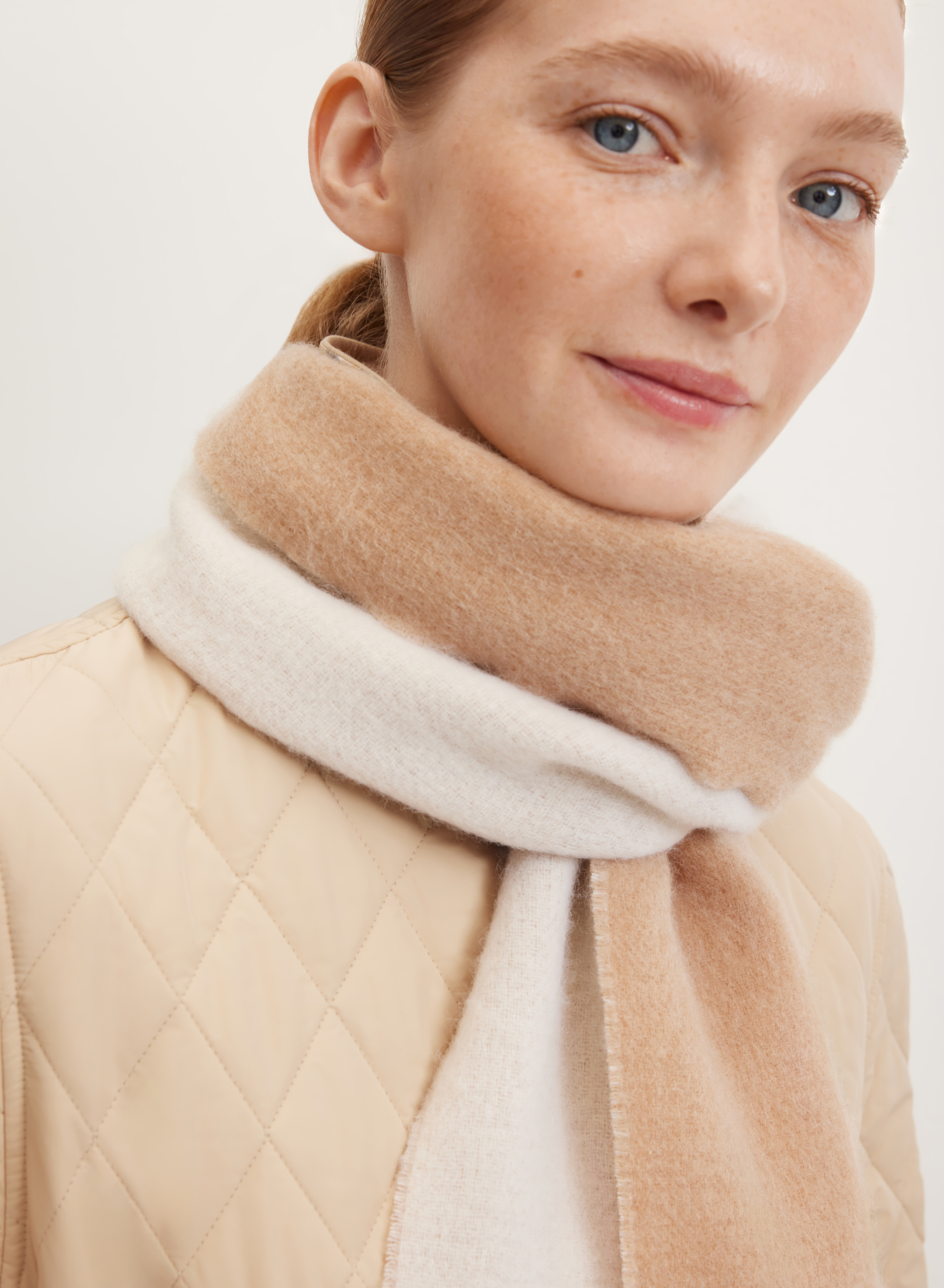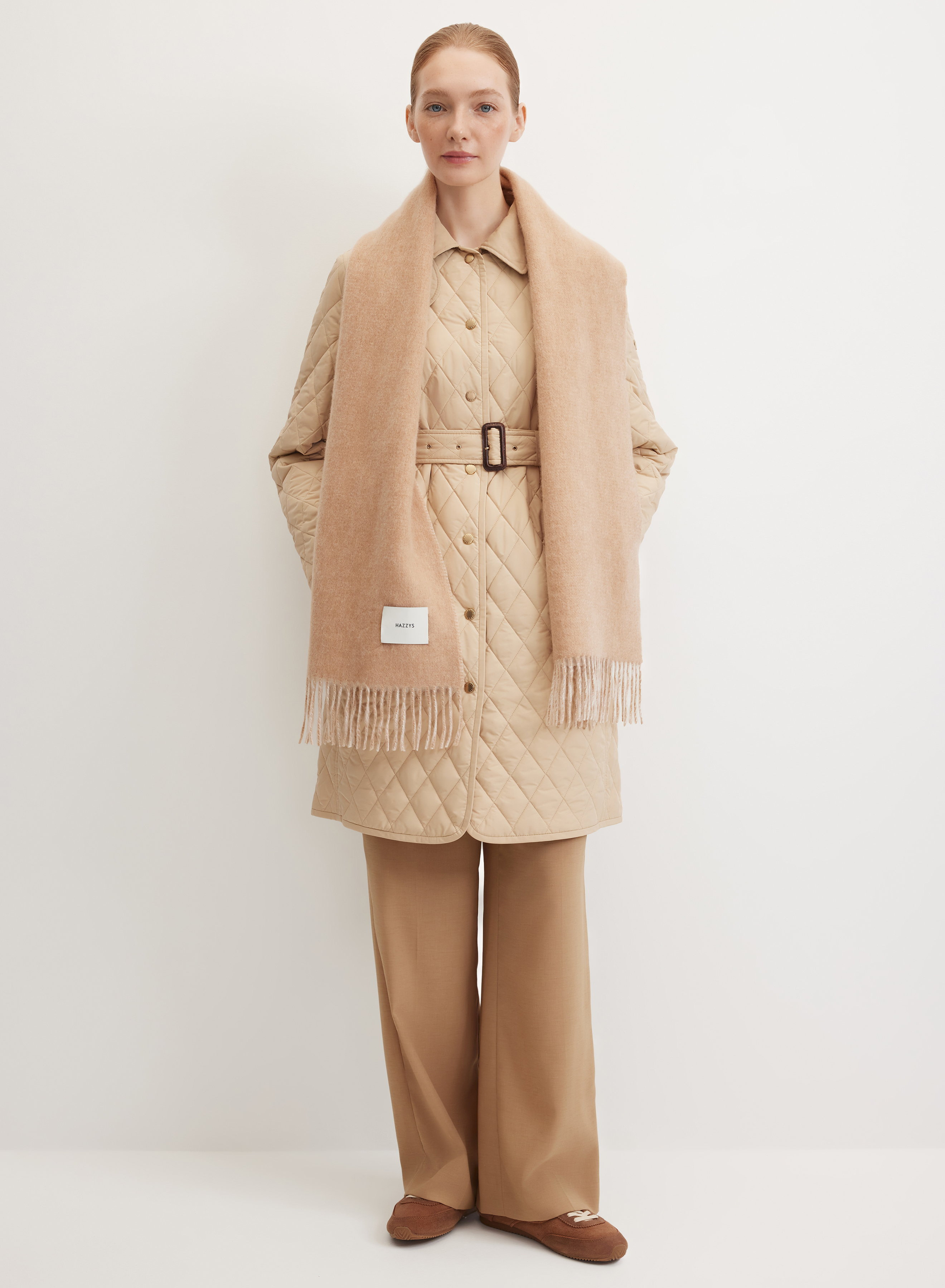 Палантин можно носить как классический шарф с объемным узлом, накинуть на плечи как пелерину или обернуть вокруг шеи по принципу снуда, создавая уютный силуэт с мягкими линиями.