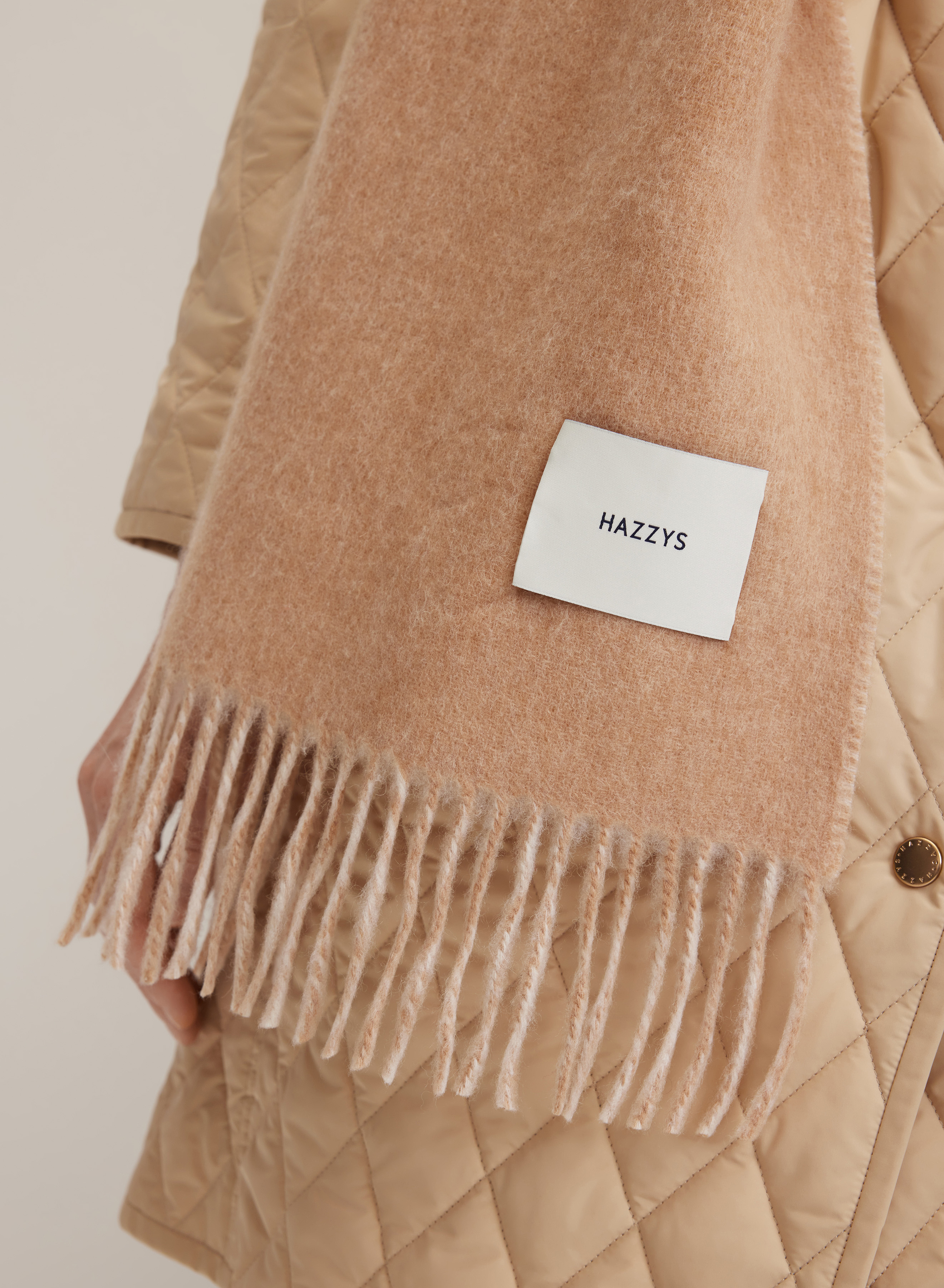 Стильный широкий шарф сочетает утонченную многослойность и тактильный комфорт. Модель с бахромой по краям обеспечивает идеальный баланс между структурной плотностью и характерной для кашемира невесомой мягкостью. Вышитый фирменный логотип Hazzys служит акцентной деталью.