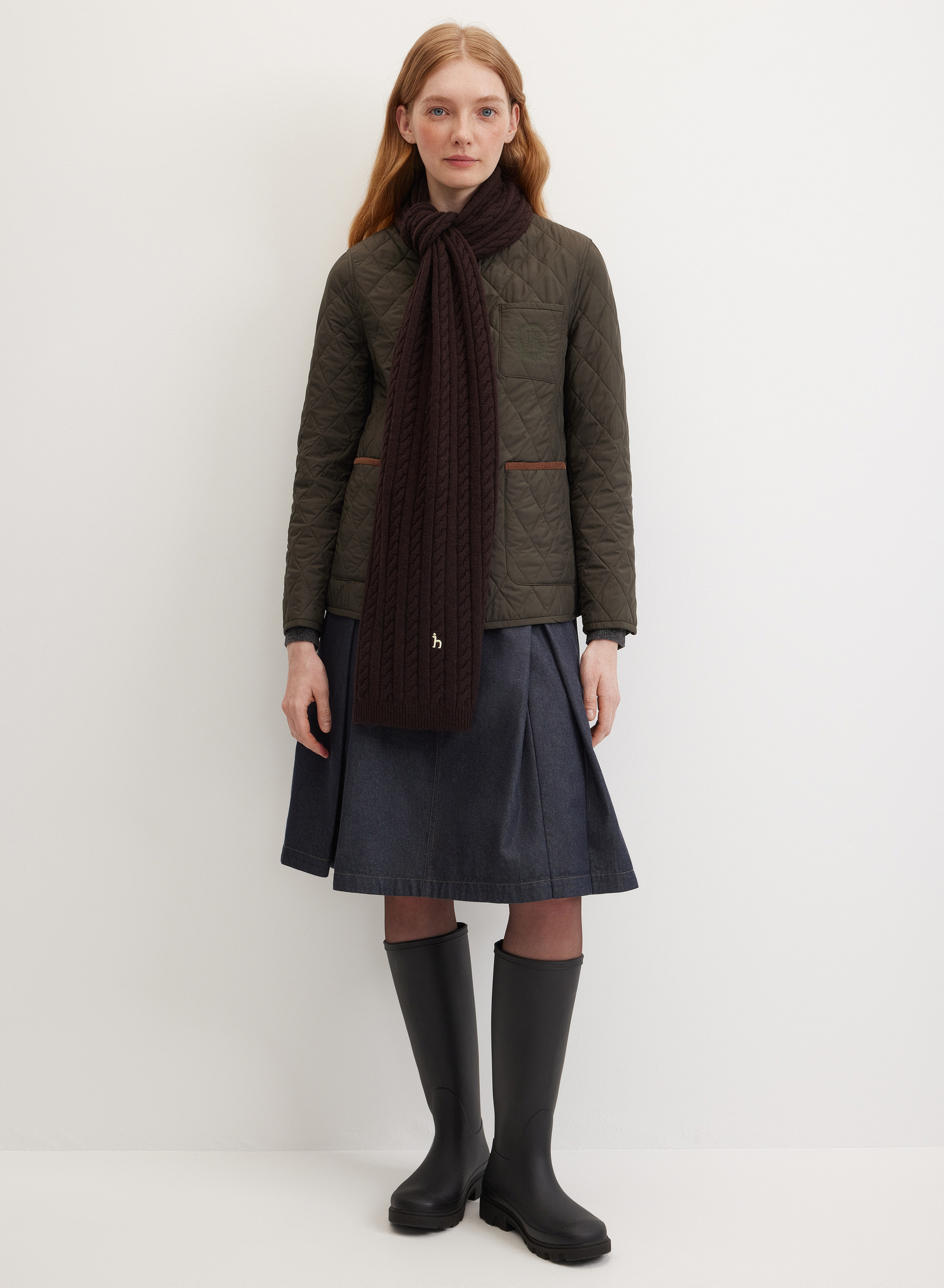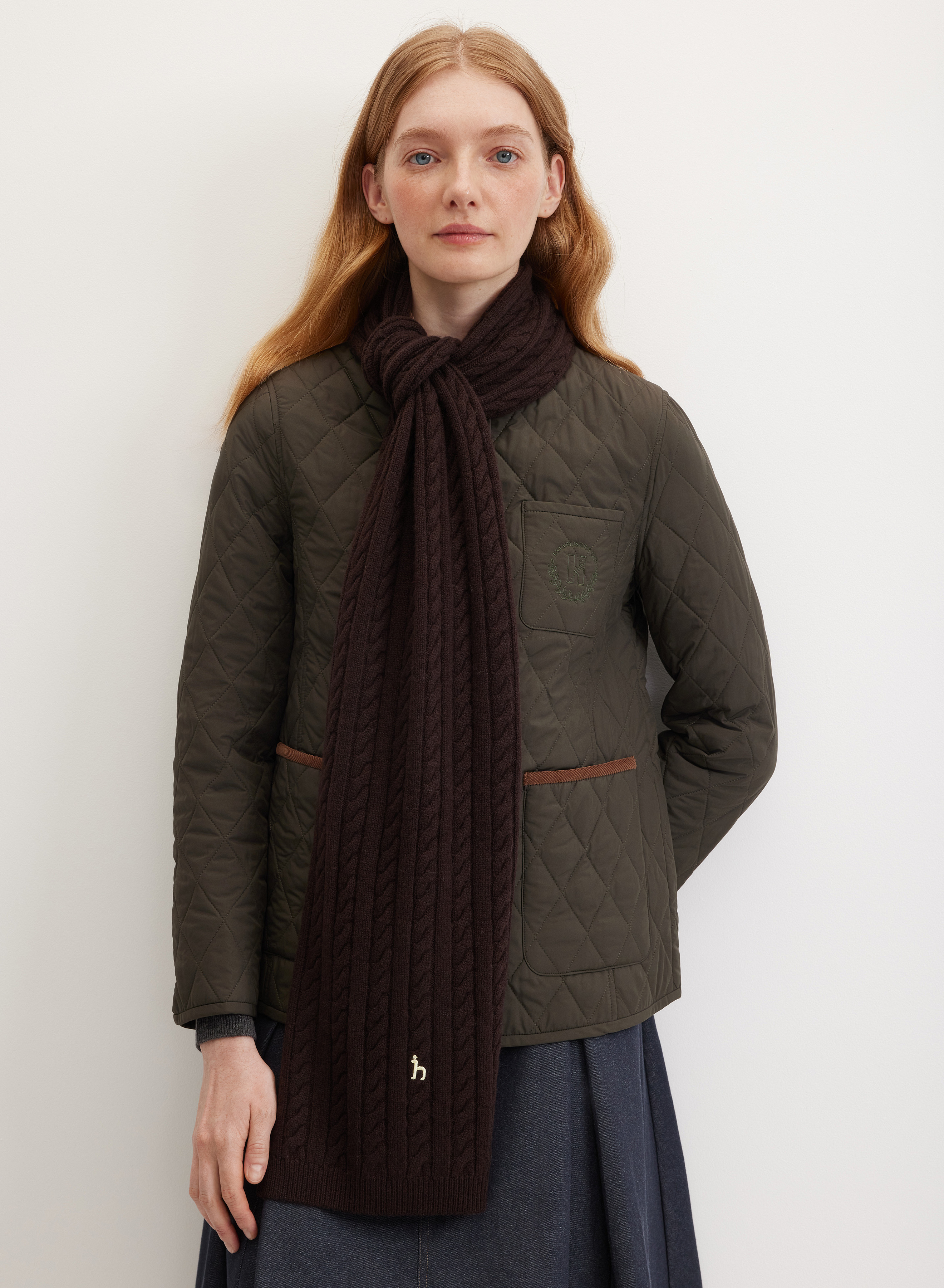 Оригинальный шарф коричневого цвета. Аранское плетение из объемных кос, жгутов и рельефных узоров создает стильный акцент в образе. Классический прямой крой и края низа гладкой вязки обеспечивают универсальность в ношении. Аксессуар можно свободно обмотать вокруг шеи в несколько оборотов или носить как палантин.