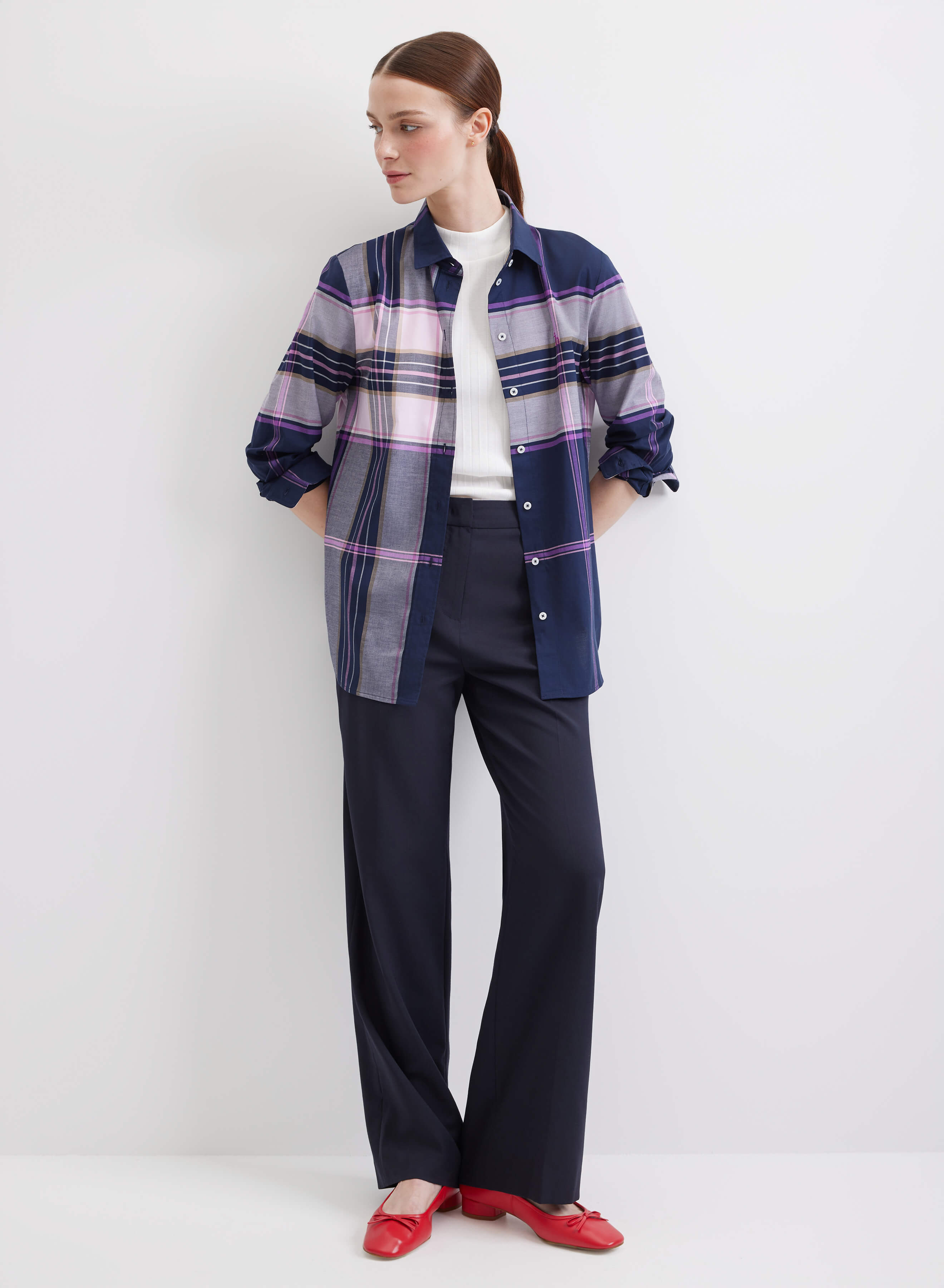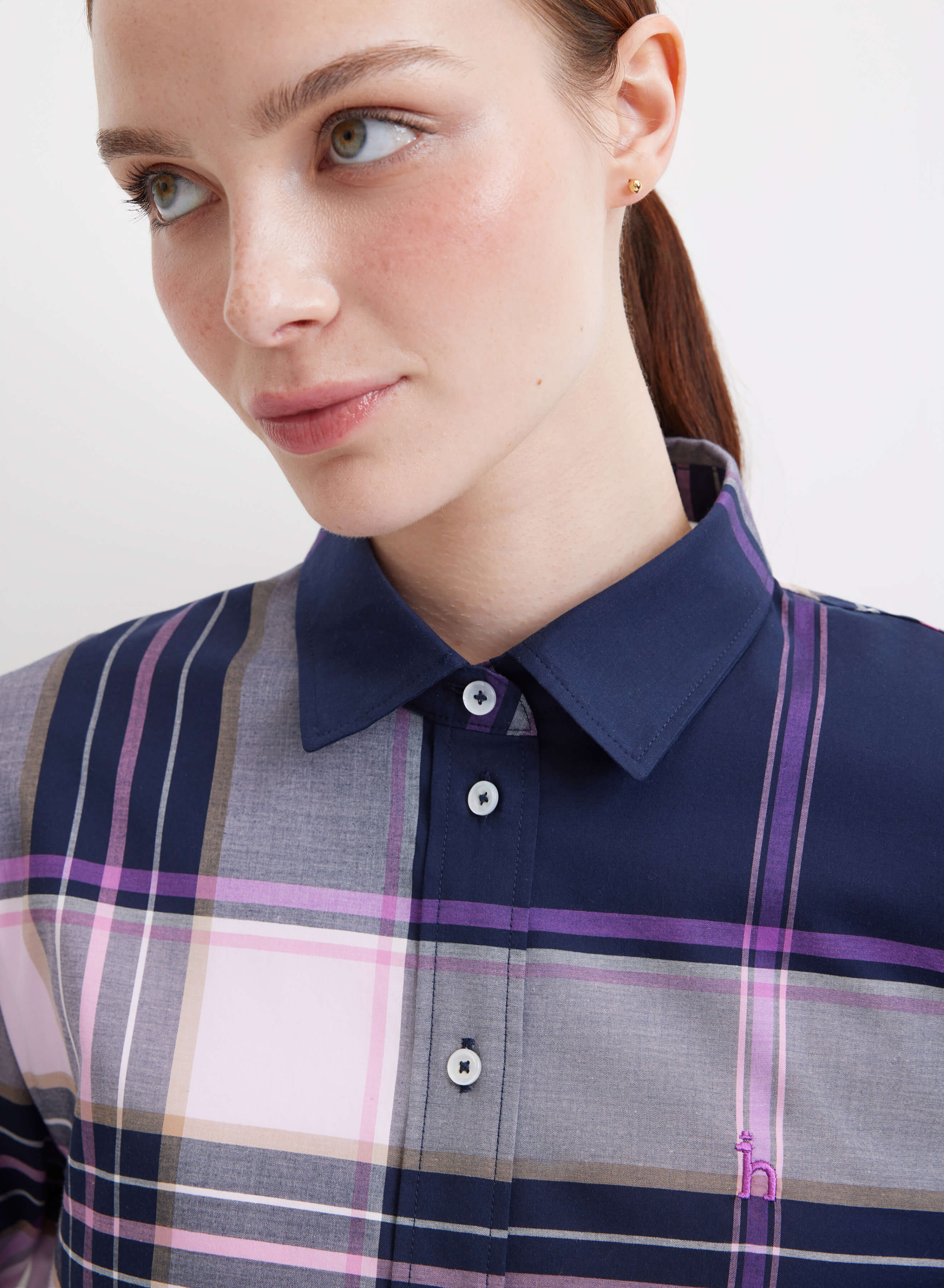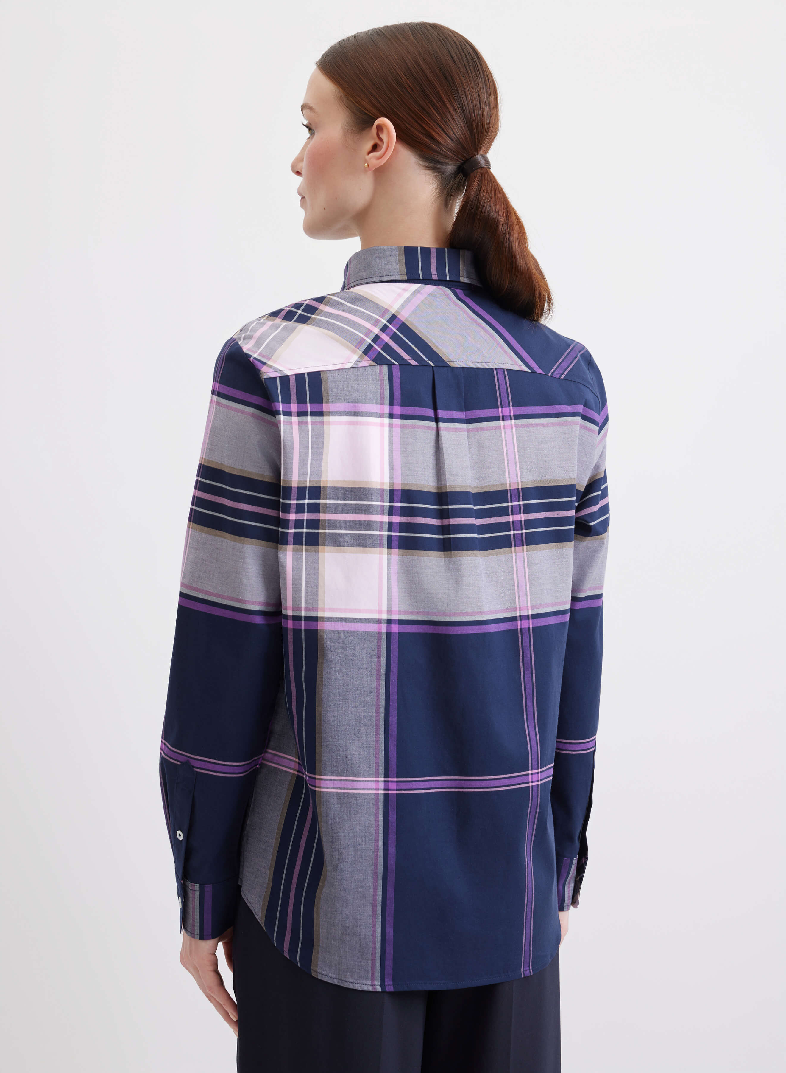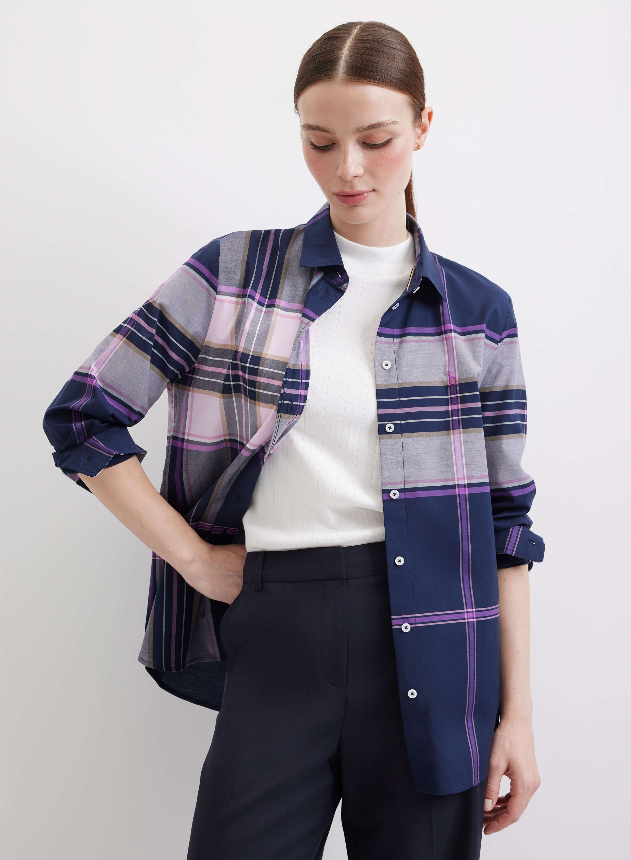 Синяя рубашка в крупную контрастную клетку. Модель с фигурным низом, обработанным швом с подворотом. От кокетки на спинке идет одна разнонаправленная складка, за счет которой силуэт модели расширяется к низу. Застегивается на ряд пуговиц, расположенных на открытой планке с двойной отстрочкой по краю. Отрезные, слегка спущенные по линии плеча рукава с манжетами на пуговицах. Классический отложной воротник по краю отстрочен фиксирующей строчкой.