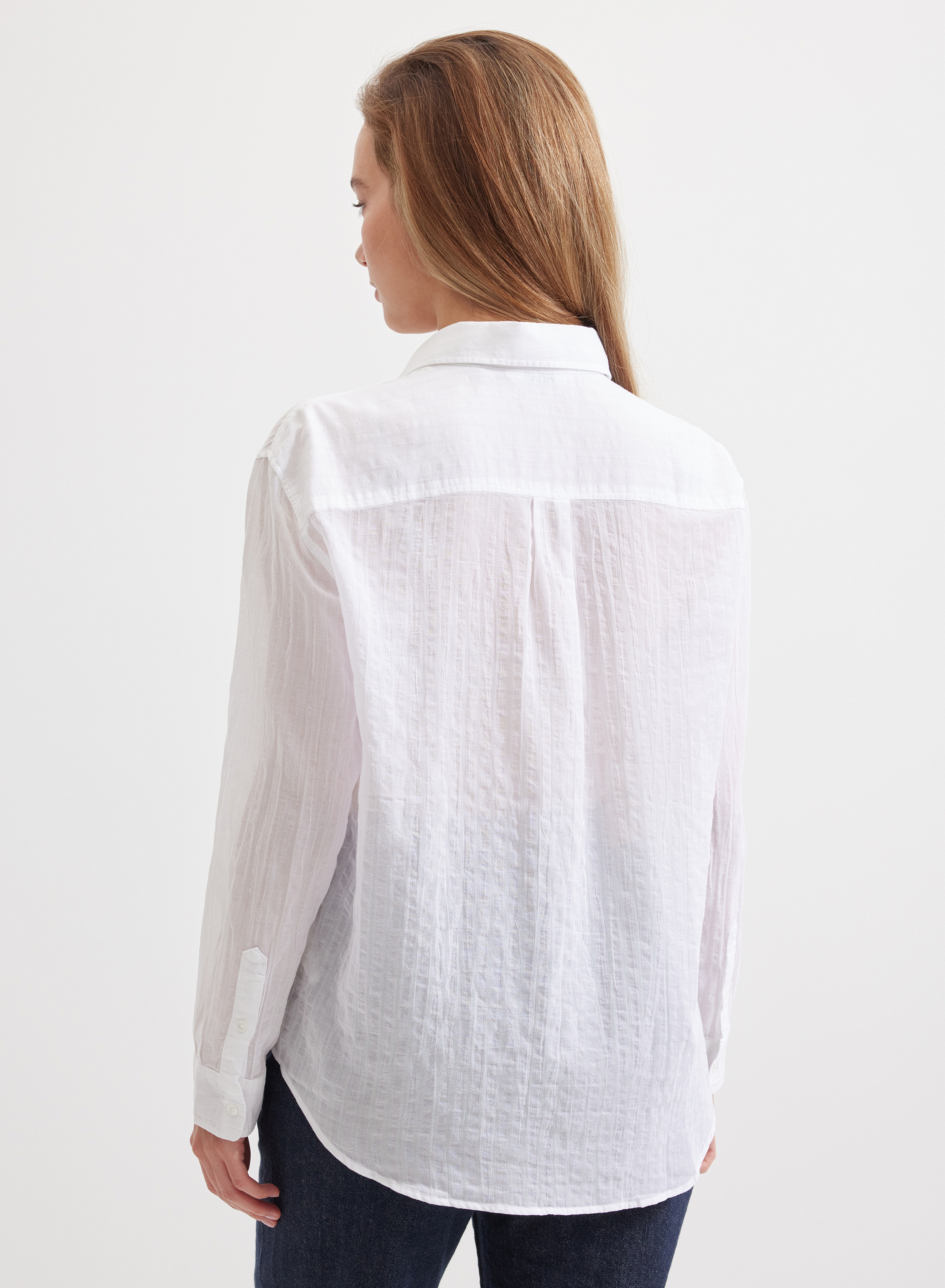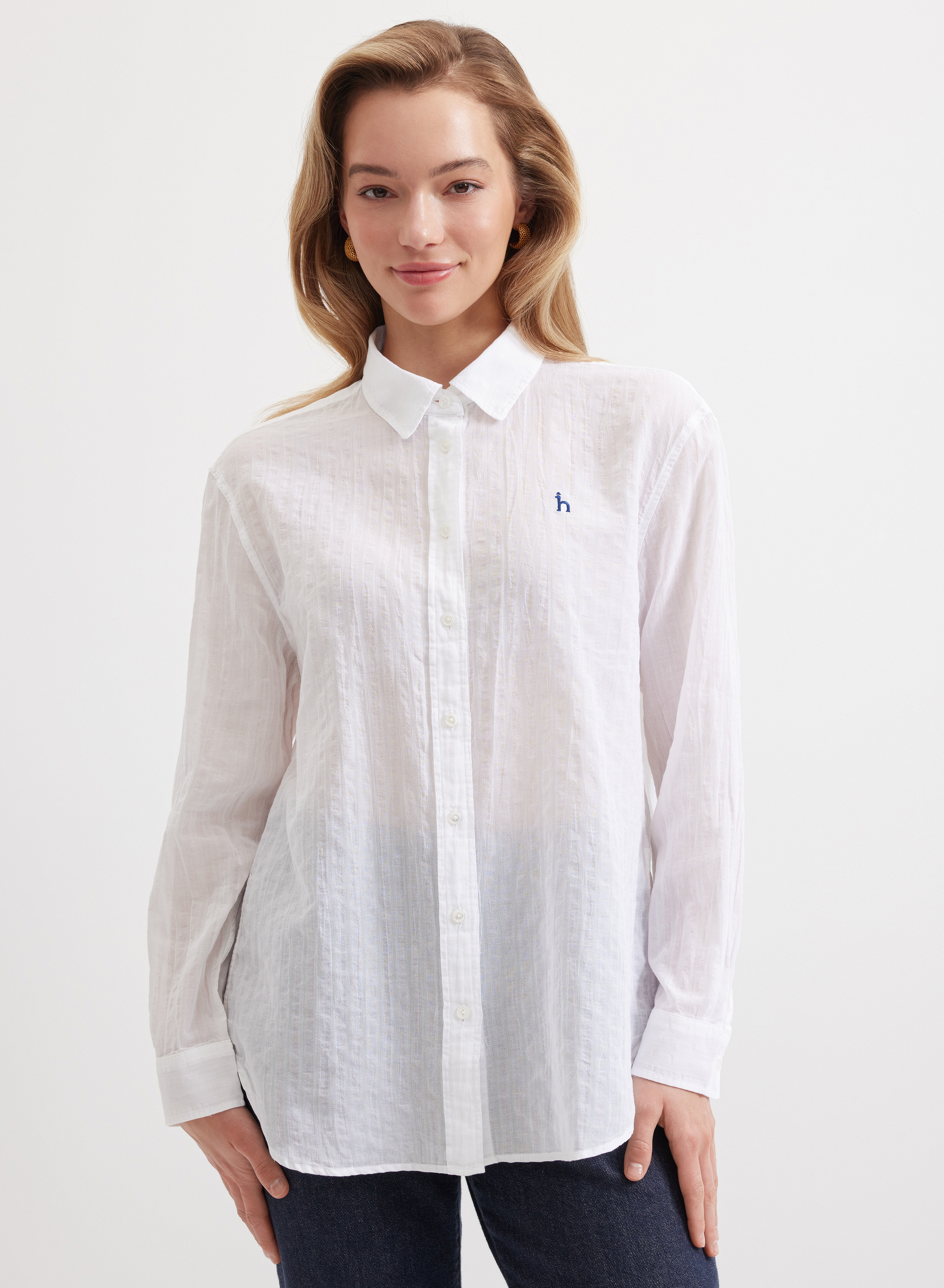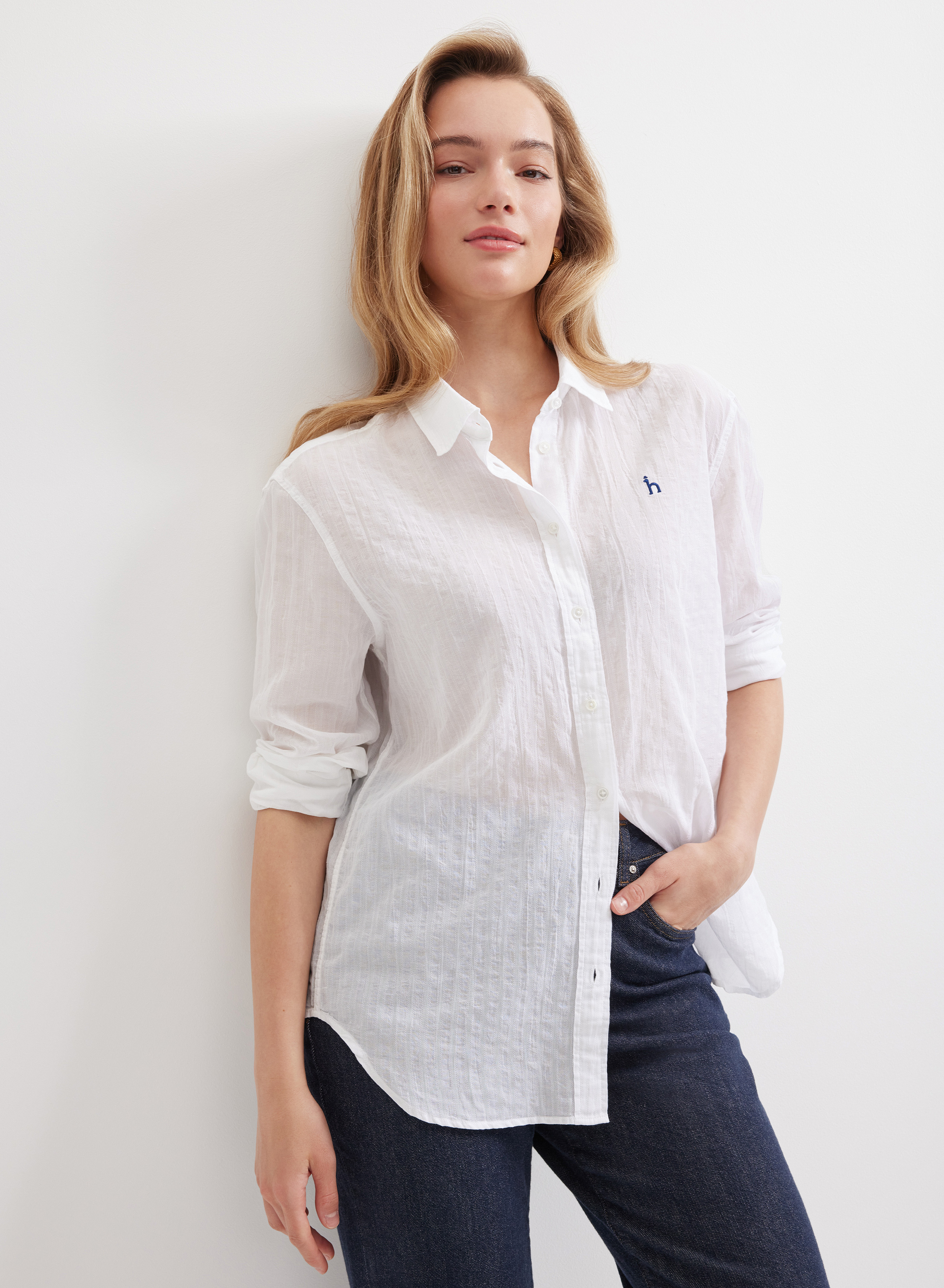 Легкая белая рубашка прямого кроя, с фигурным низом. Застегивается впереди на ряд светлых пуговиц. Немного приспущенные отрезные рукава заканчиваются манжетами на пуговицах. Классический отложной воротник отстрочен фиксирующей строчкой. На груди находится вышивка в виде лого бренда.