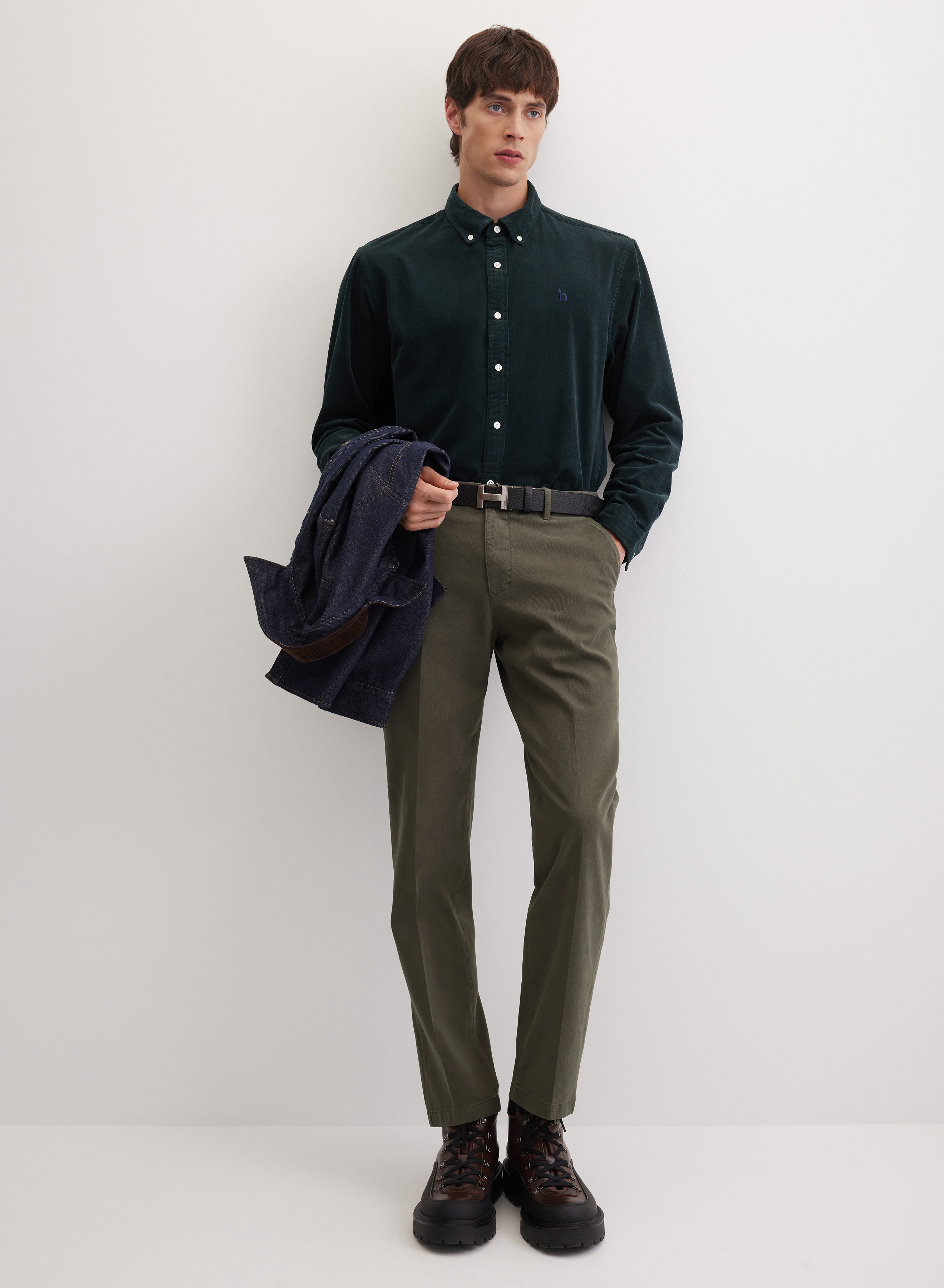 Сочетается с рубашками с длинным рукавом и пиджаками в деловом стиле. Комбинируется с рубашками-поло, джемперами и кардиганами. В расслабленном варианте брюки можно носить с футболками-поло, худи или свитшотами.