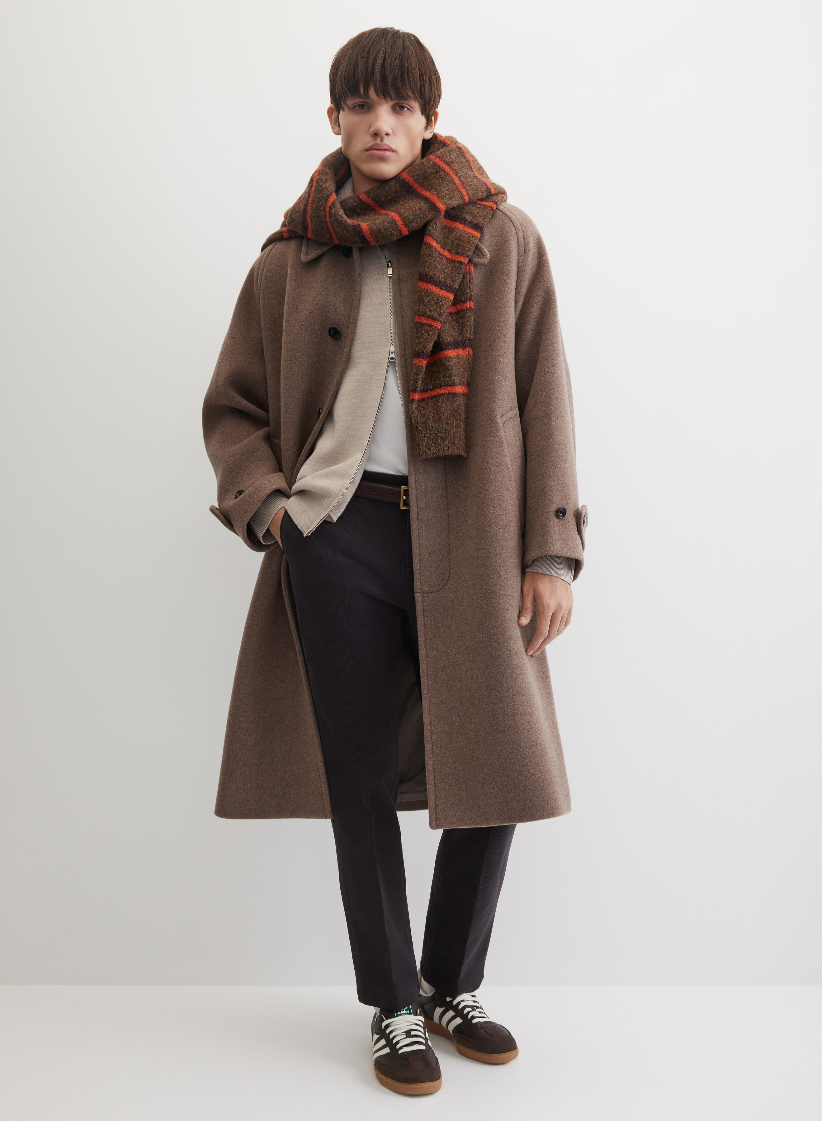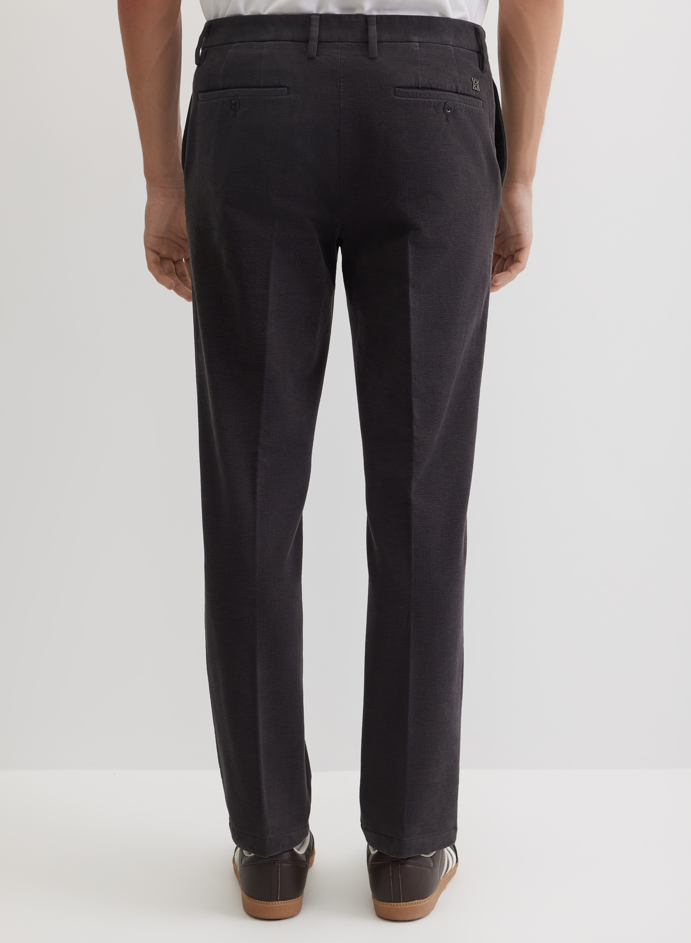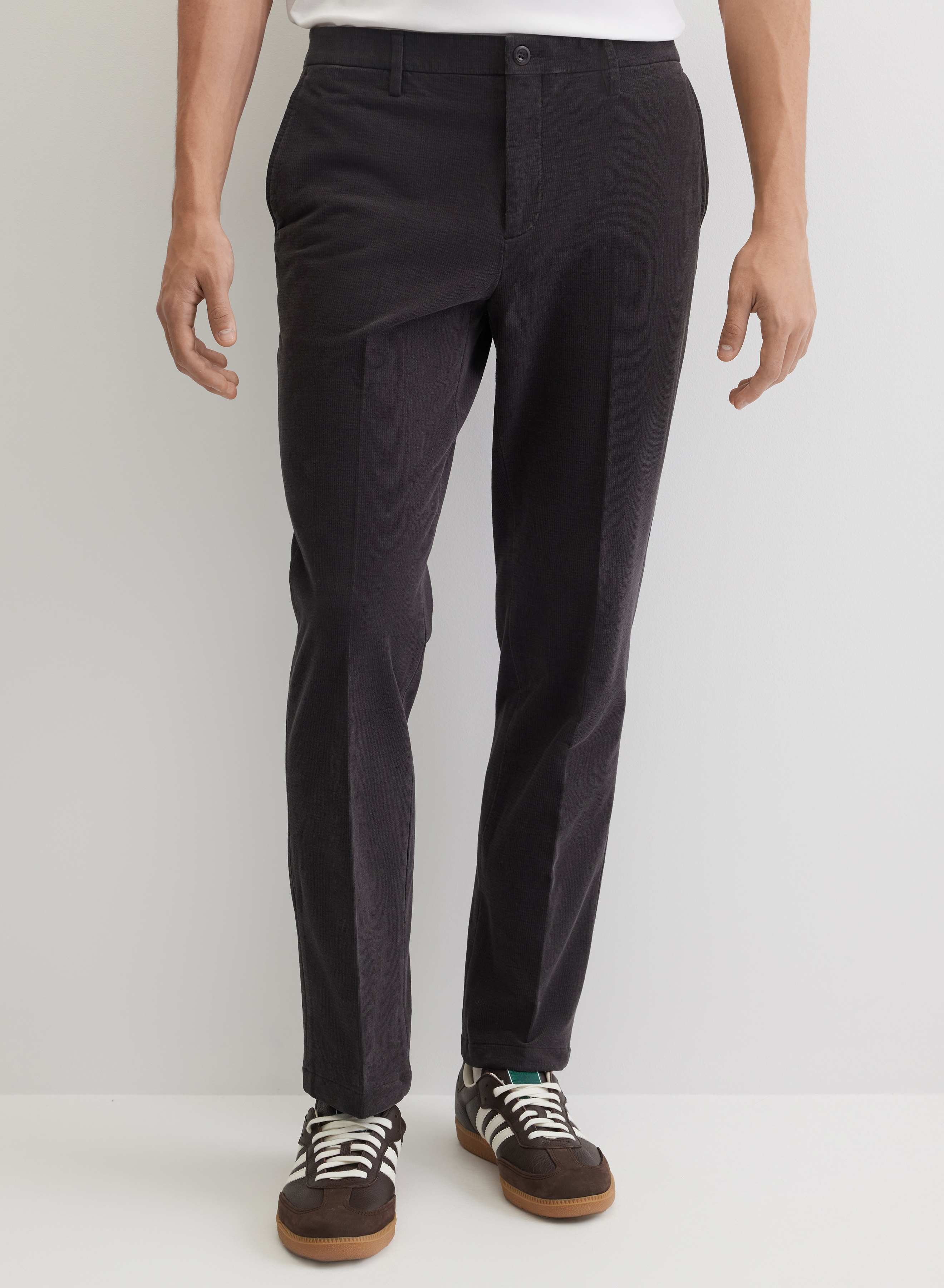 Модель сочетается с рубашками из текстурированных материалов, тонкими свитерами-поло и джемперами. Брюки можно комбинировать с кожаными кедами, белыми кроссовками или замшевыми лоферами.