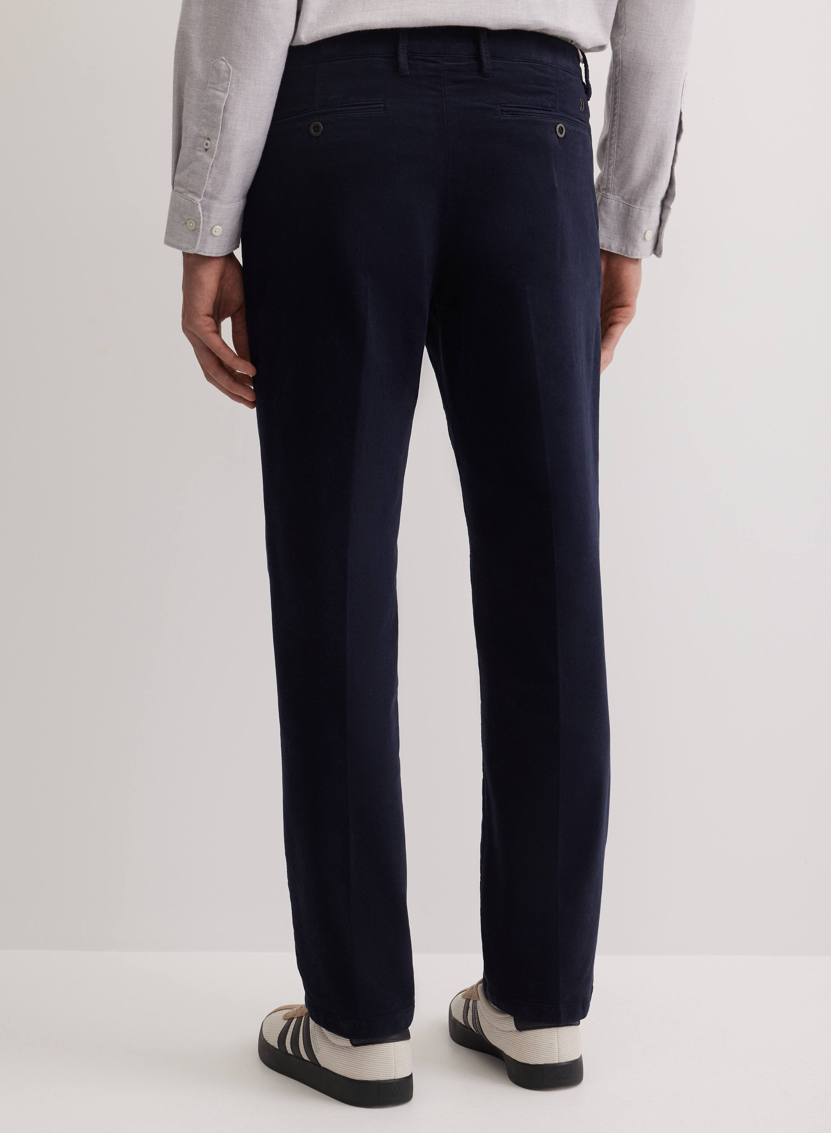 Брюки со стрелками свободного прямого кроя. Особый акцент создают прорезные задние карманы с контрастными пуговицами, добавляющие модели стилистическую завершенность. Классическая застежка на молнии и пуговице скрыта за аккуратным гульфиком.