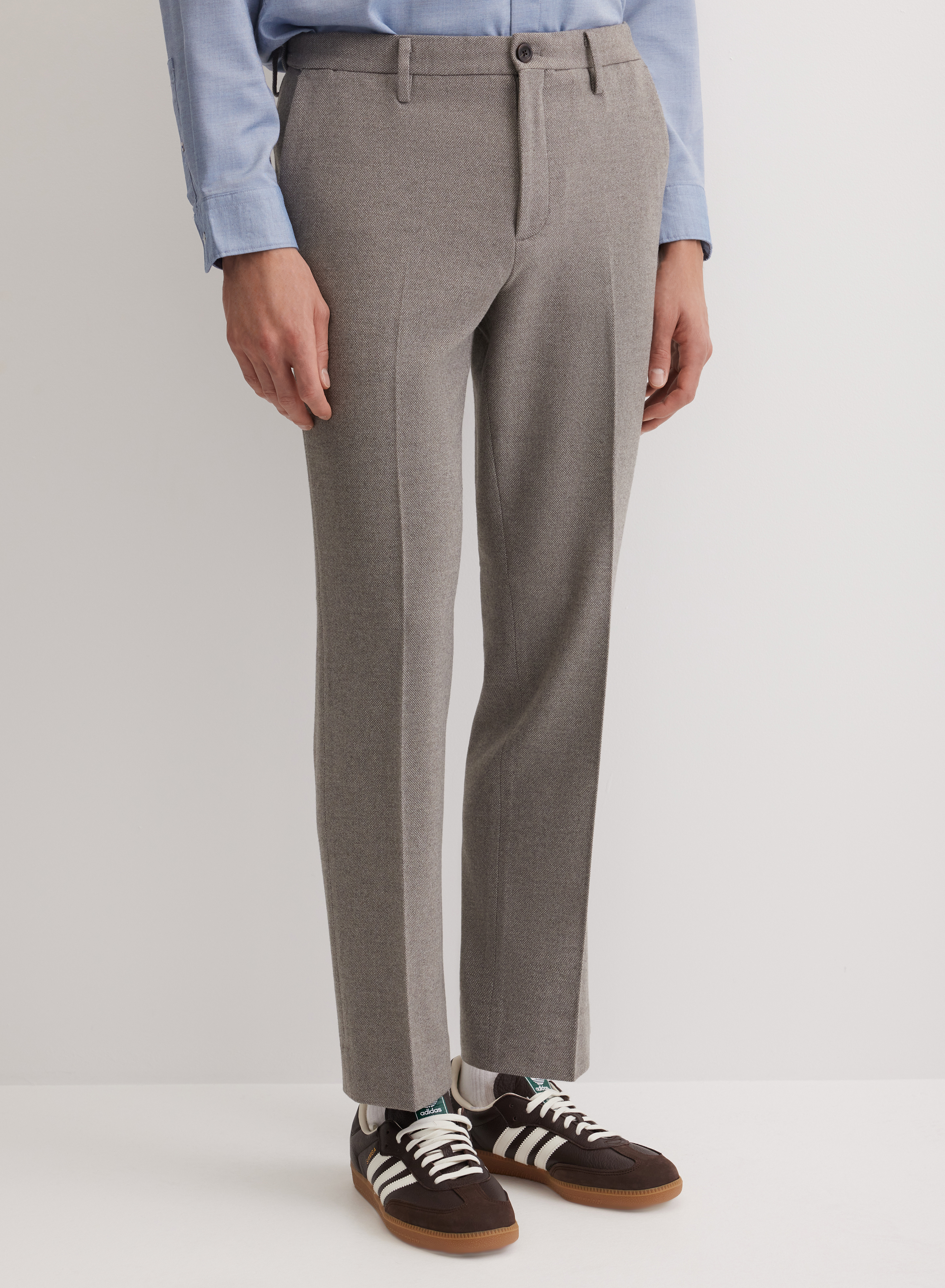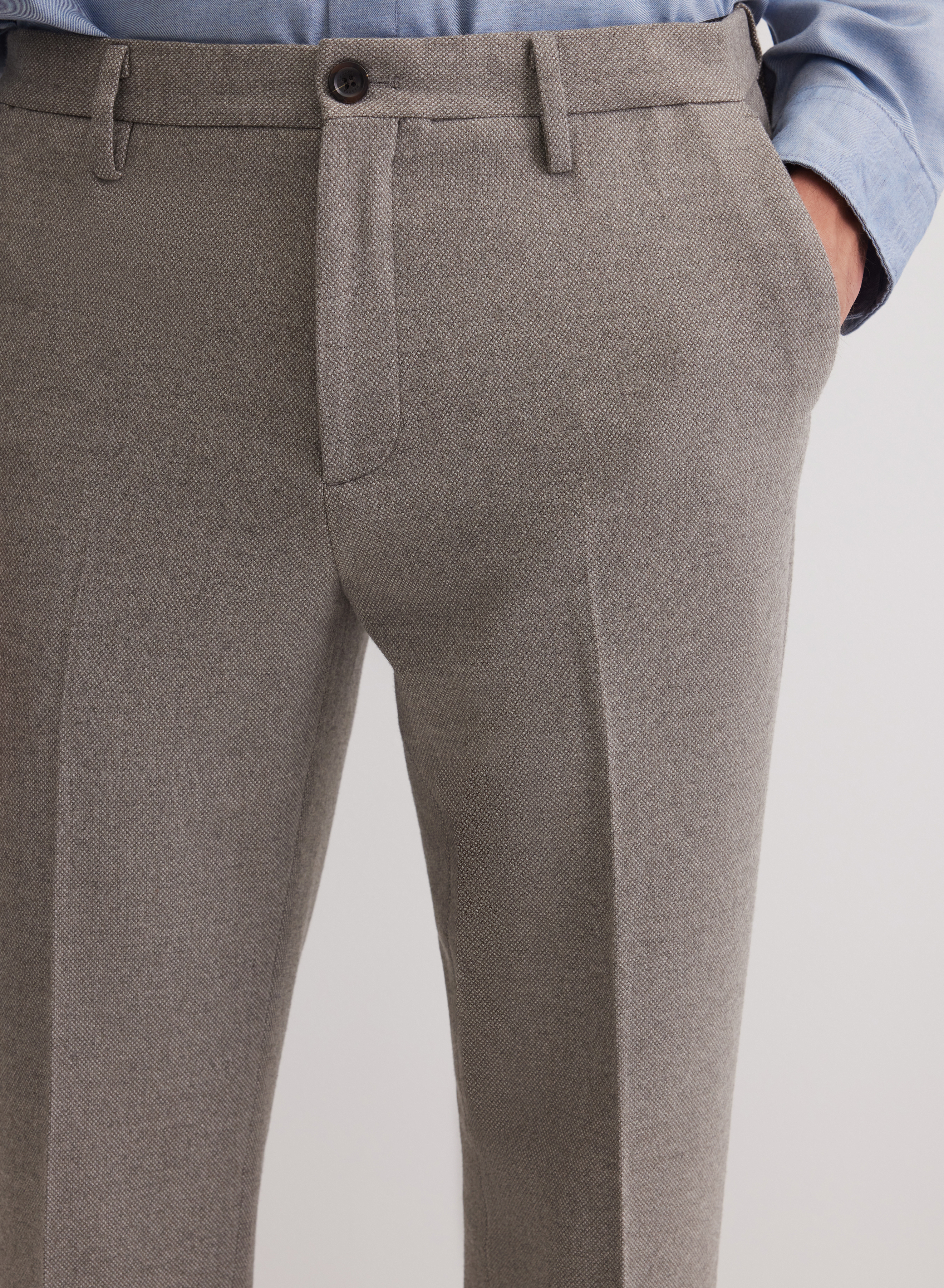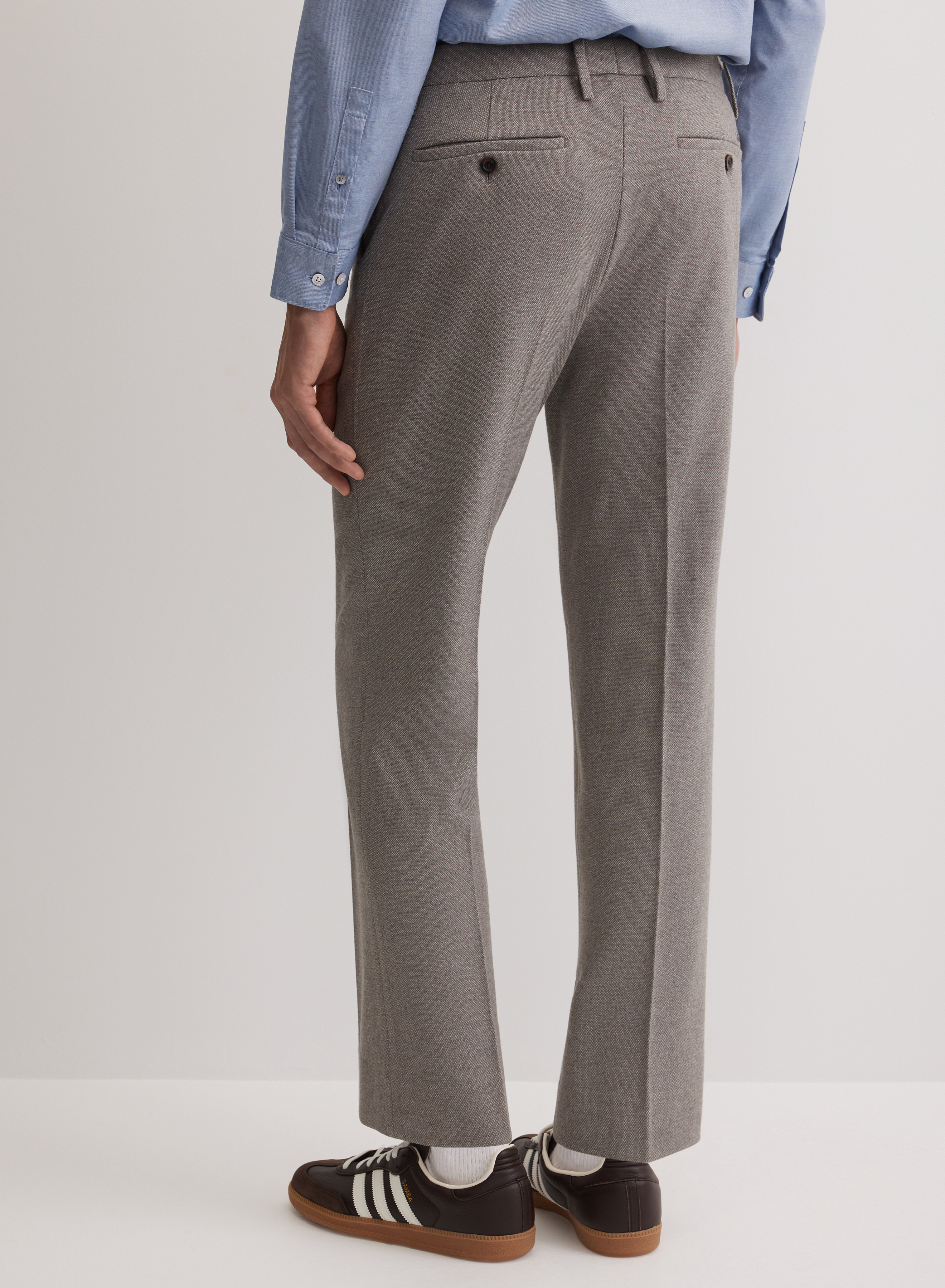 Элегантные брюки прямого силуэта средней посадки с минималистичным дизайном. Модель с акцентом на чистые линии: застежка на молнию скрыта за гладким гульфиком, а шлевки для ремня обеспечивают точную посадку по талии. Отсутствие накладных карманов и лаконичные прорезные карманы сзади подчеркивают строгость силуэта.