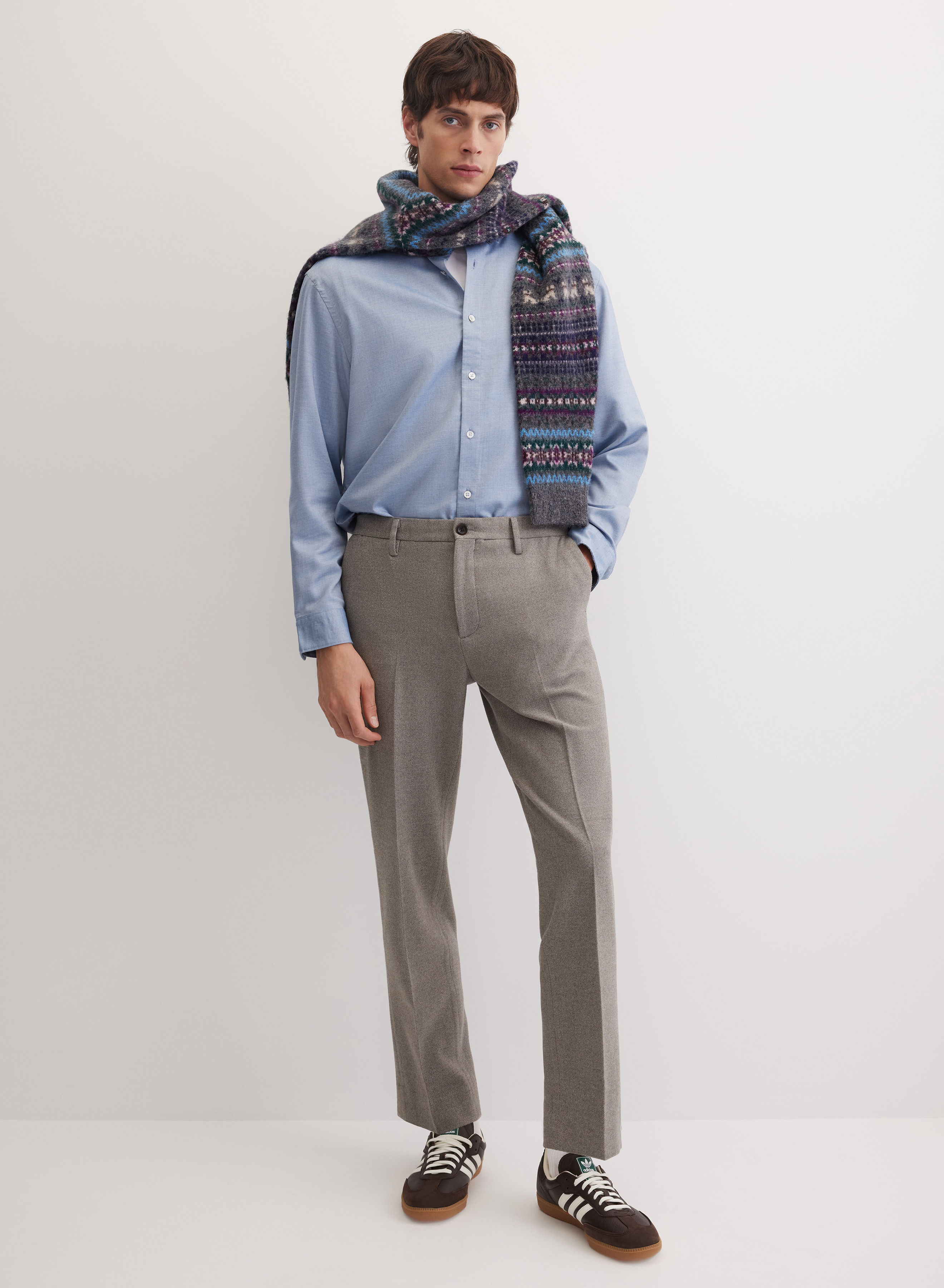 Модель сочетается с классическими рубашками, укороченными блейзерами и джемперами. Для современных образов можно комбинировать с кожаными кедами, кроссовками или замшевыми лоферами. Получится экспериментировать с любым верхом — от вельветовой до шерстяной куртки.