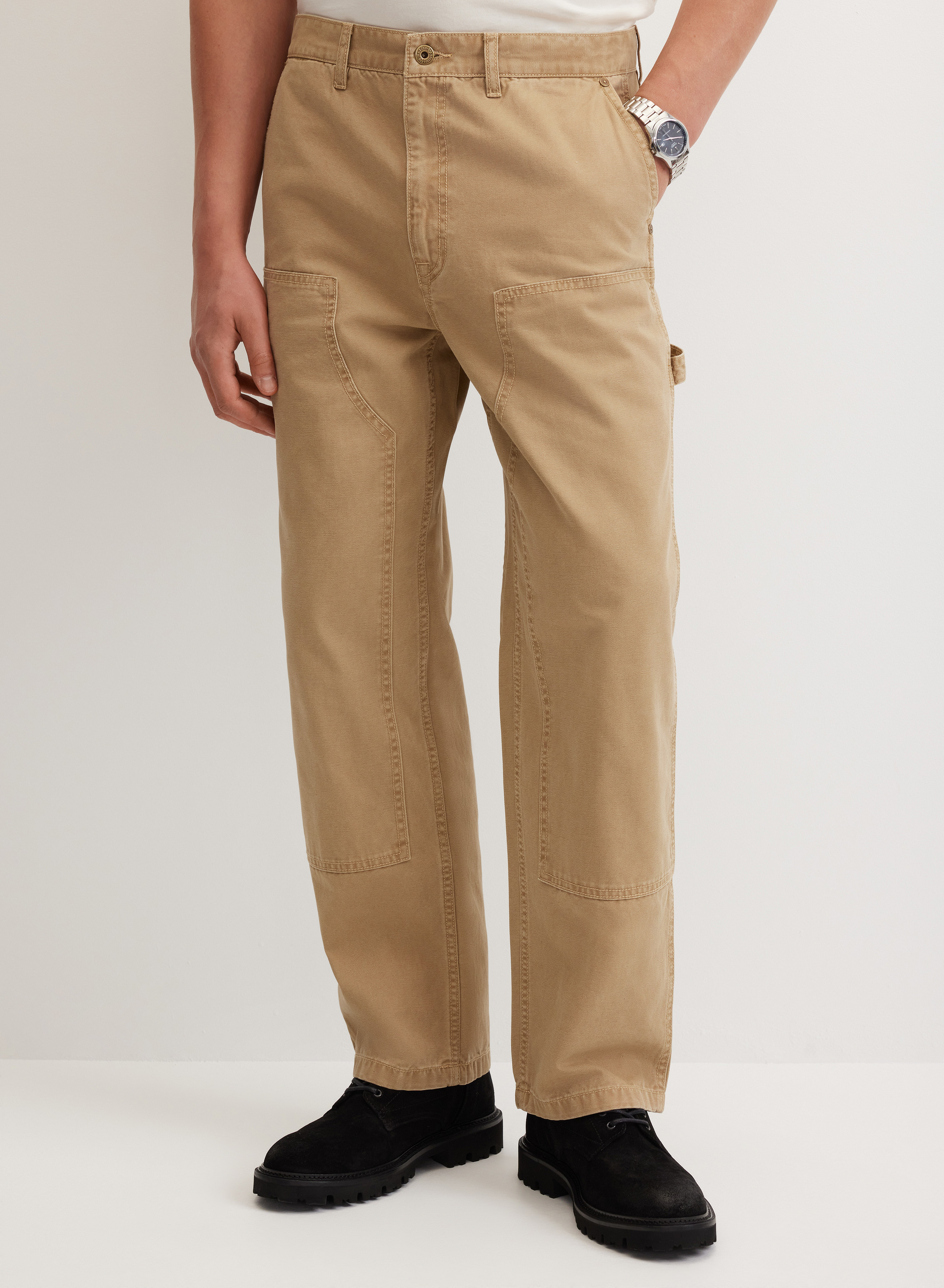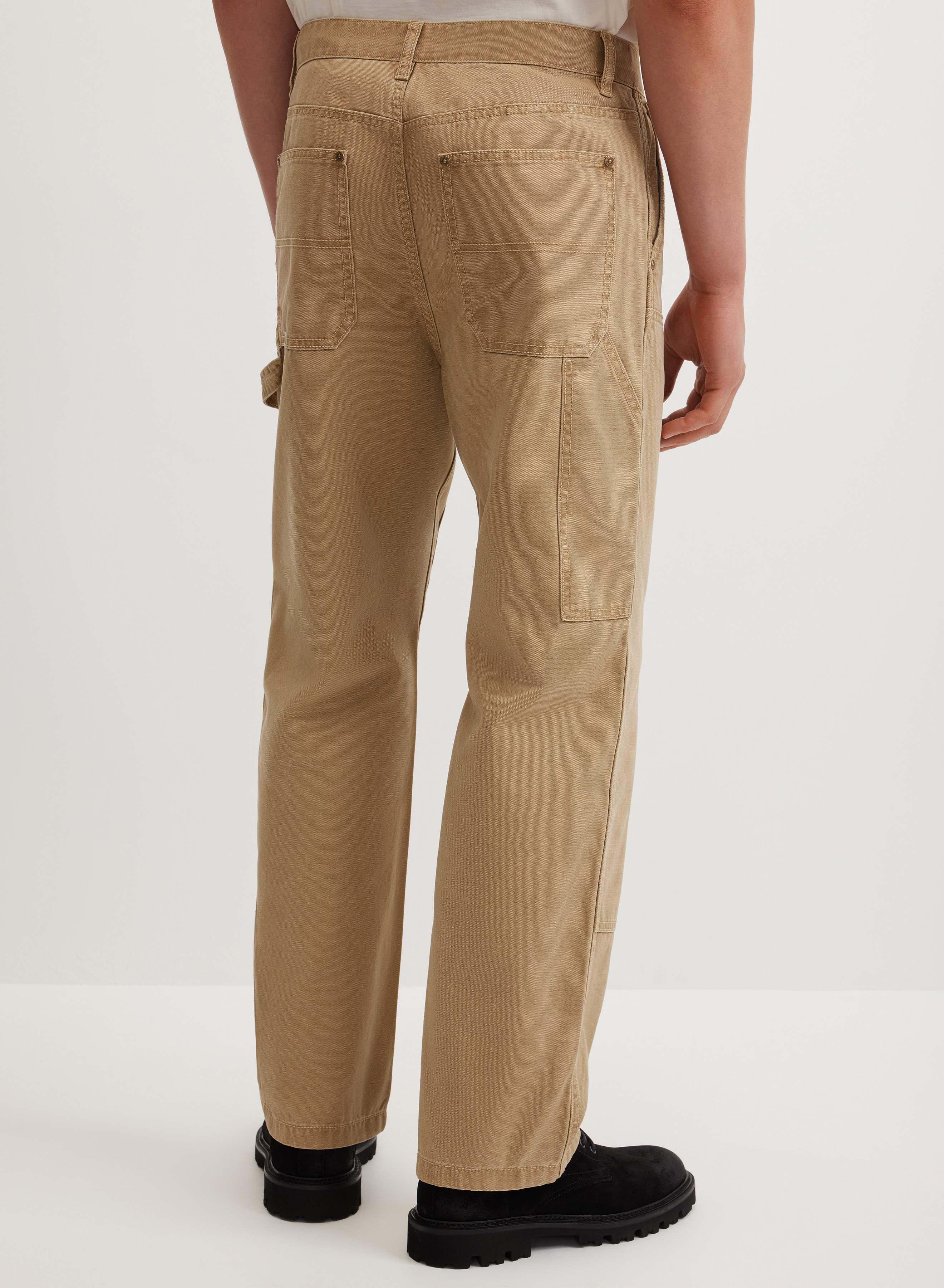 Брюки бежевого цвета предназначены для активного отдыха. Застежка на молнию расположена в центральном переднем шве, дополнена металлической пуговицей. Притачной пояс со шлевками под ремень регулирует посадку. Крупные накладные карманы спереди и сзади добавляют функциональности.