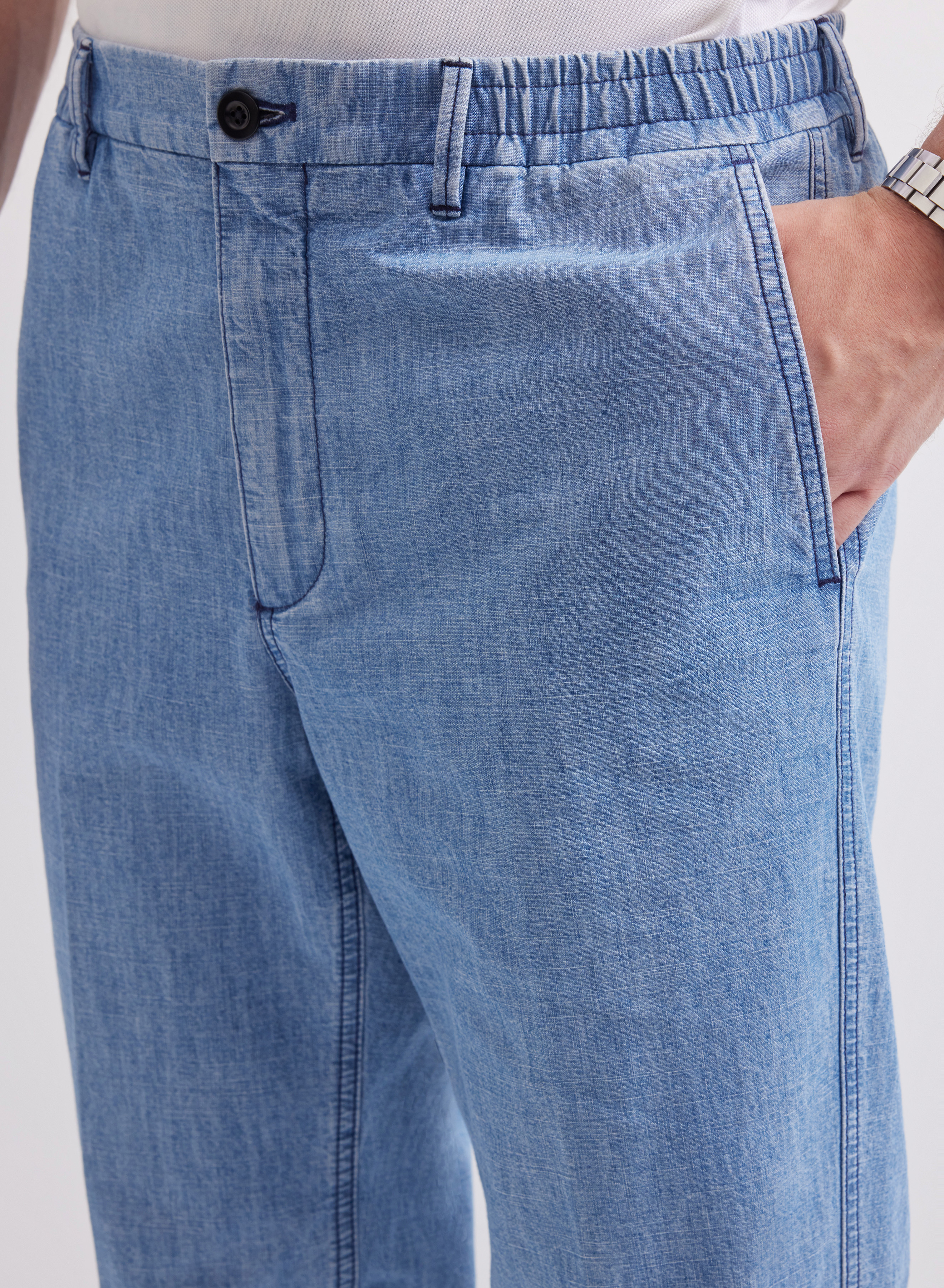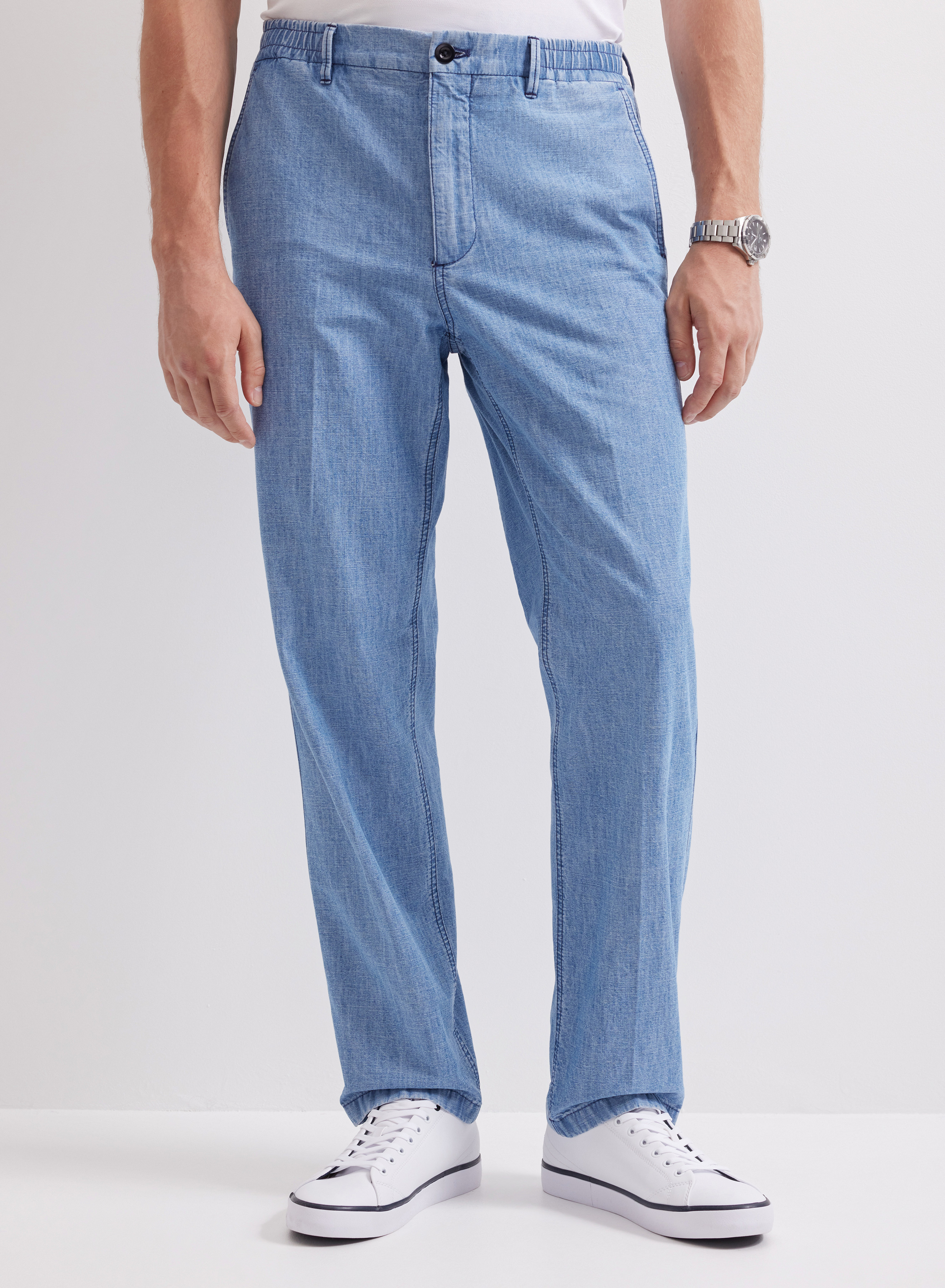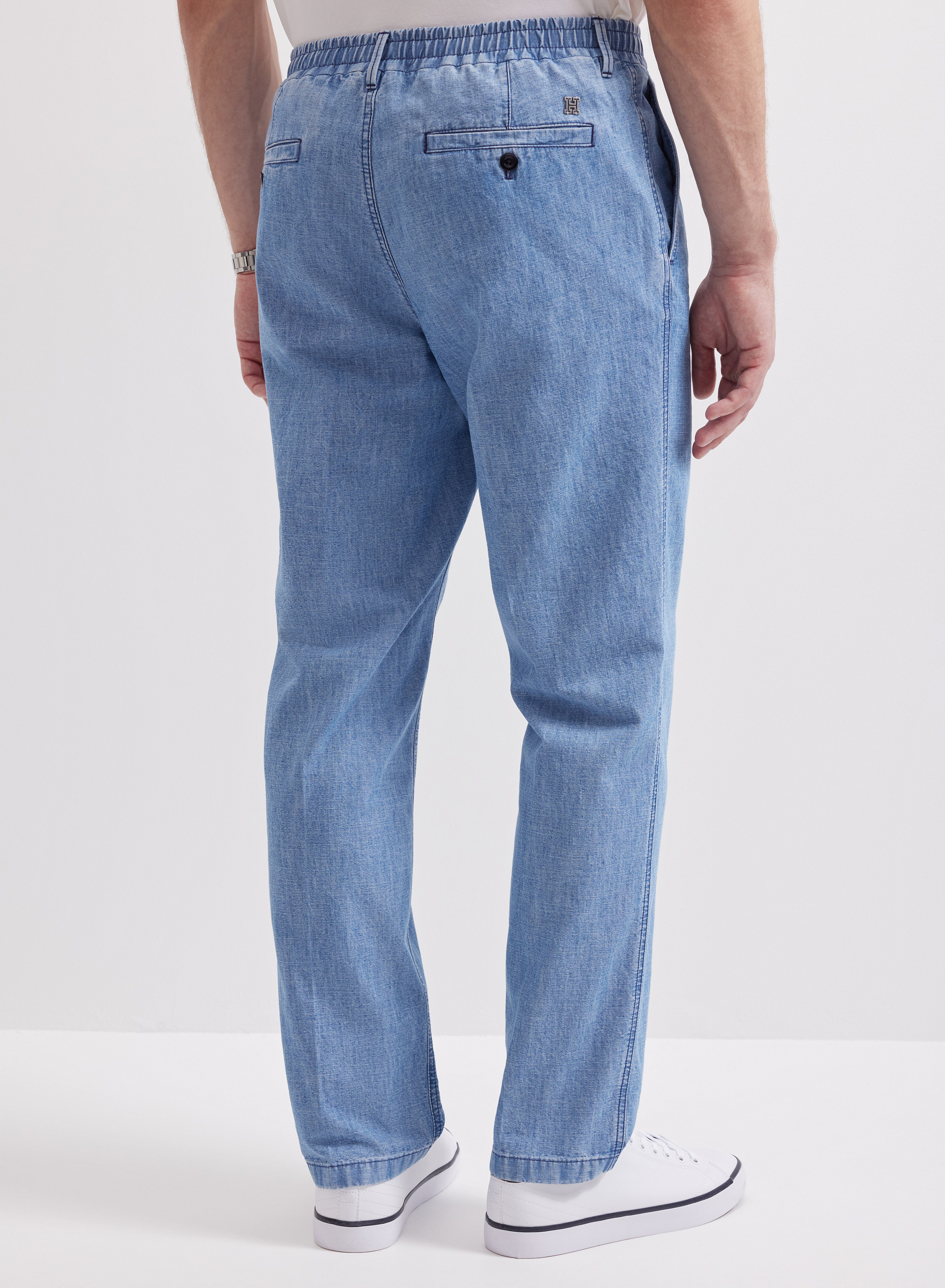 Джинсы изготовлены из натурального хлопкового денима средней плотности, что гарантирует комфорт в движении без потери формы. Материал обладает естественной воздухопроницаемостью, устойчив к деформациям в области колен и сохраняет цвет надолго. Специальная обработка ткани предотвращает усадку после стирки.