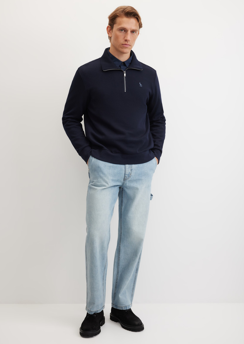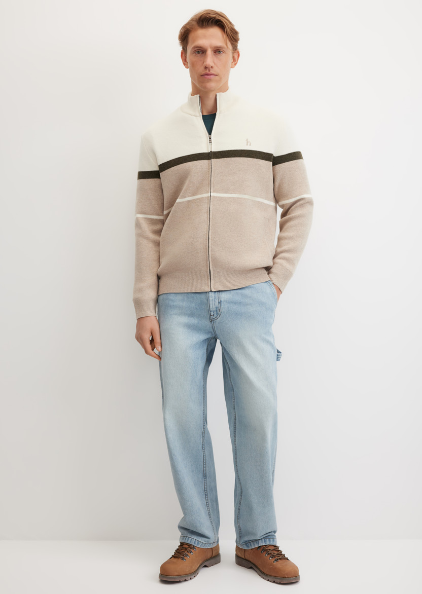 Стильный синий кардиган с широкими белыми полосками на рукавах