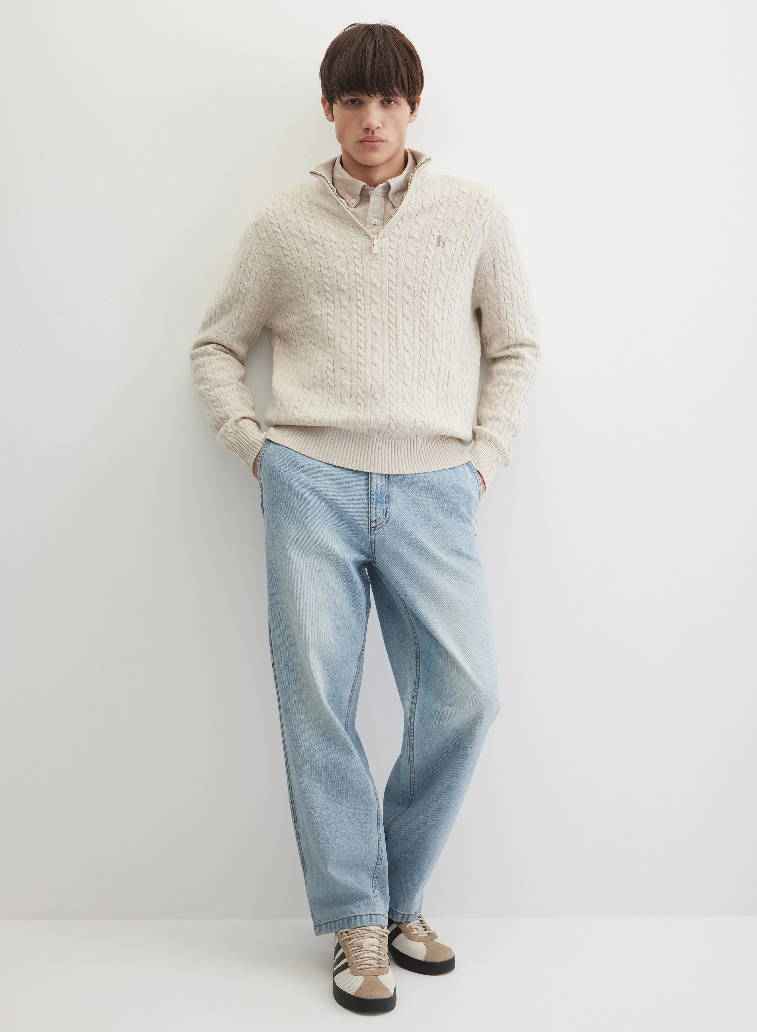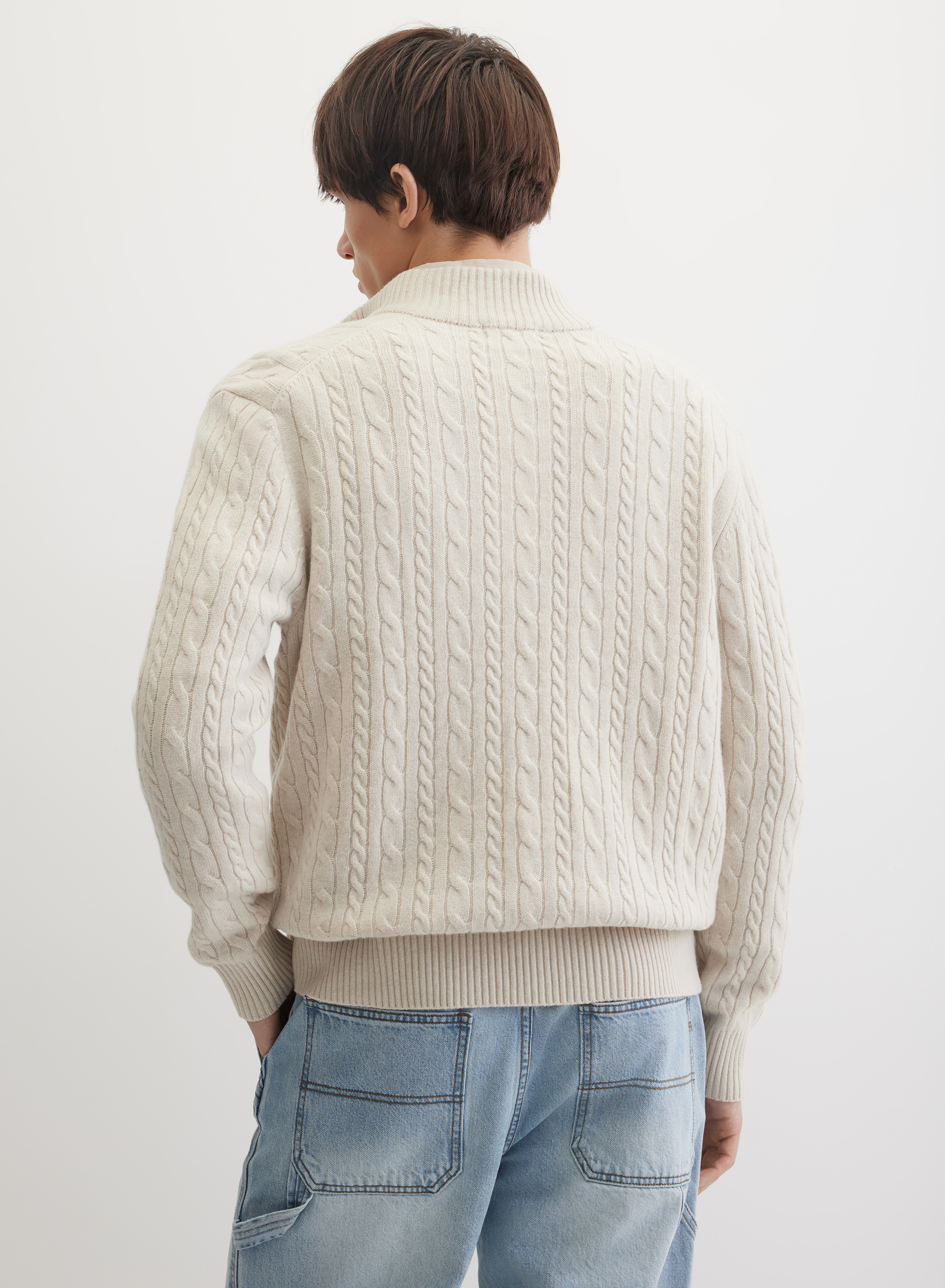 Джемпер прямого силуэта оформлен объемным вязаным узором в виде косы, который создает выраженную фактуру и рельеф. Застежка на молнию в тон изделия доходит до середины груди, позволяя регулировать степень открытости ворота. Манжеты и линия низа имеют широкие эластичные планки в мелкий рубчик, что обеспечивает аккуратную посадку и возможность ее точной регулировки.