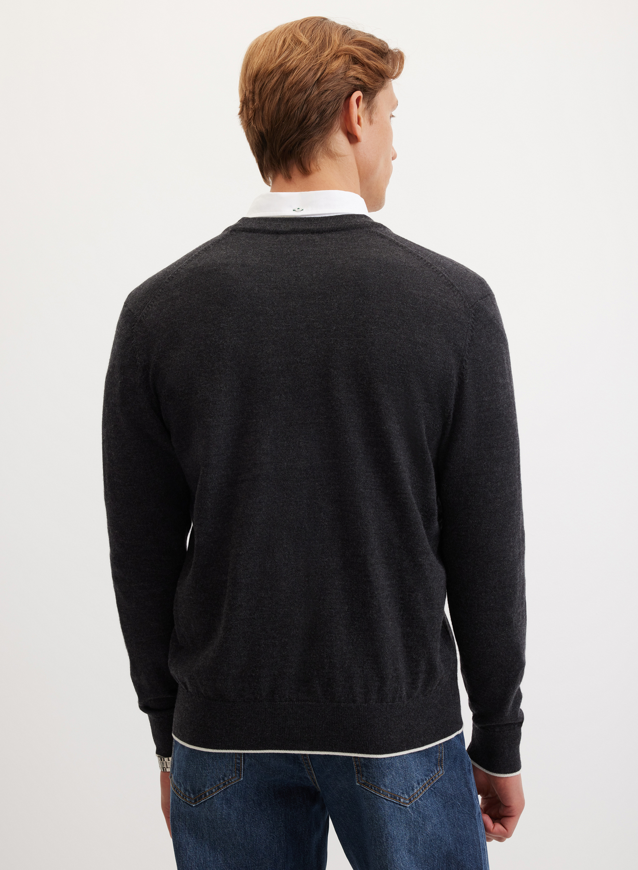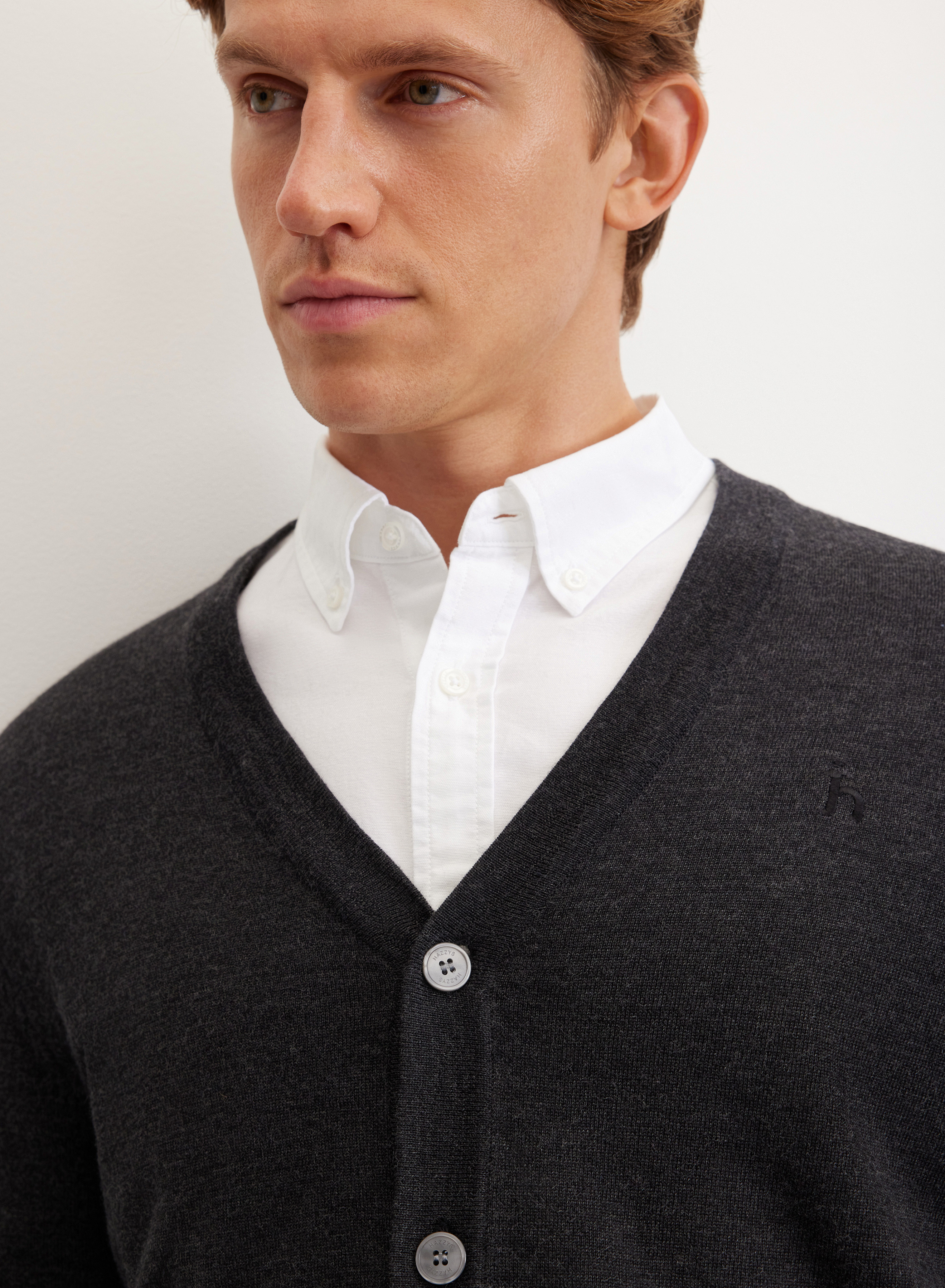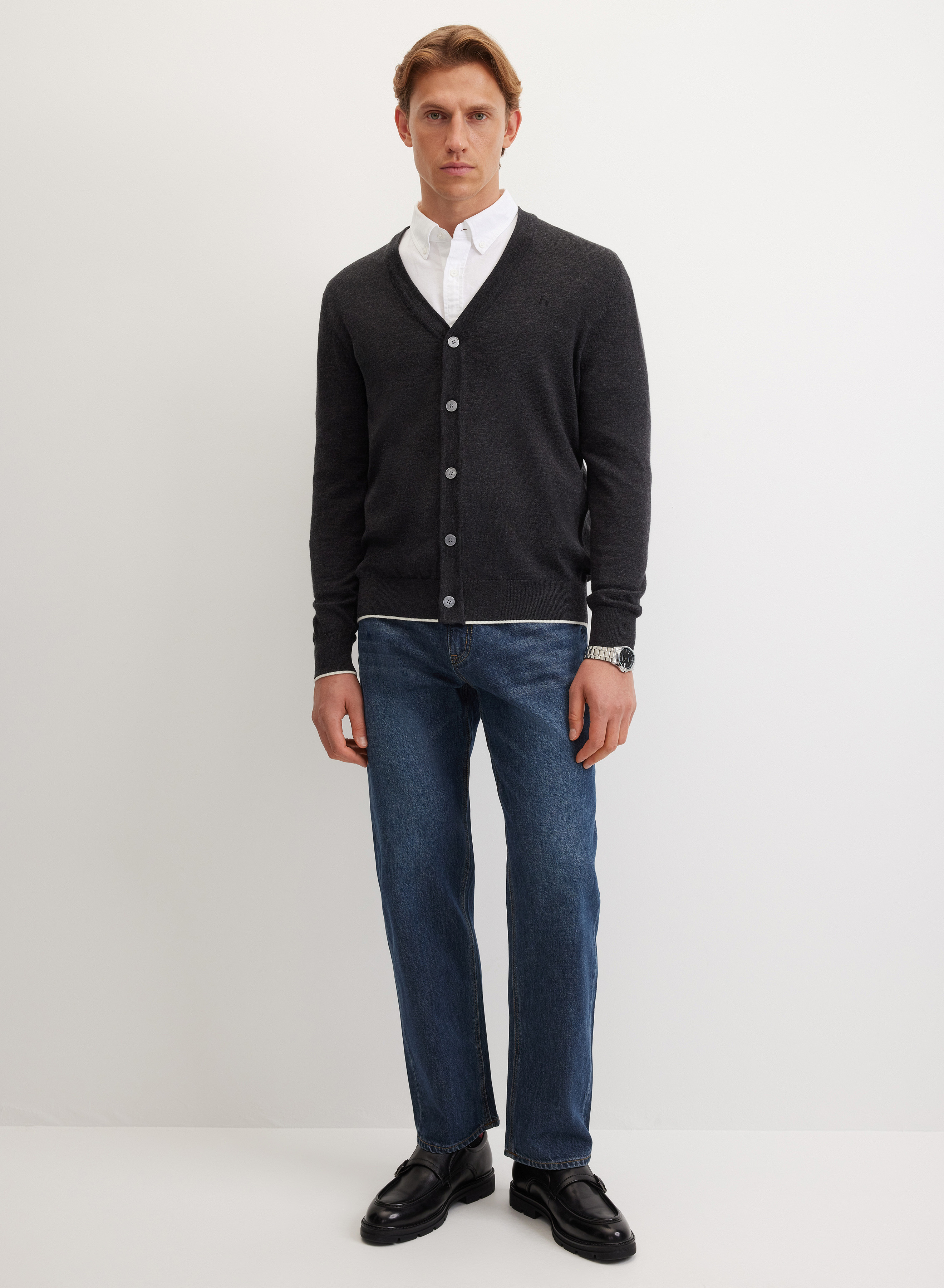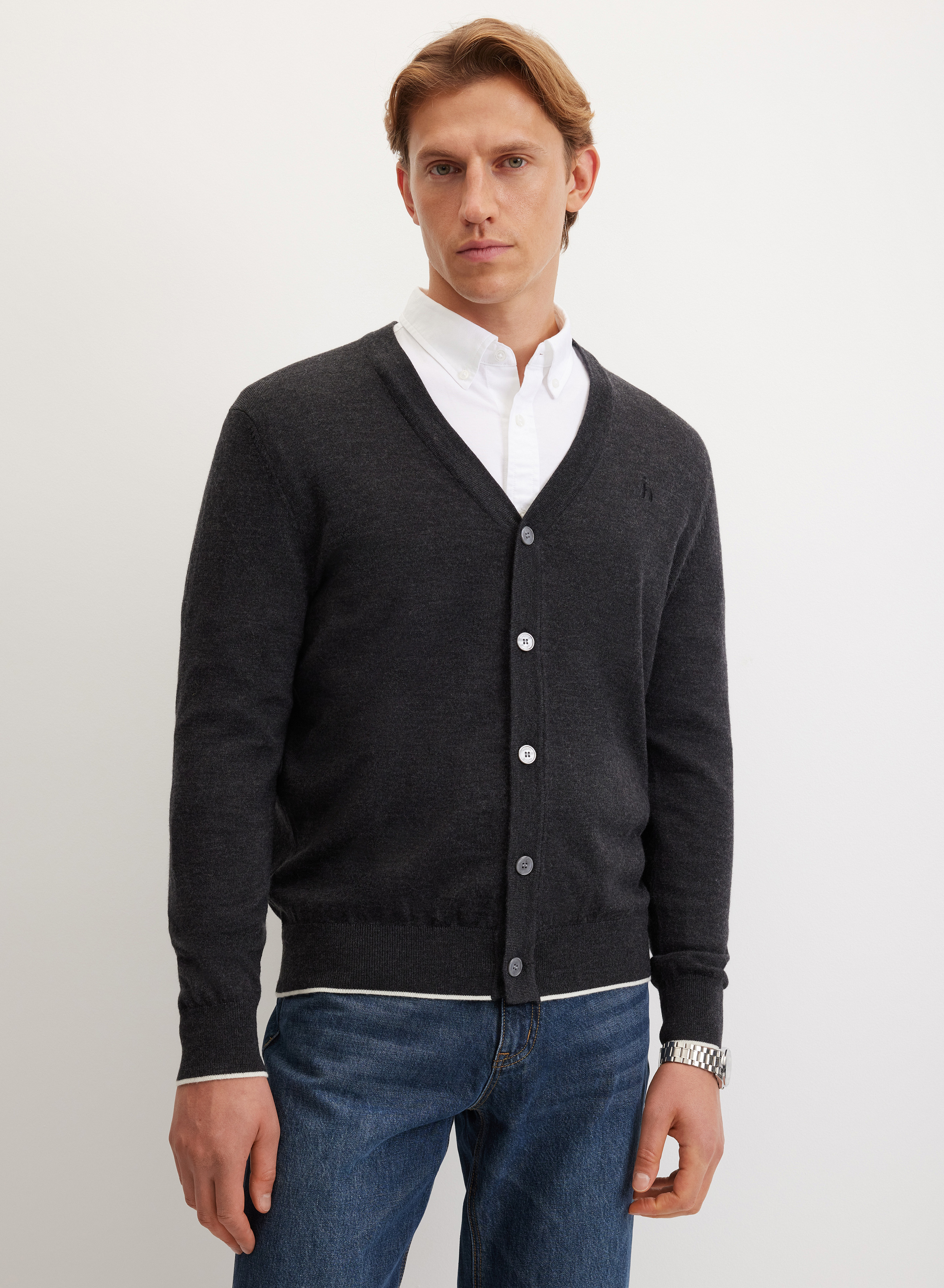 V-образный вырез позволяет дополнять комплект платком или шарфом, создавать разнообразные комбинации с водолазками и блузами. Кардиган хорошо сочетается с джинсами и классическими брюками, гармонично вписывается в повседневный или деловой стиль.