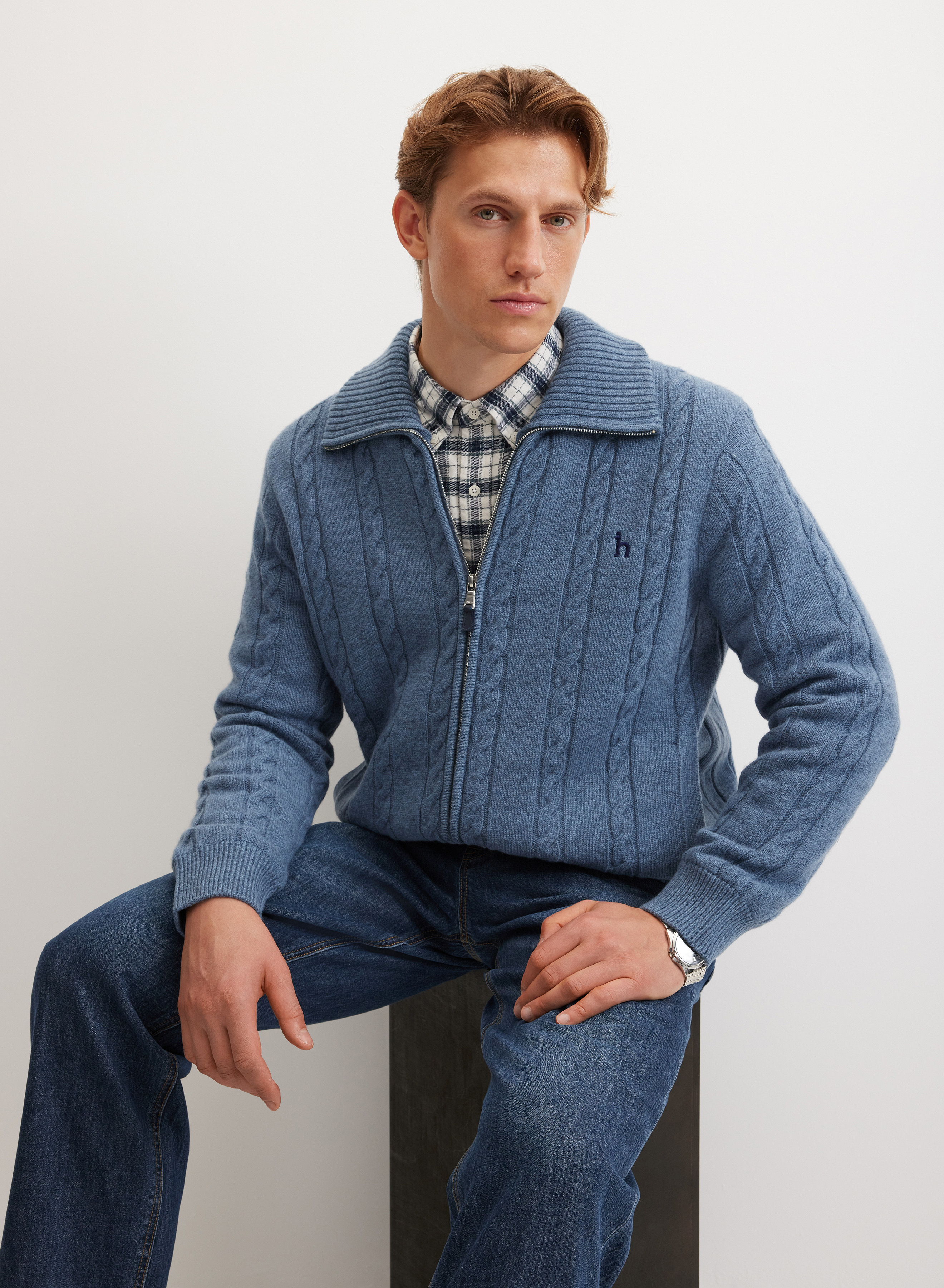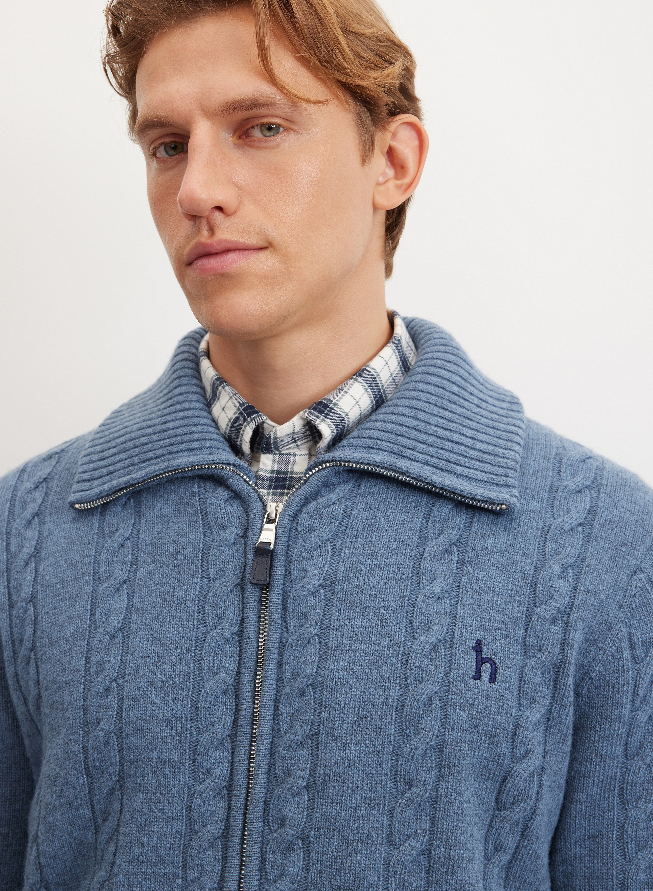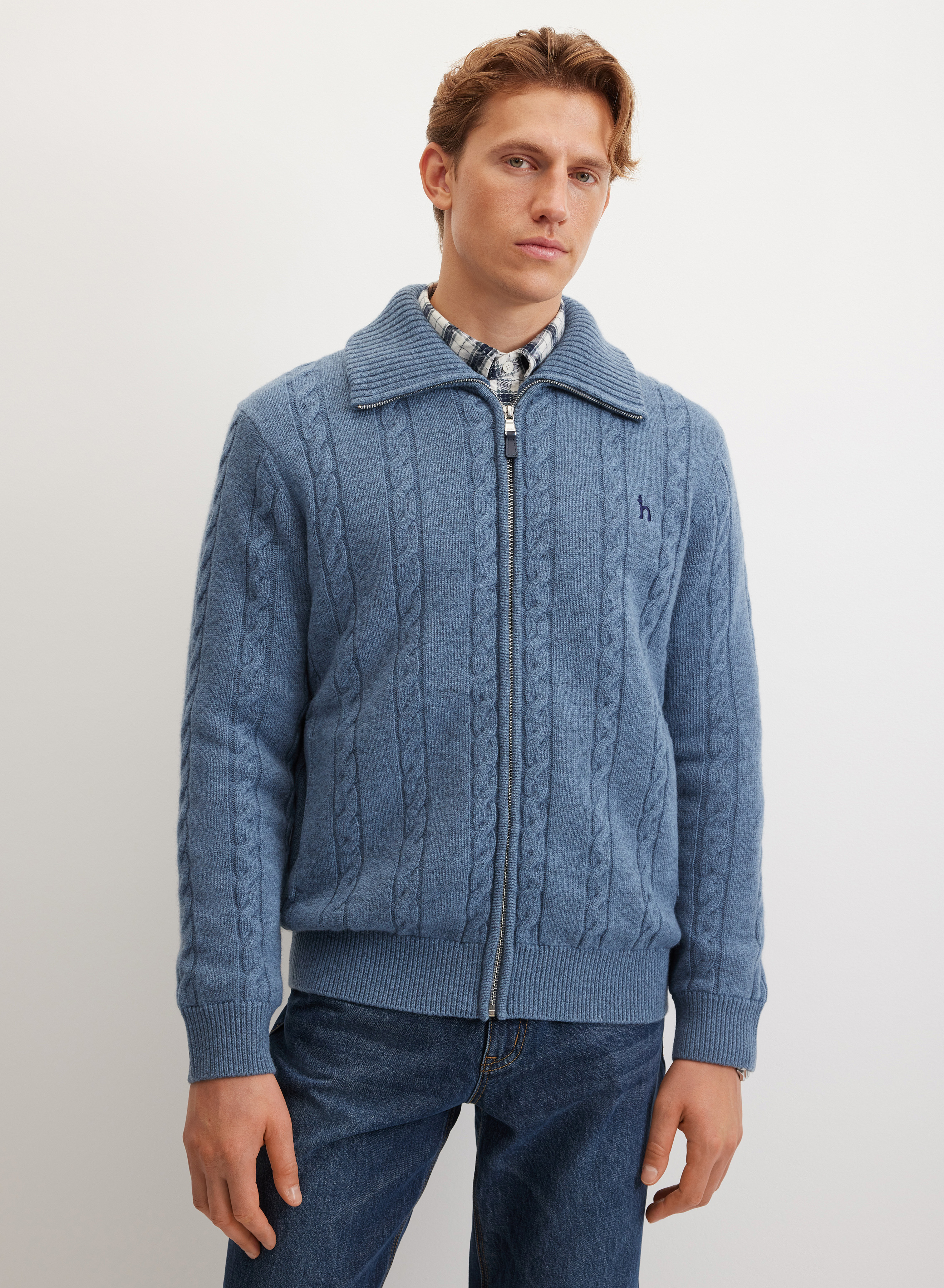Кардиган прямого кроя с длинными рукавами обеспечивает комфортную посадку и свободу движений. Застежка-молния по всей длине позволяет регулировать степень открытости в зависимости от погоды. Изделие дополнено объемными узорами-косами, которые создают рельефную поверхность.
