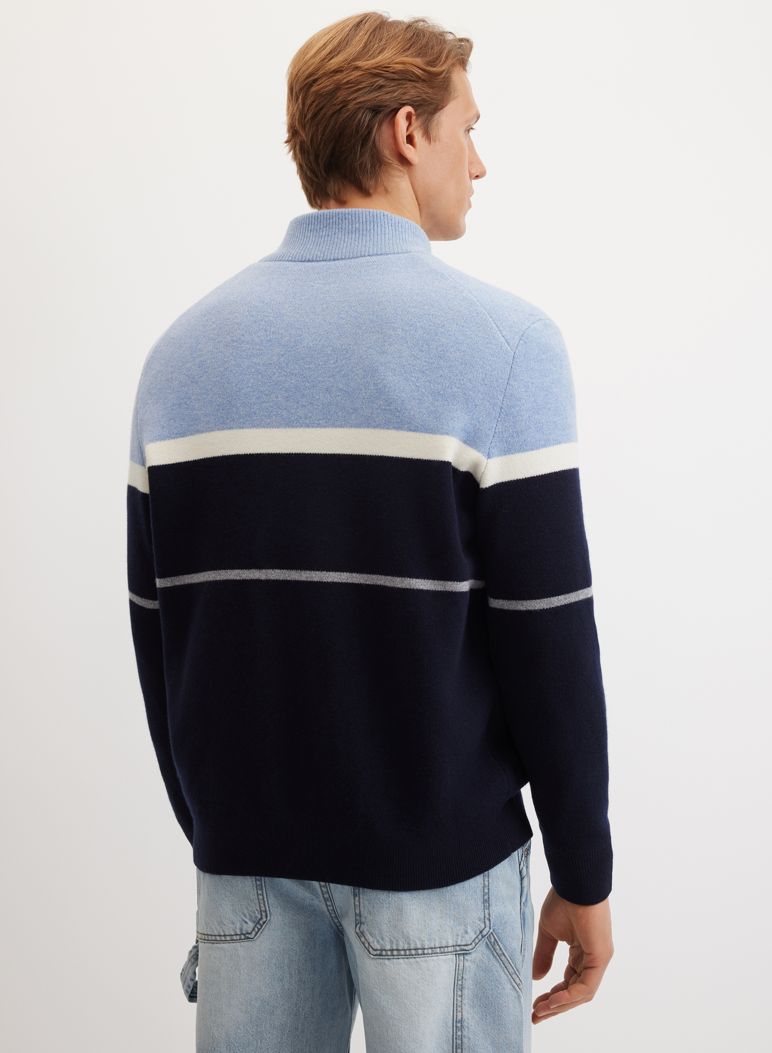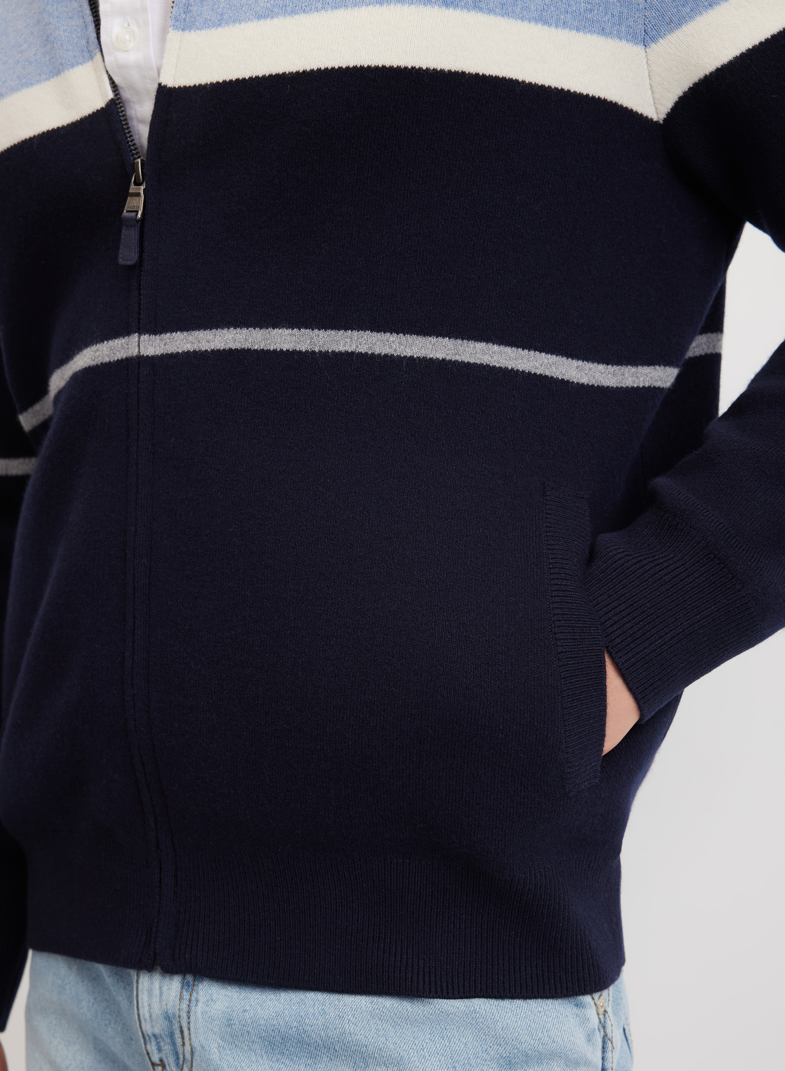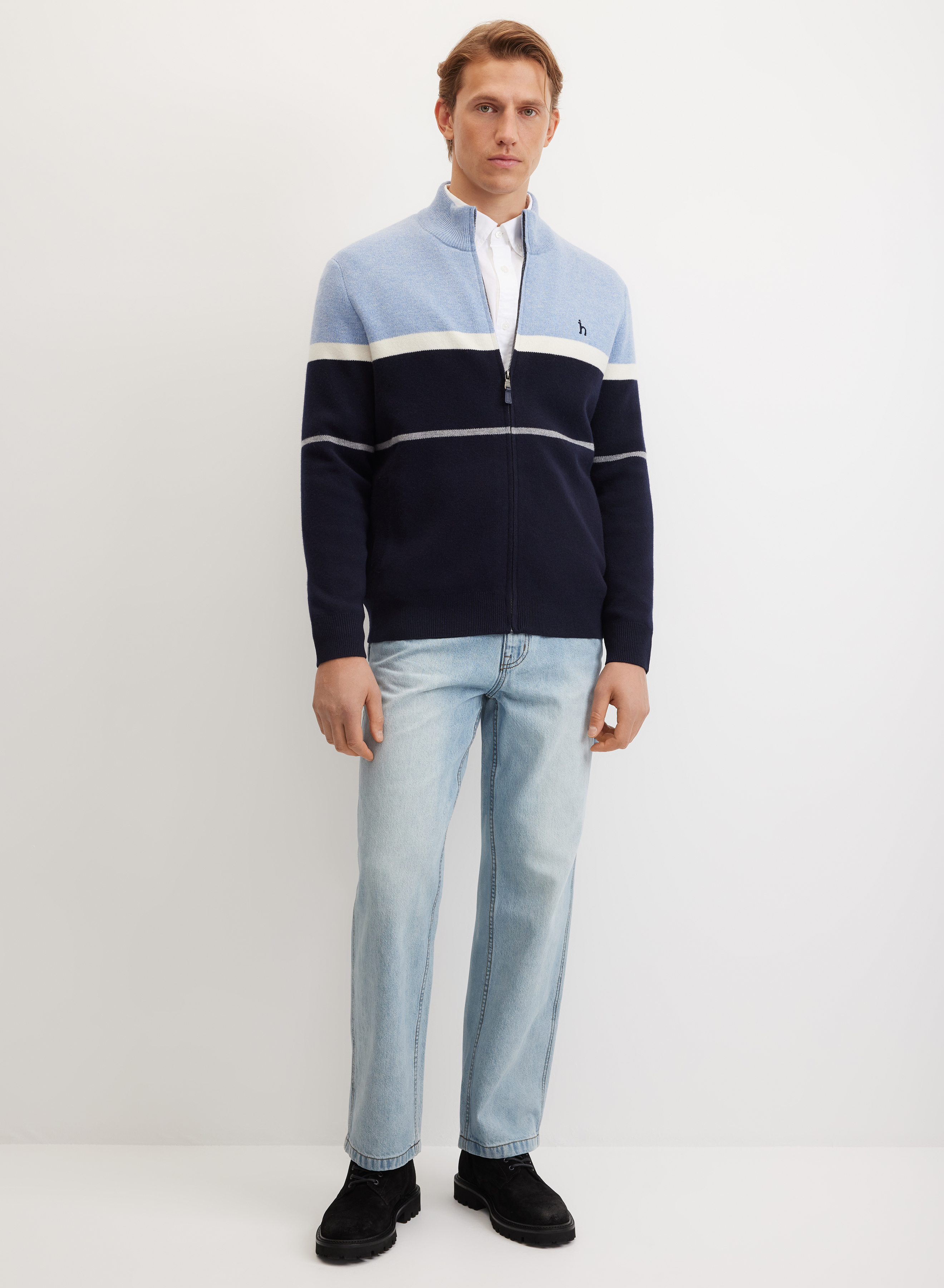 Кардиган прямого кроя с застежкой на молнии по всей длине. Модель отличается классическим дизайном с контрастным полосатым узором. Длинные рукава со слегка спущенной линией плеча не стесняют движений, создают динамичный силуэт. Высокий воротник и манжеты оформлены вязкой в рубчик, обеспечивая комфортную посадку. Пуллер на застежке-молнии и вышитый логотип Hazzys добавляют изделию завершенный внешний вид.