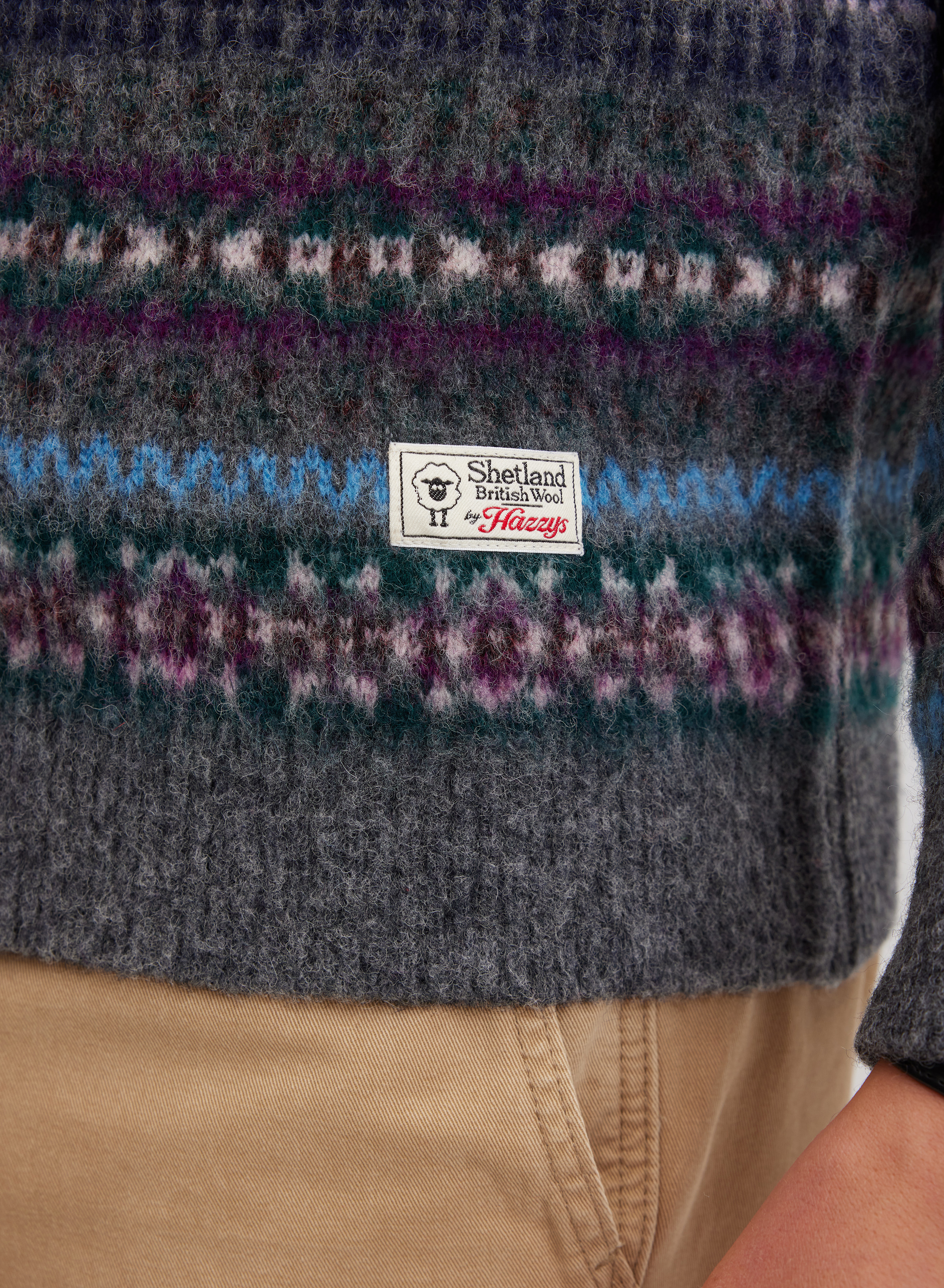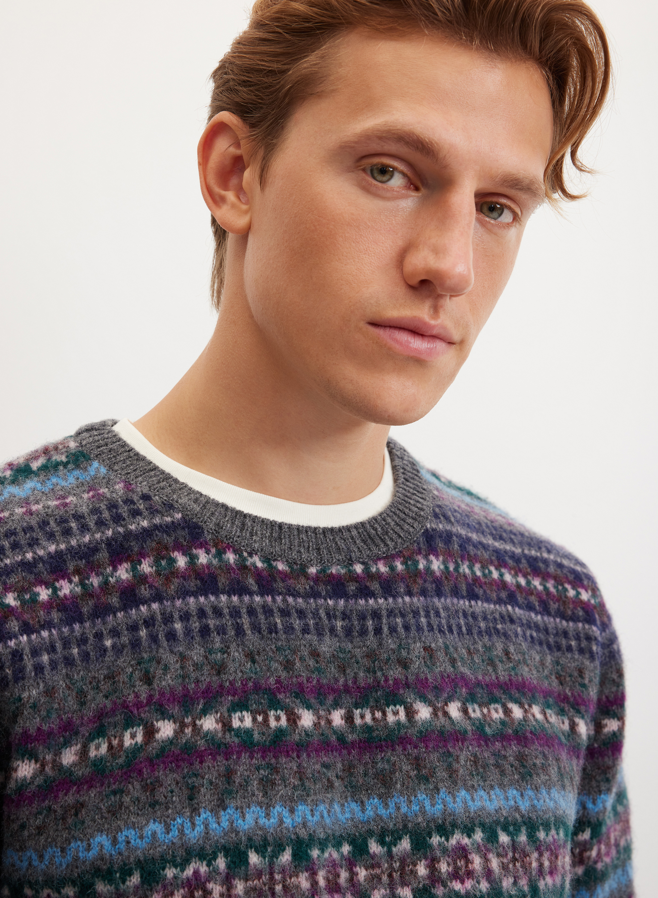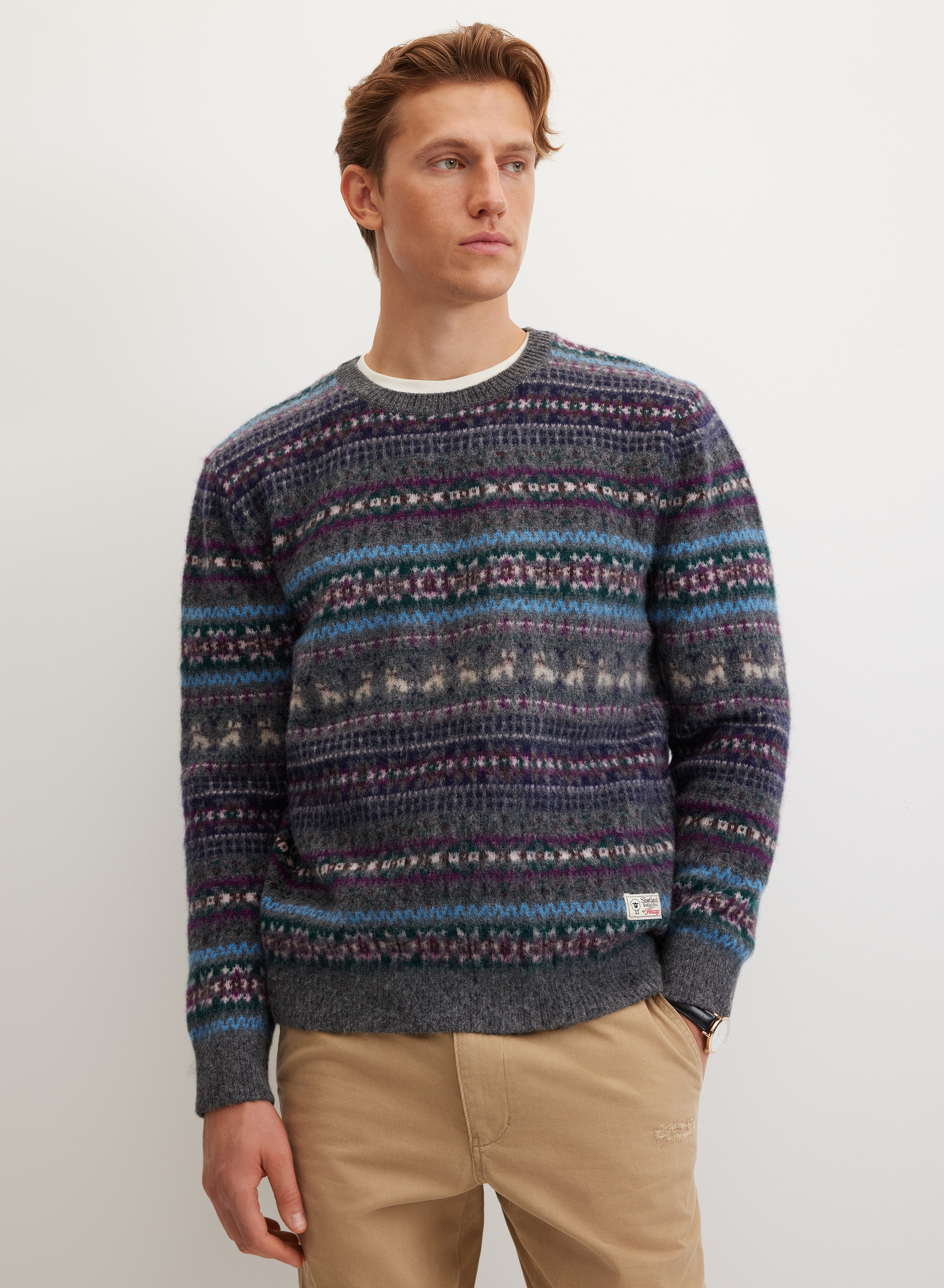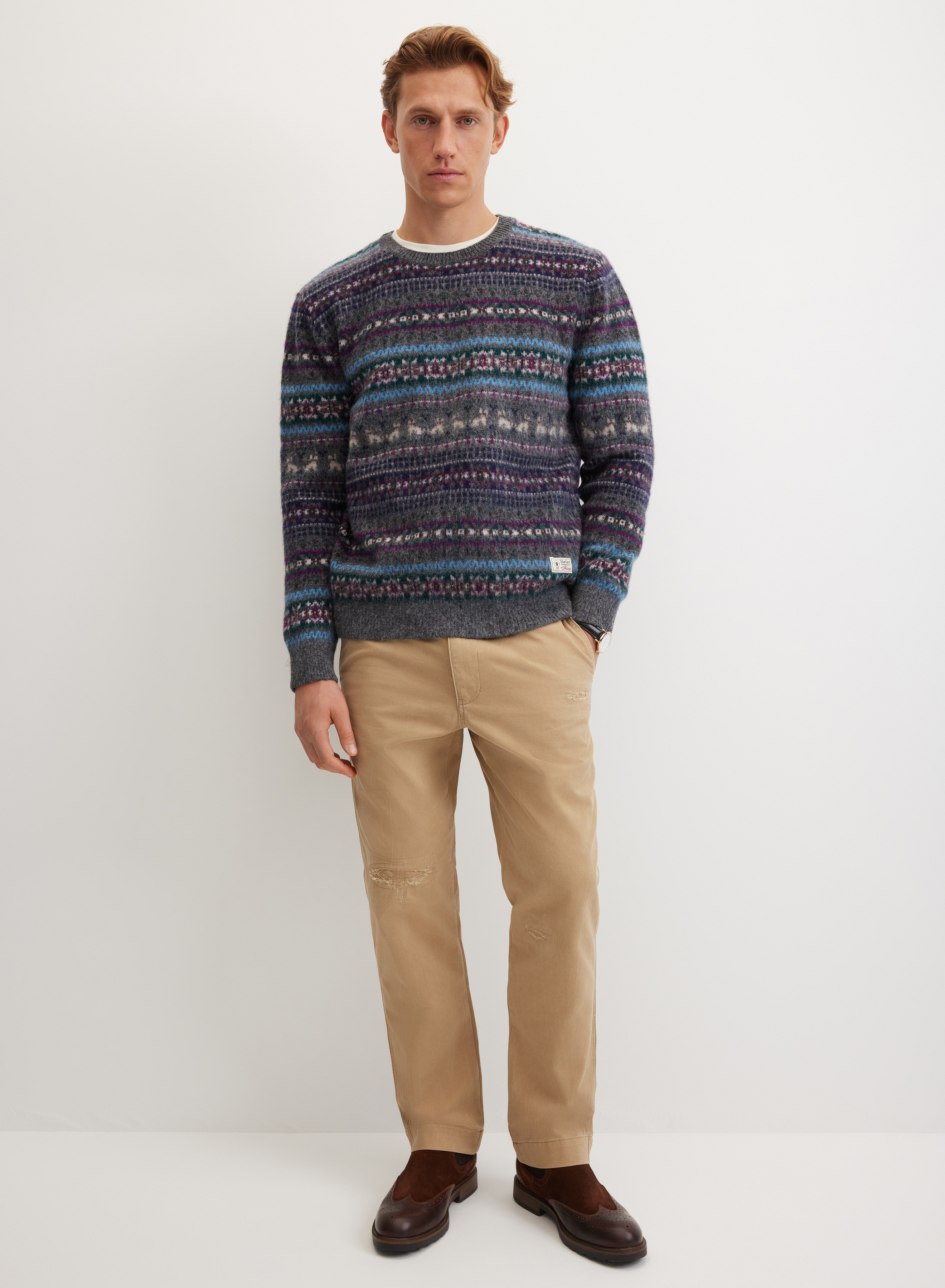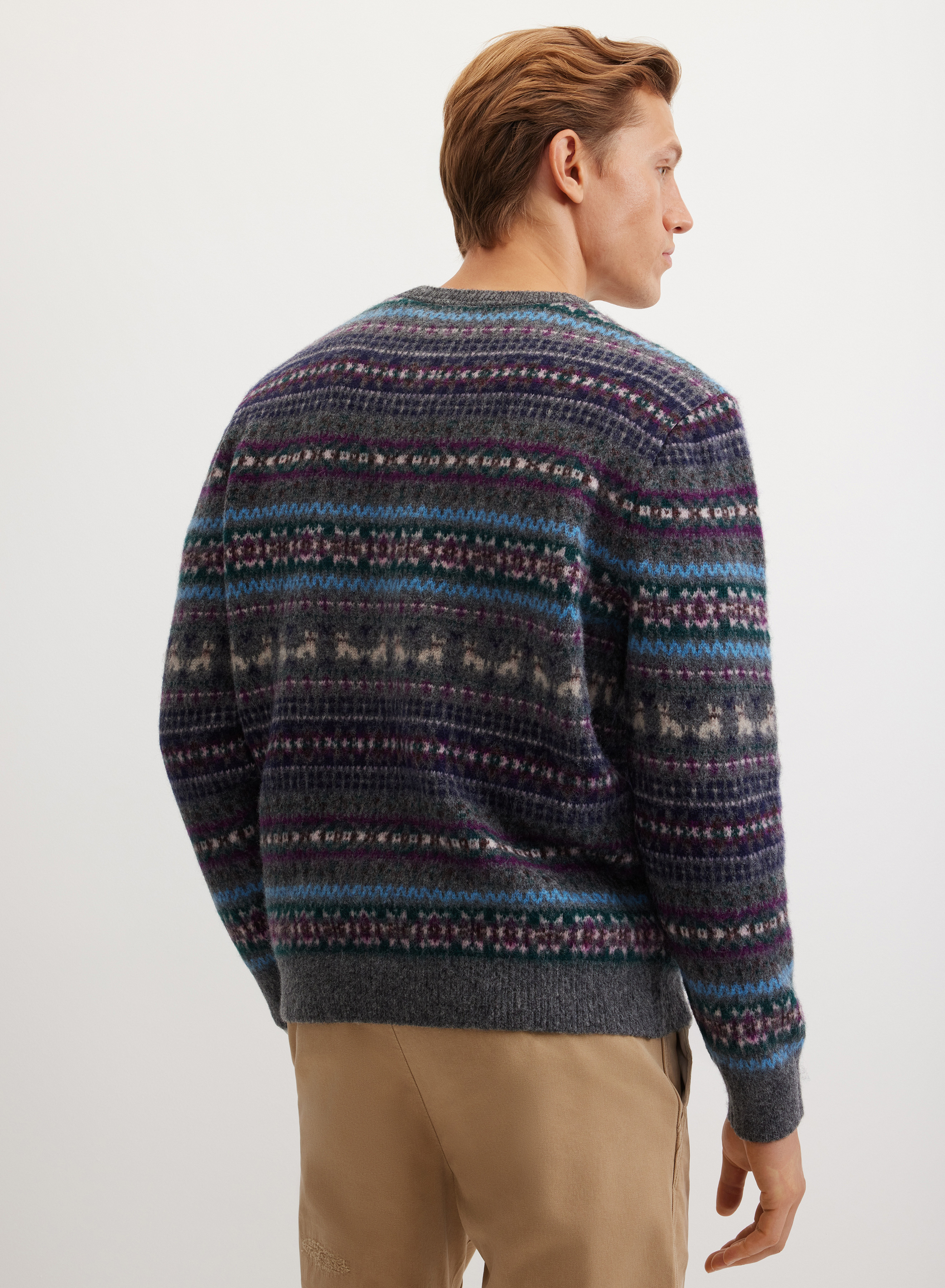 Джемпер свободного силуэта с акцентным жаккардовым узором и слегка спущенной линией плеча. Округлая горловина и ровный низ оформлены эластичной каймой. Положение рукавов можно регулировать благодаря высоким манжетам в рубчик.