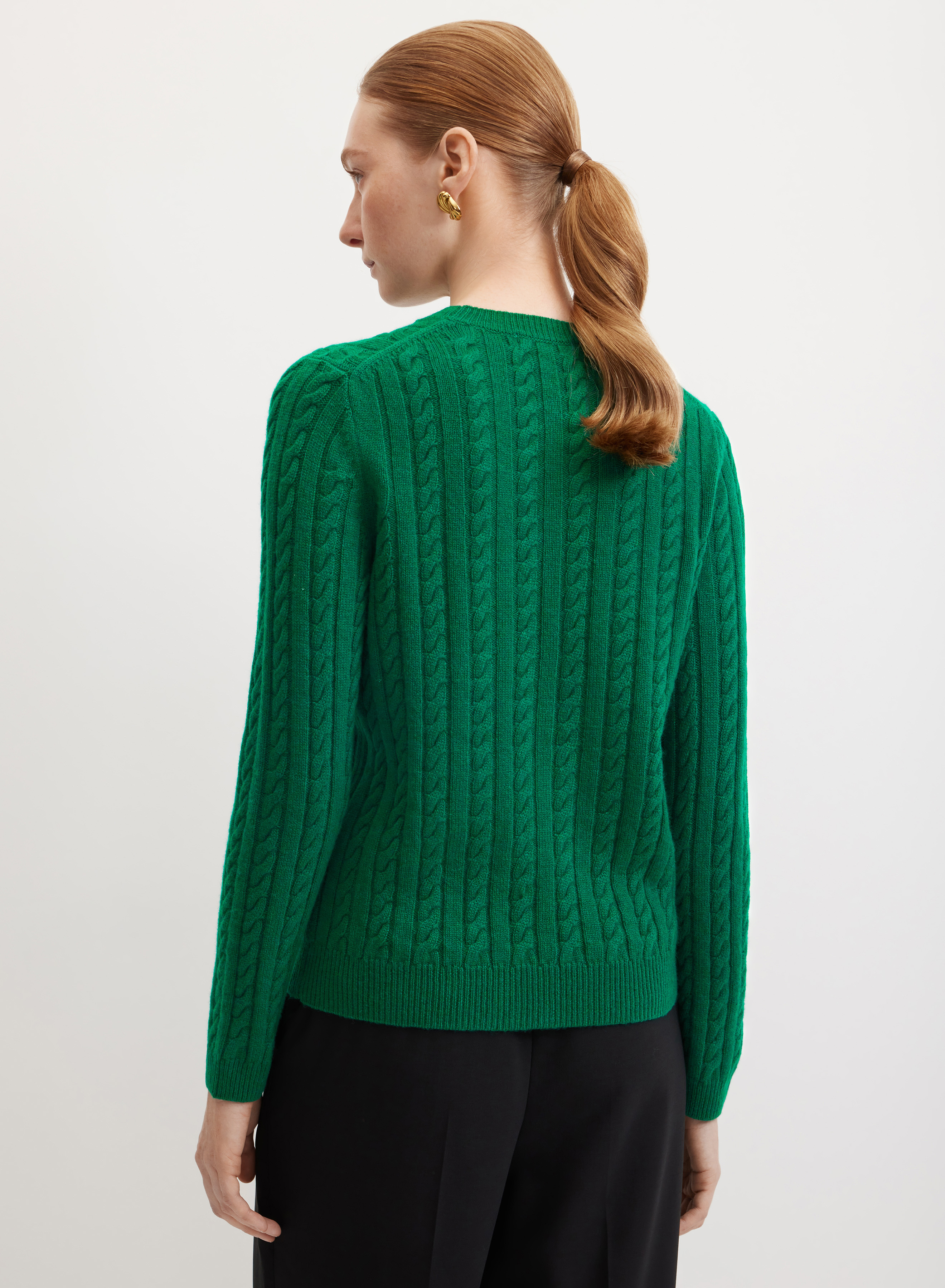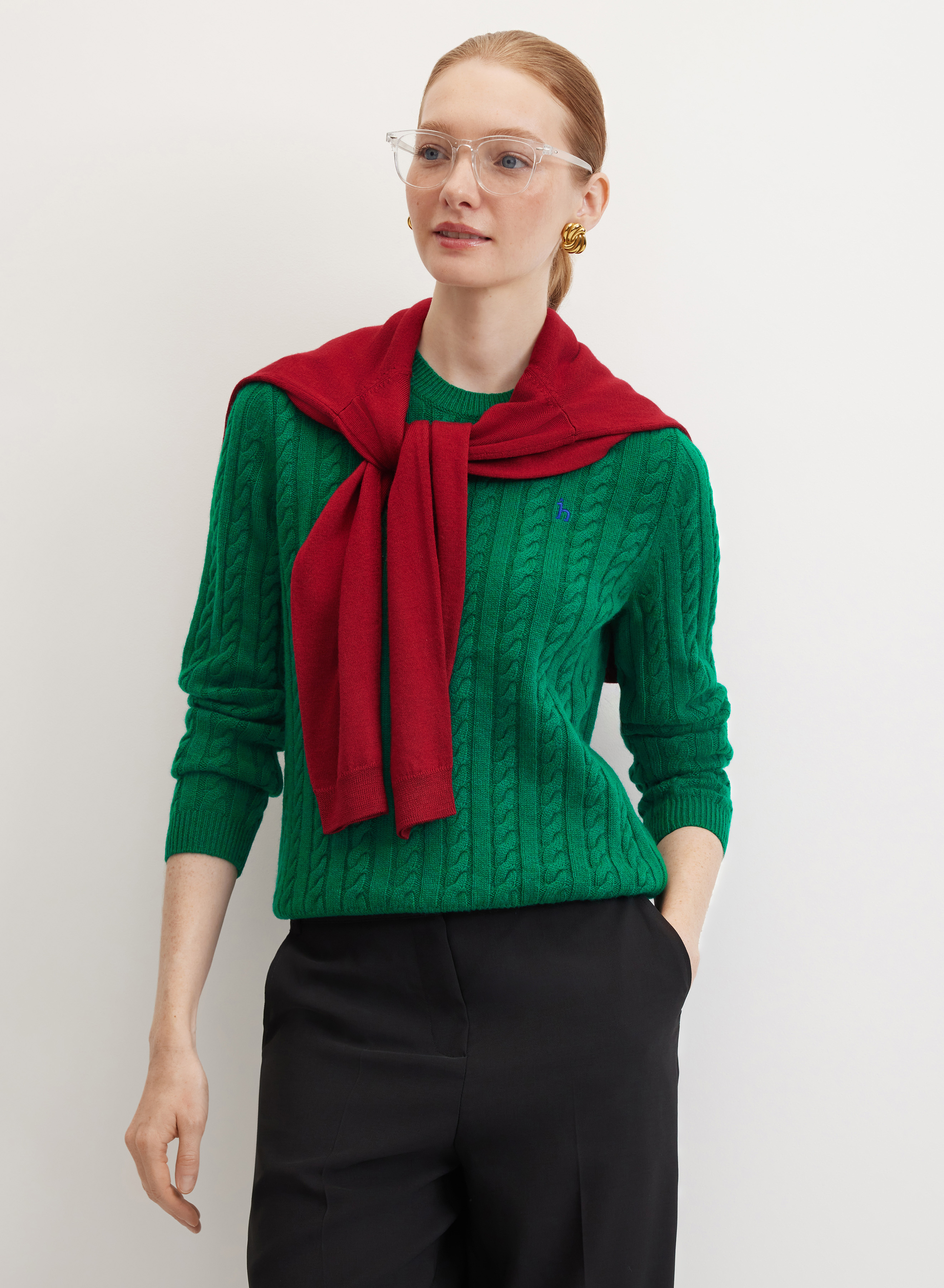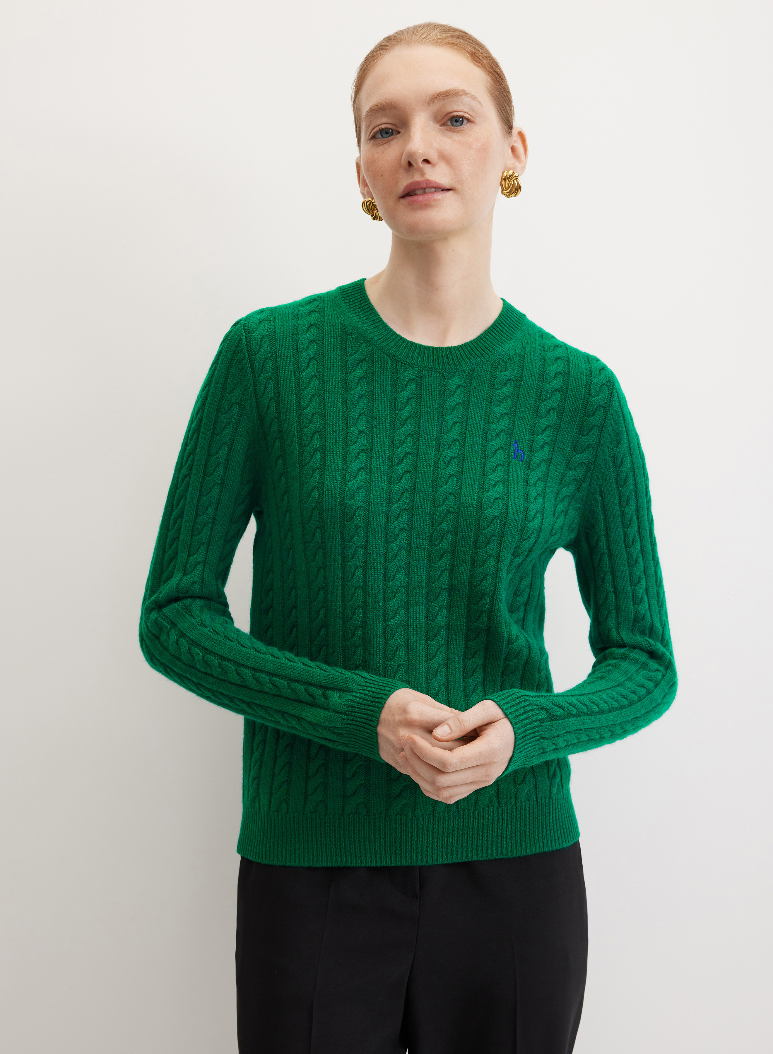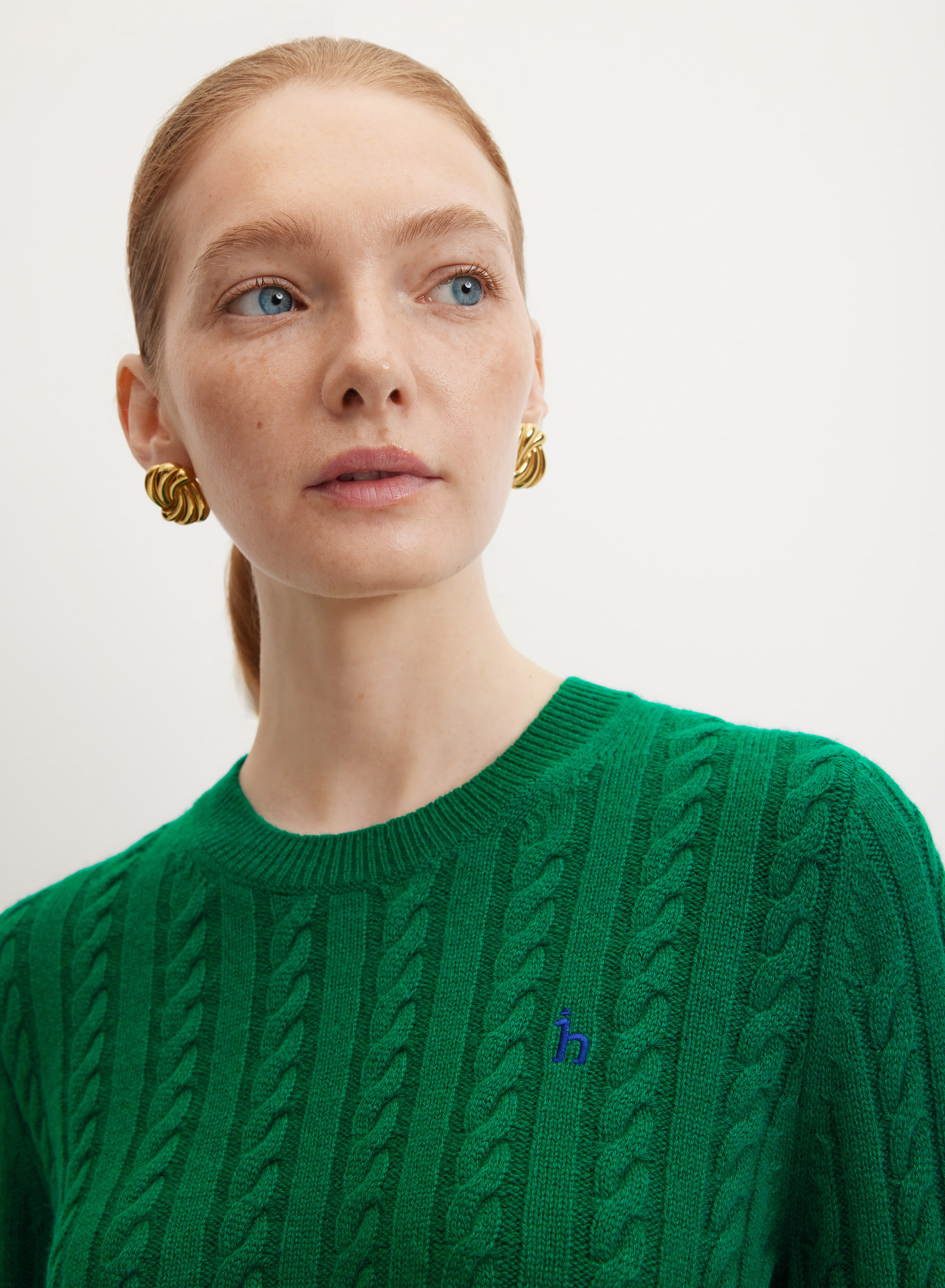 Элегантный джемпер приталенного силуэта с классическим узором. Модель с длиной до середины бедра и слегка спущенным плечом мягко подчеркивает силуэт, сохраняя комфорт и свободу движений. Плотная вязка из объемных кос создает выразительную текстуру, делая образ сложным и завершенным.