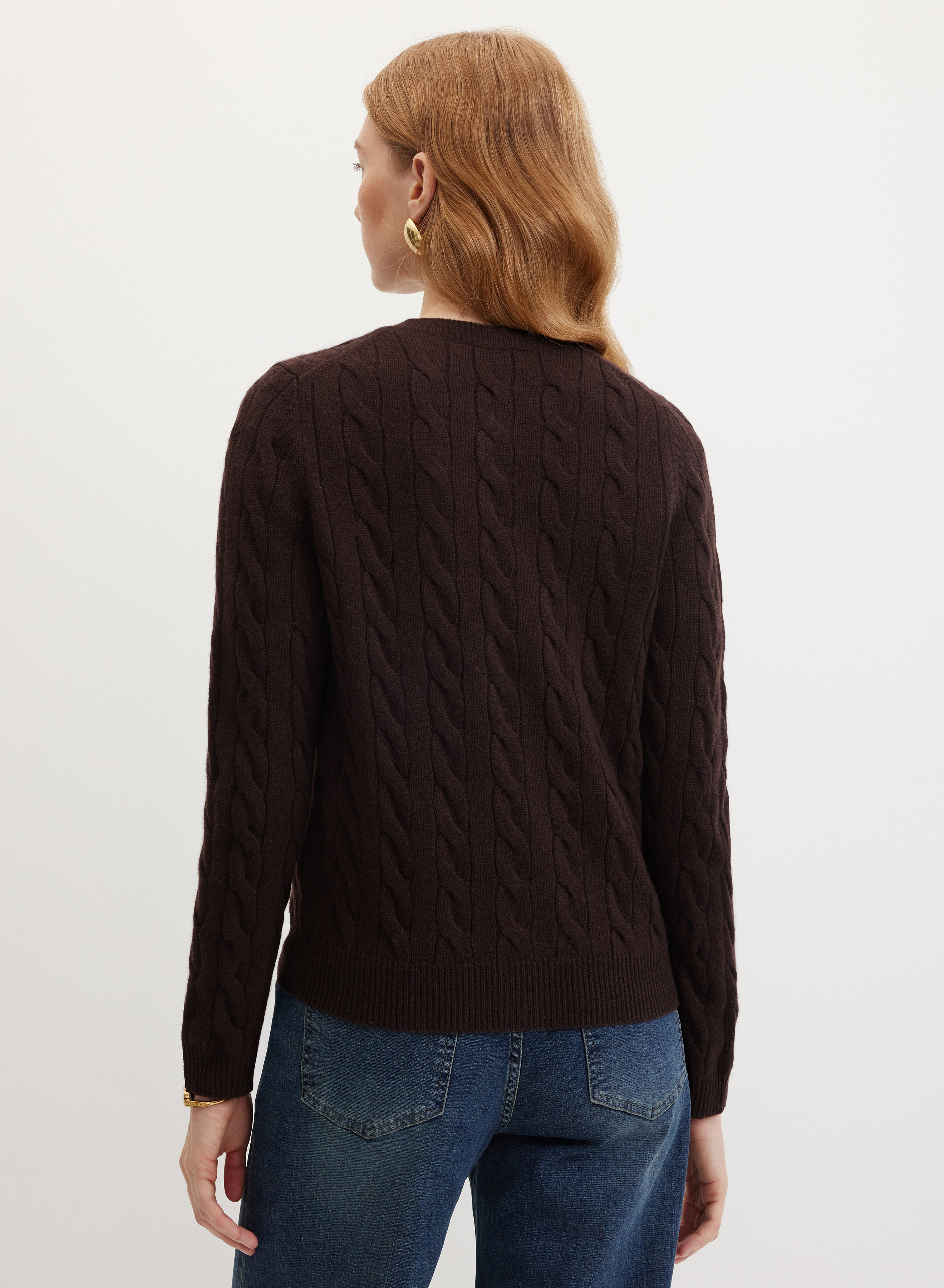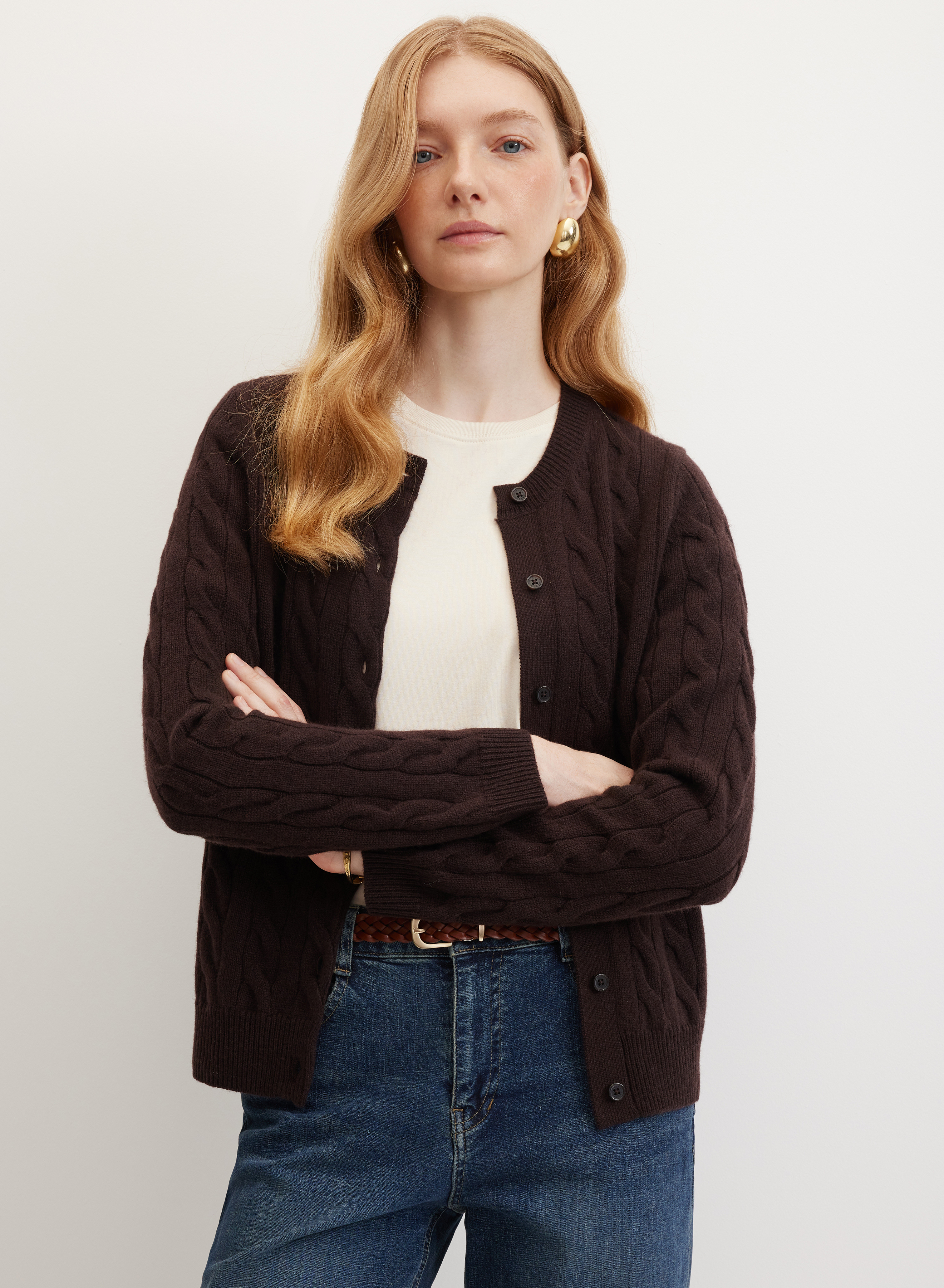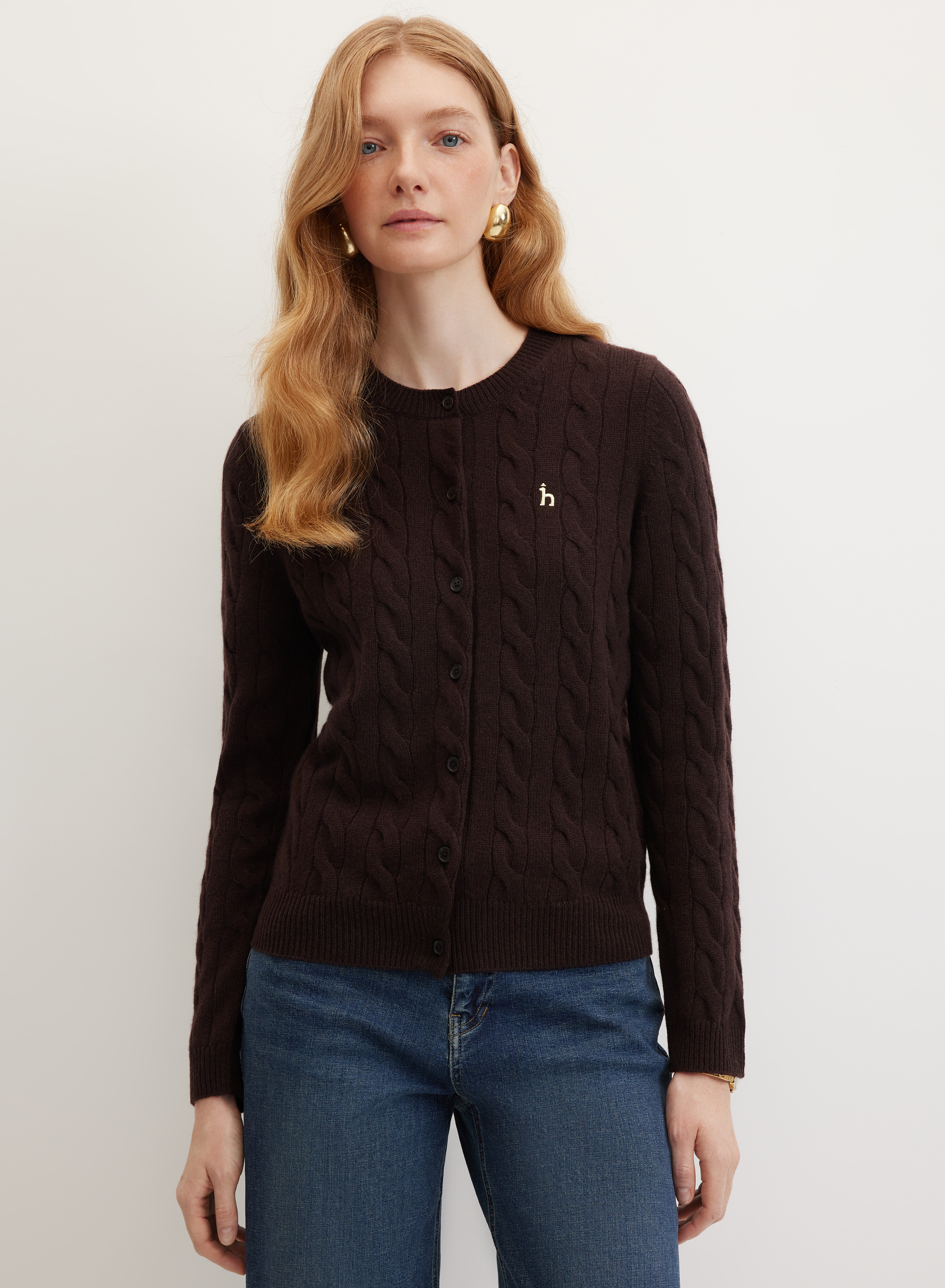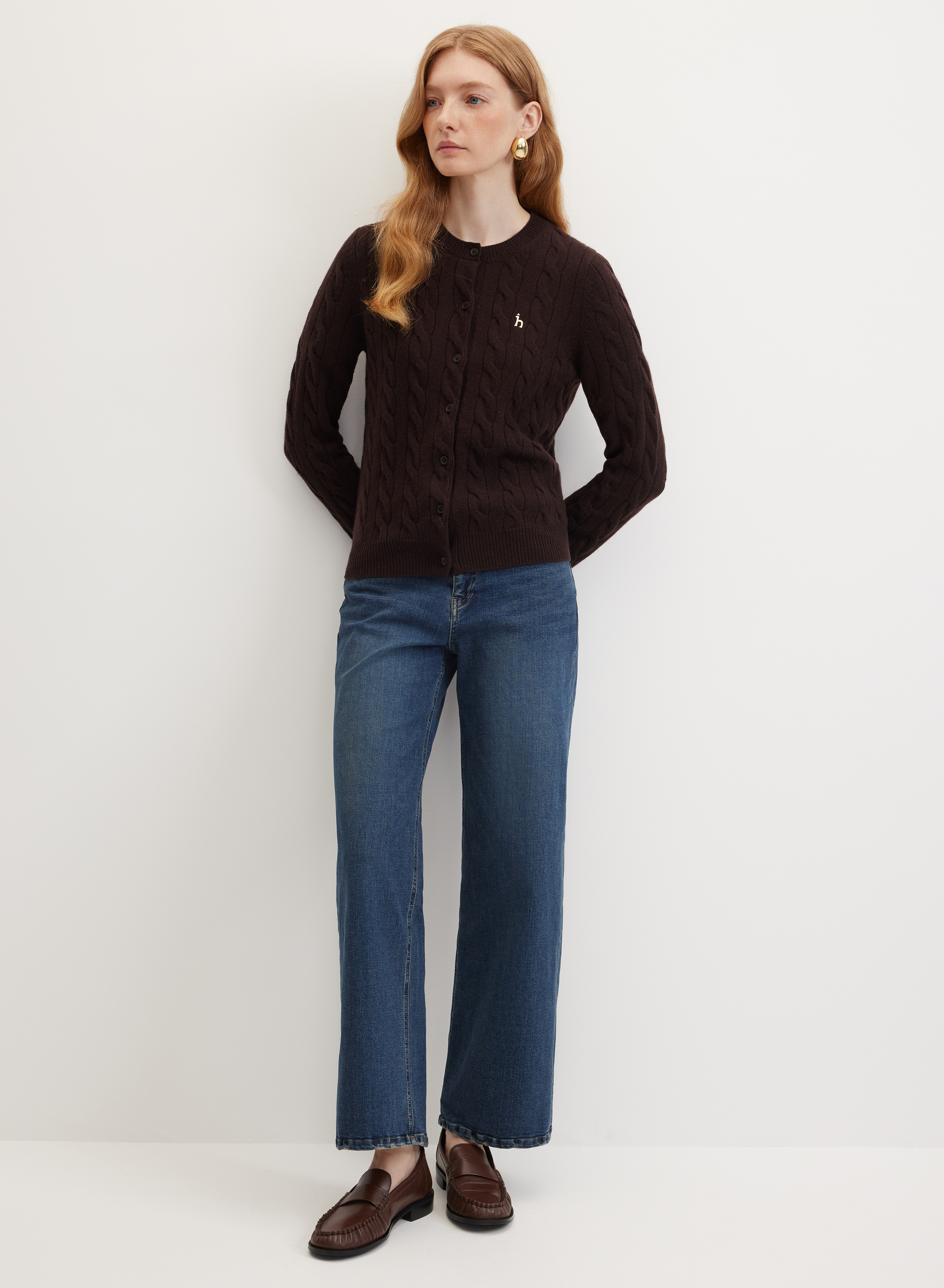 Кардиган гармонирует с классическими брюками, джинсами и юбками приталенного силуэта. Круглый вырез позволяет комбинировать модель с водолазками и блузами, дополнять образ шалью или платком. Универсальный дизайн подходит для создания комплектов в повседневном стиле.