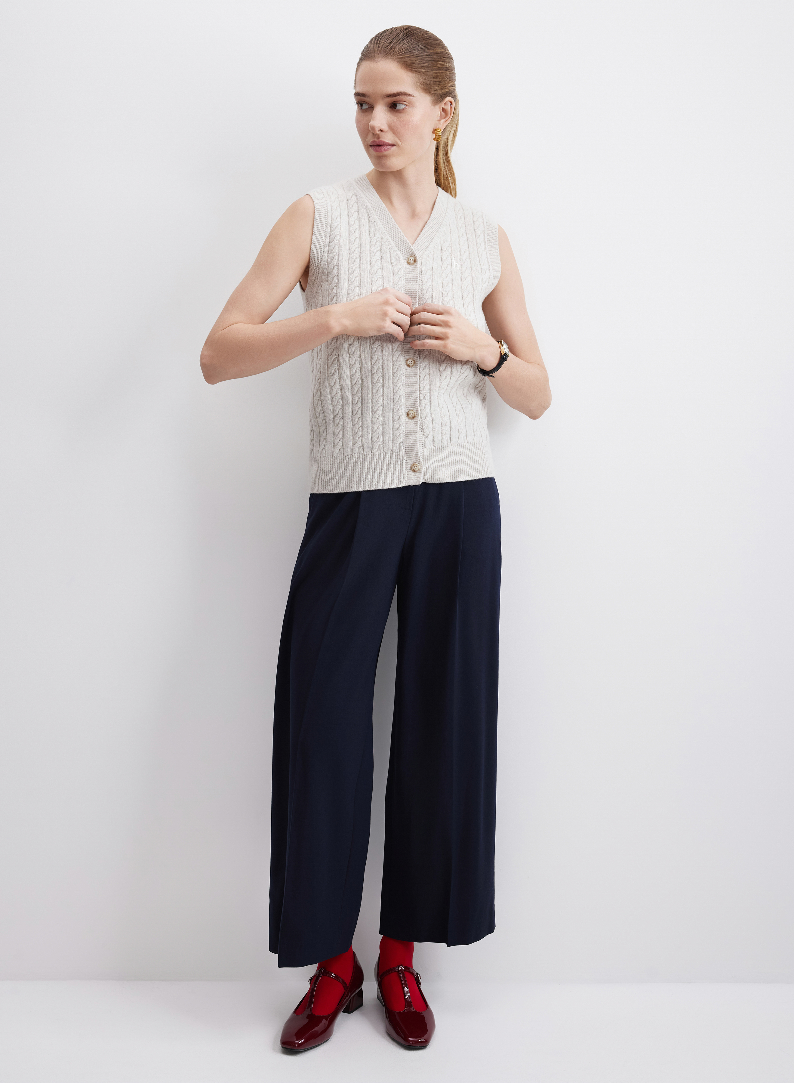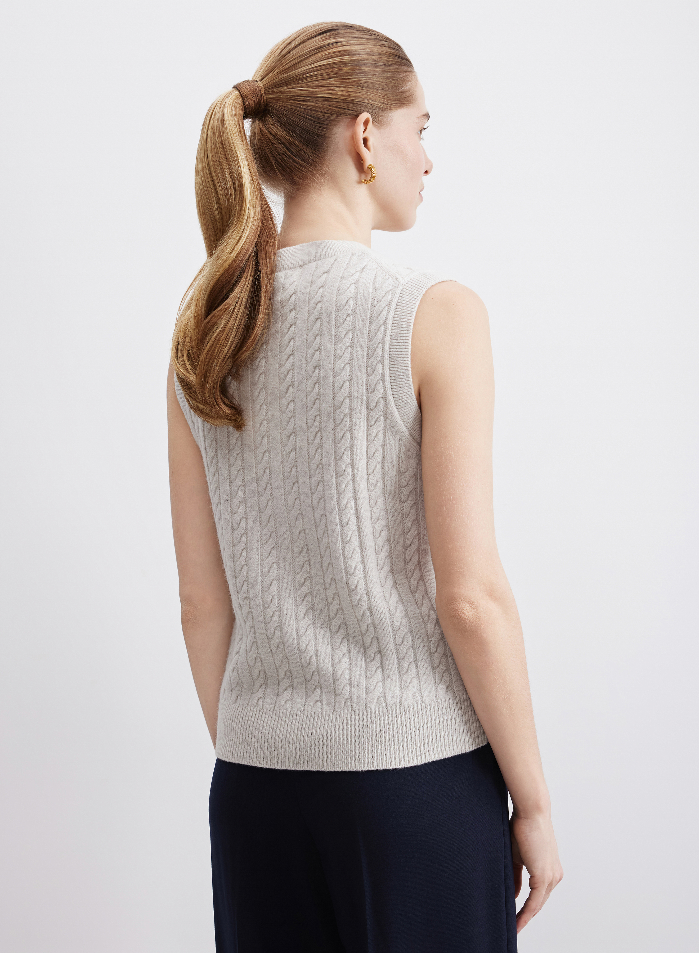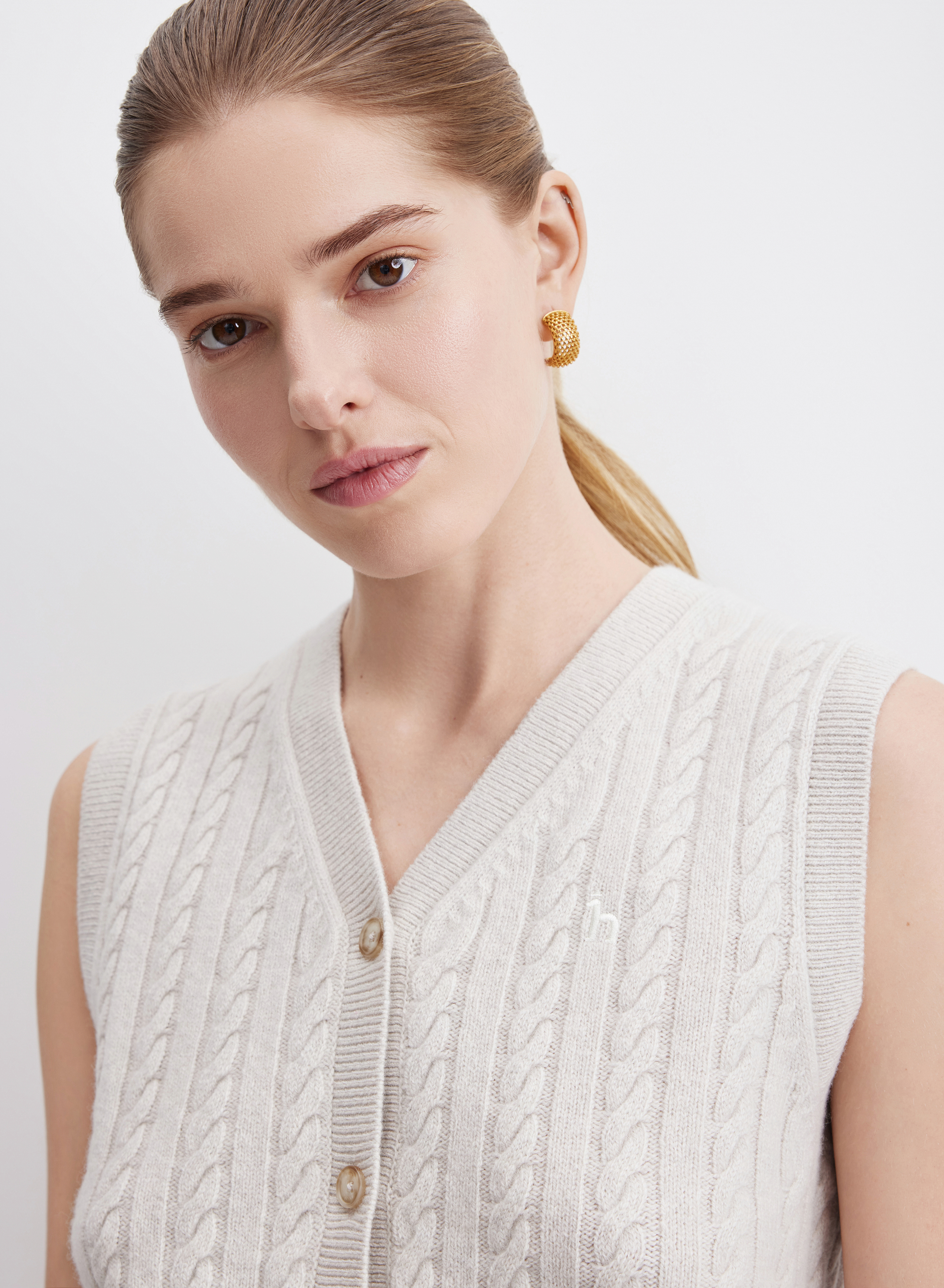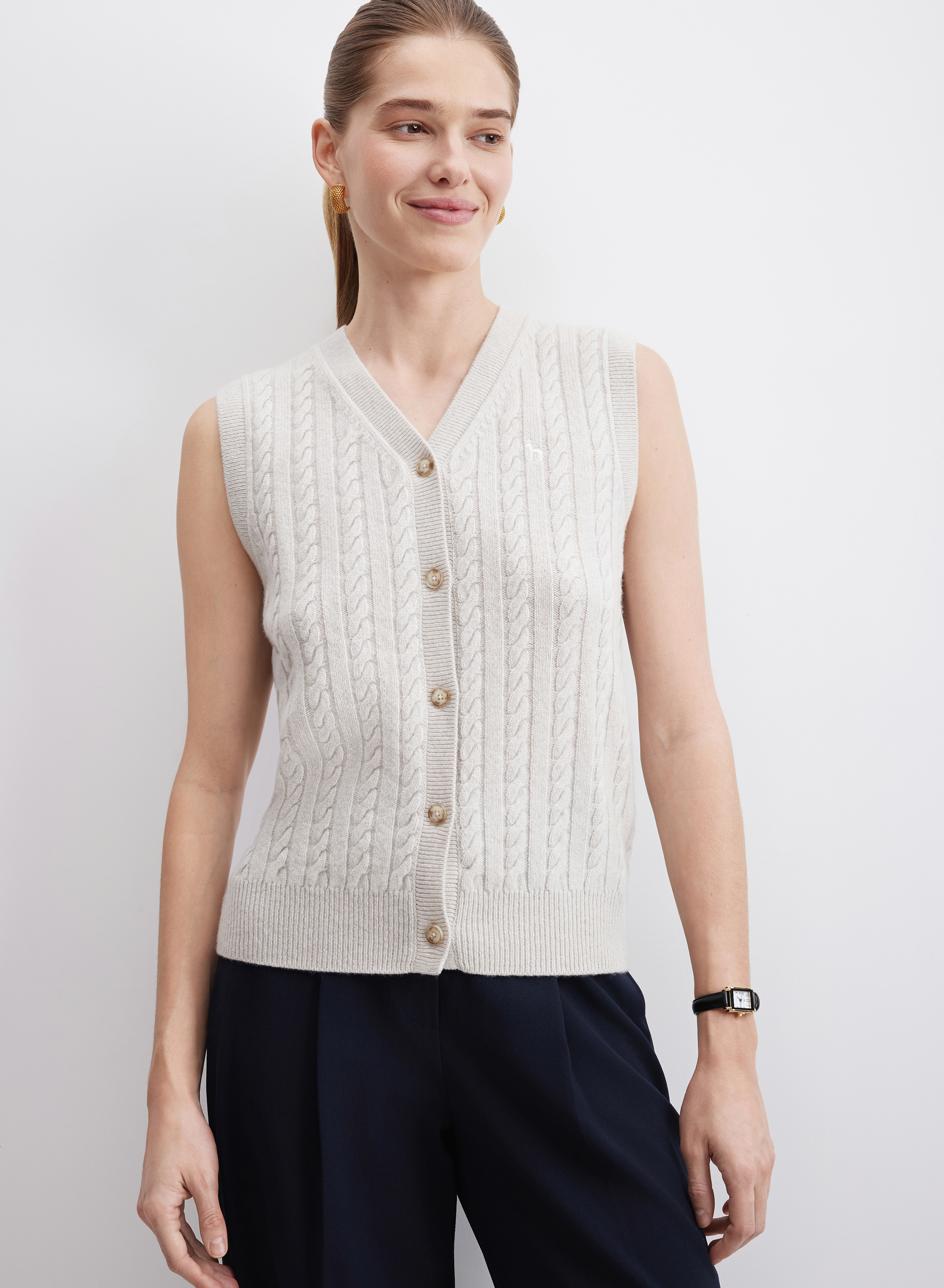 Элегантный бежевый жилет с рельефными вертикальными косами. Модель прямого кроя, снизу оформлена широкой трикотажной резинкой. Такой ж узкой резинкой декорирована пройма и V-образный вырез, переходящий в планку. Застегивается на пуговицы на открытой планке.