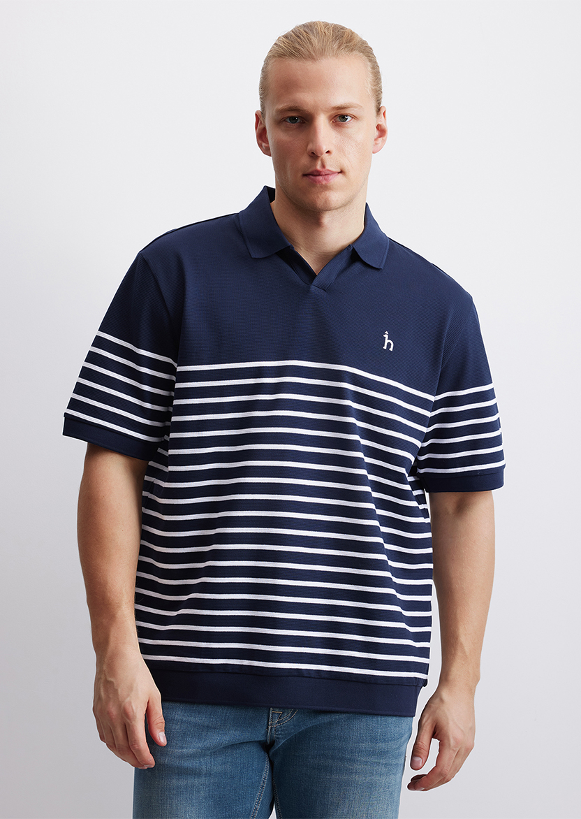 Синее поло в белую полоску с логотипом бренда