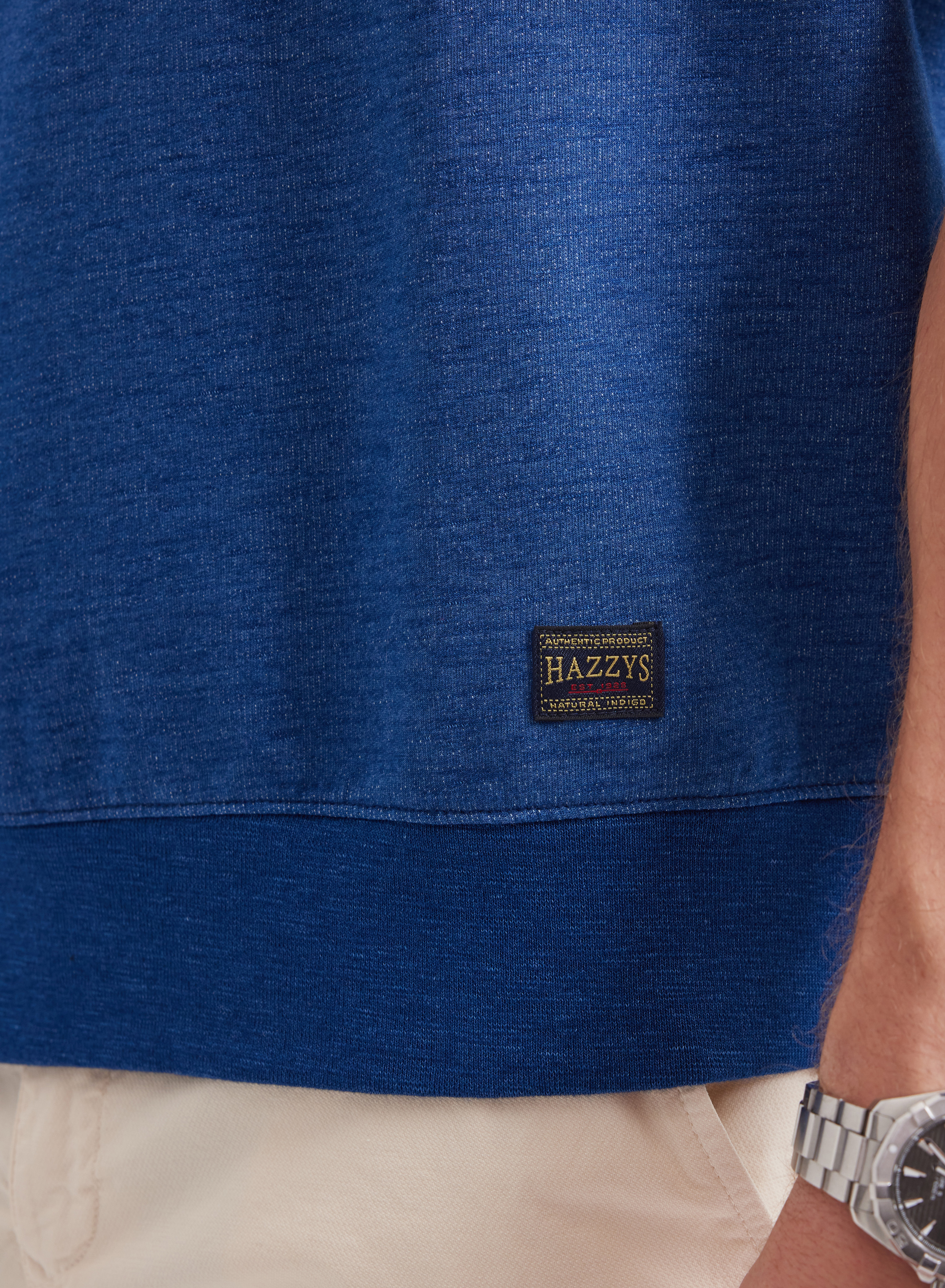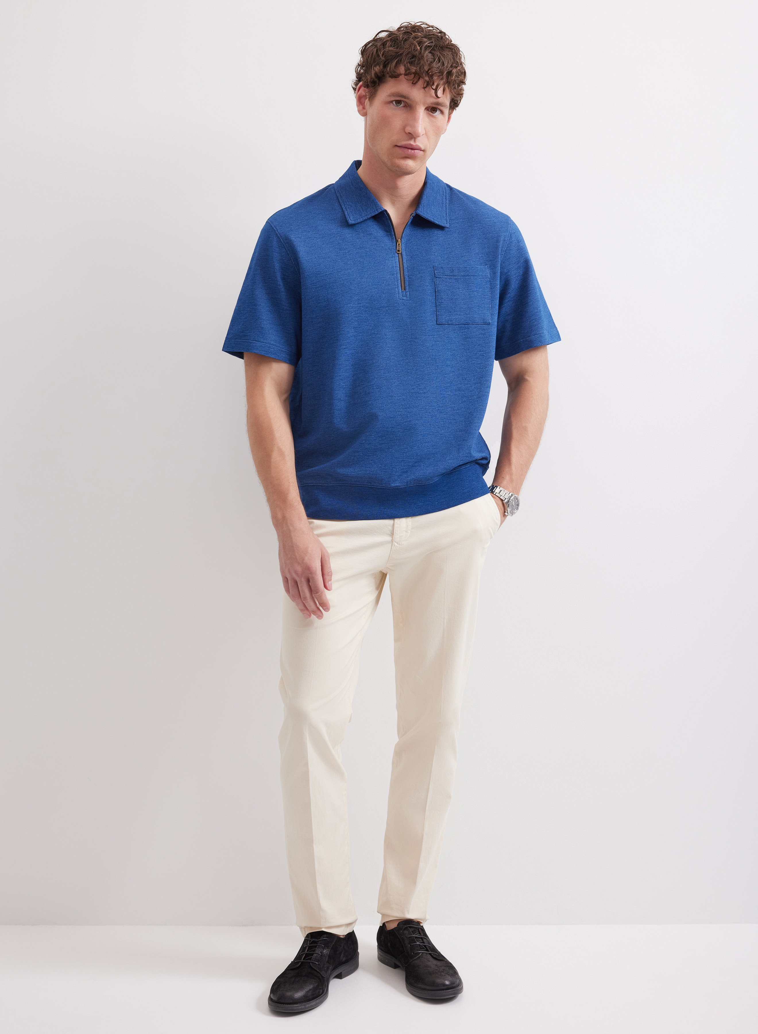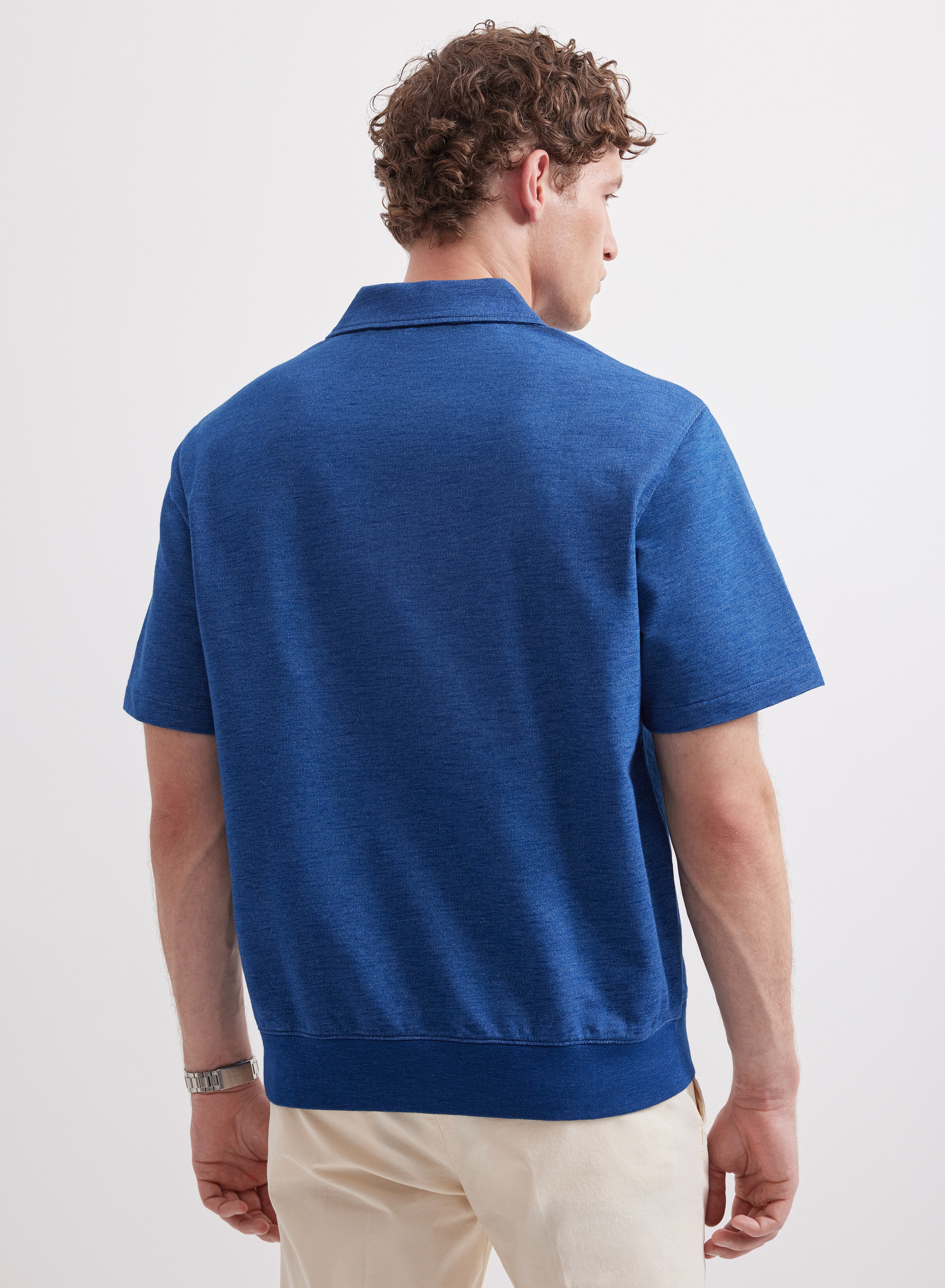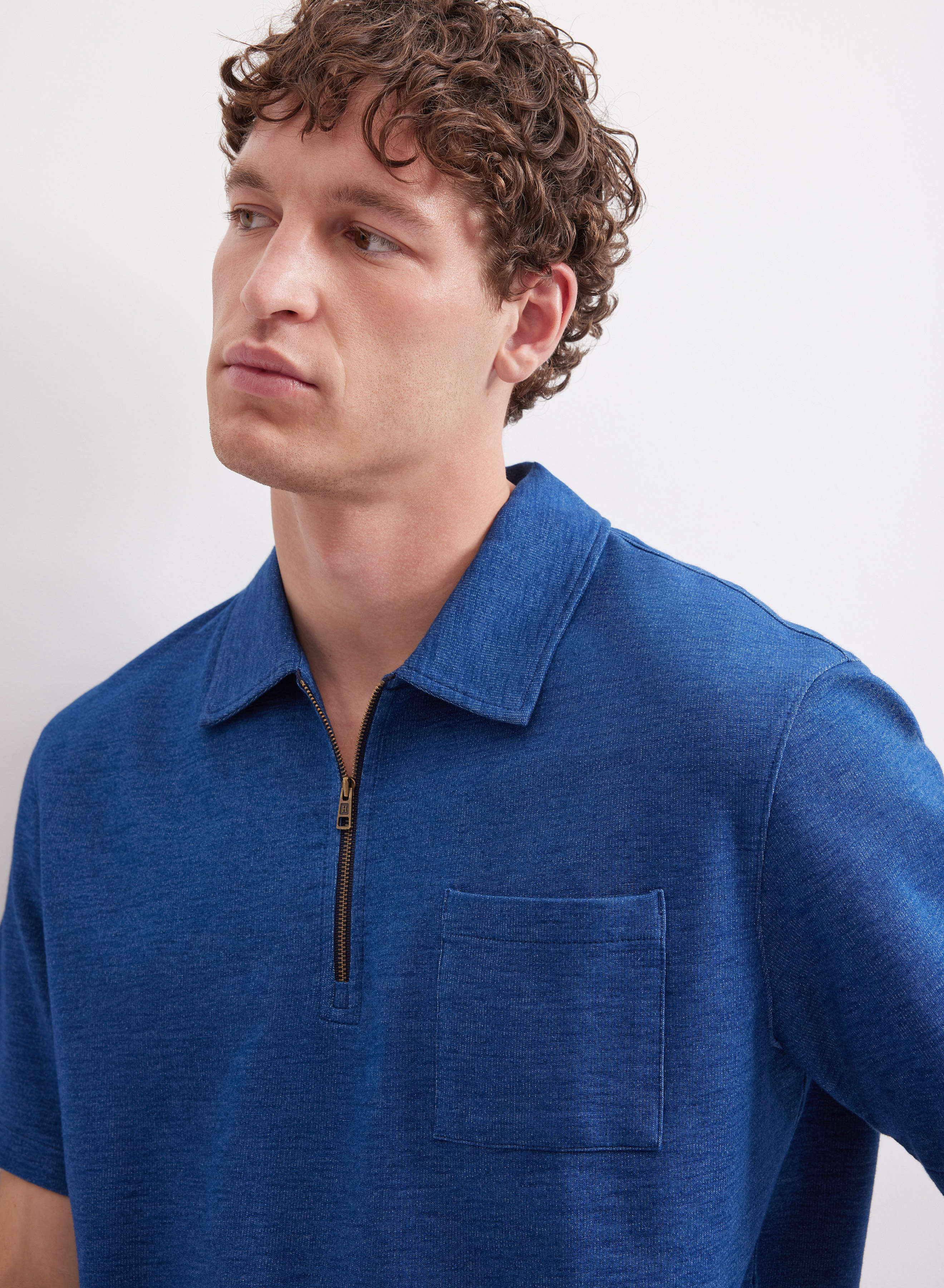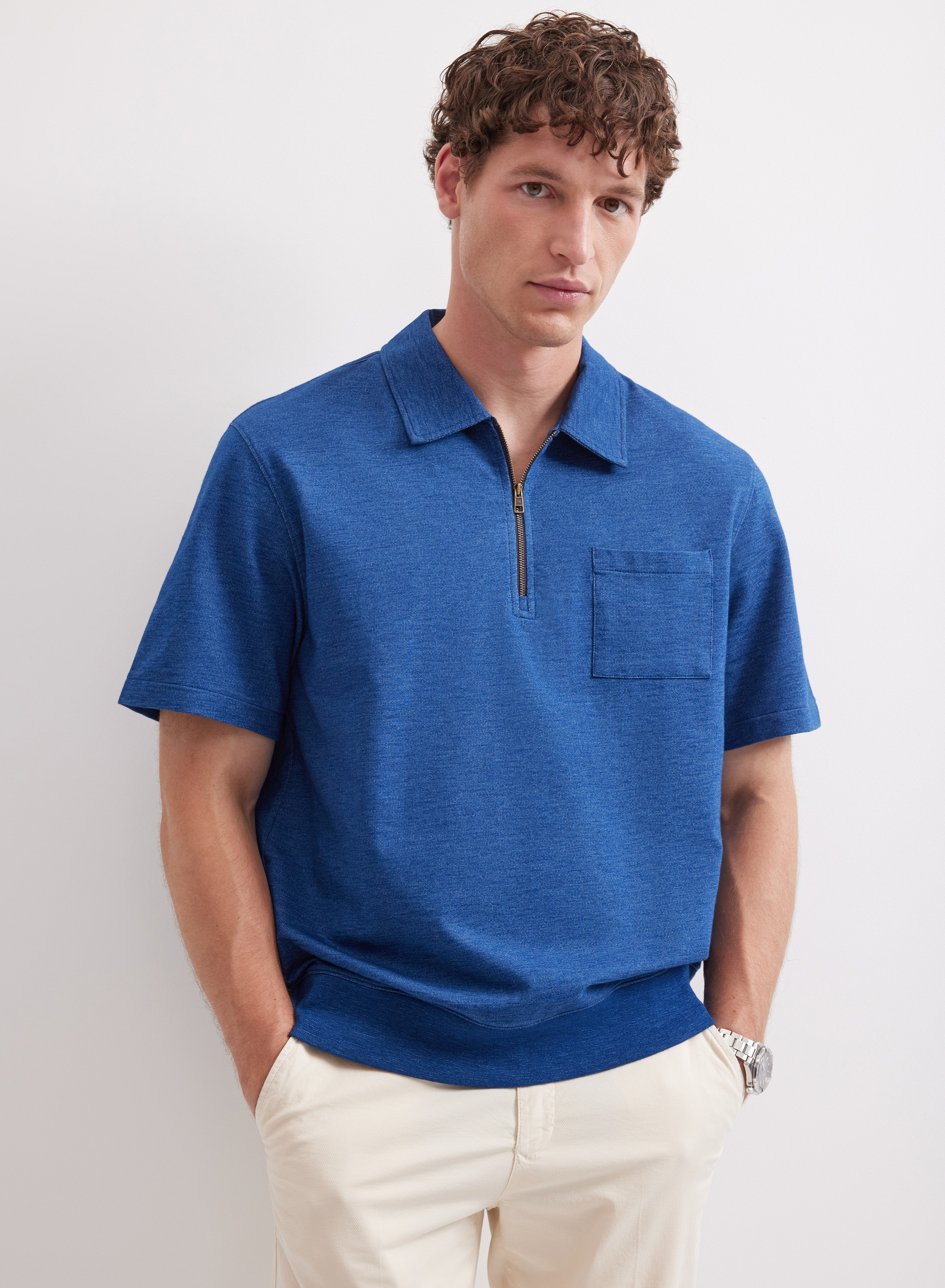 Поло насыщенного синего цвета предлагает современную интерпретацию классического силуэта за счет молнии спереди вместо традиционных пуговиц. Модель с прямыми отрезными рукавами без манжет и отложным воротником, укрепленным контурной строчкой, сочетает лаконичность и удобство. Низ оформлен трикотажной резинкой для комфортной посадки, а функциональный нагрудный карман добавляет практичности образу.