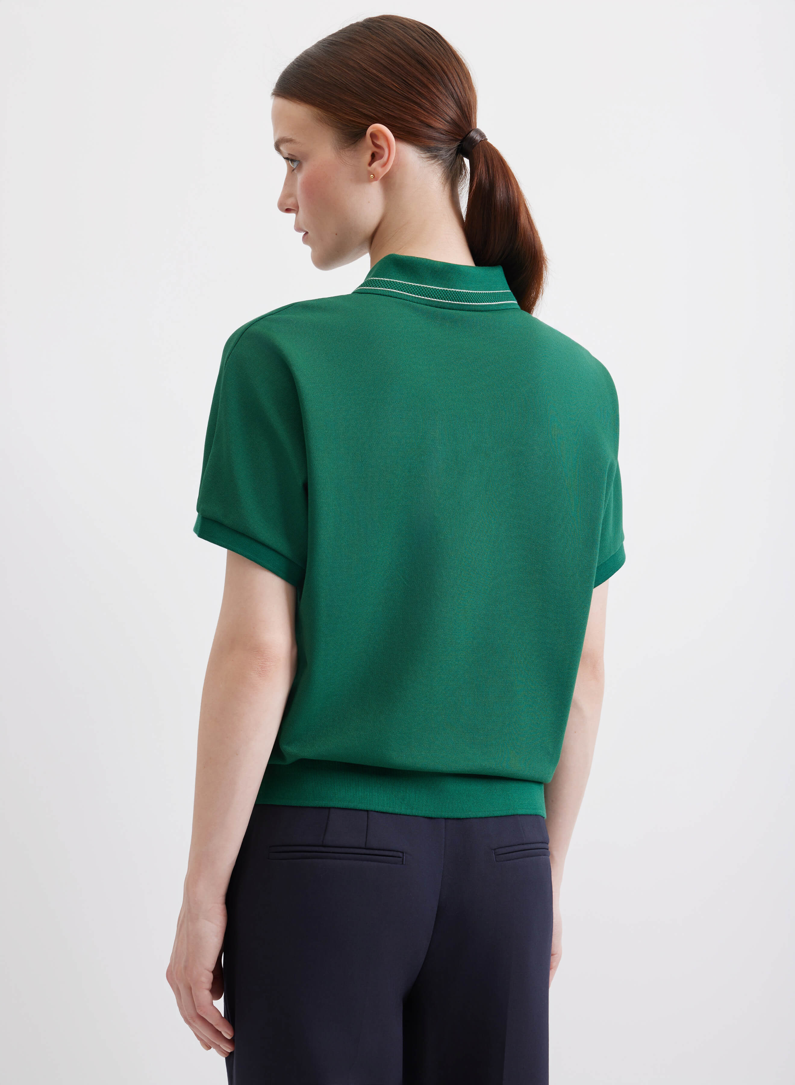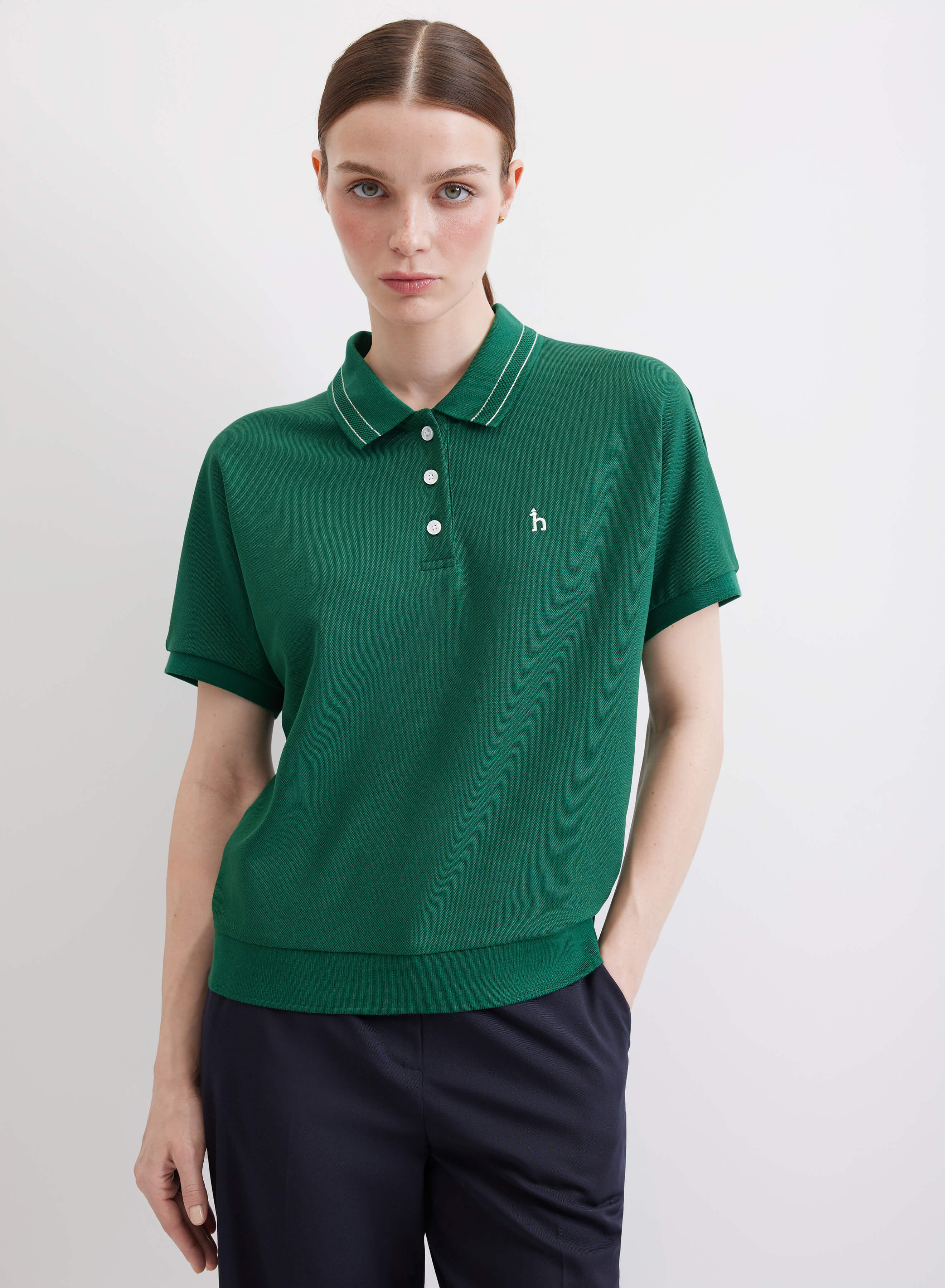 Зеленое поло прямого кроя. Низ модели оформлен планкой из основной ткани. Короткие отрезные рукава заканчиваются манжетами из трикотажной резинки. Отложной воротник из такой же резинки, декорирован двумя тонкими белыми полосками. Модель застегивается на три контрастные пуговицы, расположенные на открытой планке по центру. На груди находится аккуратная вышивка в виде логотипа бренда.