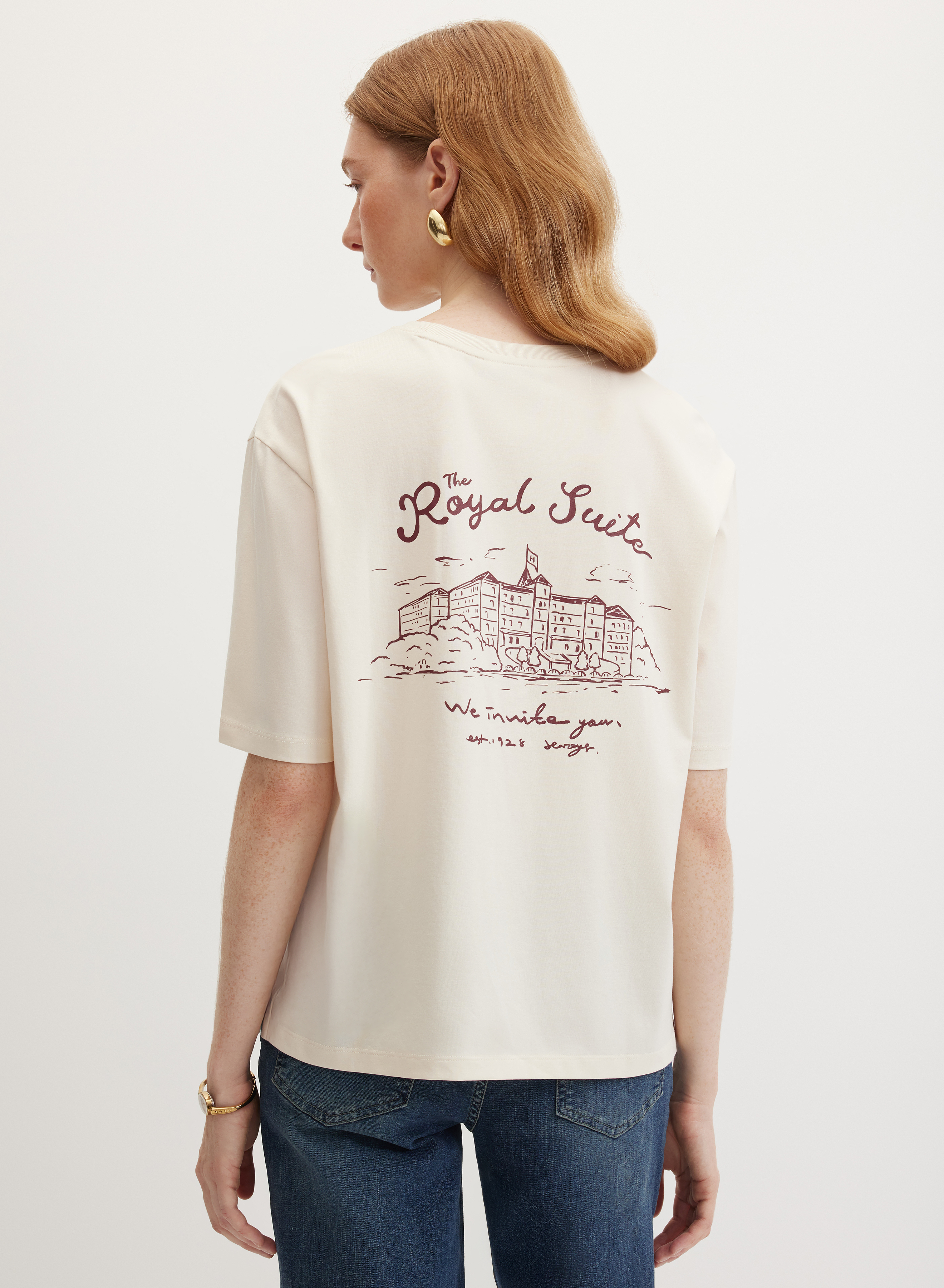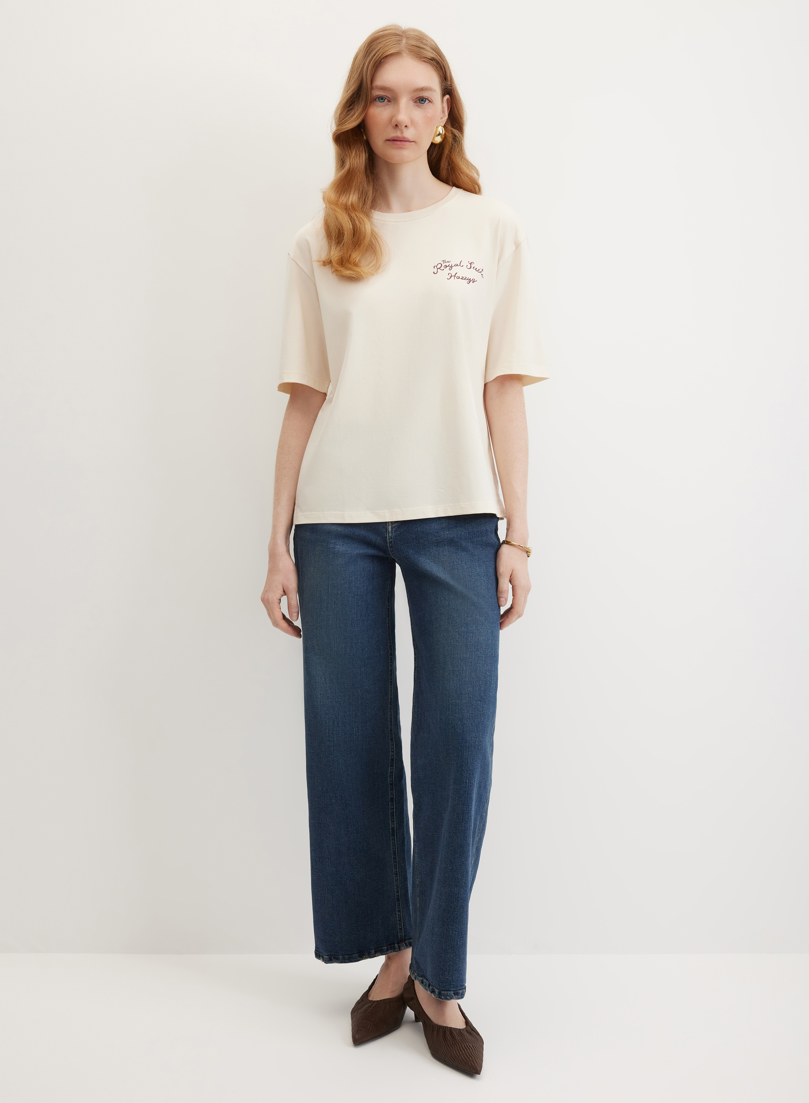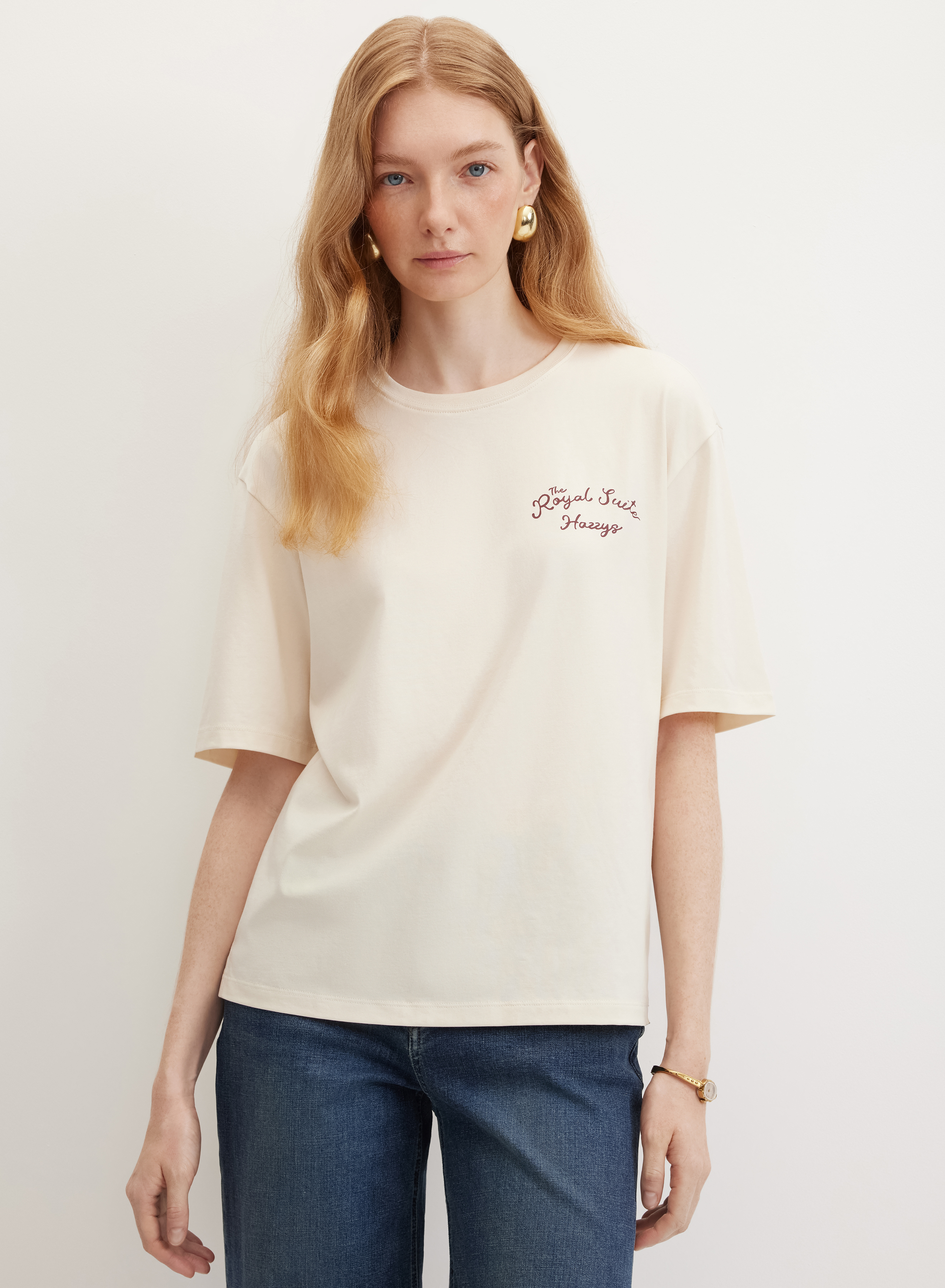 Футболка с прямым краем низа — идеальная основа для современного гардероба. Модель свободного кроя с удлиненной линией рукава до локтя и классическим круглым вырезом создает сбалансированный силуэт. Дизайнерский акцент выполнен в виде контрастного графичного принта в левой нагрудной области, что добавляет образу индивидуальности.