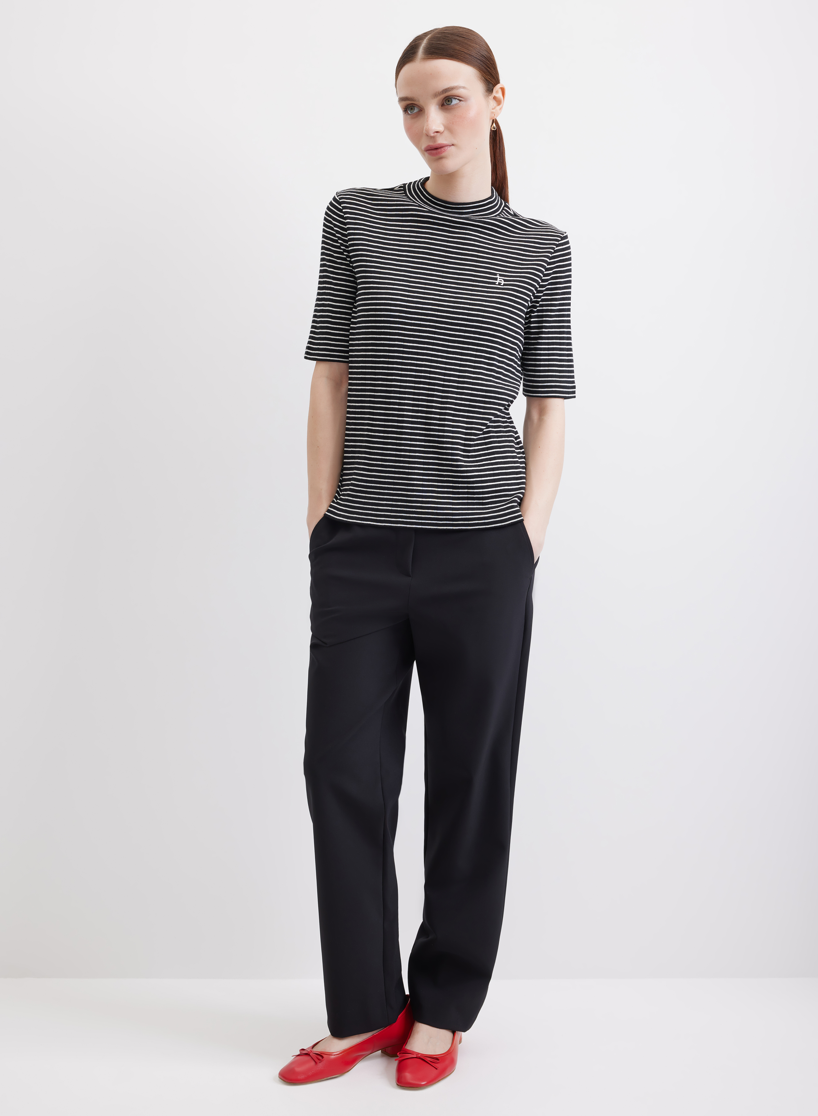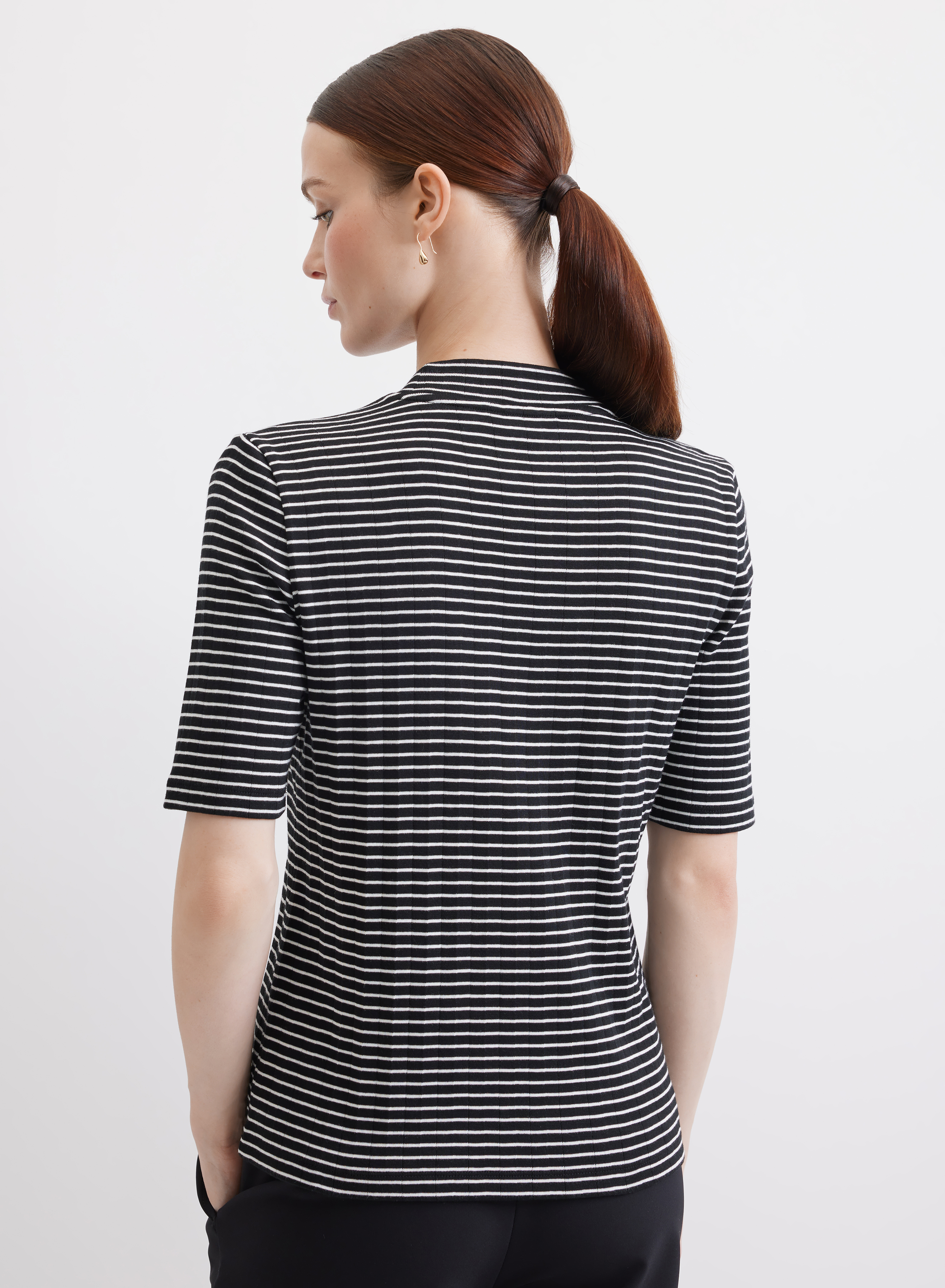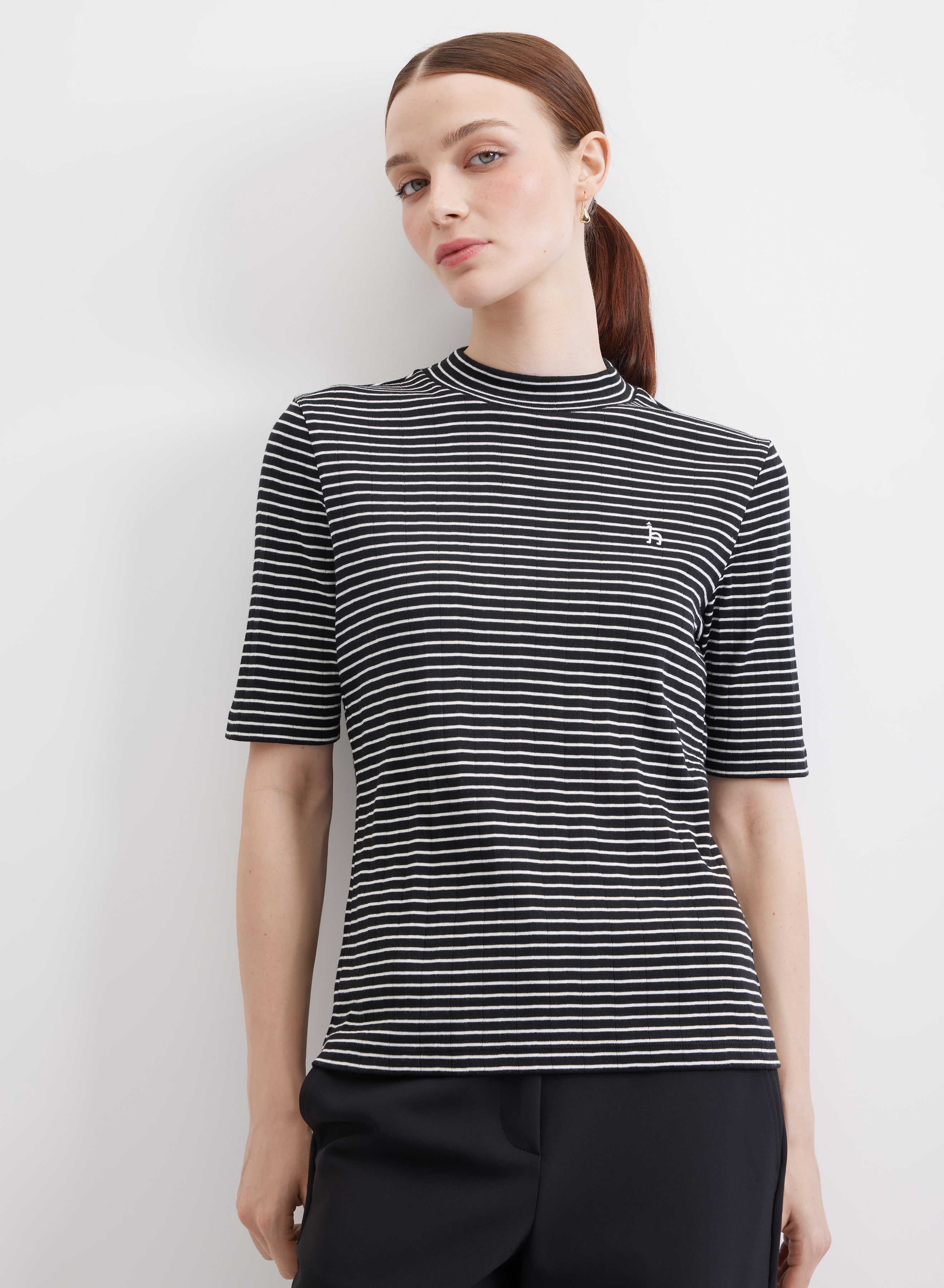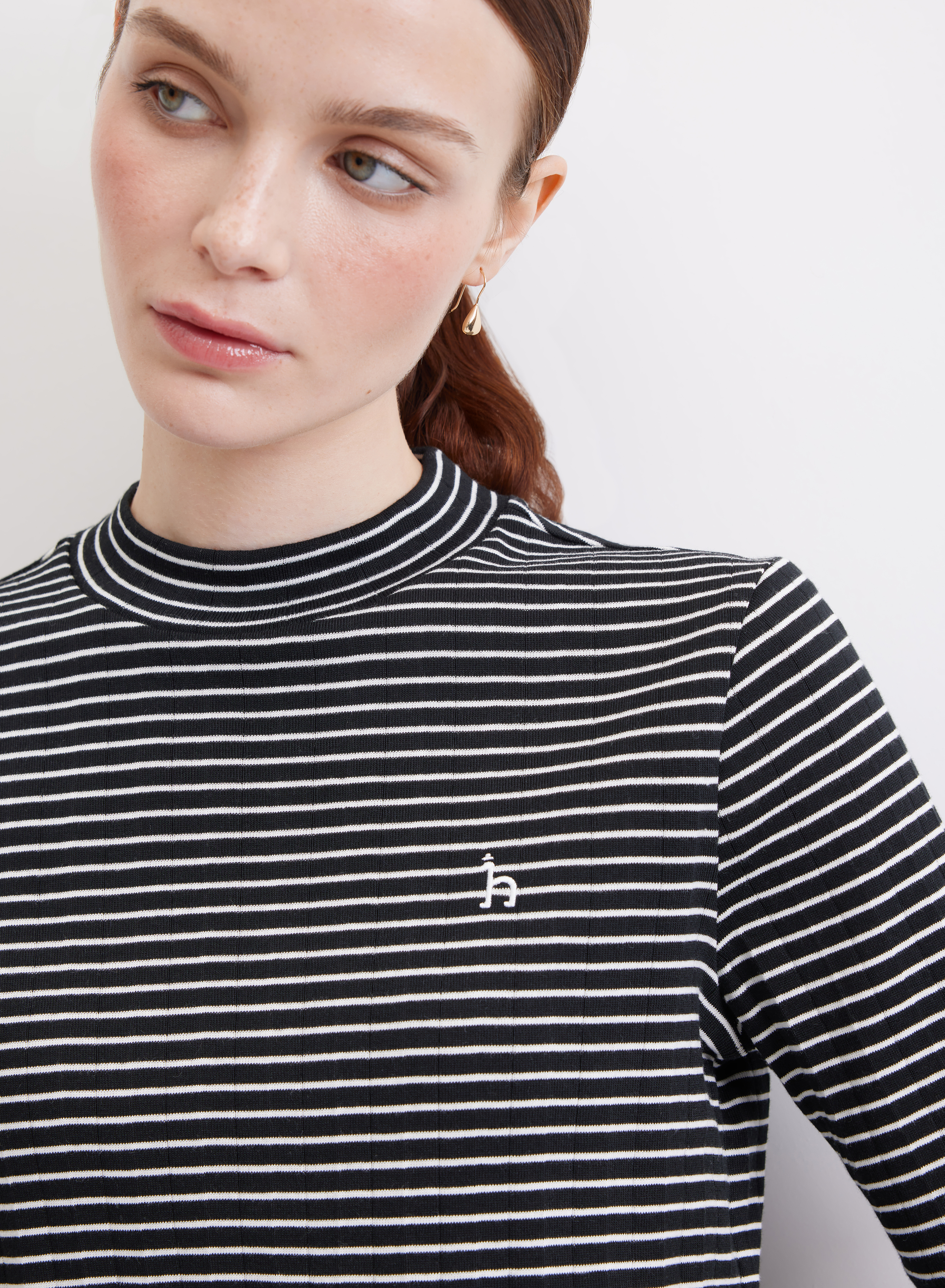 Футболка прямого кроя с лаконичным силуэтом и воротником-стойкой. Удлиненный рукав до локтя и горизонтальный полосатый узор делают образ интересным. Миниатюрная вышивка на груди служит стильным акцентом.