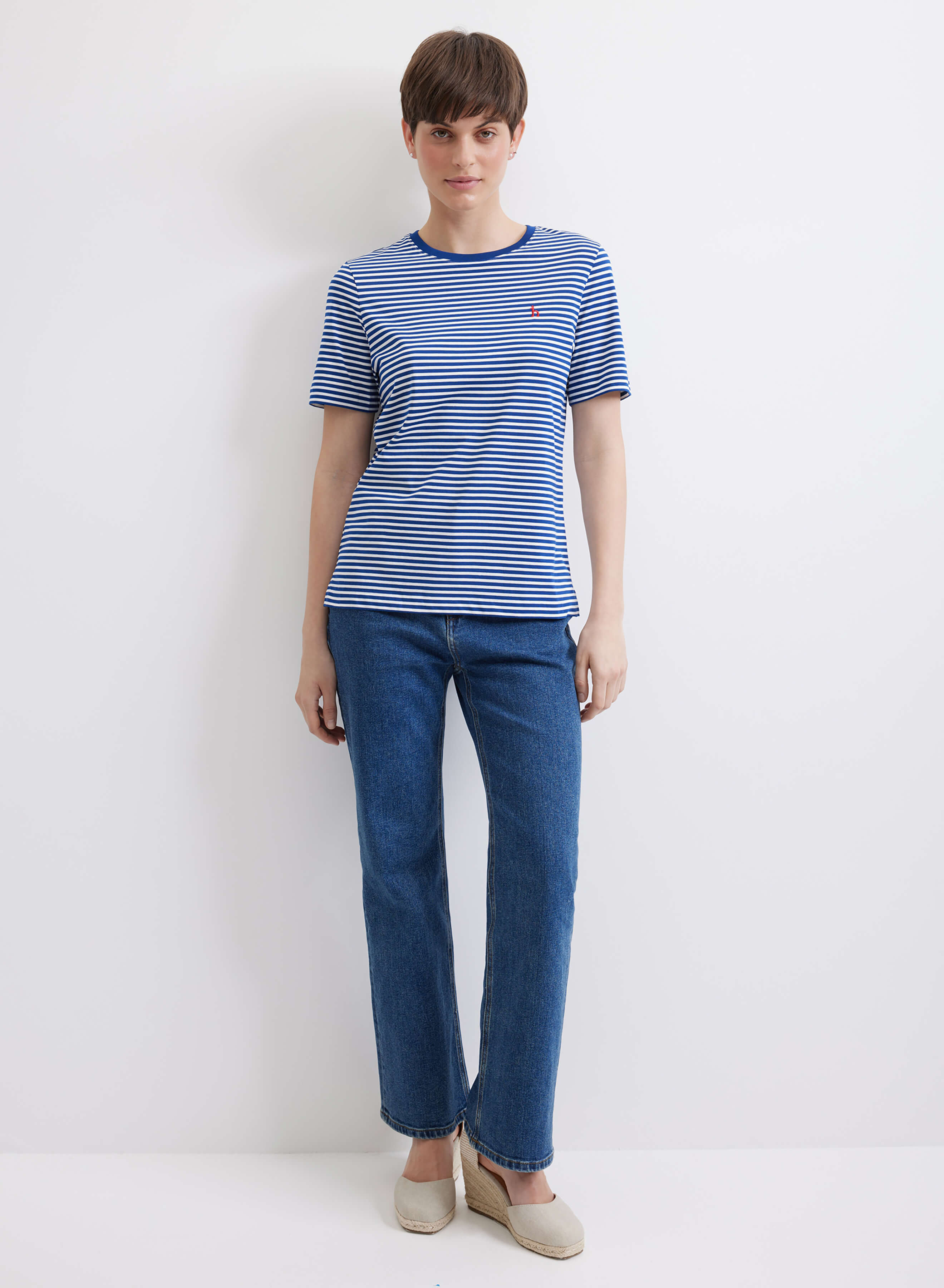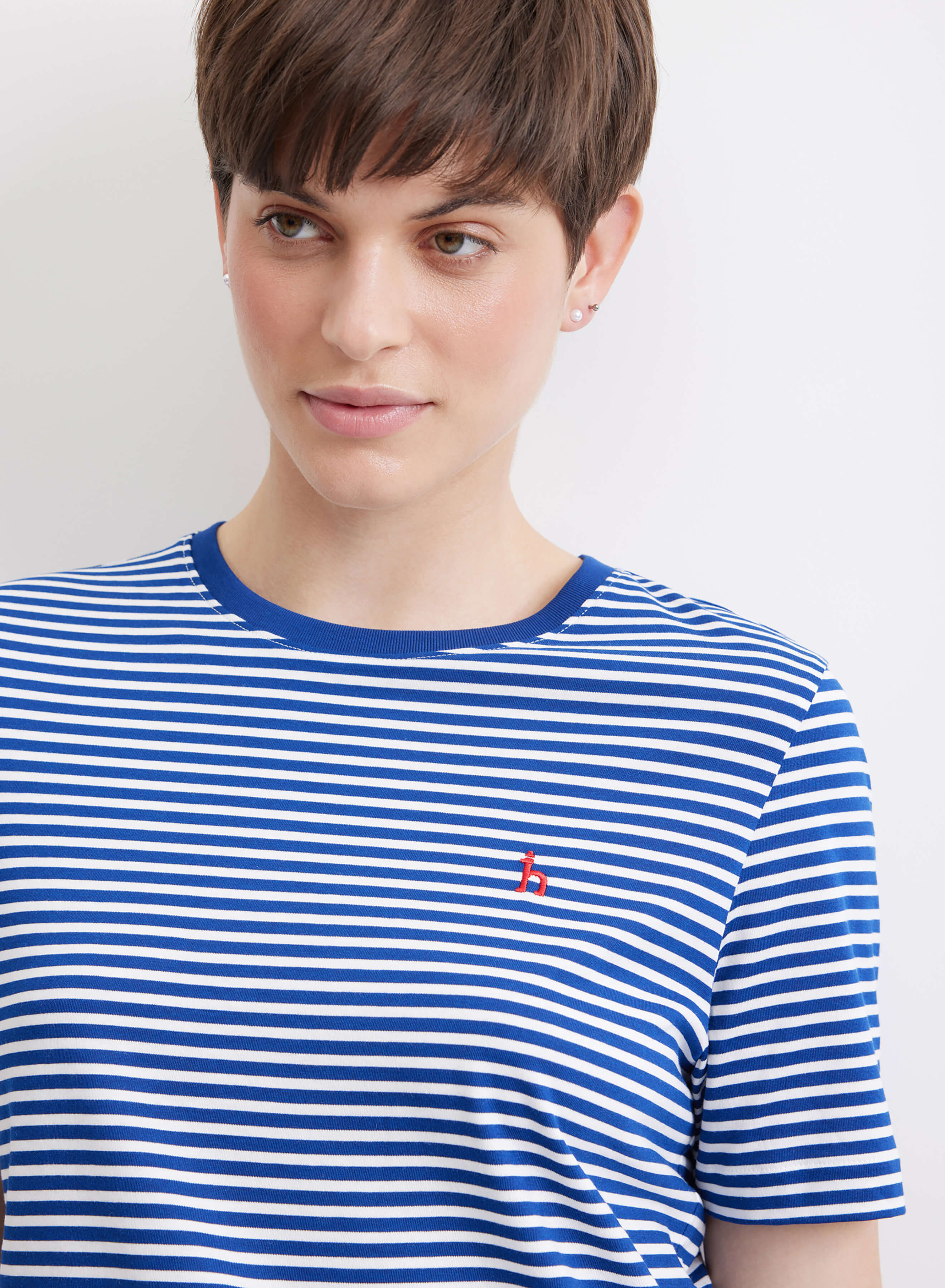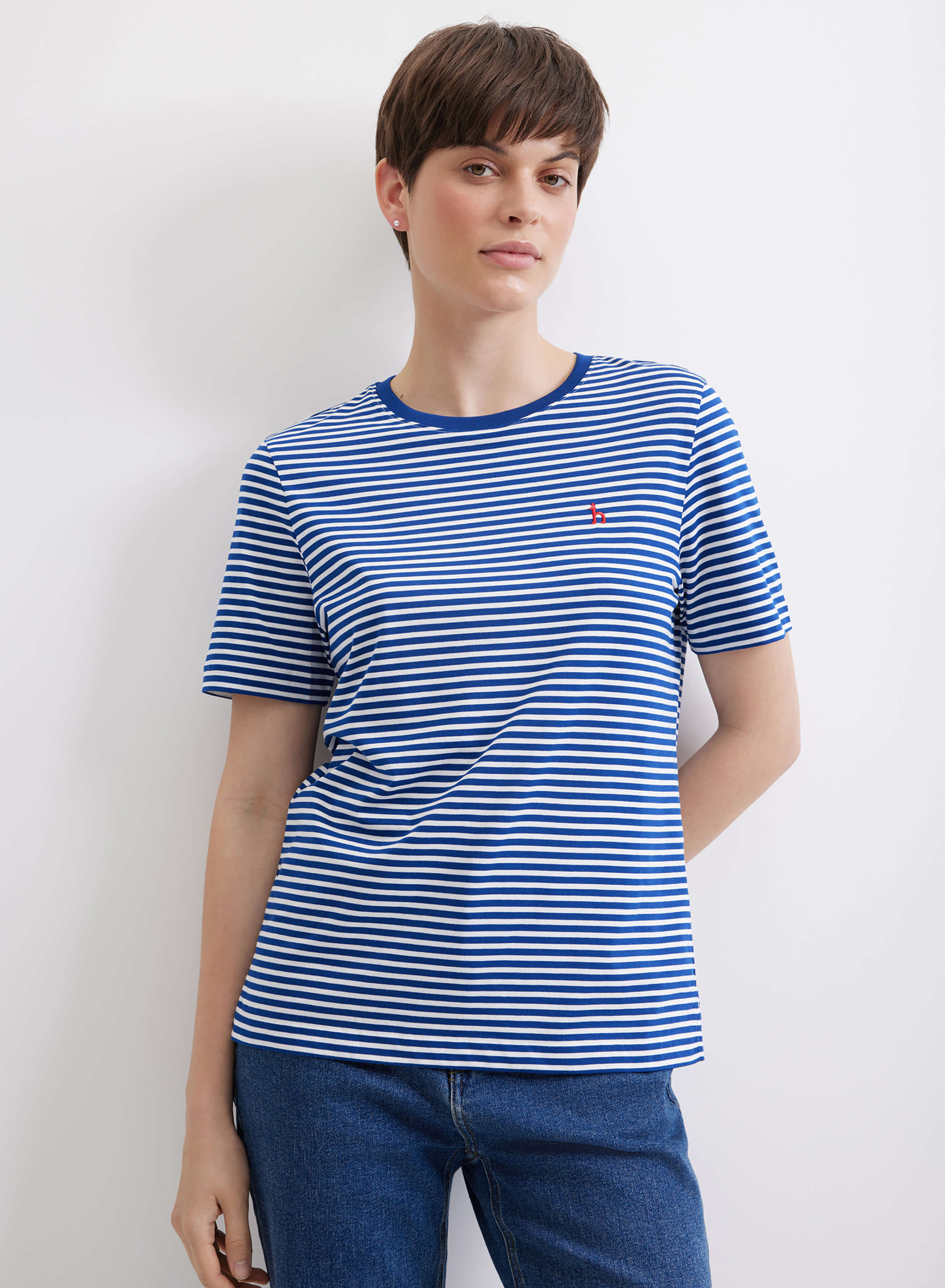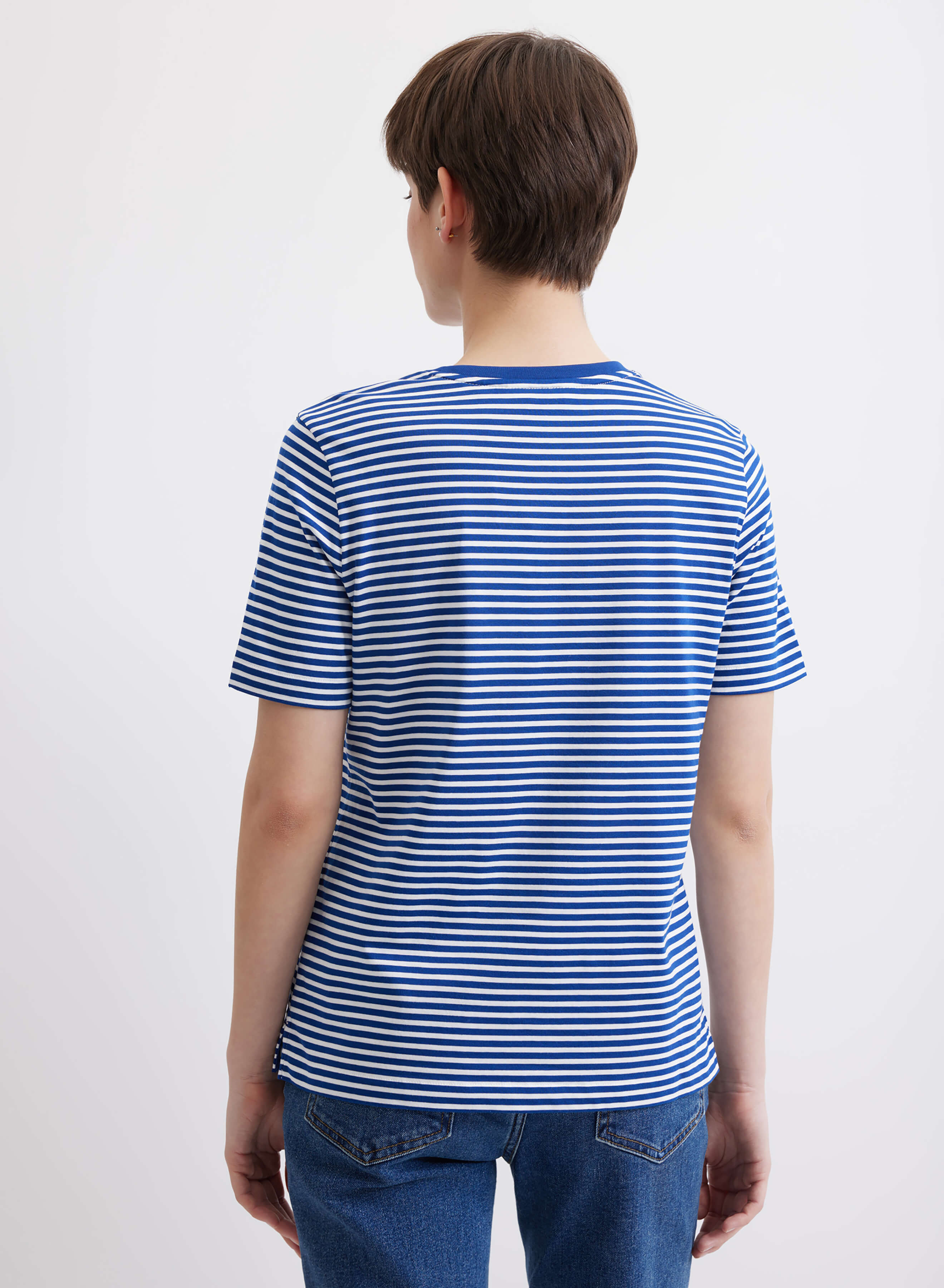 Синяя футболка в полоску с контрастной округлой горловиной средней длины с короткими рукавами и круглым вырезом. Принт в полоску сочетается с горловиной яркого оттенка, создавая эффектный визуальный акцент. Слева на груди расположен маленький логотип в фирменном стиле.