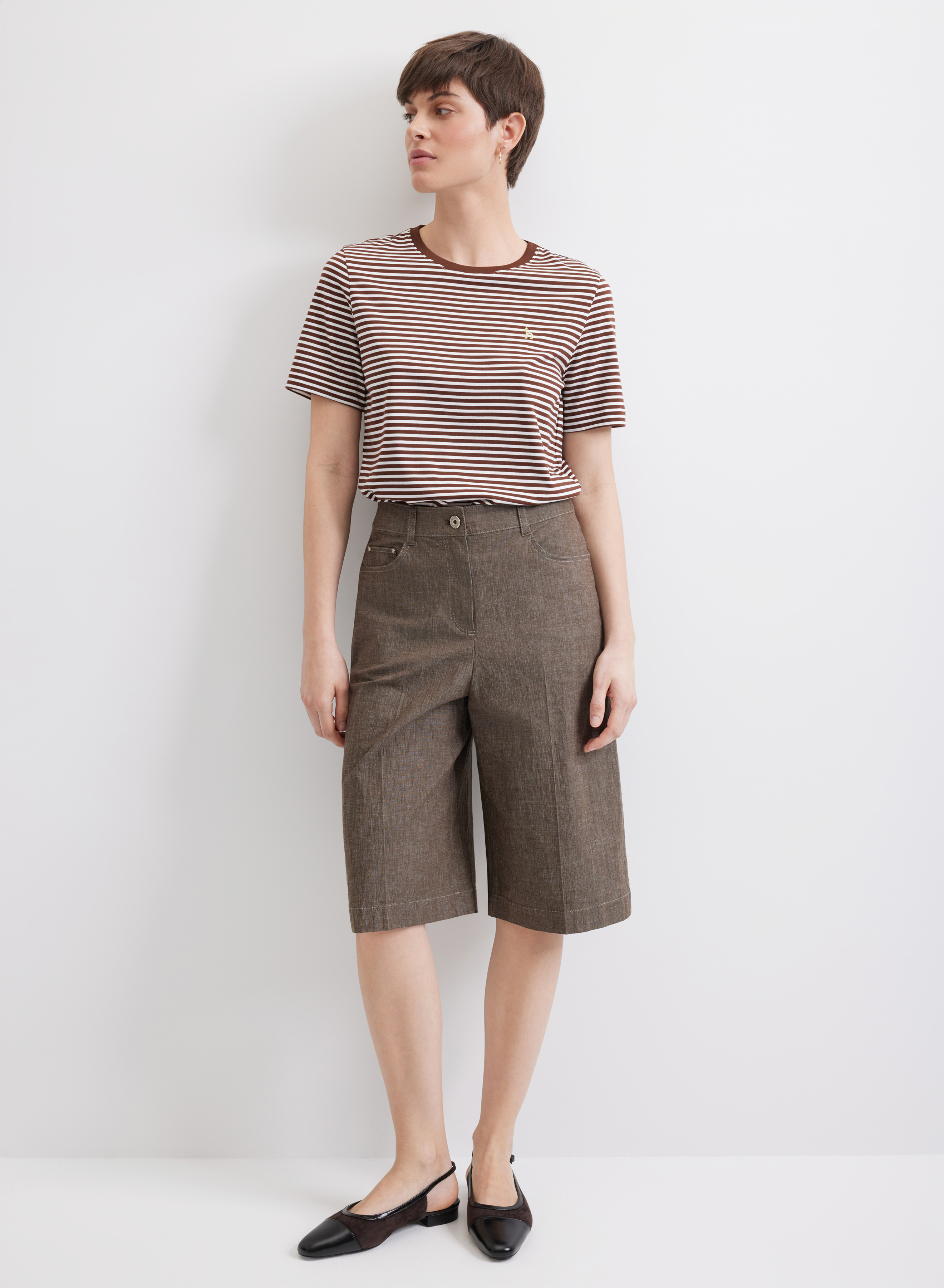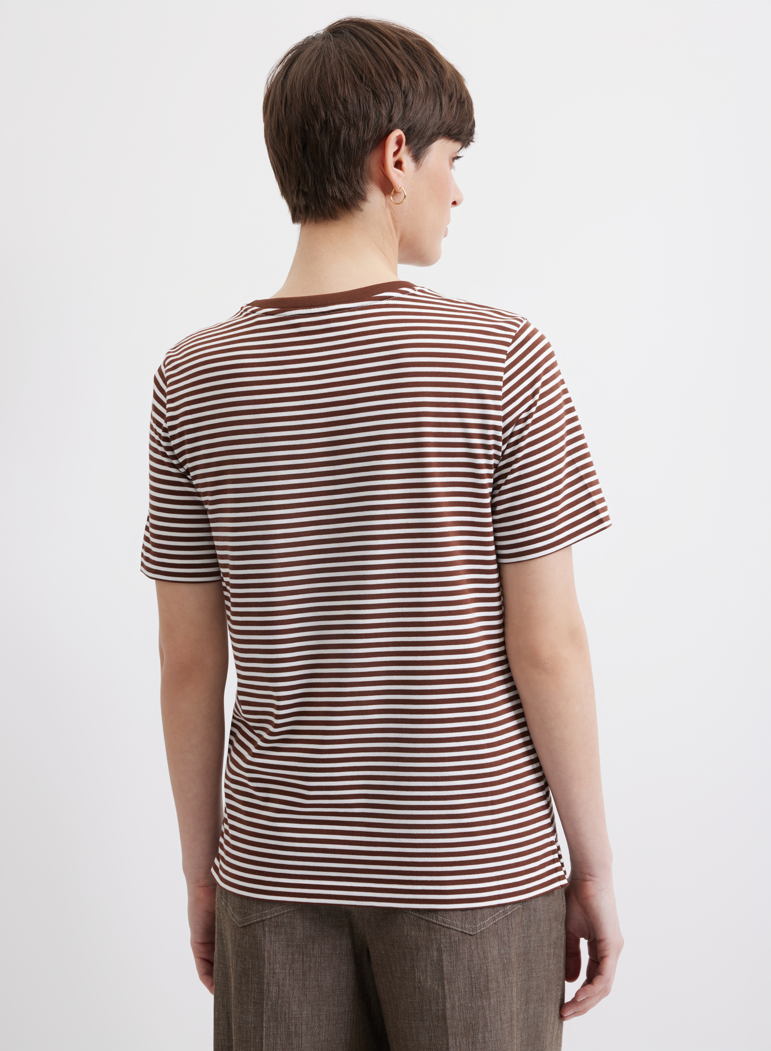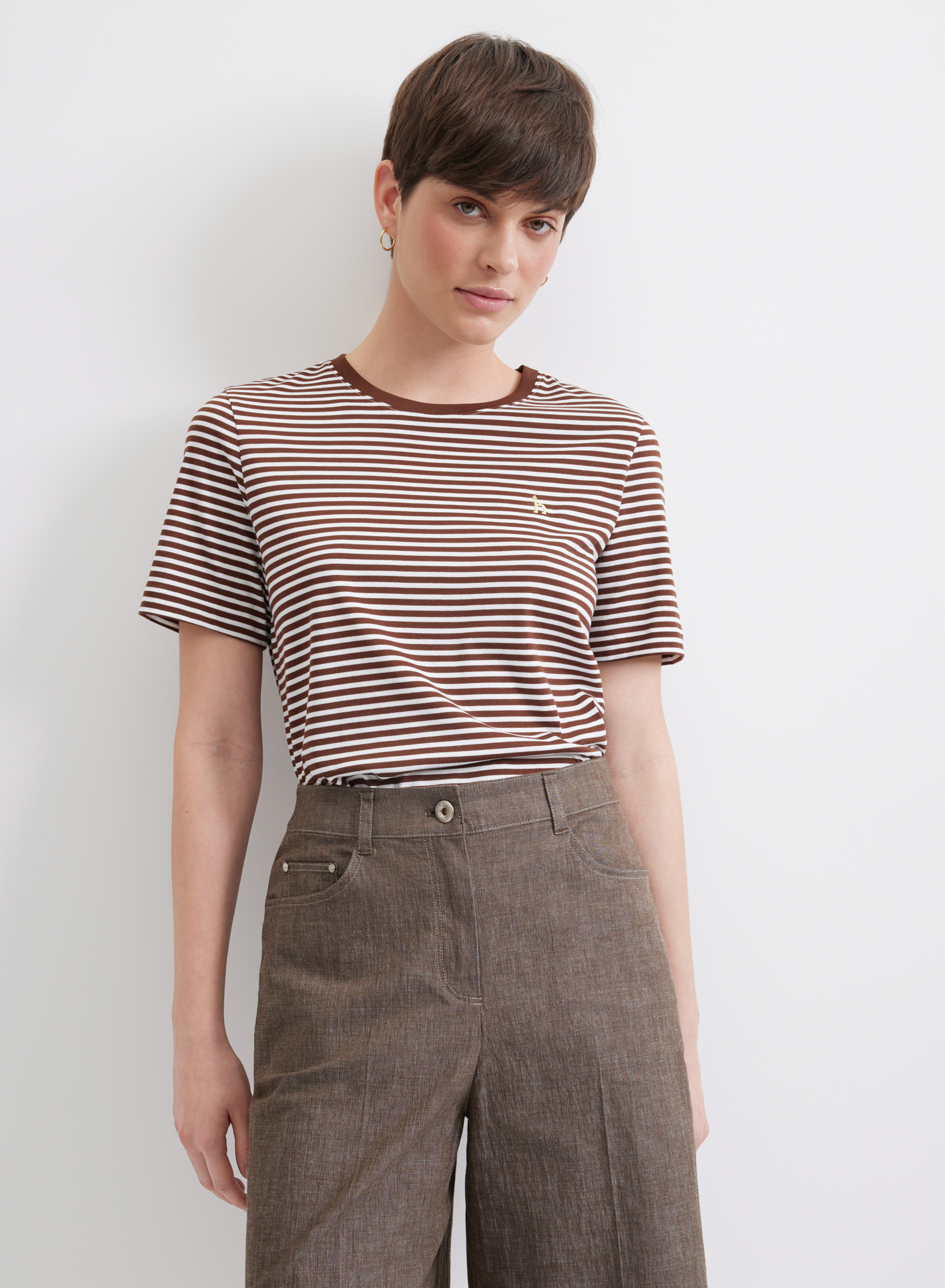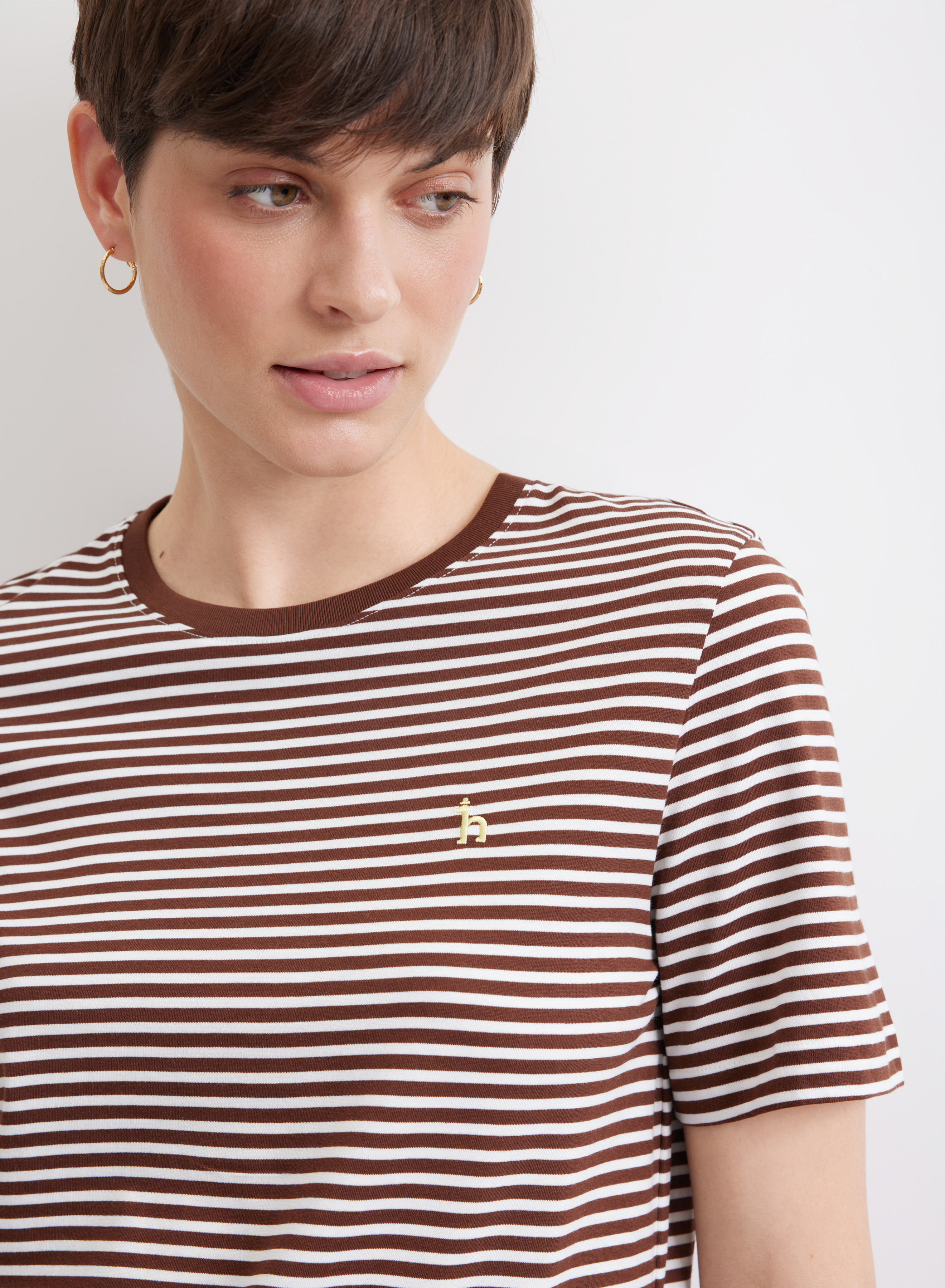 Футболка в полоску с короткими рукавами и круглой контрастной горловиной. Слева на груди на изделии расположен маленький логотип бренда в фирменном стиле.