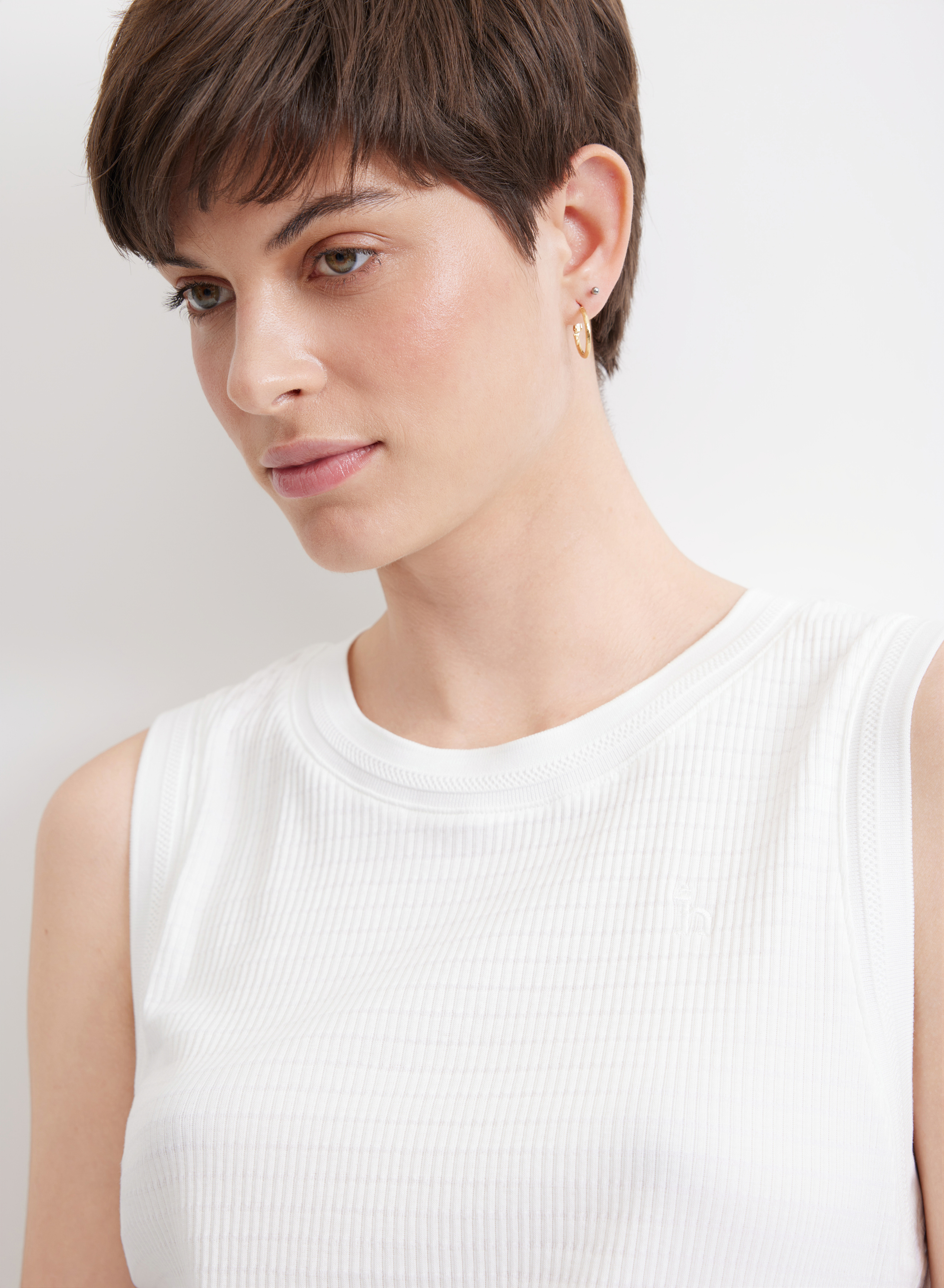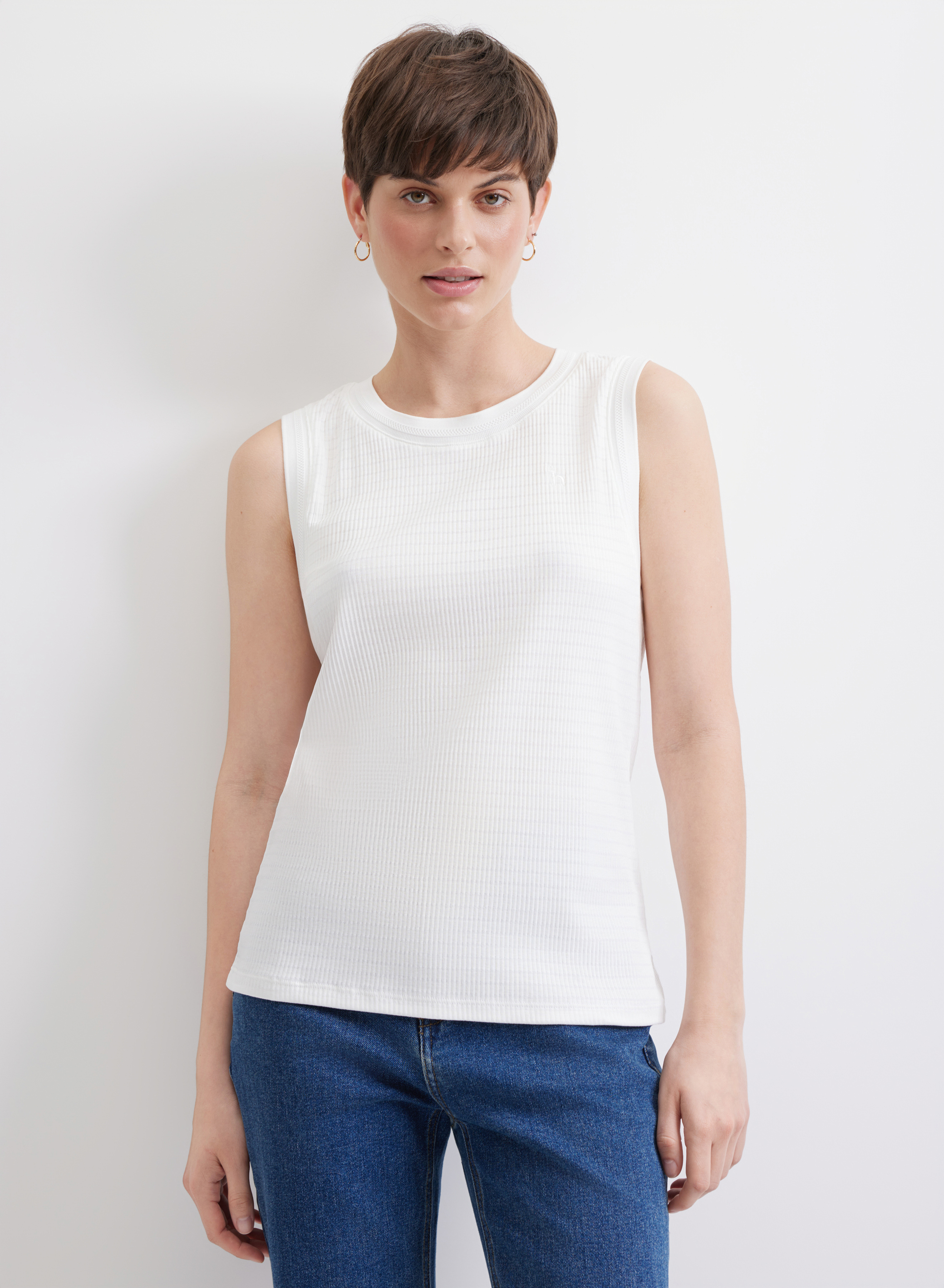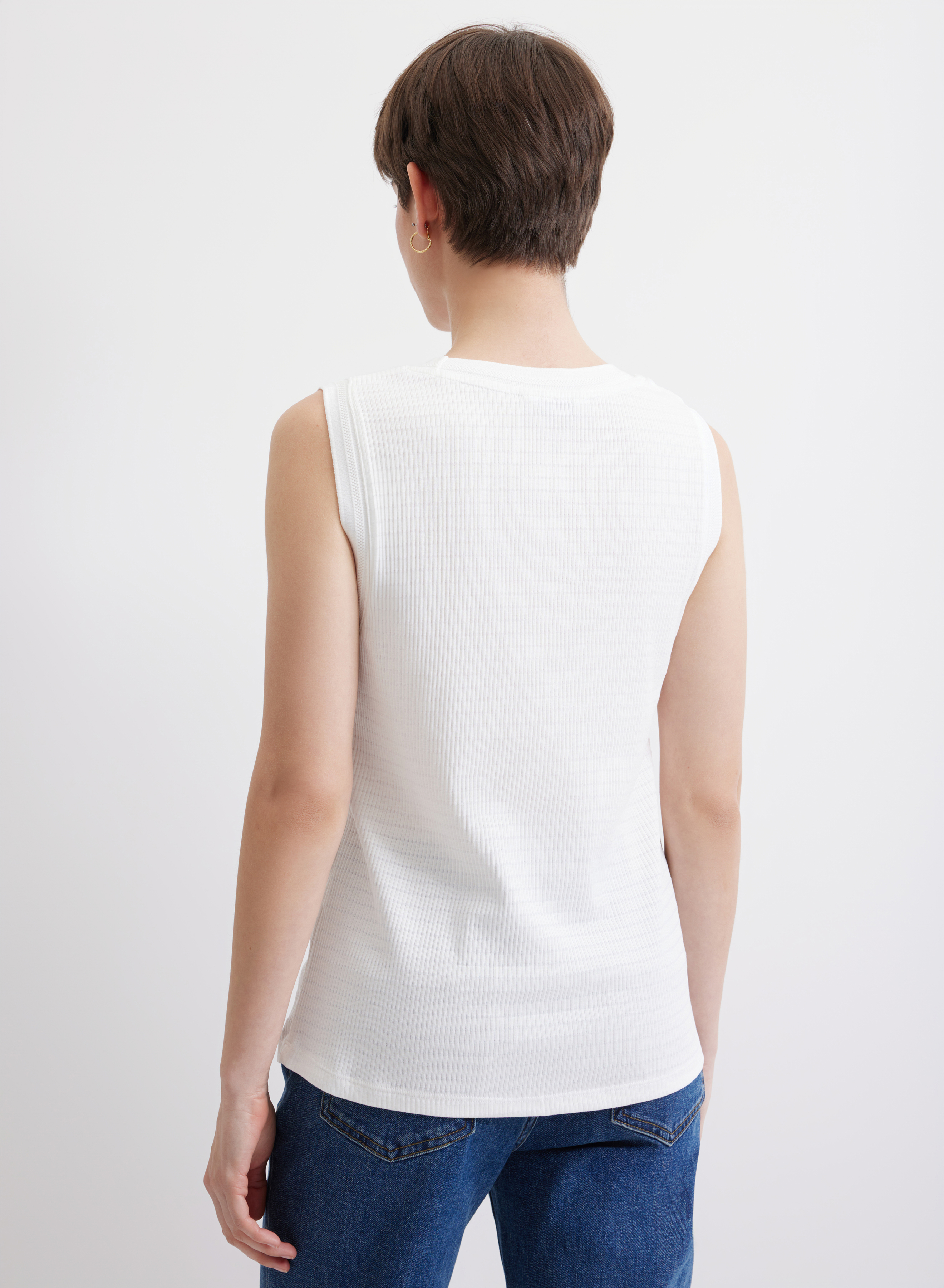 Белая майка, свободная, с ровным низом в классическом лаконичном стиле. Бретели широкие, горловина круглая. Пройму и горловину обрамляет широкая тесьма из белой ткани с фактурной тонкой полоской посередине.