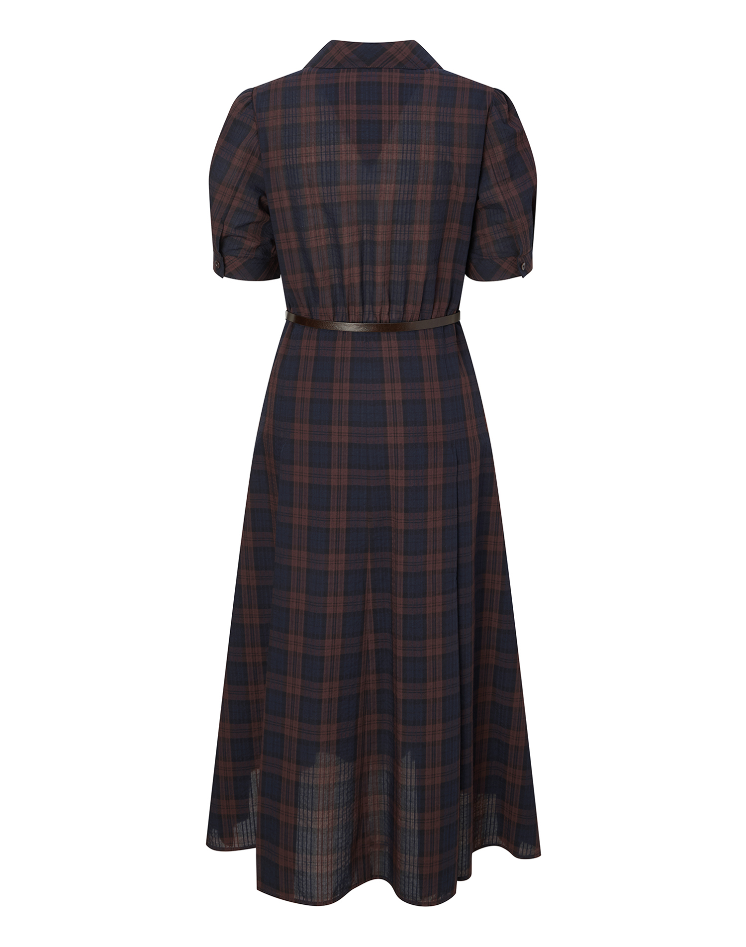 Прямое, слегка расклешенное книзу платье с центральной застежкой на пуговицы — основа привлекательных женственных образов. Горловина оформлена стояче-отложным воротником. Короткий рукав-фонарик на манжетах. Подчеркнутая линия талии создает силуэт песочные часы. По низу юбки — вертикальные складки.