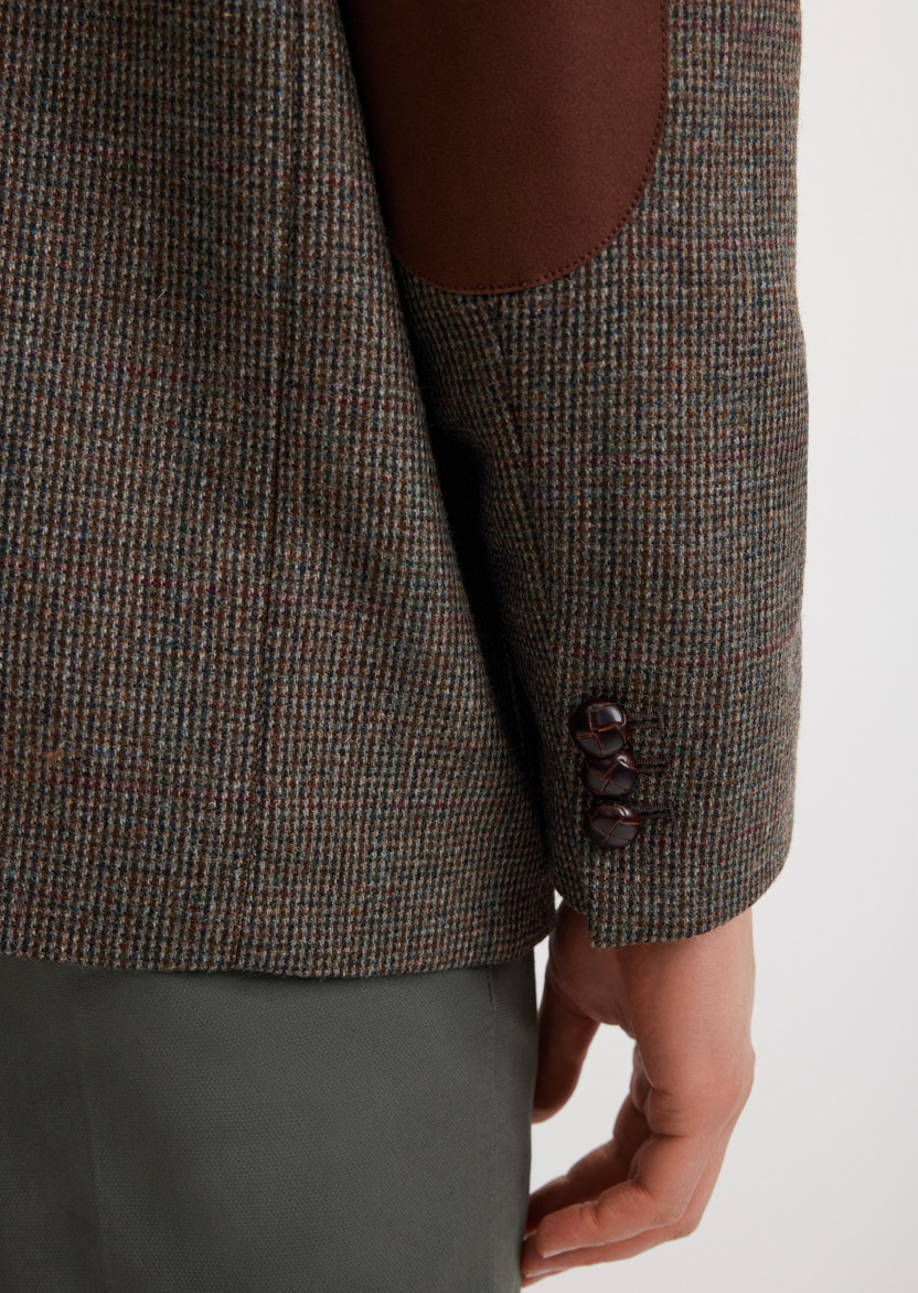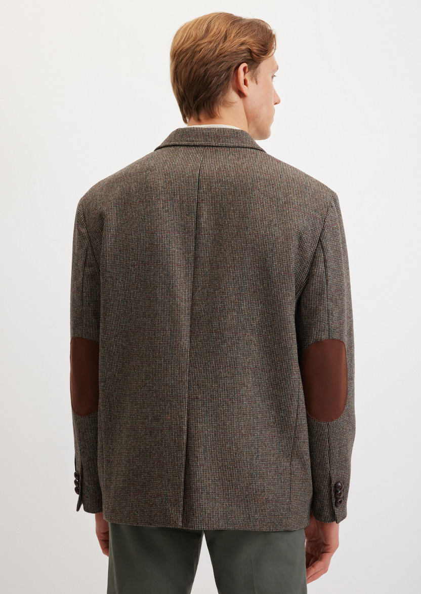 Однобортный пиджак прямого силуэта с классическими деталями кроя. Центральная застежка на пуговицы и передние накладные карманы добавляют функциональности. Шлица в среднем заднем шве обеспечивает комфортный шаг. Длинные втачные рукава декорированы локтевыми накладками и пуговицами в области манжет.