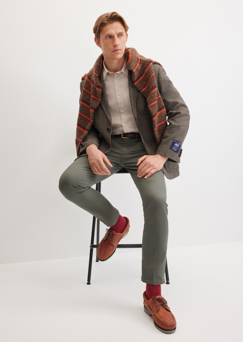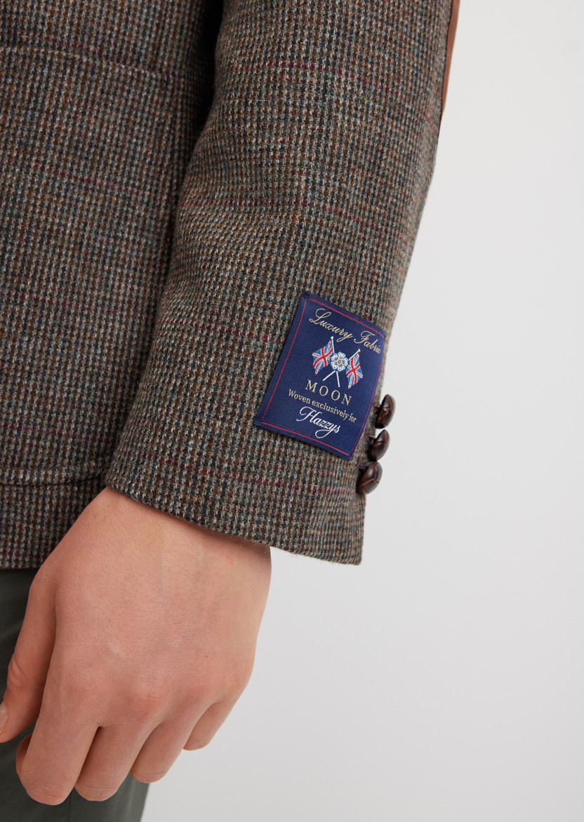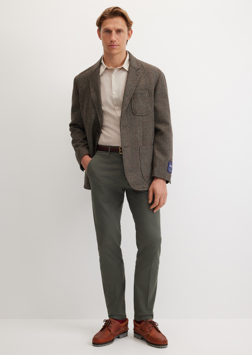 Пиджак выполнен из элитной костюмной ткани, сотканной из шерсти овец на фабрике Moon (Западный Йоркшир, Англия). Материал хорошо согревает и сохраняет безупречный вид в течение дня. Шелковистая подкладка с логотипом и внутренними карманами обеспечивает комфортную посадку по фигуре.
