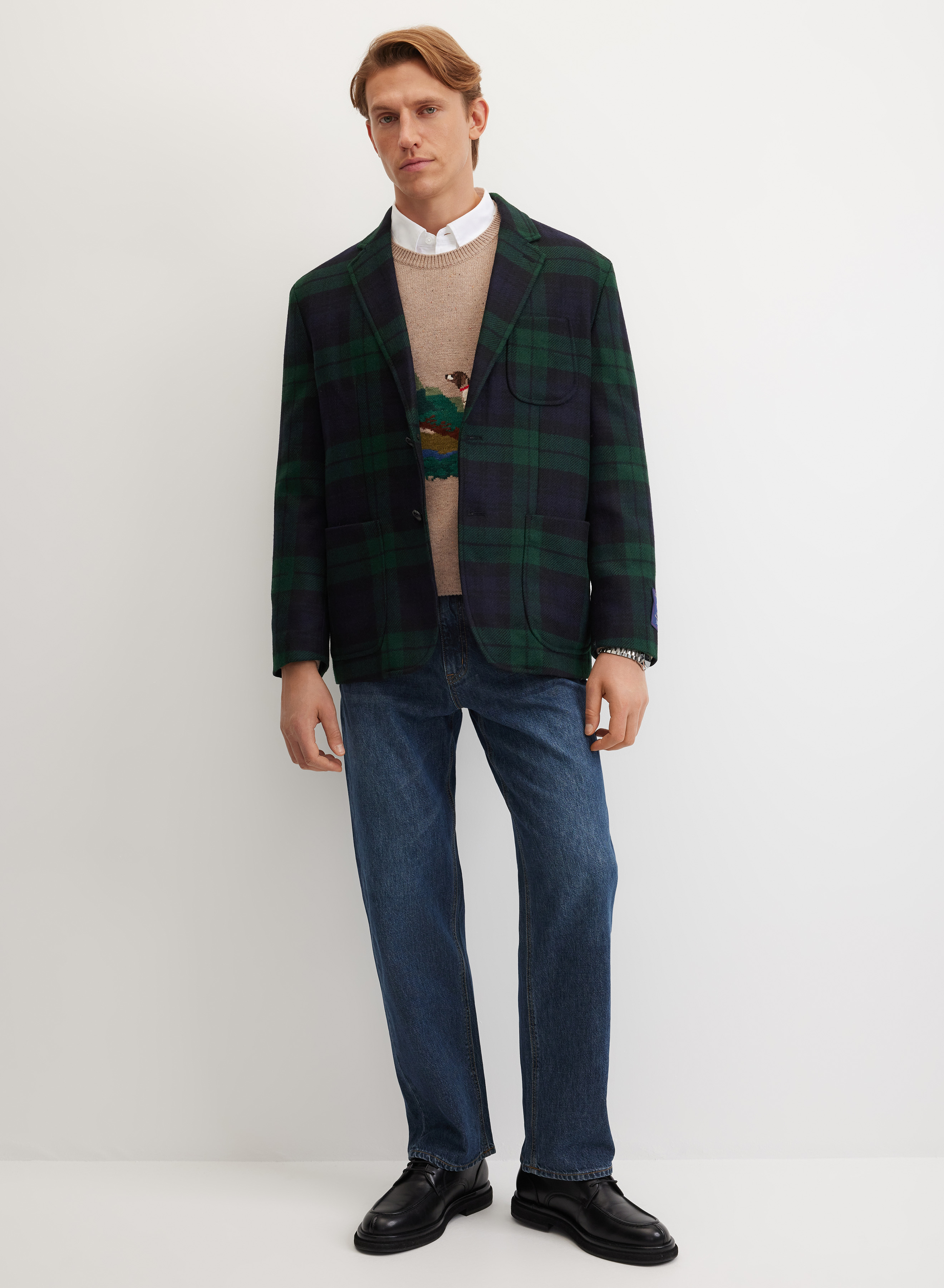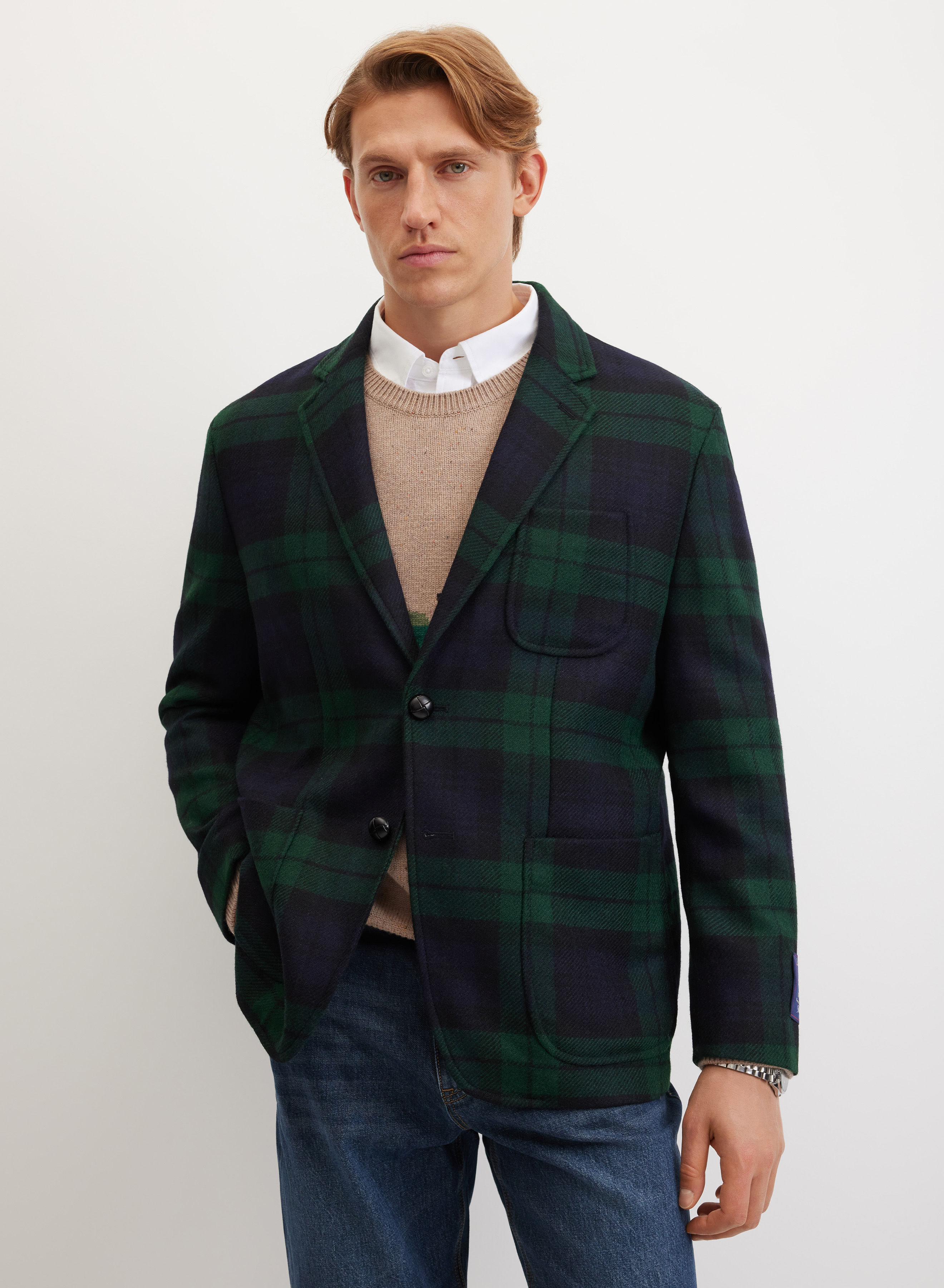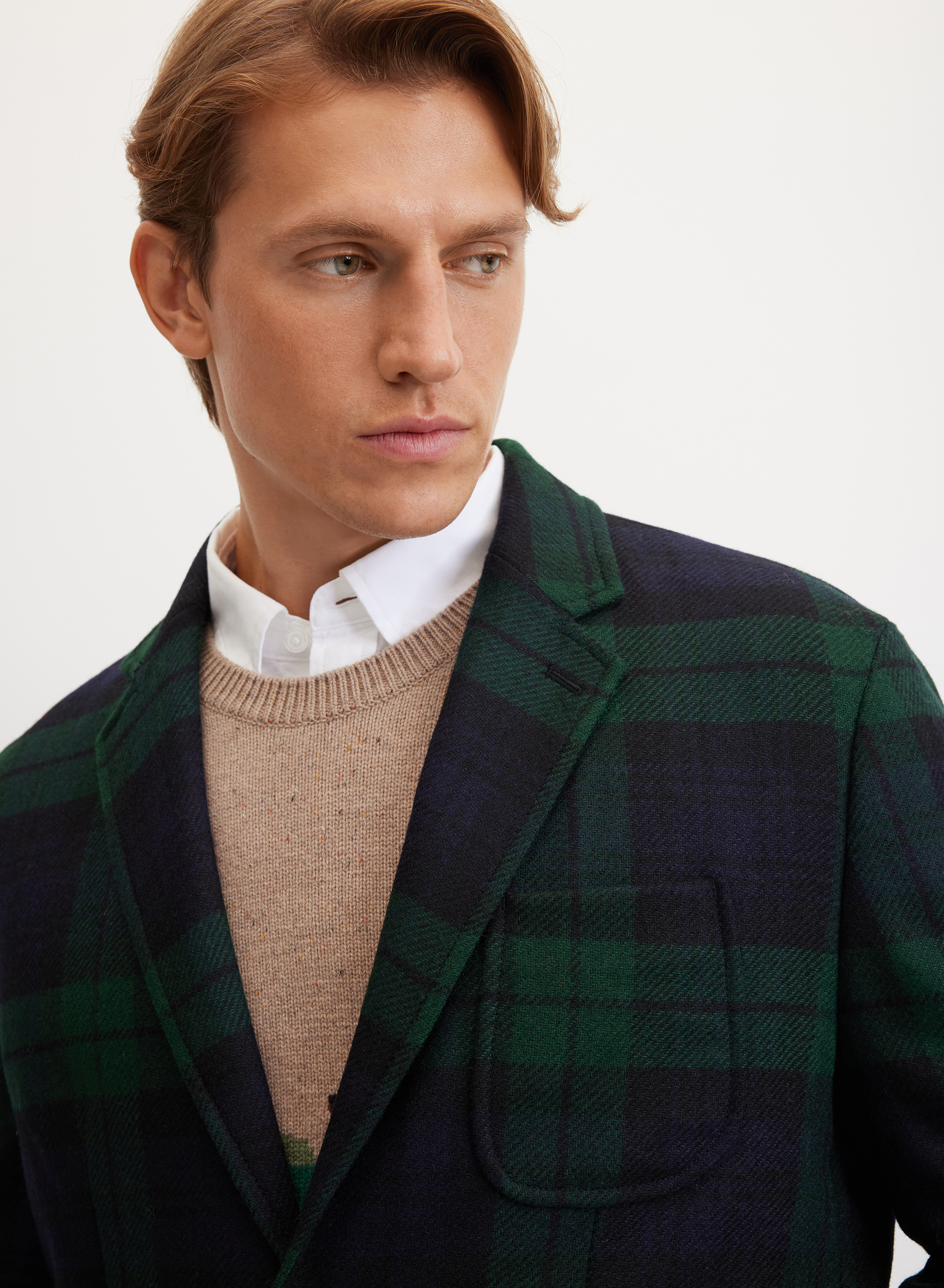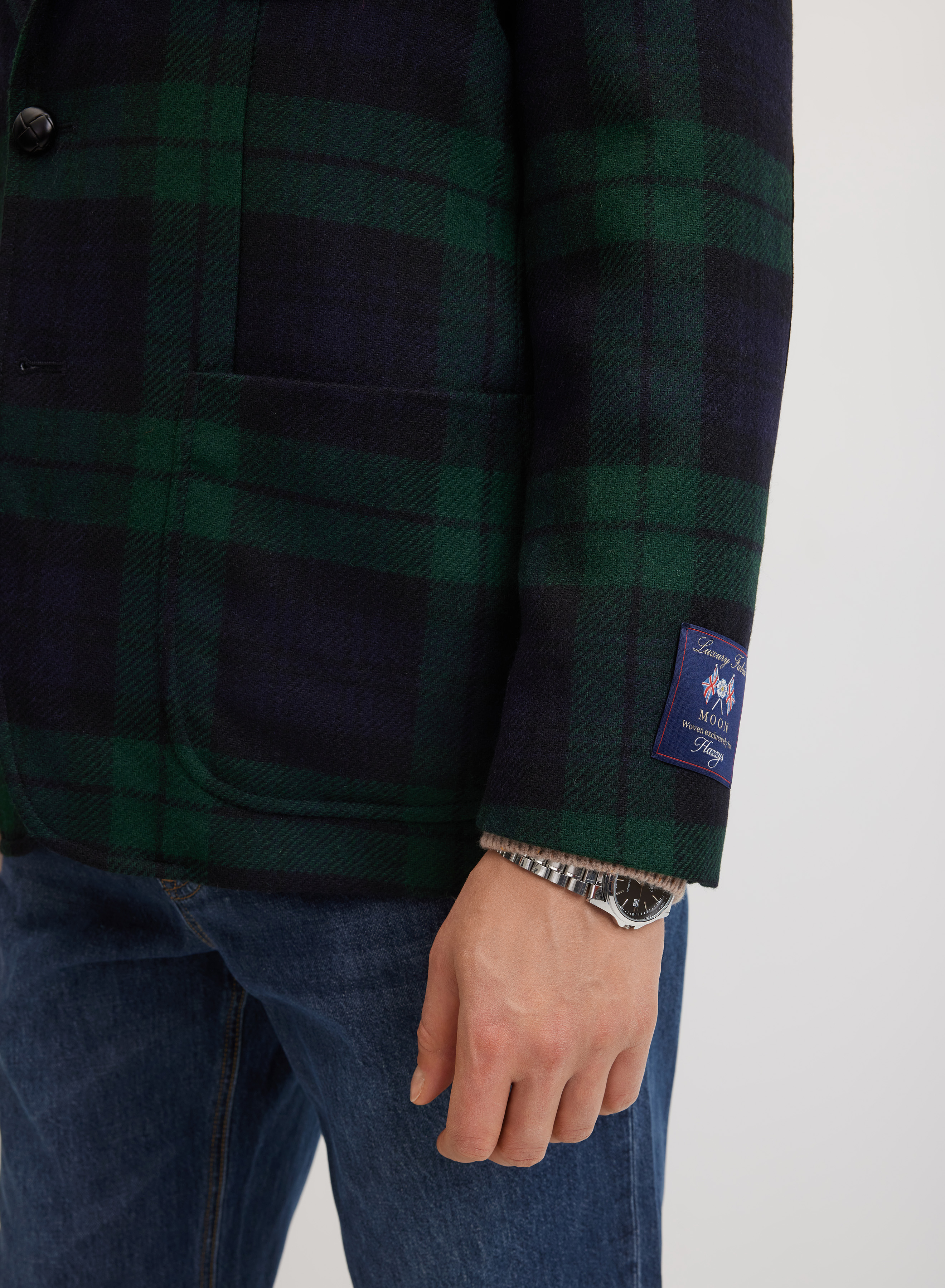 Пиджак выполнен из элитной костюмной ткани, сотканной из шерсти овец на фабрике Moon (Западный Йоркшир, Англия). Материал хорошо согревает и сохраняет безупречный вид в течение дня. Шелковистая подкладка с логотипом и внутренними карманами обеспечивает комфортную посадку по фигуре.