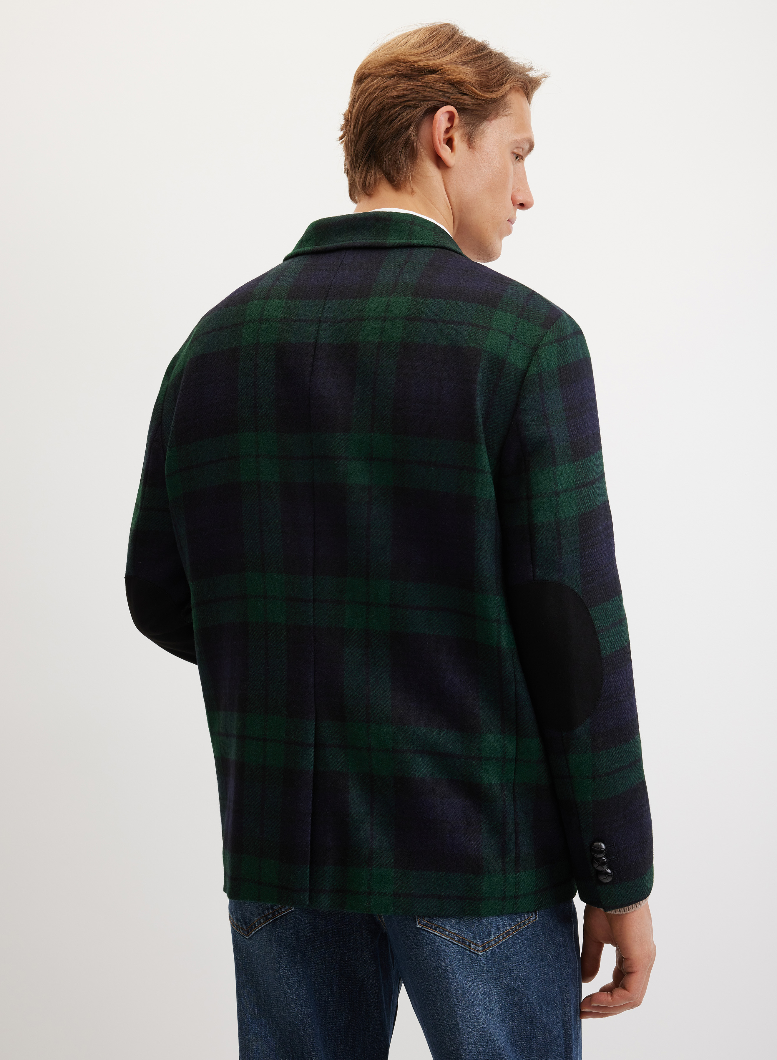 Однобортный пиджак прямого силуэта с классическими деталями кроя. Центральная застежка на пуговицы и передние накладные карманы добавляют функциональности. Шлица в среднем заднем шве обеспечивает комфортный шаг. Длинные втачные рукава декорированы локтевыми накладками и пуговицами в области манжет.