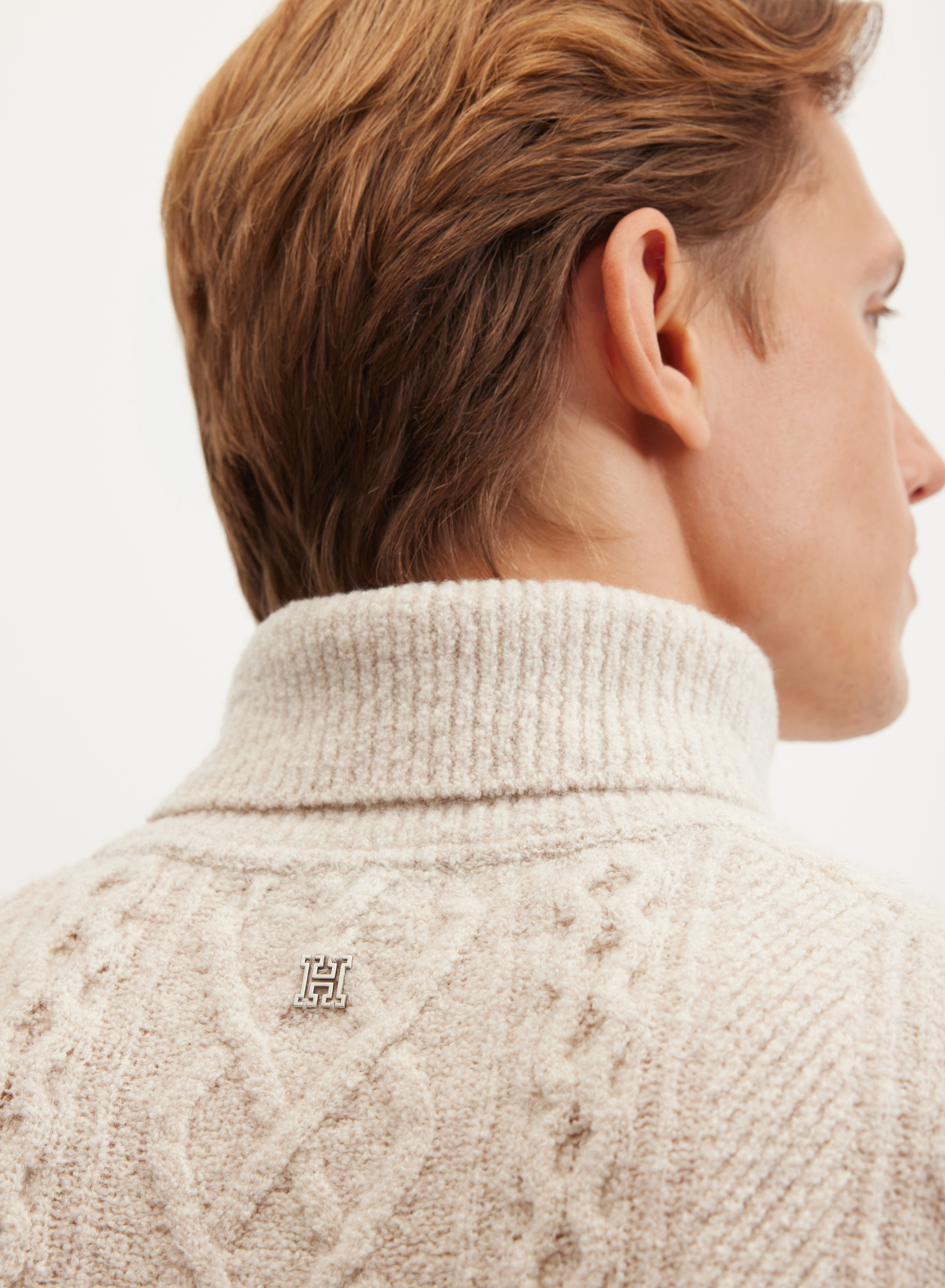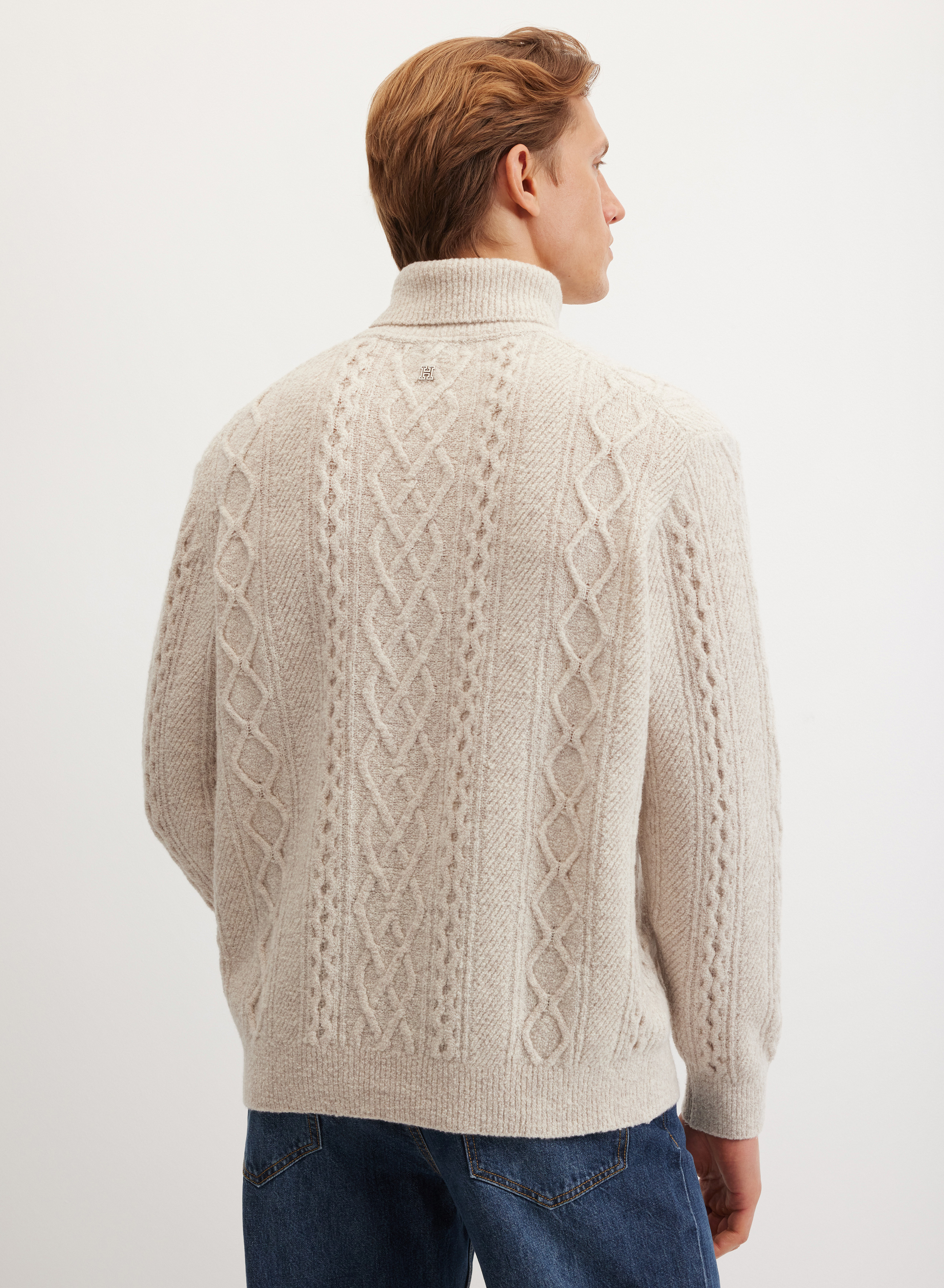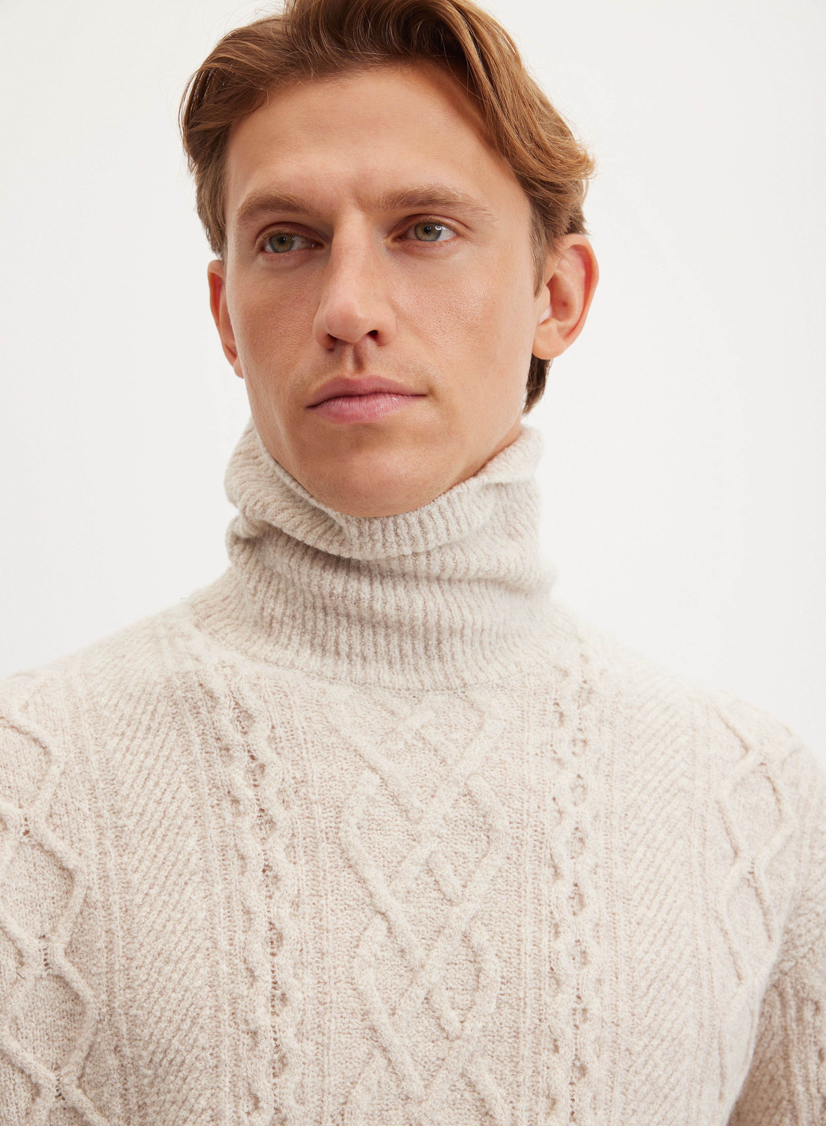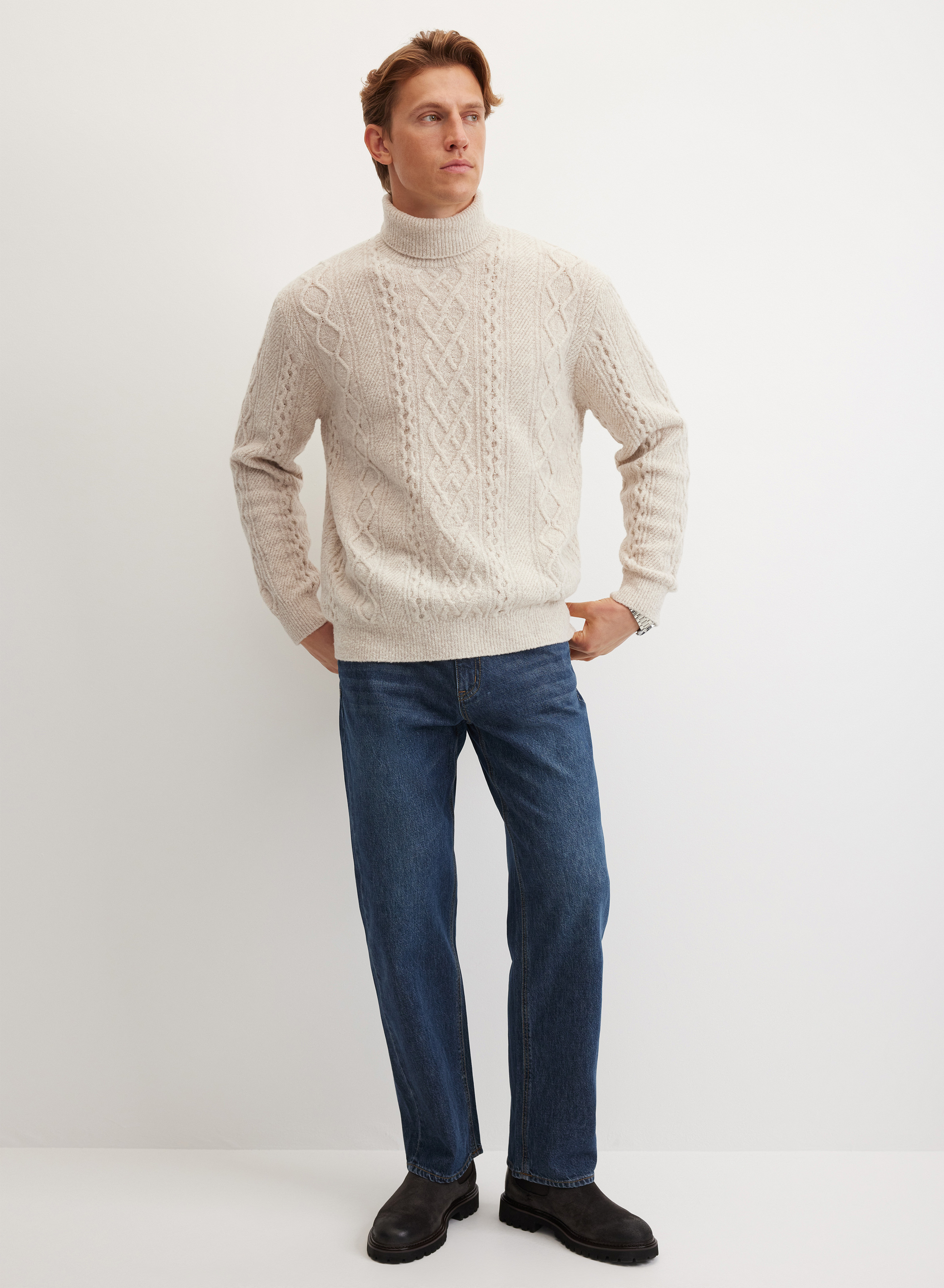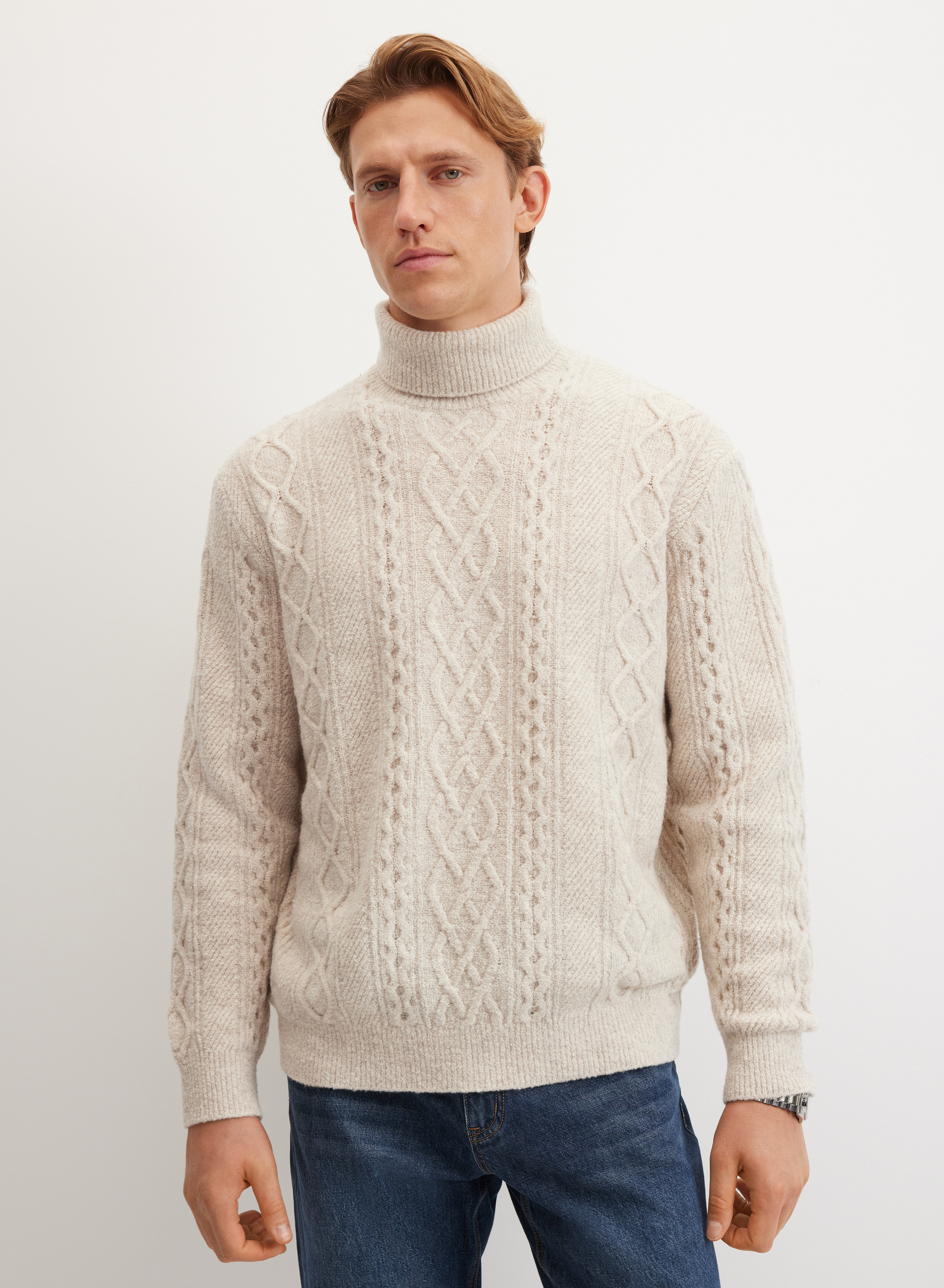Базовый джемпер-водолазка с воротником стойкой и длинными втачными рукавами со спущенными плечами, которые формируют расслабленный силуэт. Эластичная кайма на манжетах и по нижнему краю изделия обеспечивает удобную посадку и придает дополнительный акцент. Фактурный узор с косами и аранами добавляет выразительность образу.