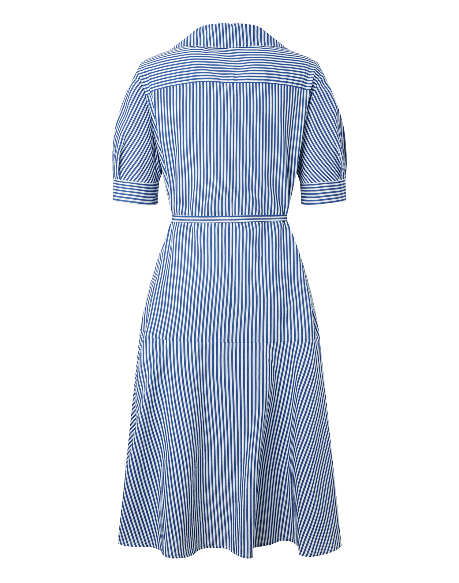 Платье А-силуэта и миди-длины из хлопкового материала в синюю полоску. Модель с открытым воротником с отворотами и короткими рукавами, оформленными манжетами. Кокетка на спине обеспечивает точную посадку, а пояс подчеркивает линию талии. Легкие волан внизу создают динамичный силуэт, а частичная застежка спереди на пуговицы добавляет практичности.