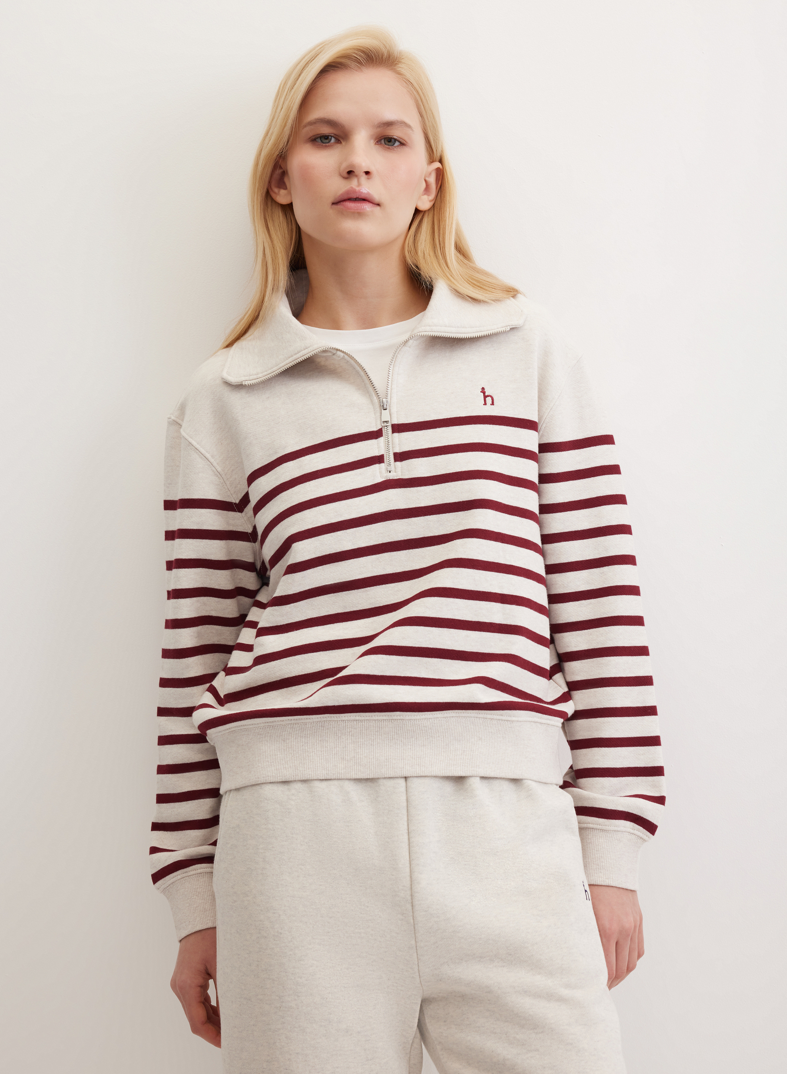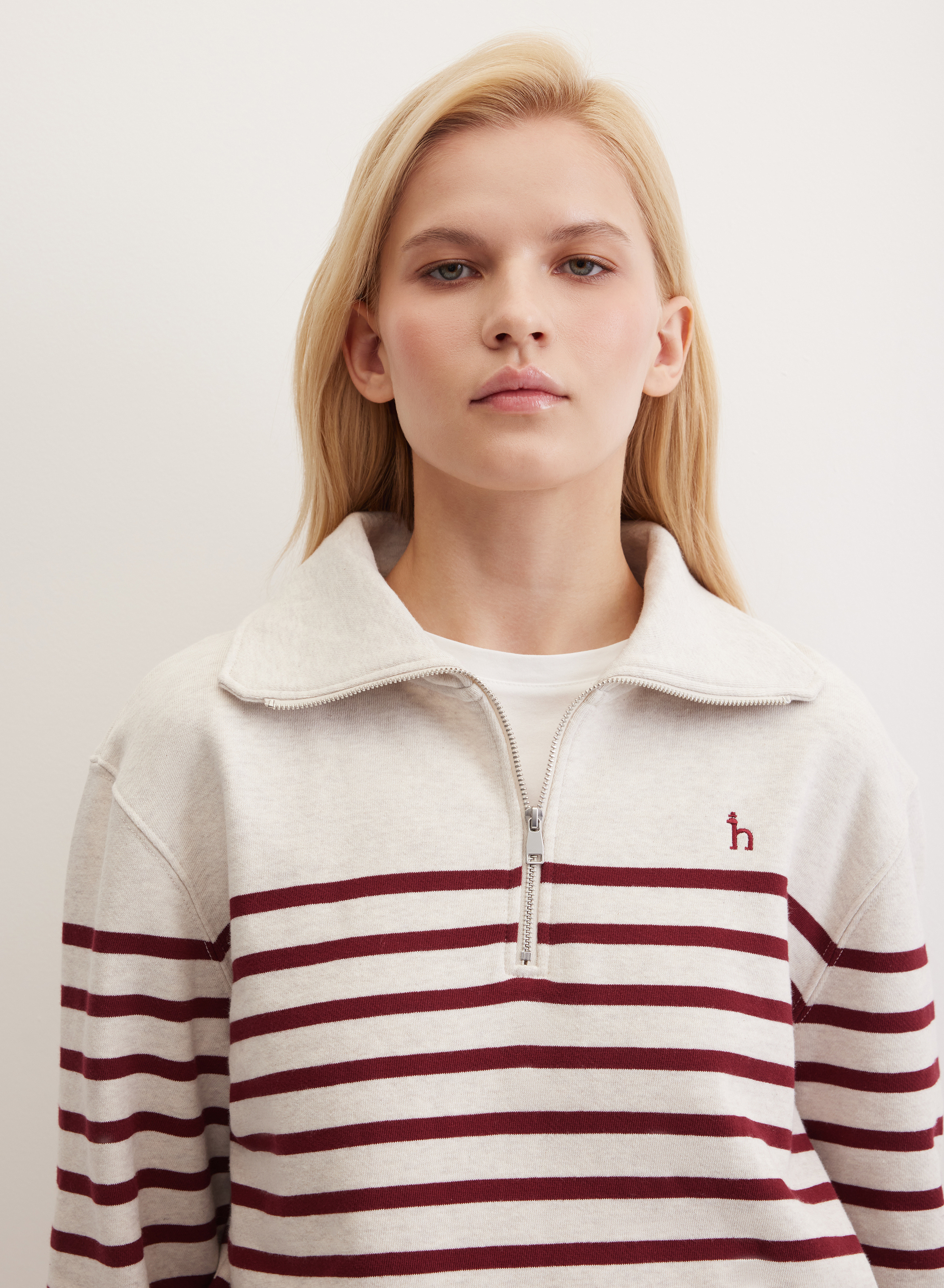 Объемный джемпер свободного кроя. Отличается спущенной линией плеча и длиной до середины бедра. Высокая горловина застегивается на молнию, которая доходит до середины груди, позволяя регулировать степень закрытости. Широкая линия низа обеспечивает возможность точной регулировки посадки по длине.