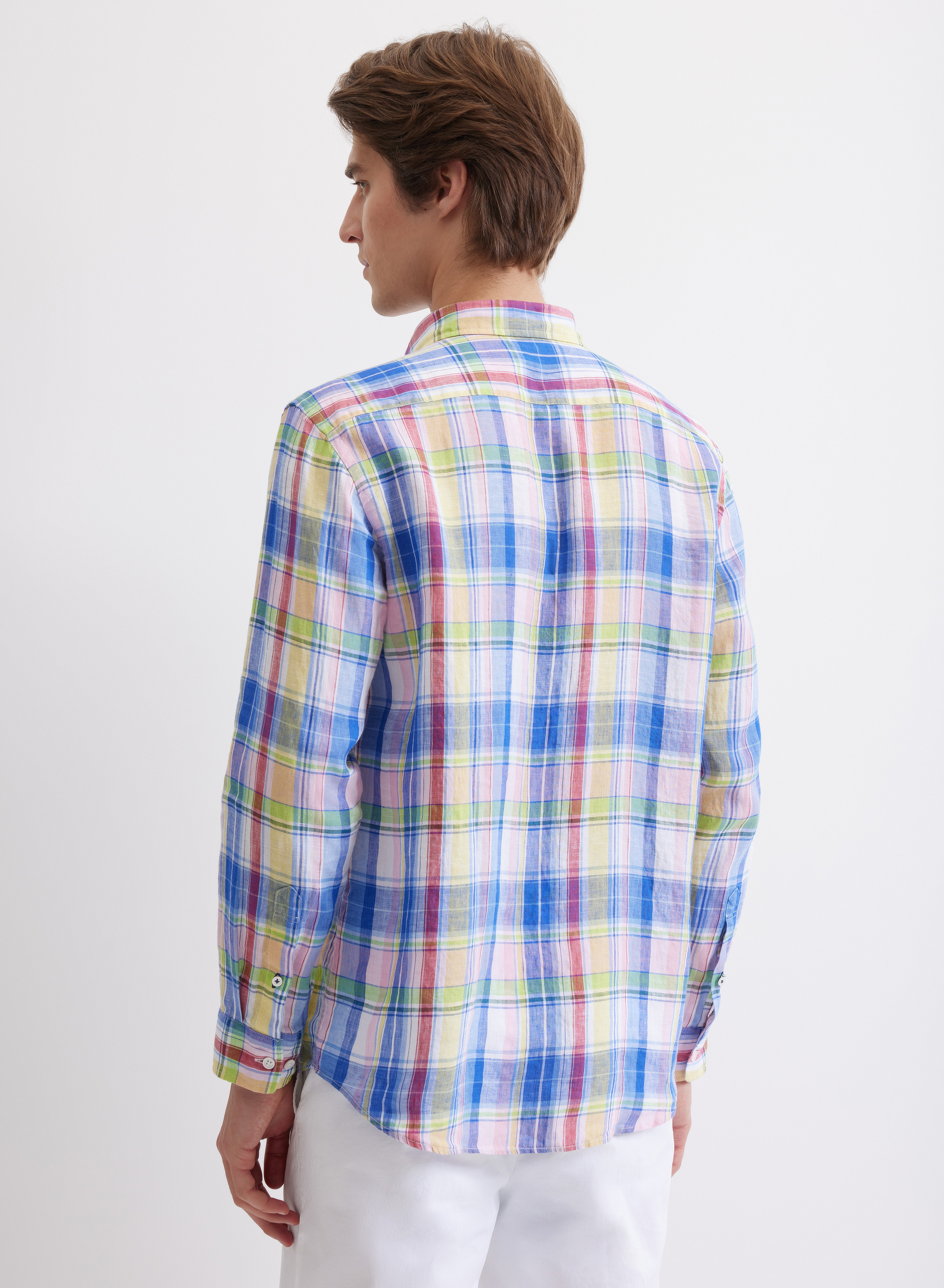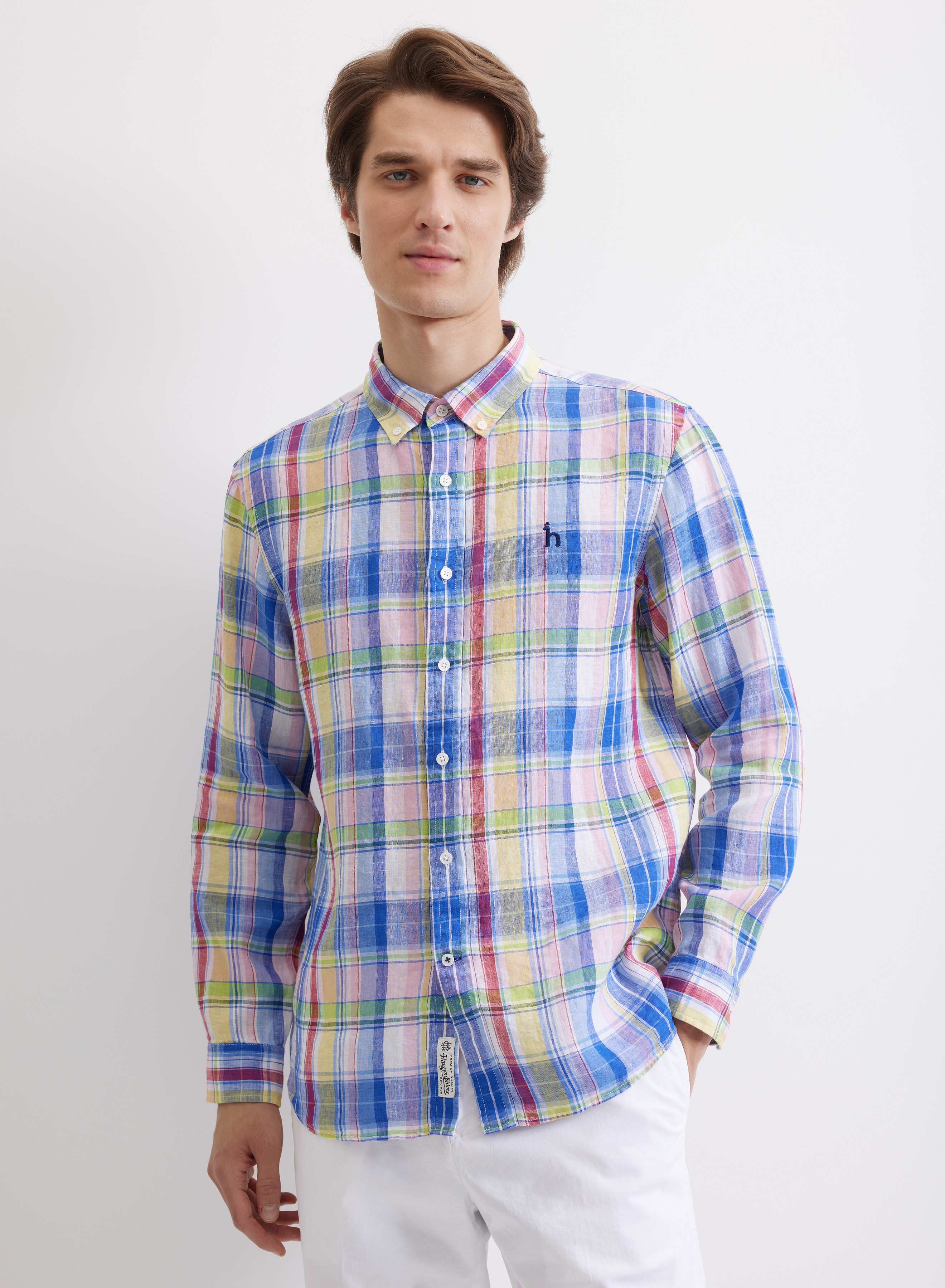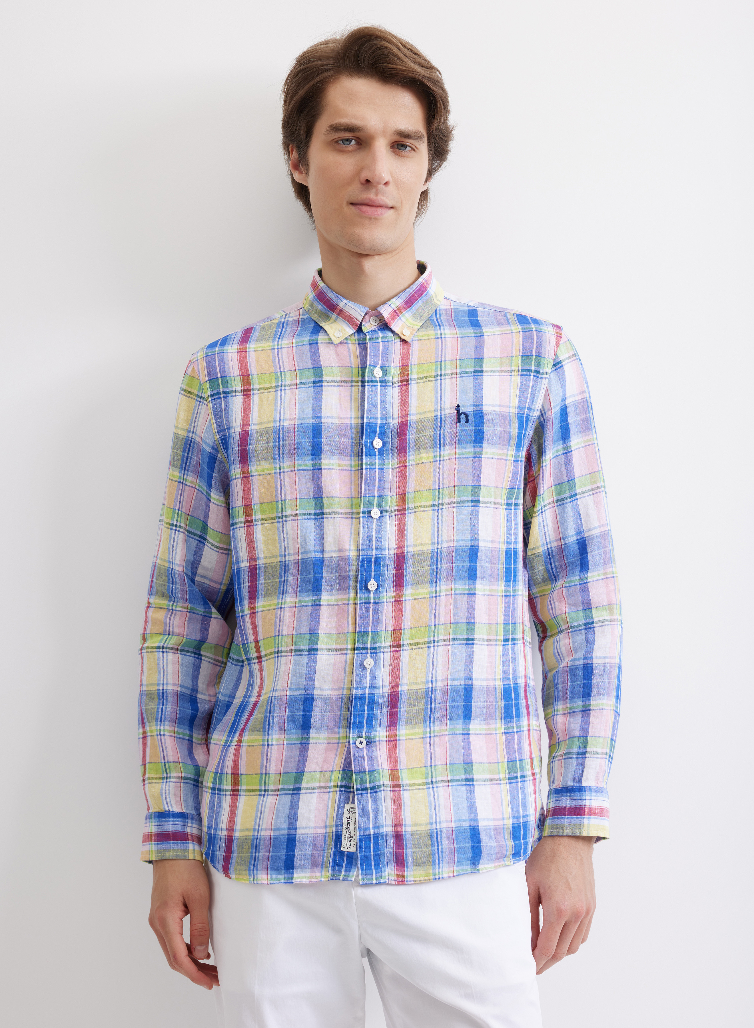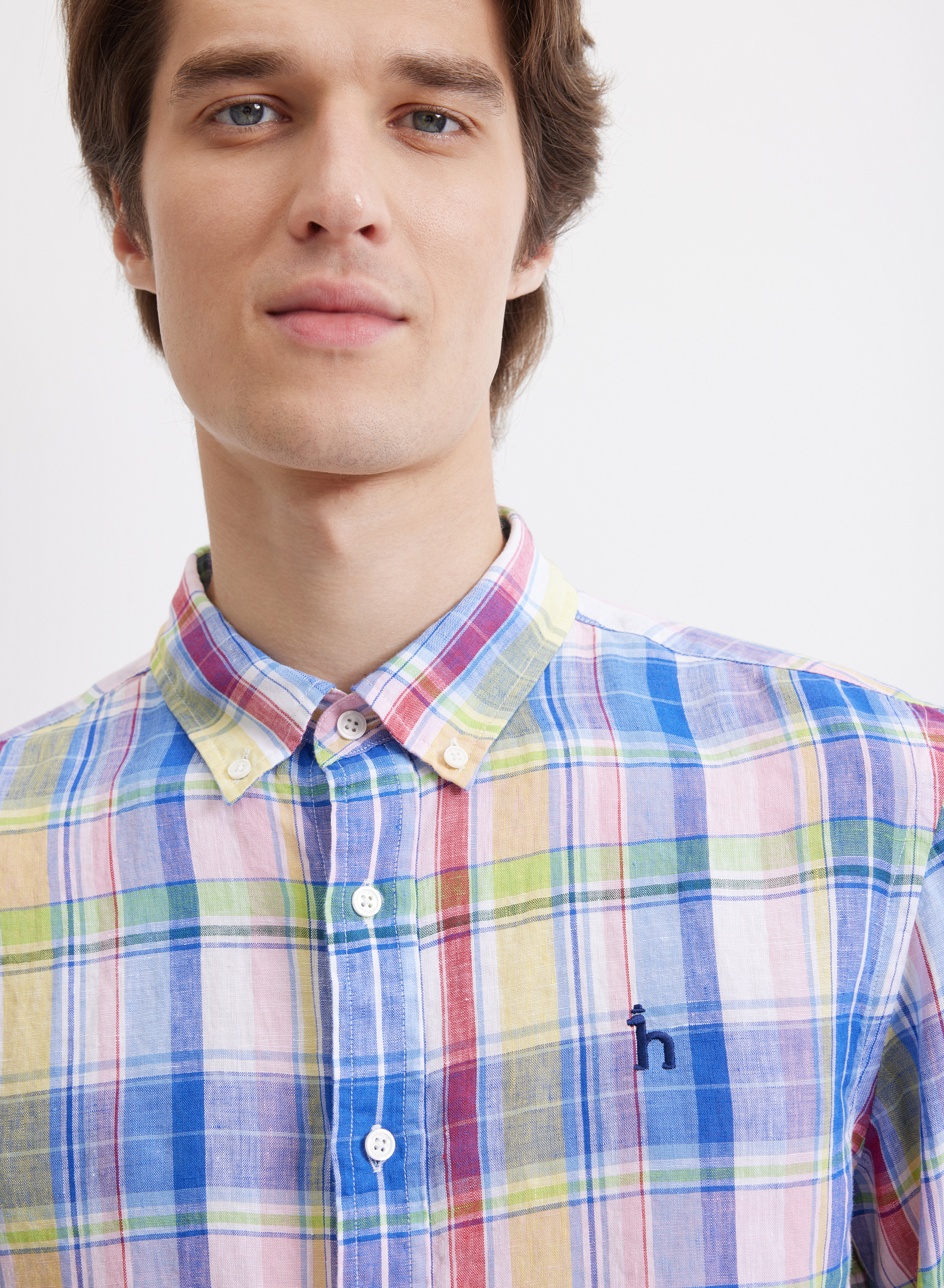 Рубашка в контрастную клетку. Модель прямого кроя, с фигурным низом. Застегивается на ряд пуговиц, расположенных по центру открытой планки. Длинные рукава с классическими манжетами тоже застегиваются на такие же пуговицы. Аккуратный отложной воротник по углам можно зафиксировать на пуговицы. На груди расположена контрастная вышивка — логотип бренда.
