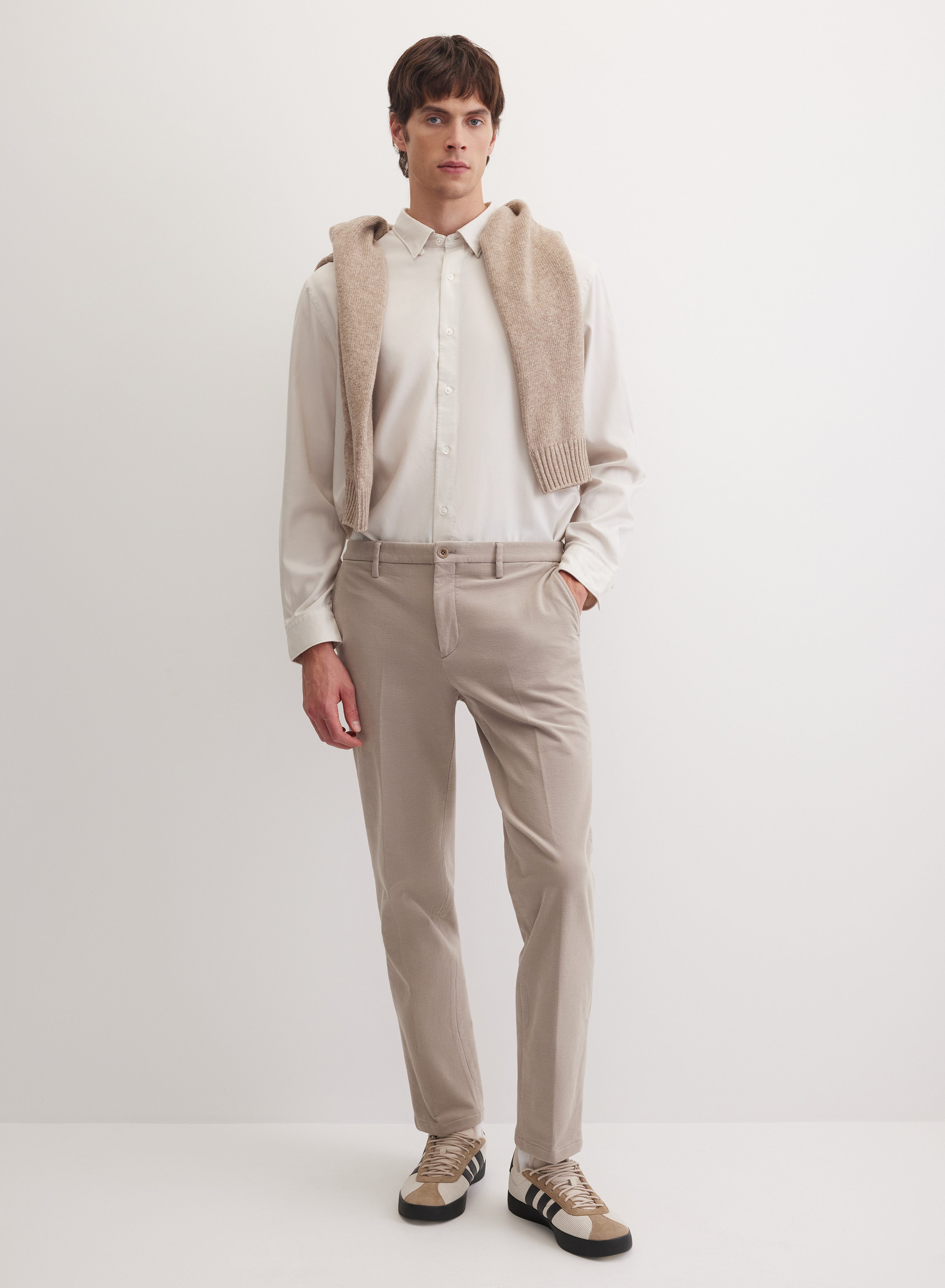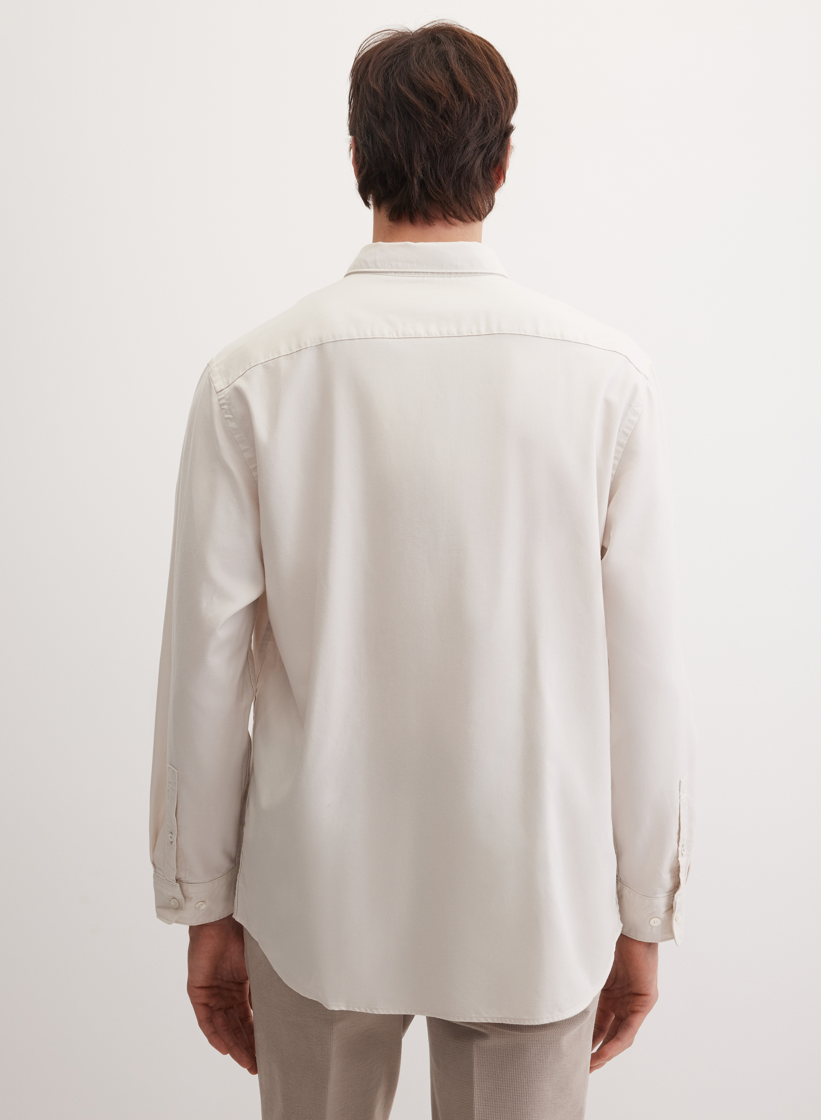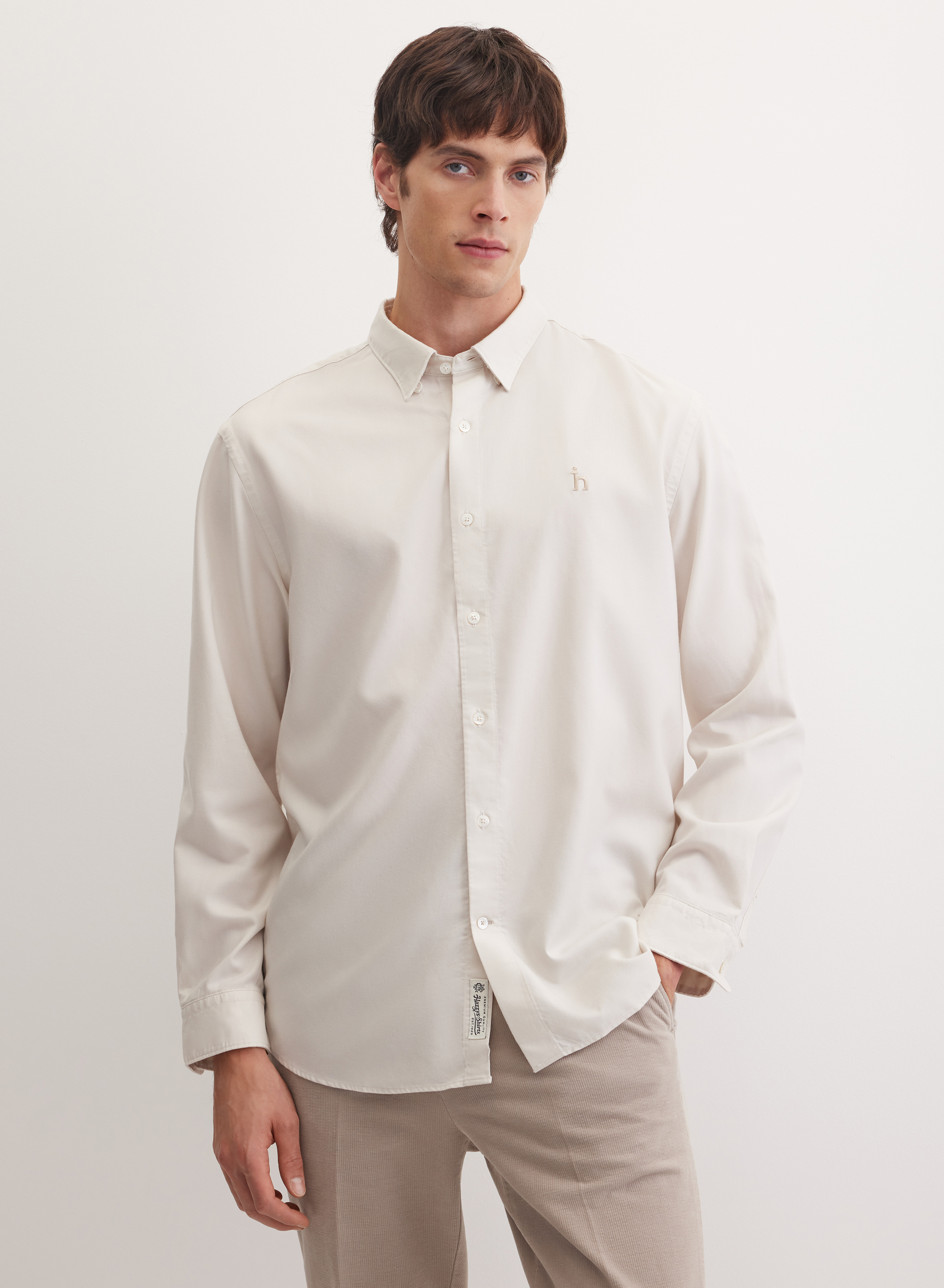 Минималистичный стиль рубашки подчеркивают удлиненная линия подола и длинные рукава. Отличается классическим отложным воротником и застежкой на пуговицы по всей длине. Единственным декоративным акцентом служит тонкая вышивка с логотипом бренда на груди.