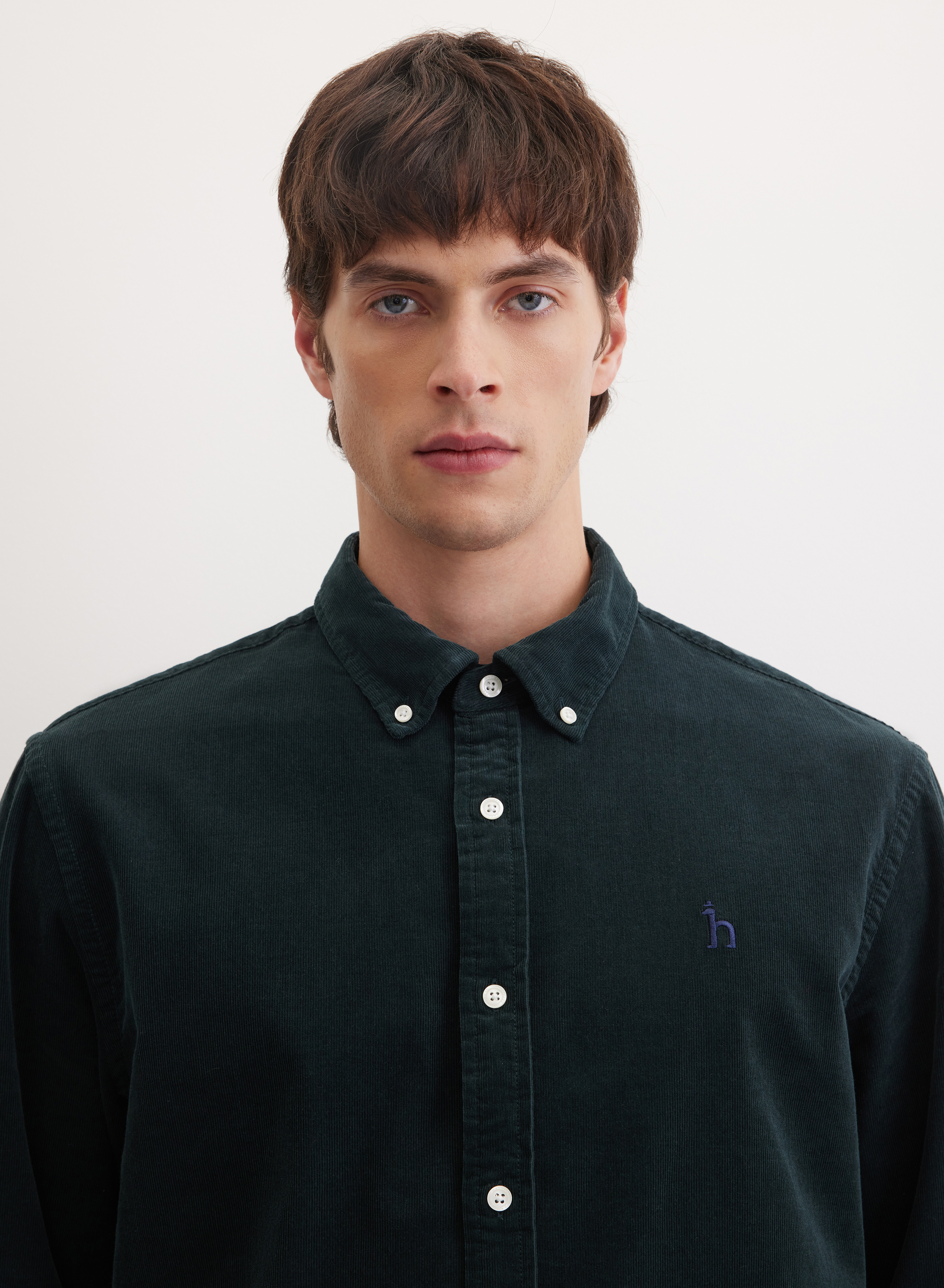 Классическая рубашка свободного кроя с длиной ниже пояса создает непринужденный плавный силуэт. Отложной воротник и застежка на пуговицы придают дизайну завершенность. Особое внимание привлекают контрастные пуговицы, использованные как по центральной планке, так и на воротнике. Низ изделия выполнен с фигурным краем, добавляя легкую динамику.