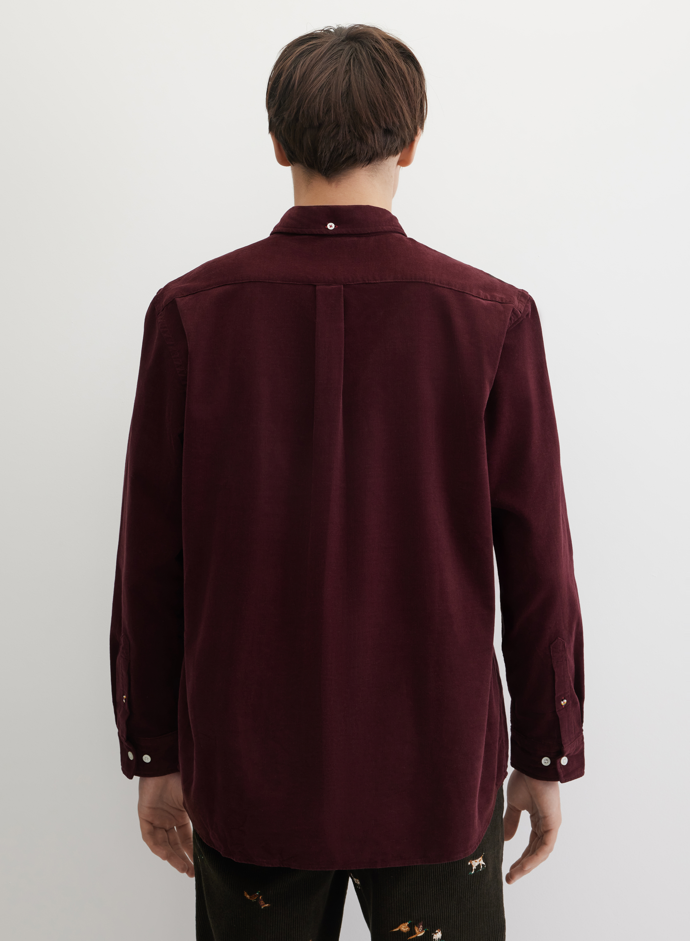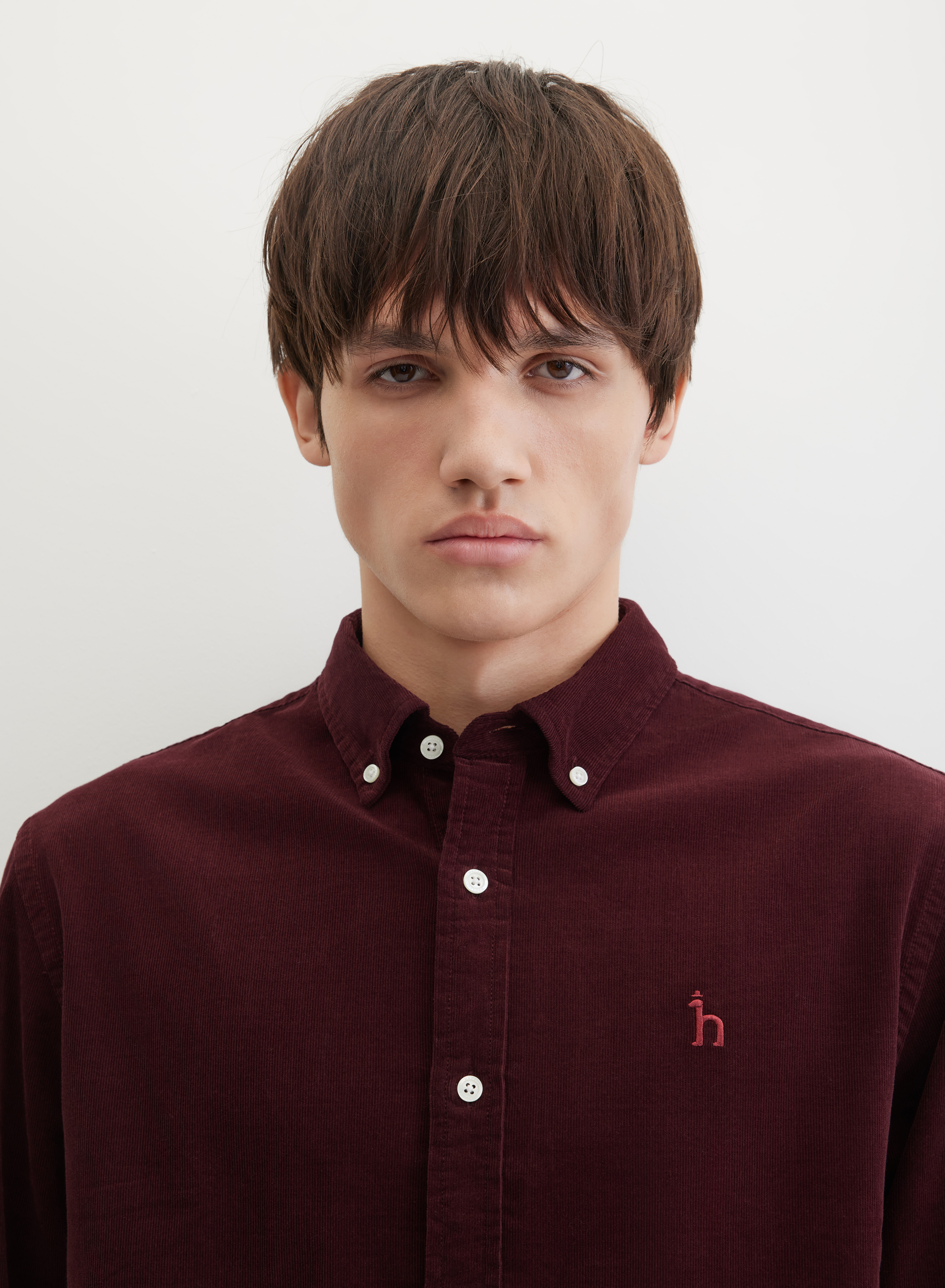 Классическая рубашка свободного кроя с длиной ниже пояса создает непринужденный плавный силуэт. Отложной воротник и застежка на пуговицы придают дизайну завершенность. Особое внимание привлекают контрастные пуговицы, использованные как по центральной планке, так и на воротнике. Низ изделия выполнен с фигурным краем, добавляя легкую динамику.