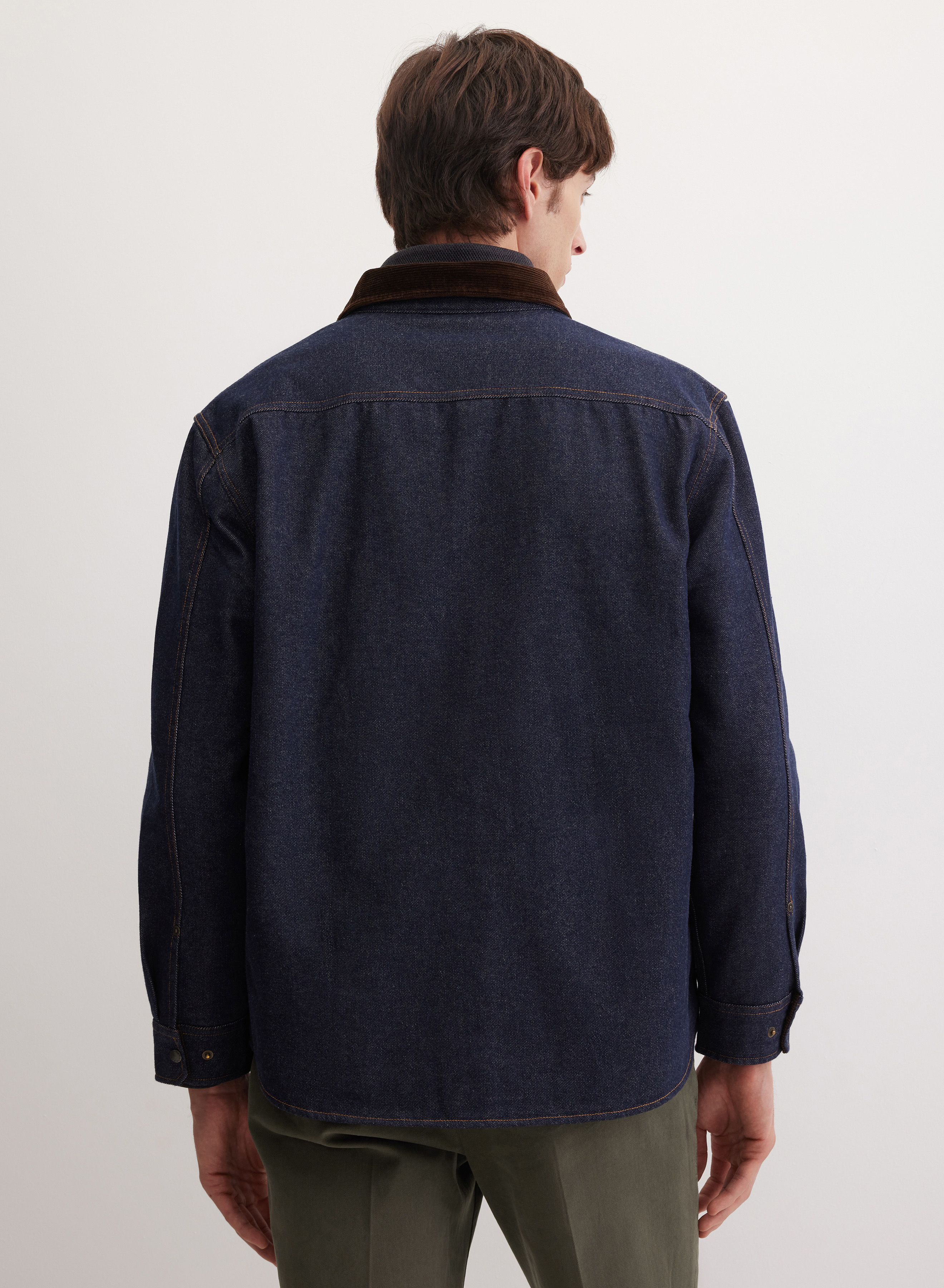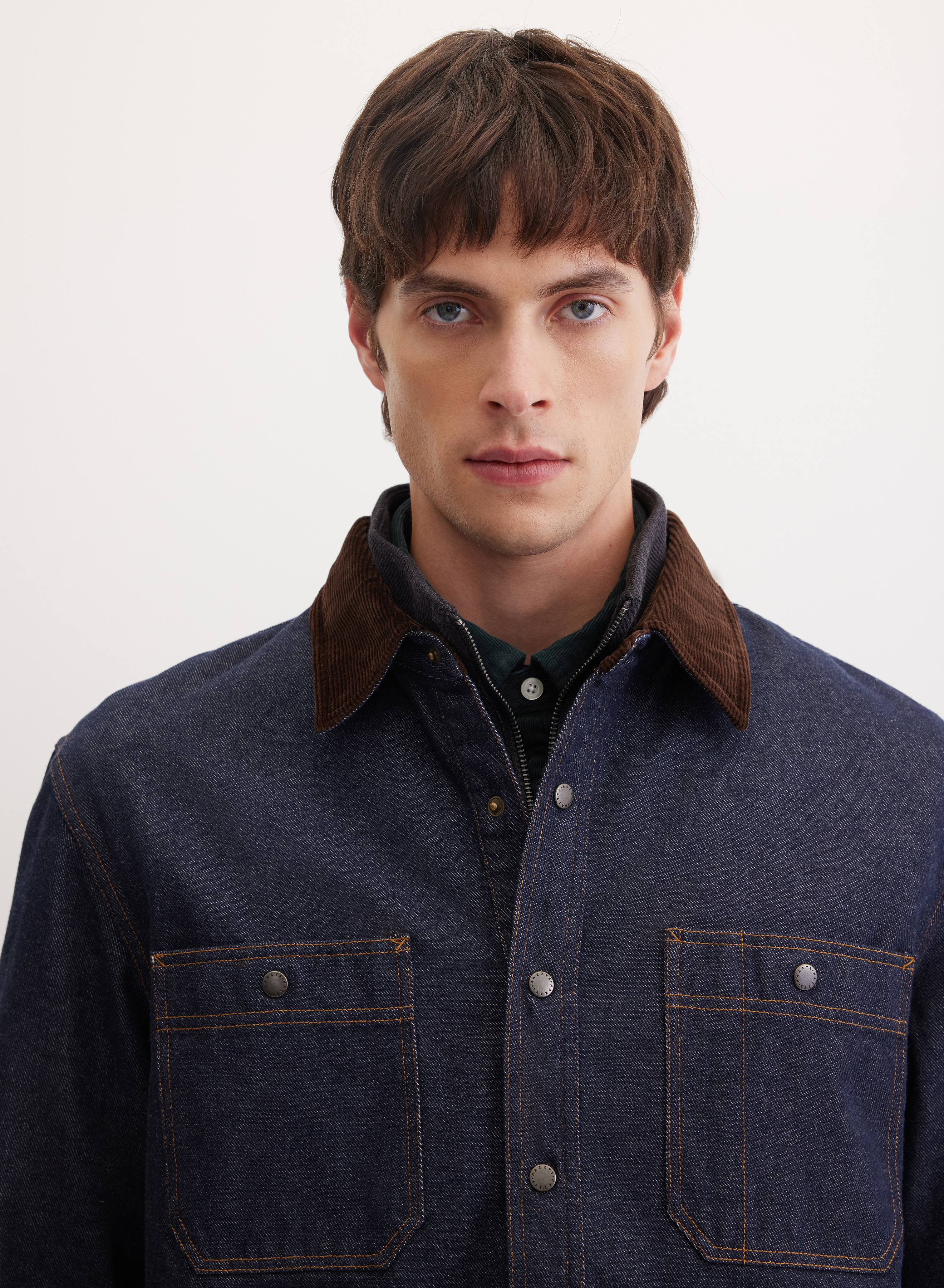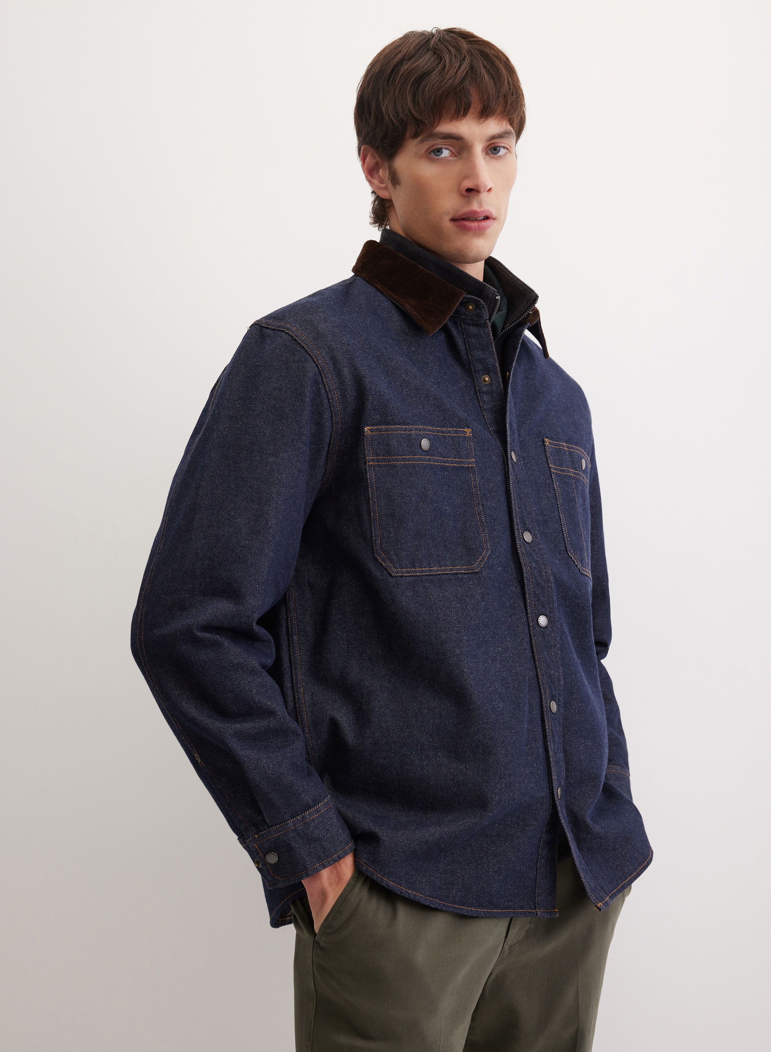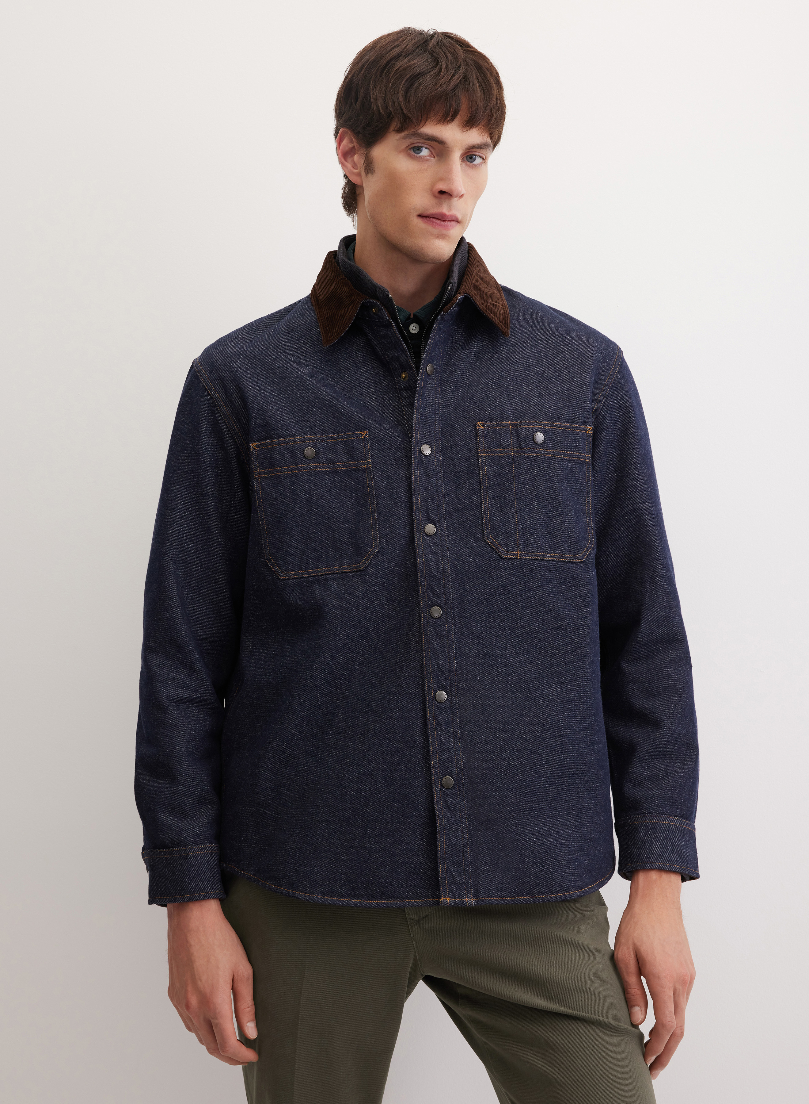 Плотная рубашка с отложным воротником с отделкой под вельвет, которая добавляет тактильную глубину образу. Два нагрудных кармана с аккуратными клапанами выполняют декоративную функцию. Основная планка оснащена классическими пуговицами в виде кнопок.
