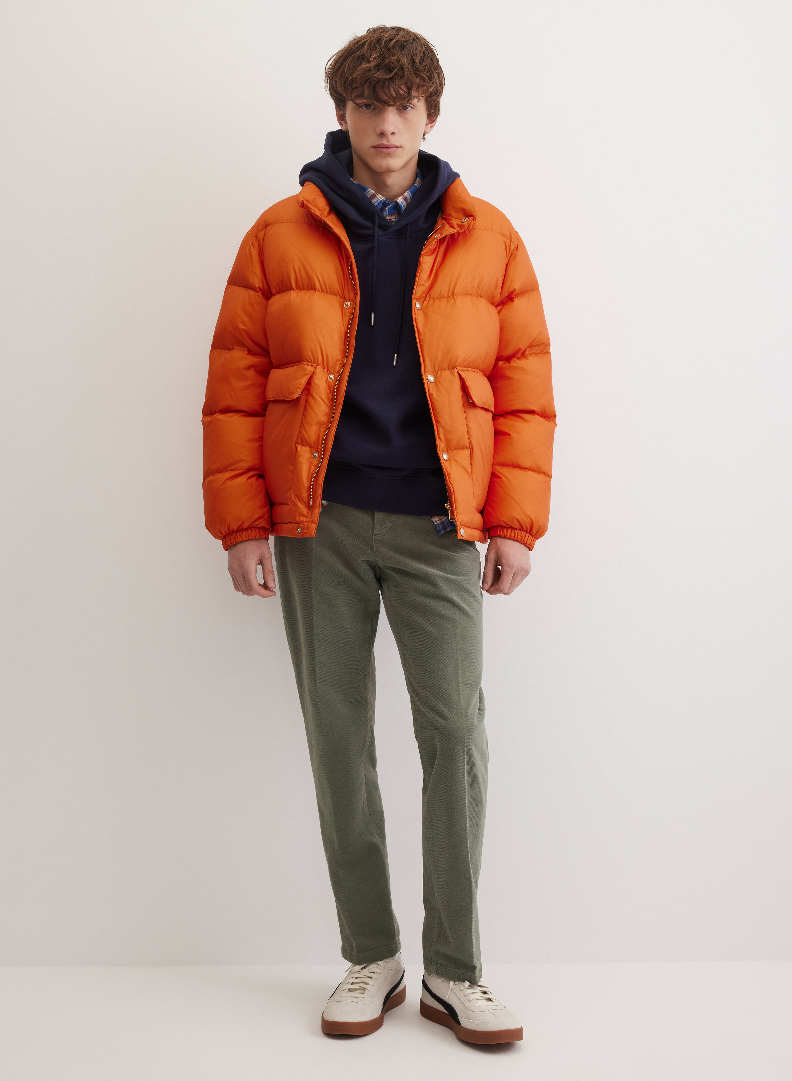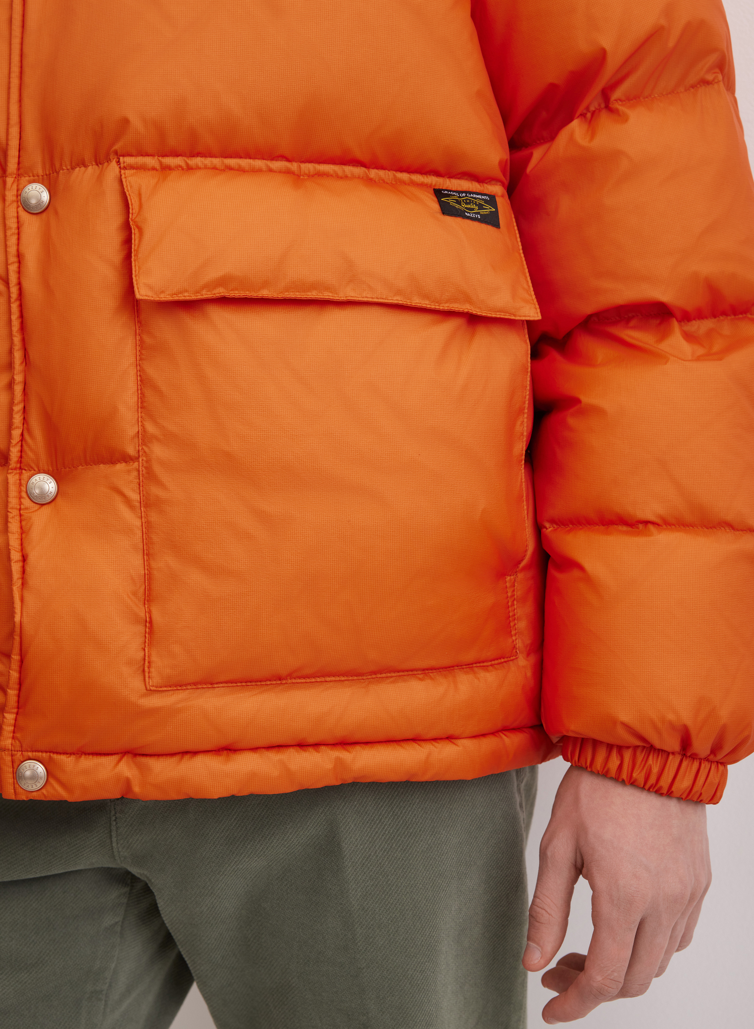 Легкий стеганый пуховик с воротником-стойкой для защиты от ветра. Модель на застежке-молнии дополнена кнопками для более плотной фиксации. Два накладных кармана добавляют практичности. Силуэт прямого кроя с равномерной стежкой и манжетами на резинке надежно удерживает утеплитель внутри.