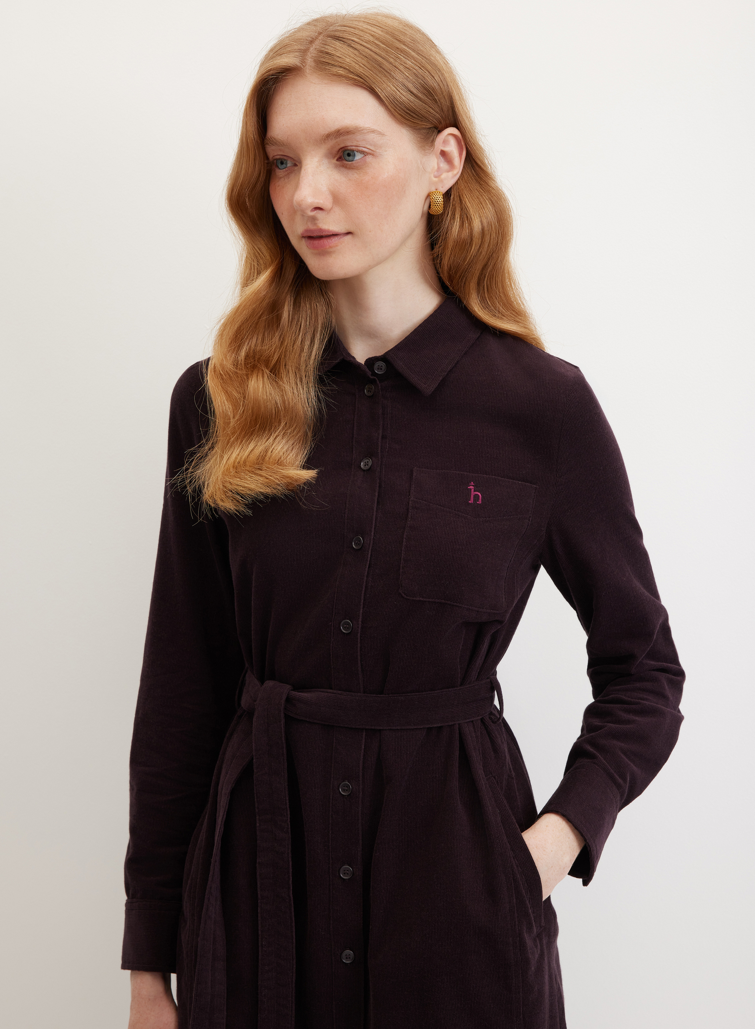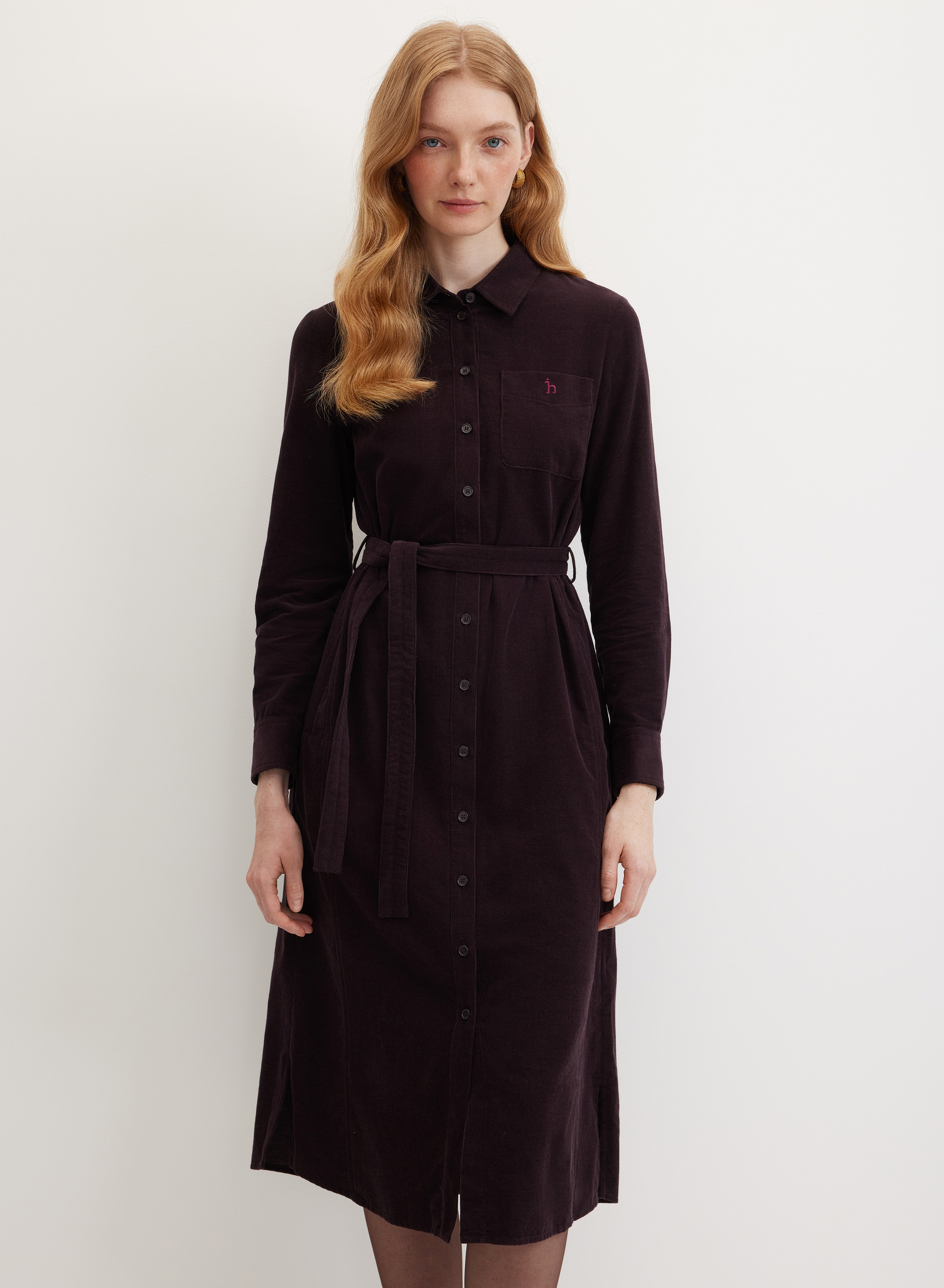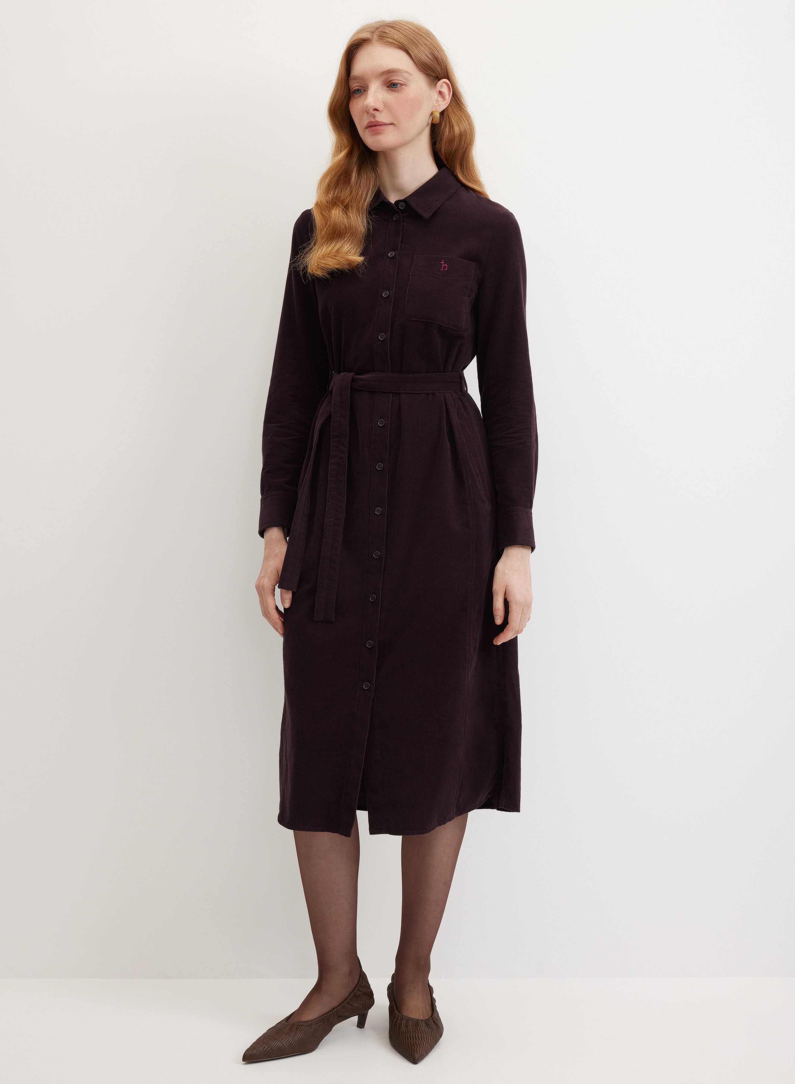Удлиненное платье-рубашка прямого кроя с отложным воротником на стойке и центральной застежкой на небольшие пуговицы. Нагрудный карман украшен аккуратной вышивкой-логотипом h. Края втачных рукавов оформлены планками и манжетами на пуговицах. По спинке кокетка и бантовая складка. С поясом или без него — платье легко адаптируется под настроение, оставаясь выразительным и особенным.