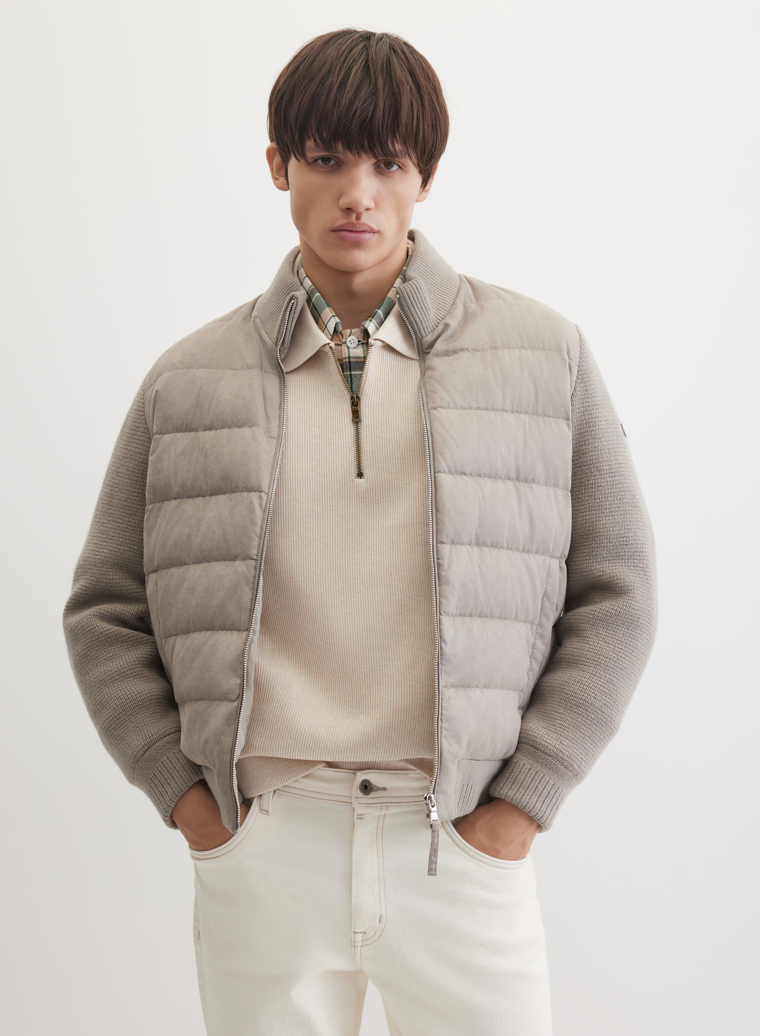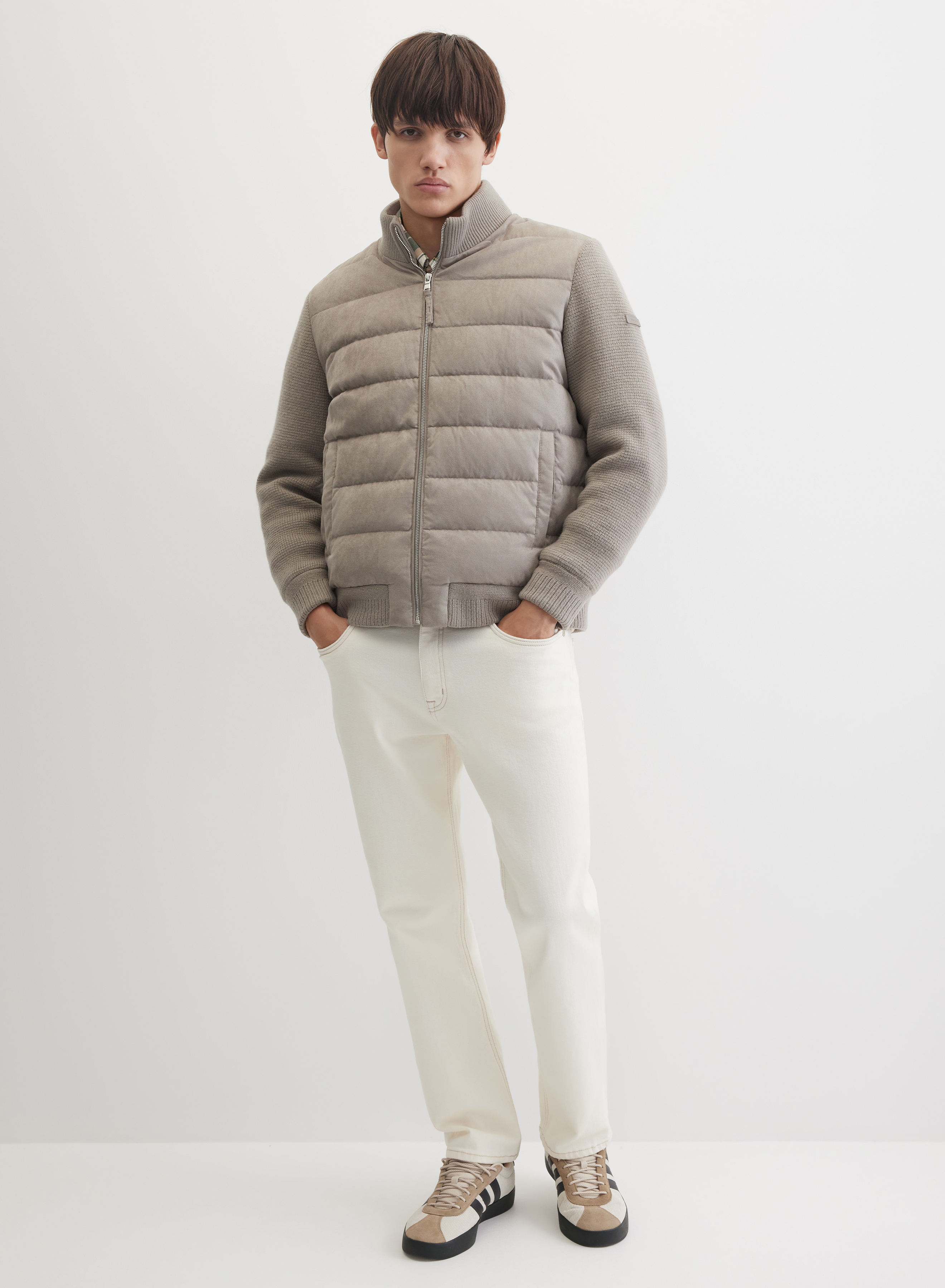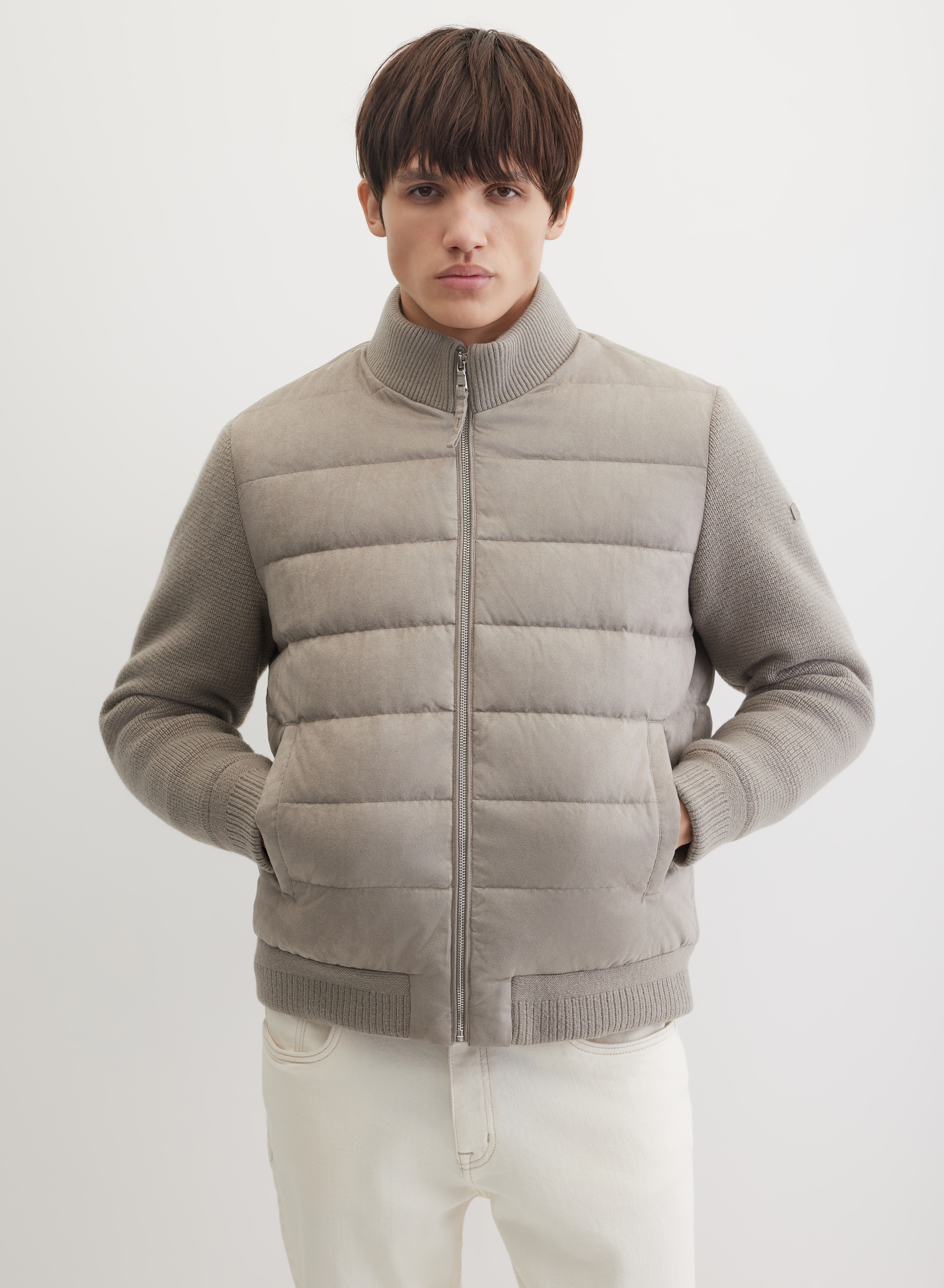 Стеганая куртка с центральной застежкой на молнию, дополненной ветрозащитной планкой. Горизонтальная стежка создает четкий геометрический рисунок. Рукава выполнены из ткани в мелкий вертикальный рубчик, что добавляет фактурности. Крой дополняют два боковых кармана и регулируемый низ на манжете для точной посадки.
