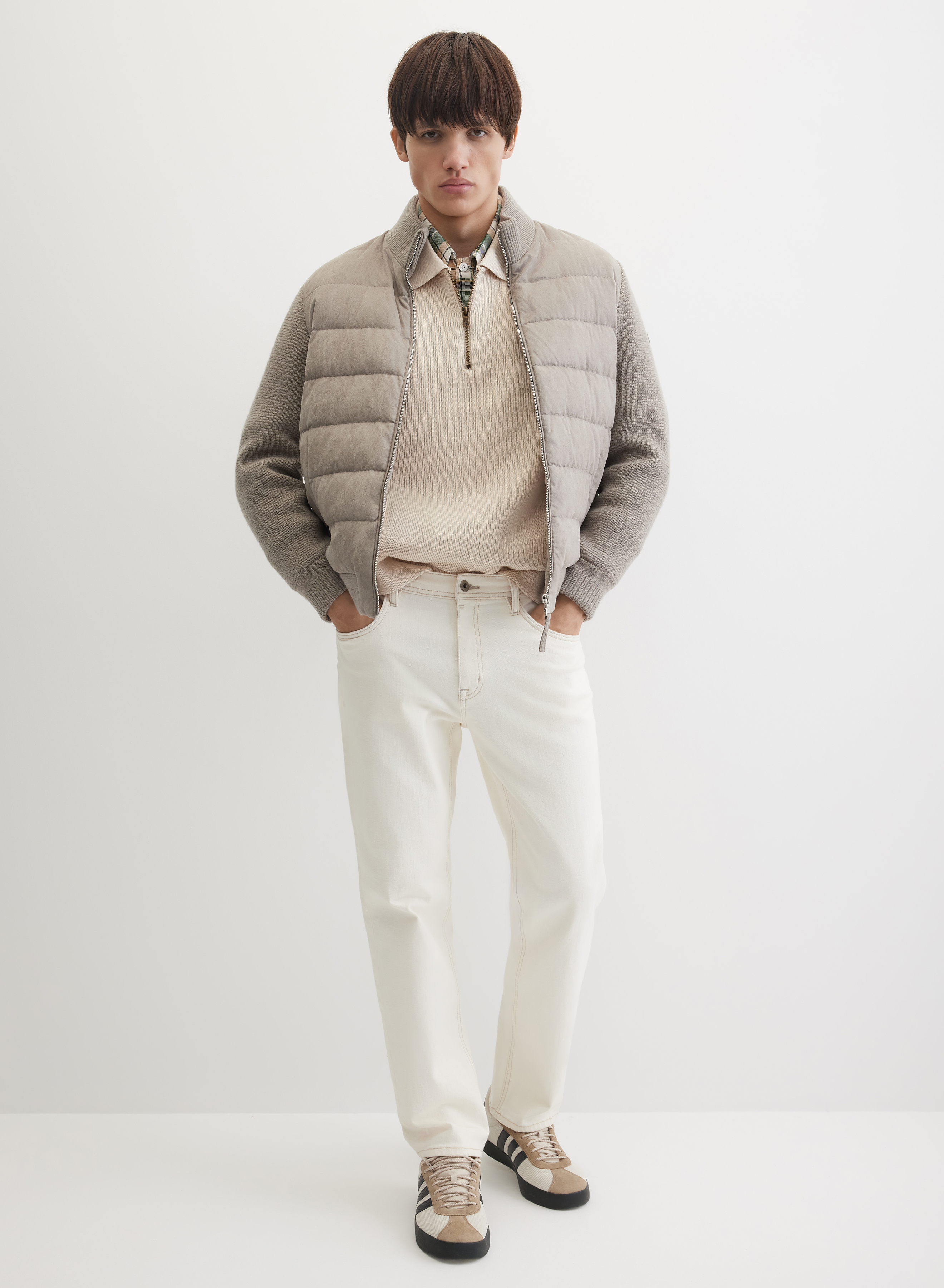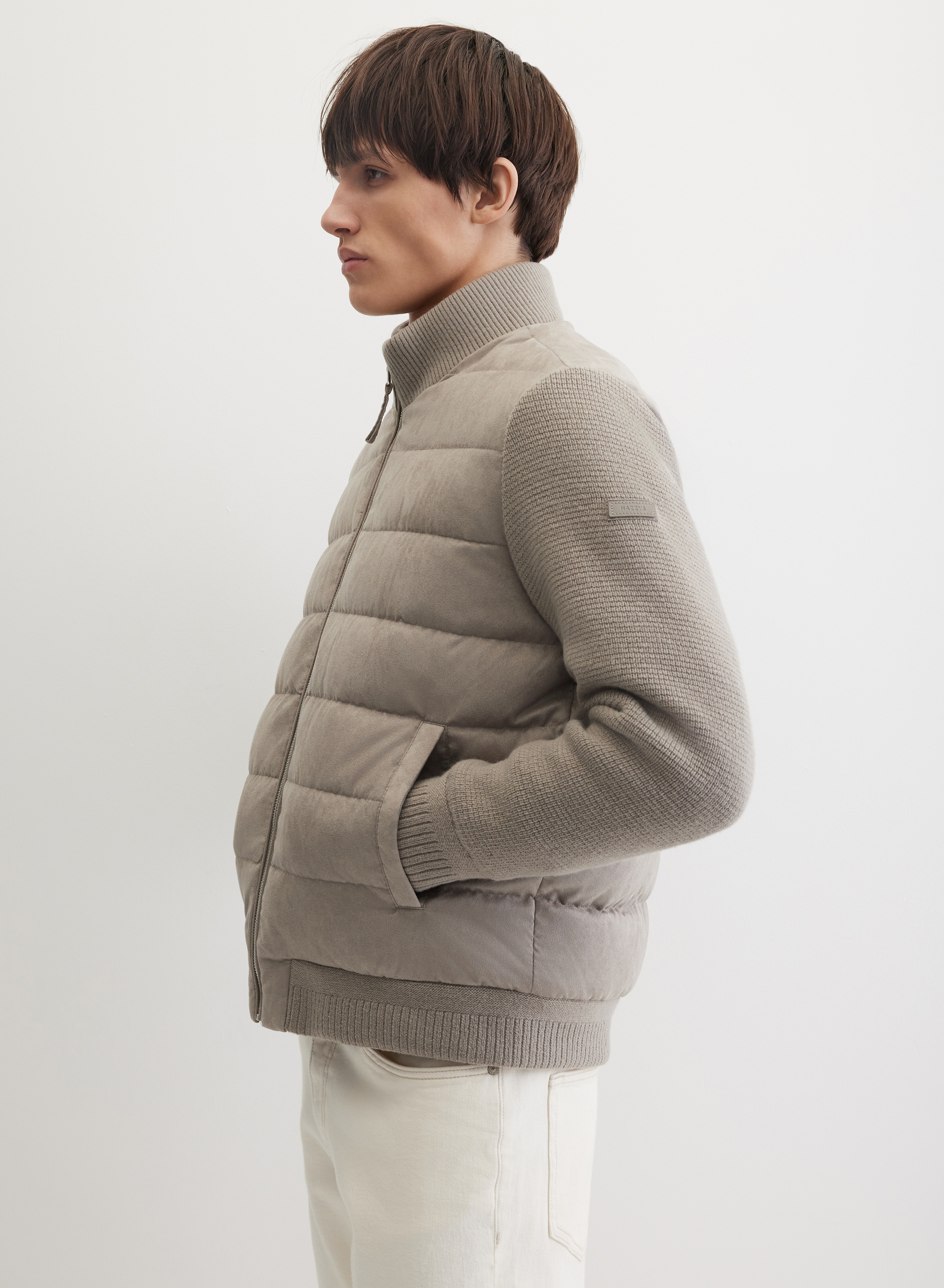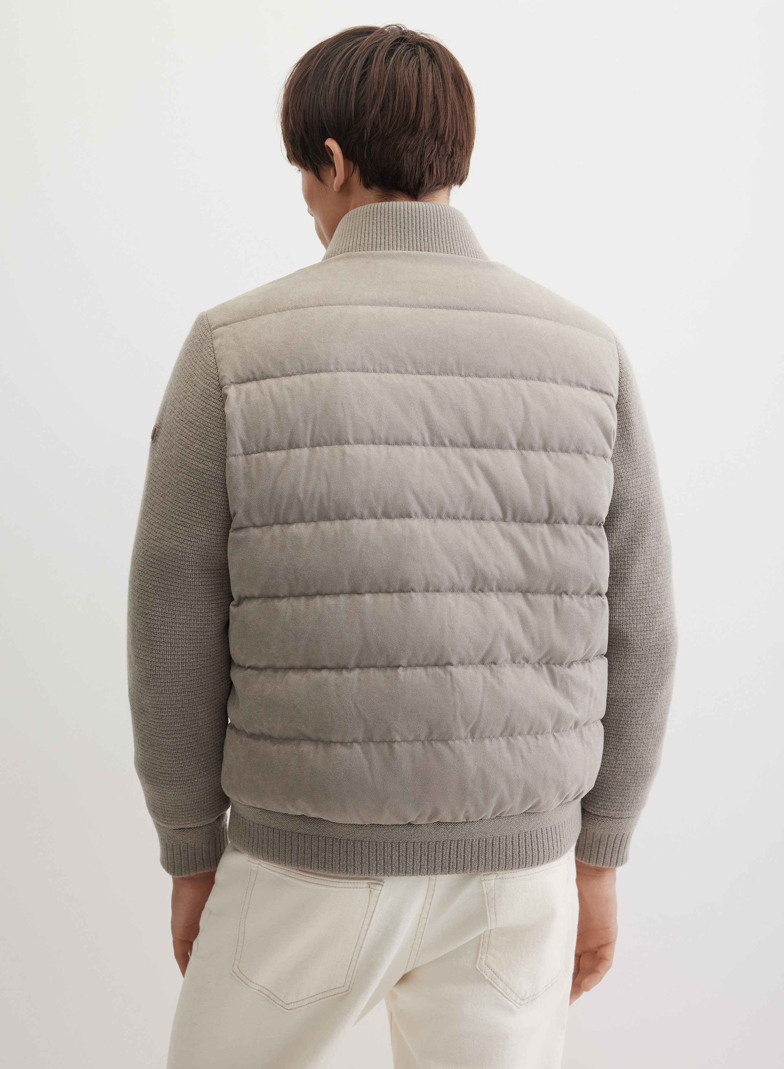 Стеганая куртка с центральной застежкой на молнию, дополненной ветрозащитной планкой. Горизонтальная стежка создает четкий геометрический рисунок. Рукава выполнены из ткани в мелкий вертикальный рубчик, что добавляет фактурности. Крой дополняют два боковых кармана и регулируемый низ на манжете для точной посадки.