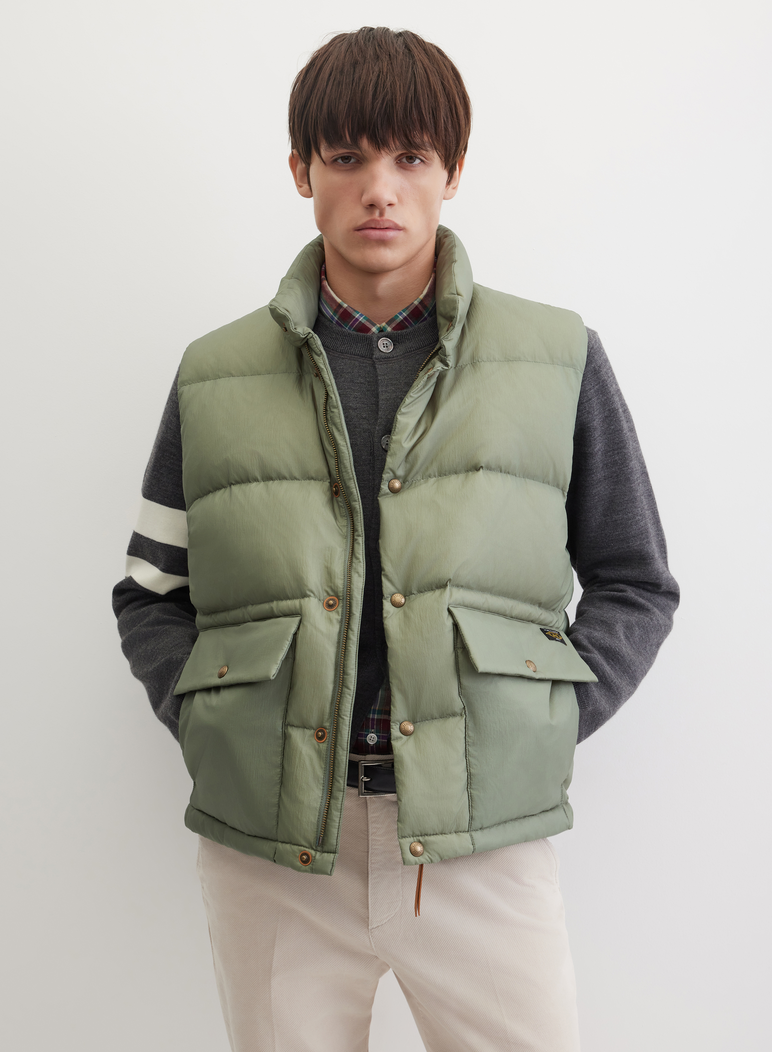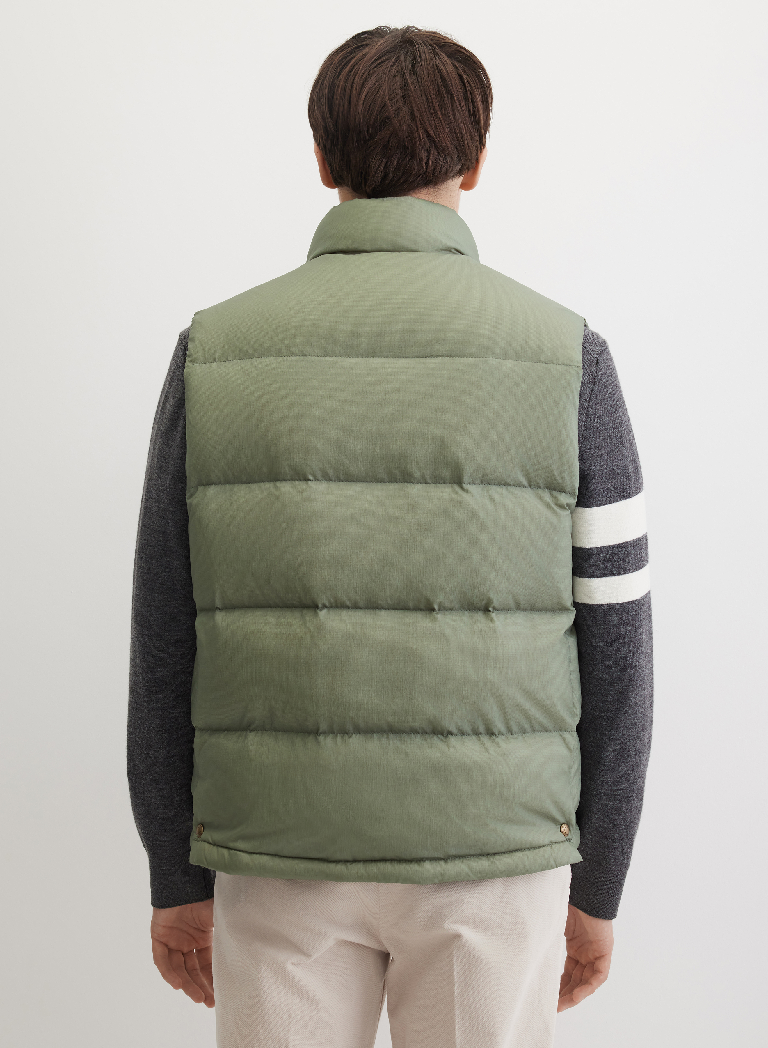 Прямой стеганый жилет свободного кроя. Силуэт до линии бедра смотрится сдержанно и лаконично. Застежка на молнию дополнена кнопками для плотной фиксации. Воротник-стойка защищает от ветра и сохраняет форму длительное время. Два больших накладных кармана добавляют функциональности и завершают минималистичный дизайн. Четкий графичный контур жилету придает аккуратная строчка по нижнему краю.