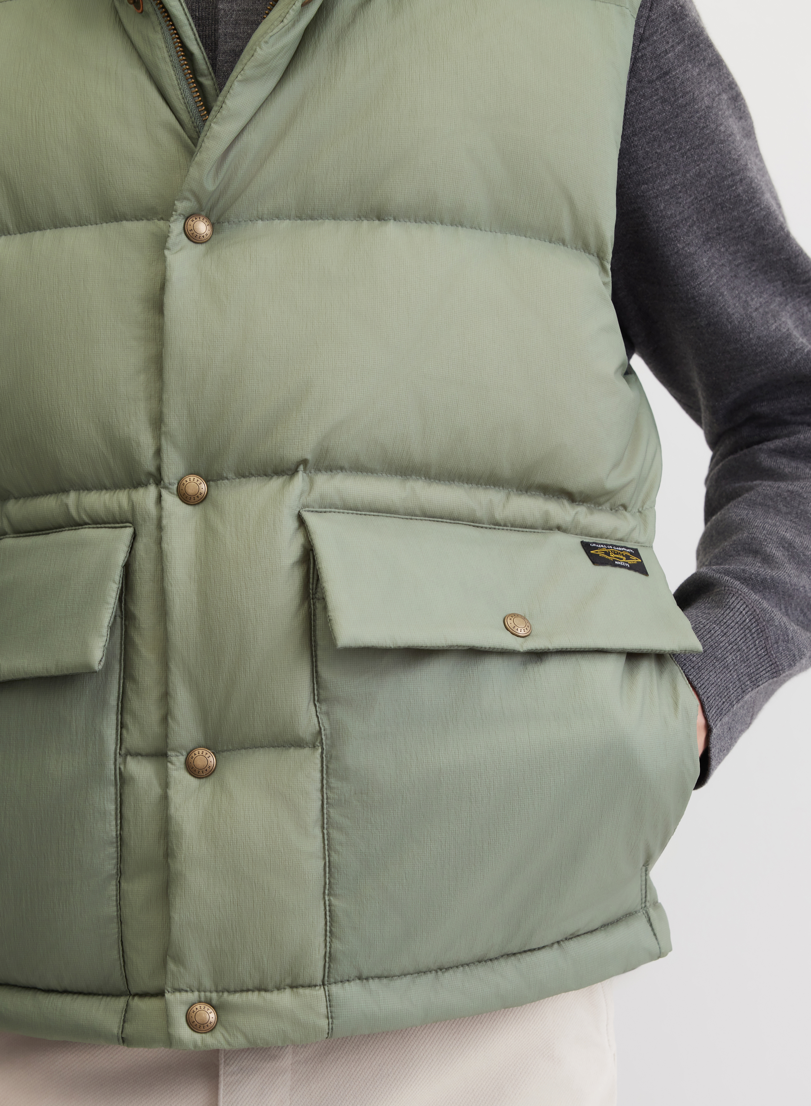 Жилет выполнен из плотного материала с легким блеском поверхности и гладкой подкладкой внутри. Частая стежка способствует лучшему сохранению тепла и надолго сохраняет объем.
