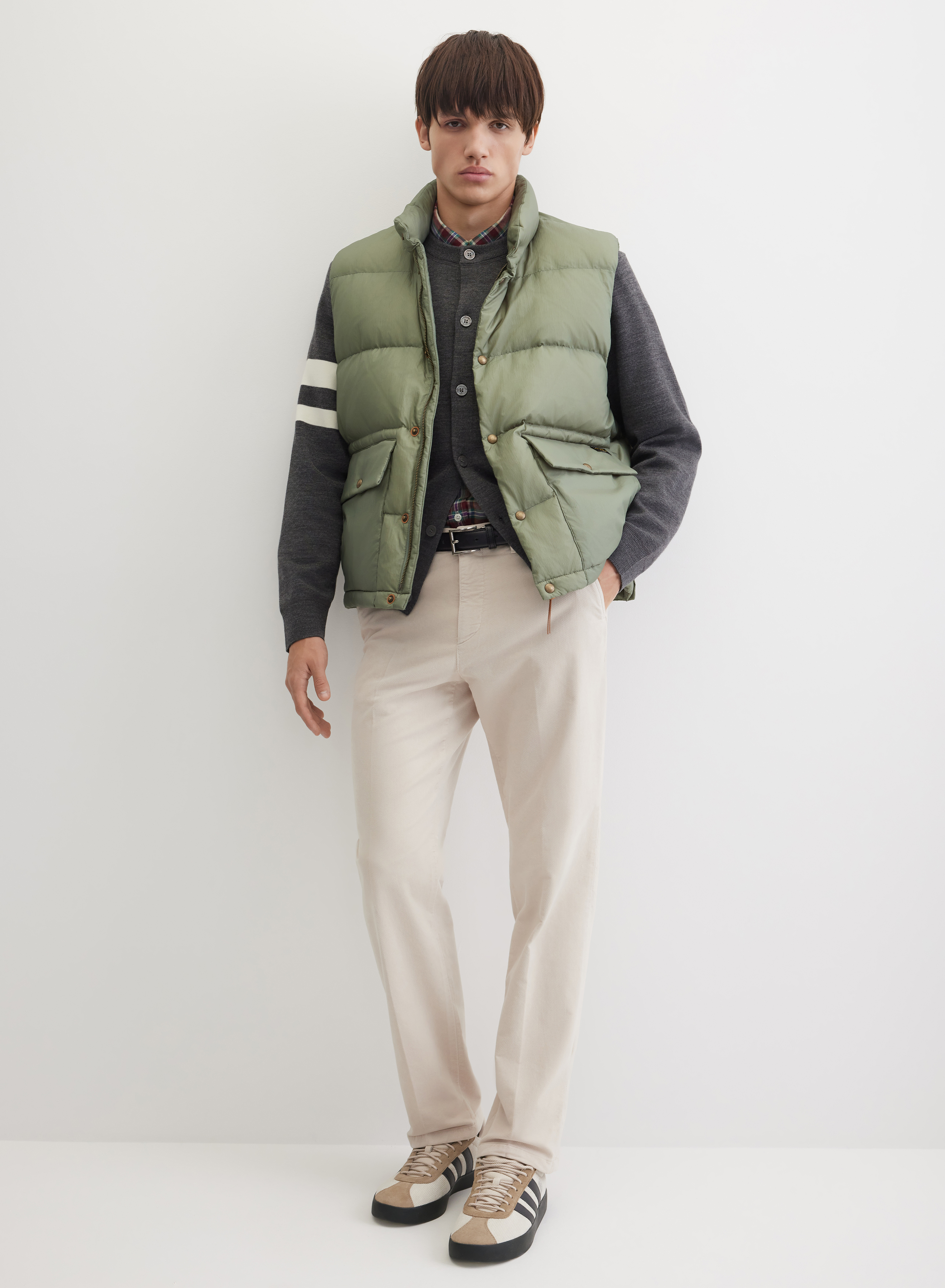 Модель сочетается с водолазками, рубашками в клетку и объемными свитерами с высоким горлом. Комбинируется с джинсовой или фланелевой рубашкой, прямыми джинсами, утепленными брюками для прогулок. Нейтральный цвет гармонично вписывается в осенне-зимний гардероб.