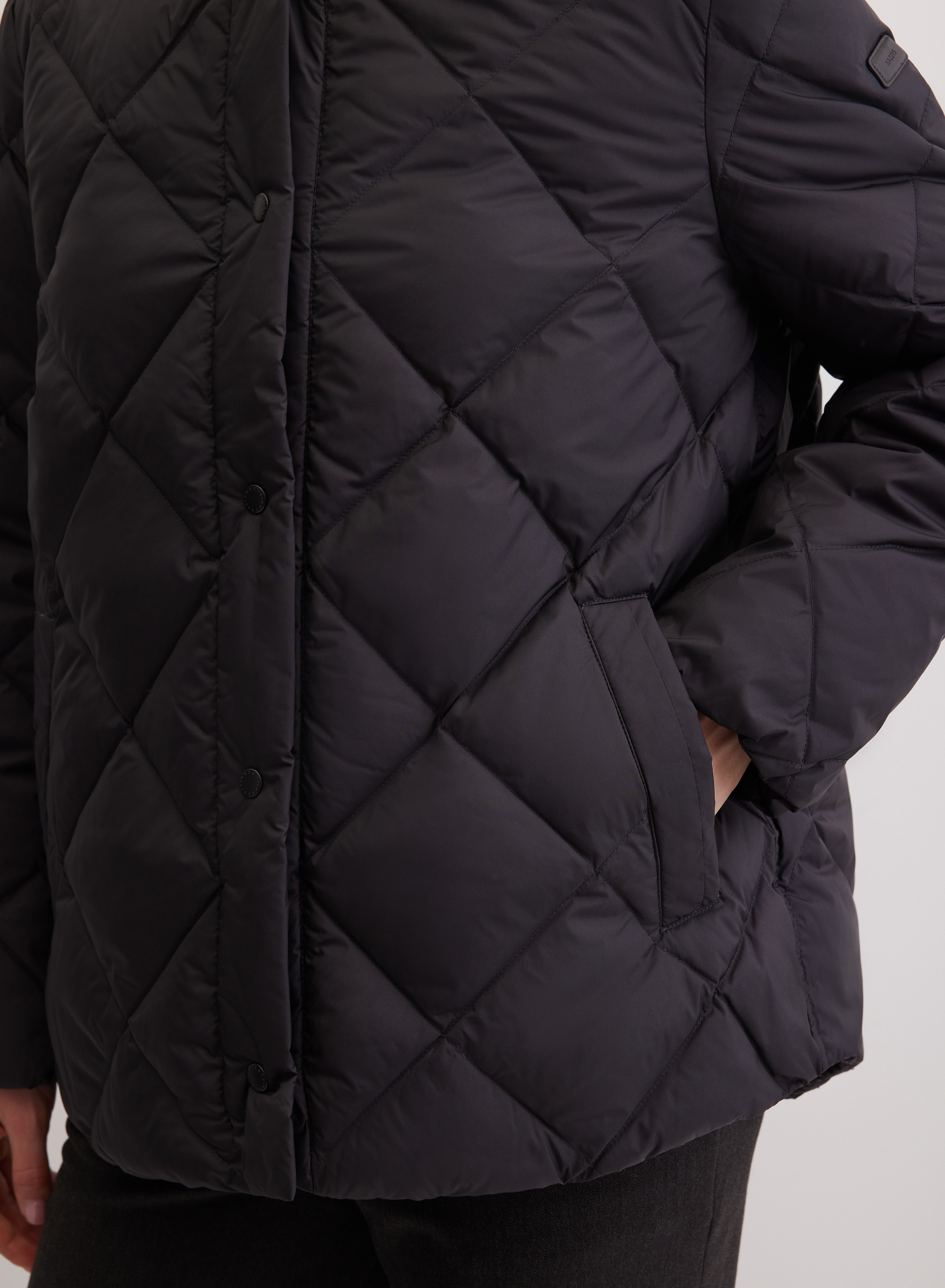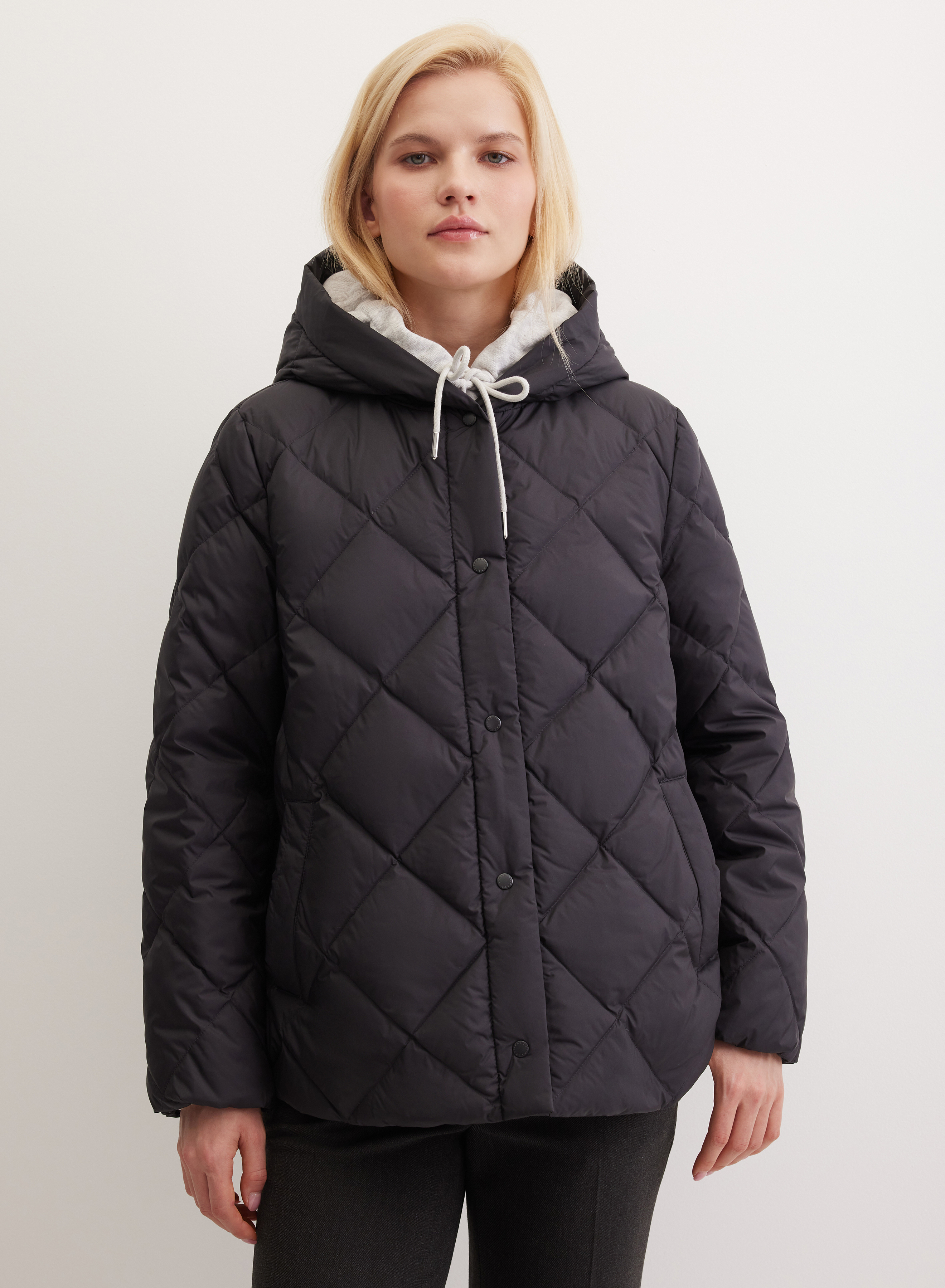 Пуховик свободного прямого силуэта с центральной застежкой на кнопки. По переду внутренние функциональные карманы. Спинка цельнокроеная. Высокий ворот и глубокий капюшон защищают область головы и шеи.